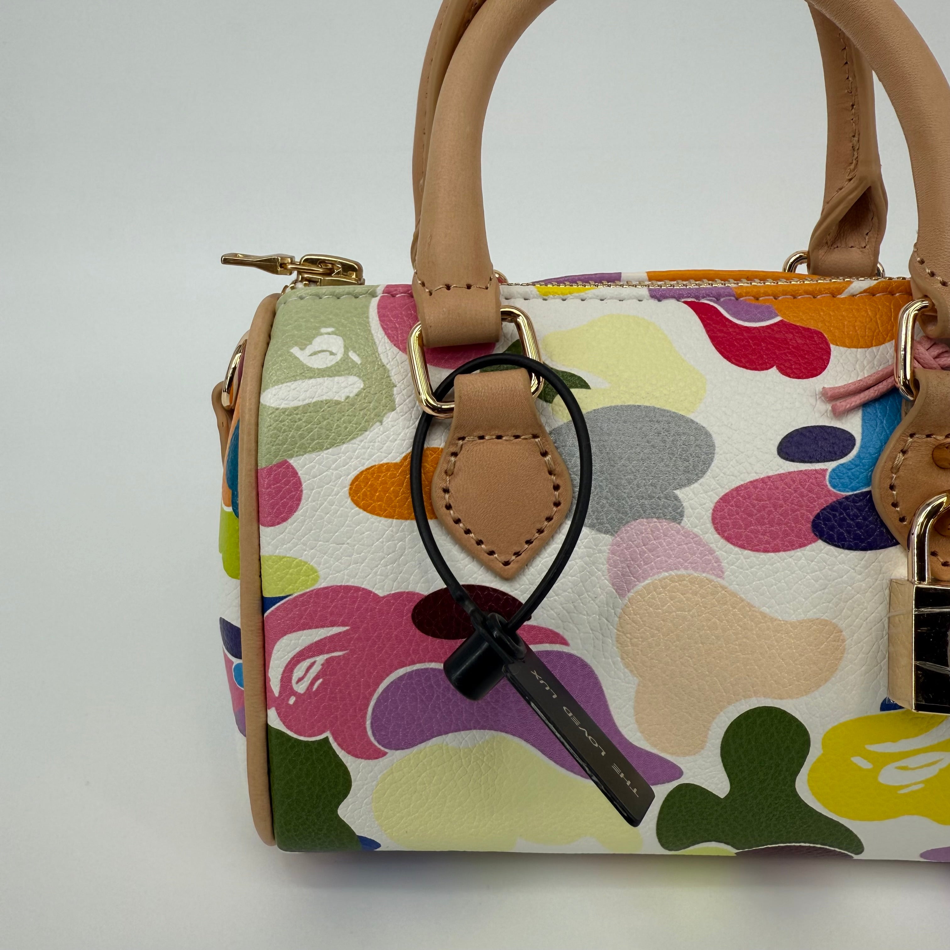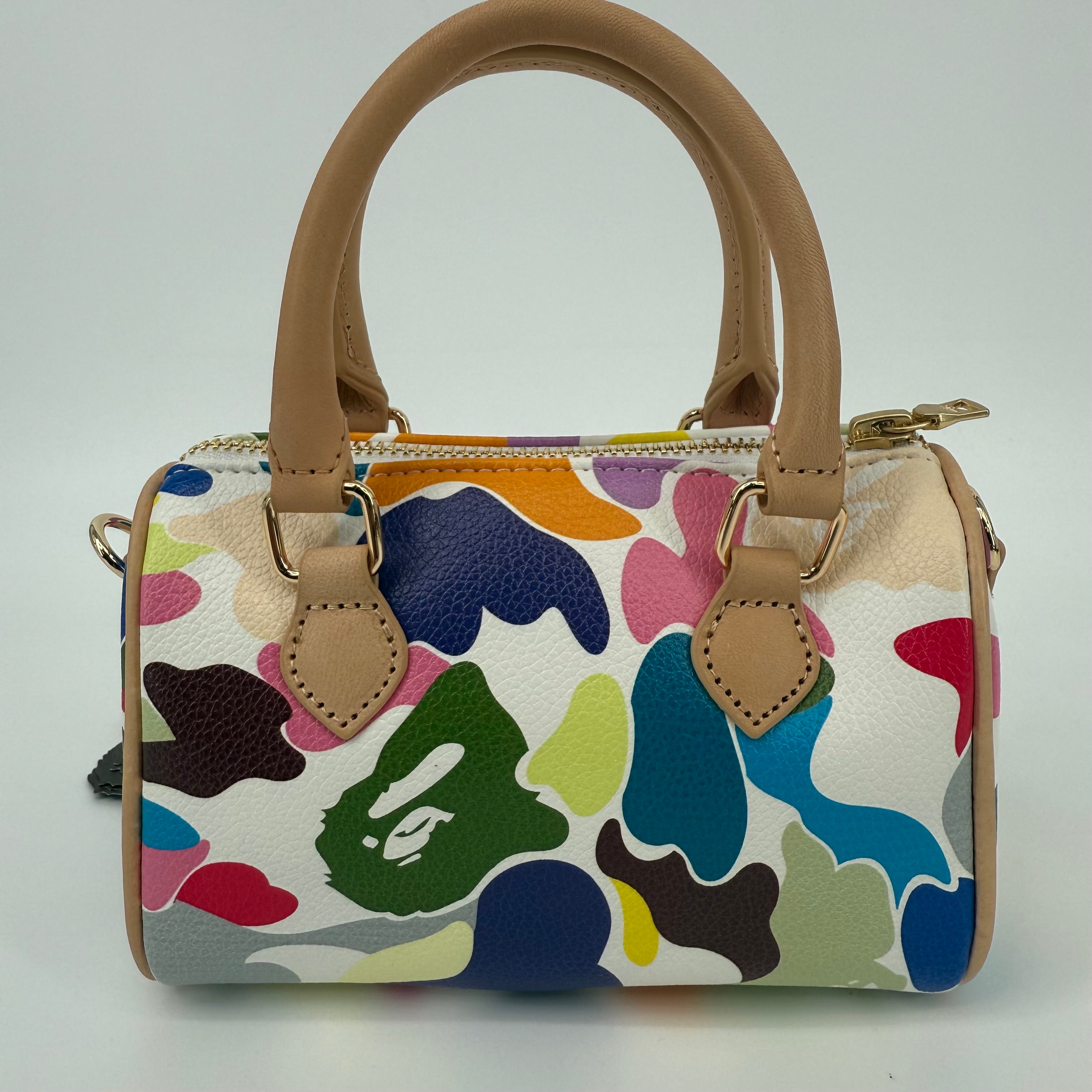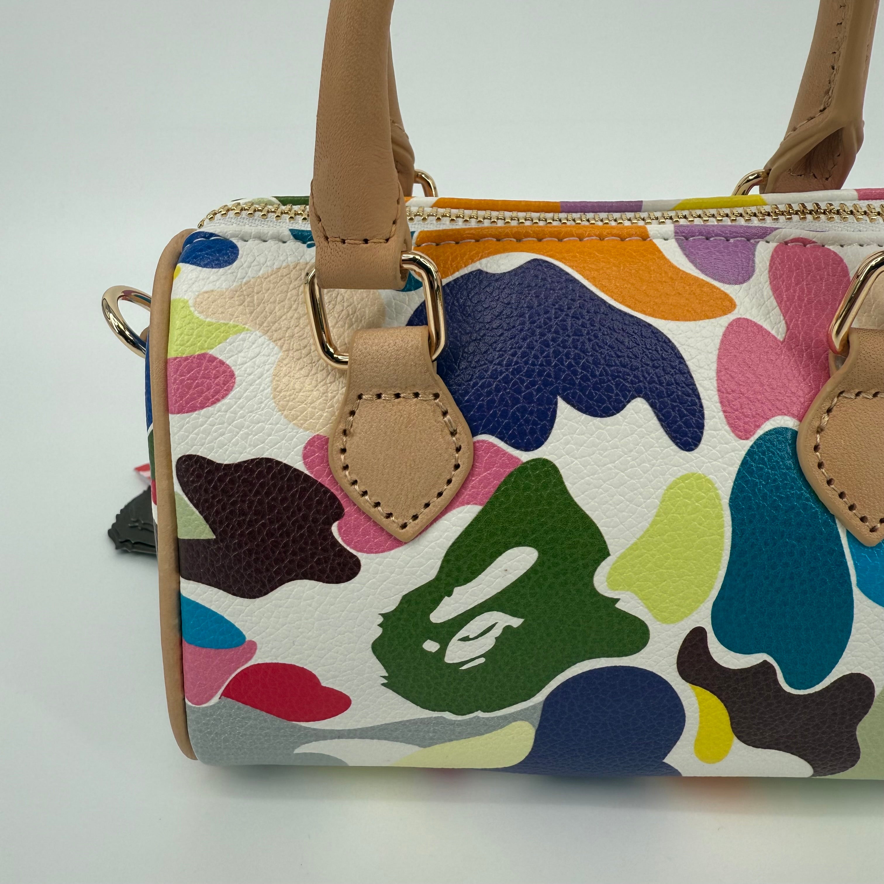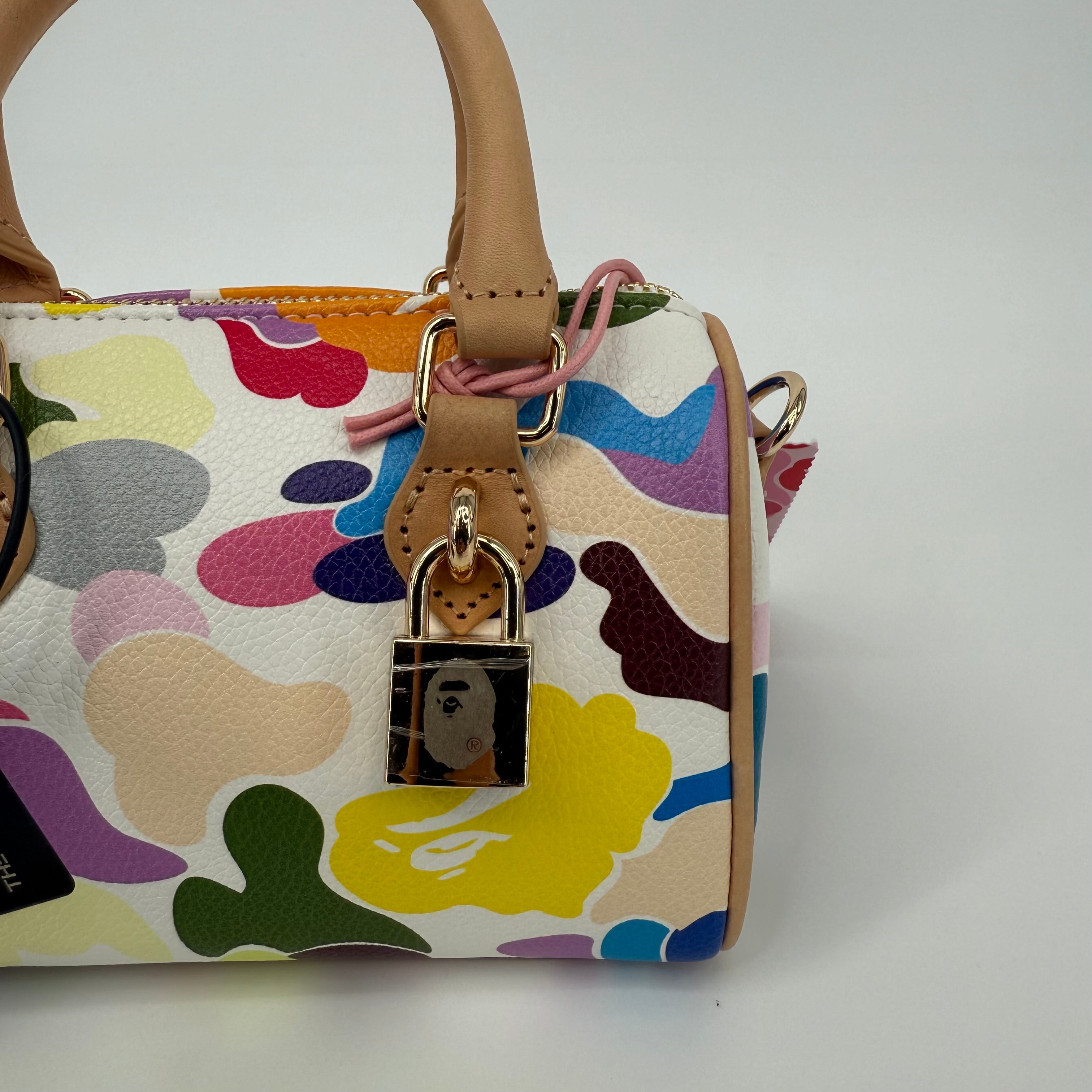 The A Bathing Ape (BAPE) Multi-Color Camo Mini Boston Bag is a vibrant statement piece that embodies the brand’s playful streetwear identity. Featuring BAPE’s signature camo motif in bold, multicolored hues and crafted from durable textured leather with natural leather handles, this compact bag balances fun design with functional luxury. Finished with gold-tone hardware and a signature BAPE padlock, it’s a standout collectible for any fashion enthusiast.