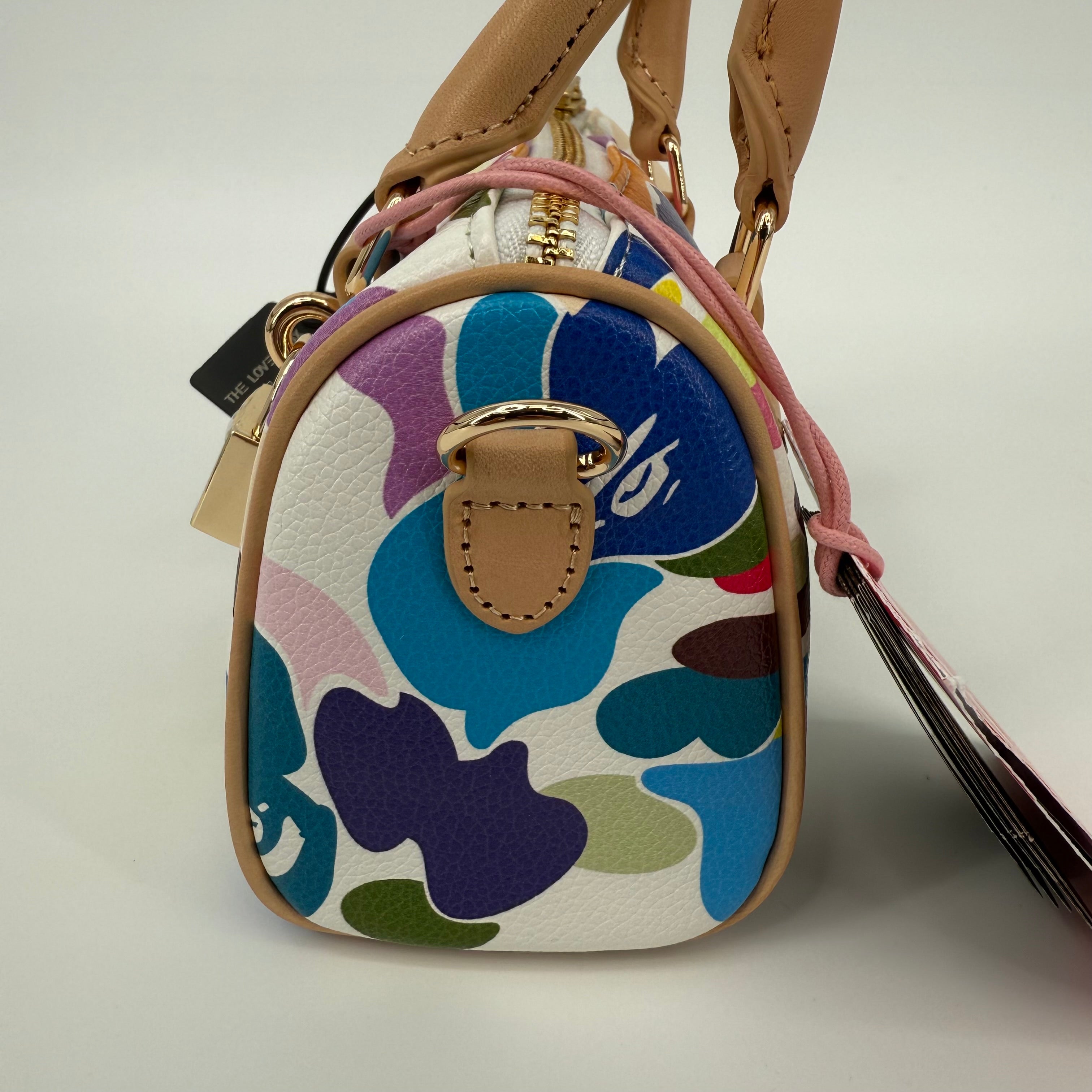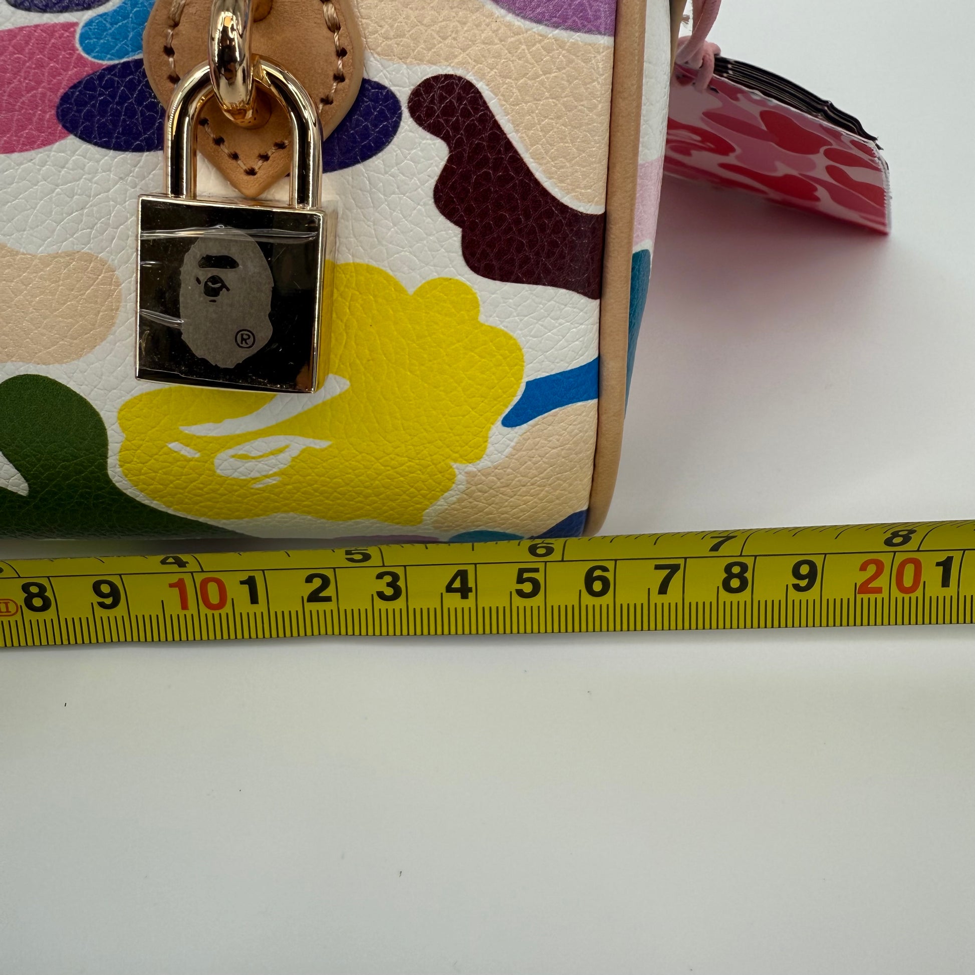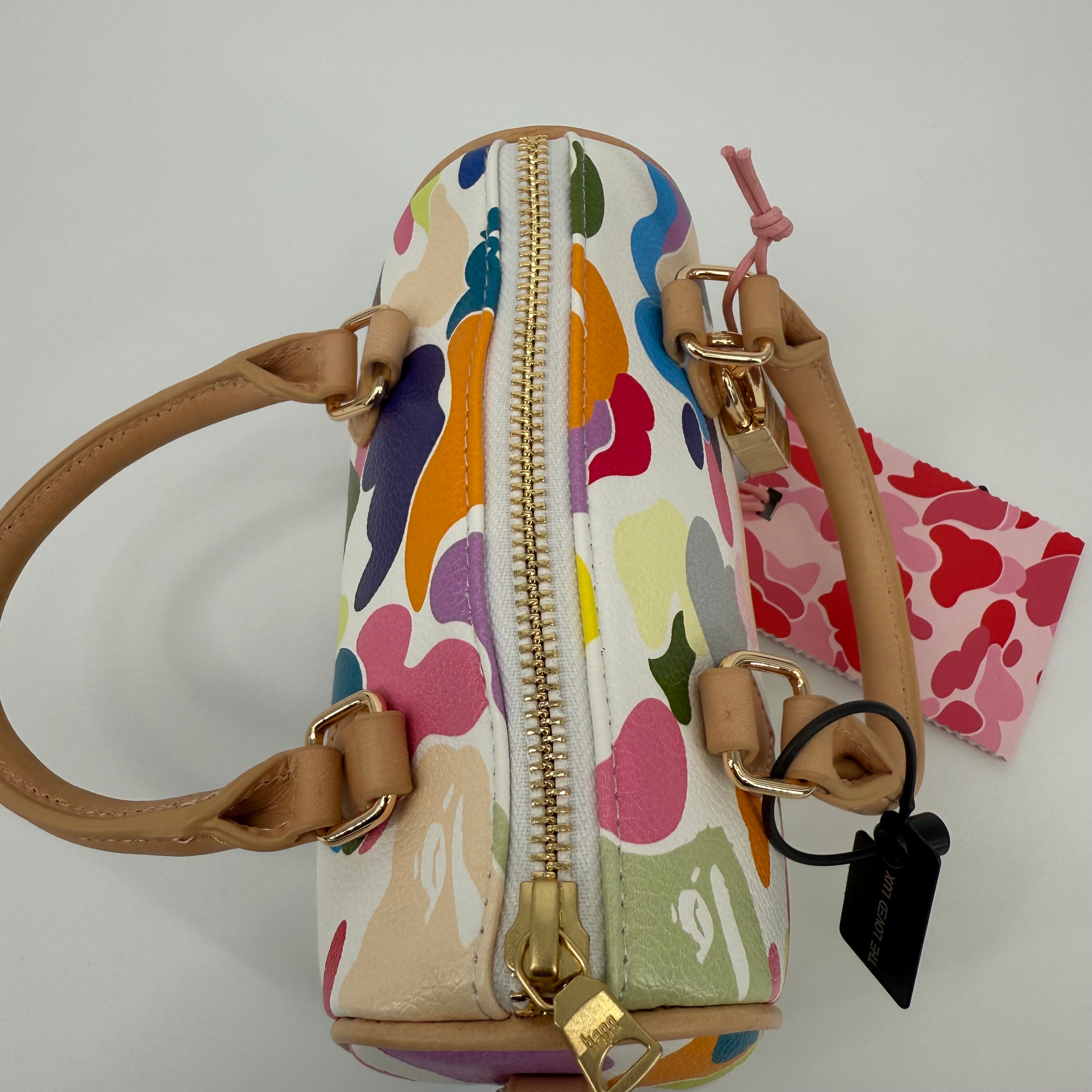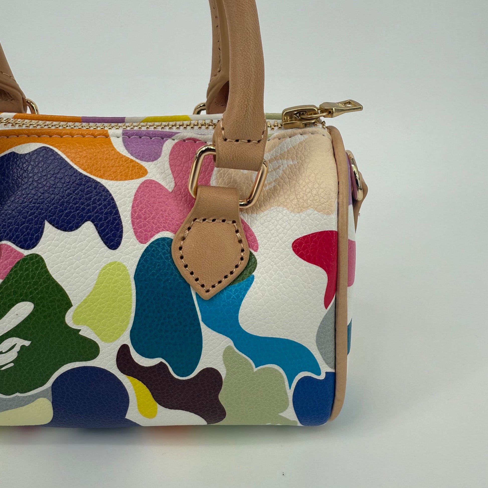 The A Bathing Ape (BAPE) Multi-Color Camo Mini Boston Bag is a vibrant statement piece that embodies the brand’s playful streetwear identity. Featuring BAPE’s signature camo motif in bold, multicolored hues and crafted from durable textured leather with natural leather handles, this compact bag balances fun design with functional luxury. Finished with gold-tone hardware and a signature BAPE padlock, it’s a standout collectible for any fashion enthusiast.