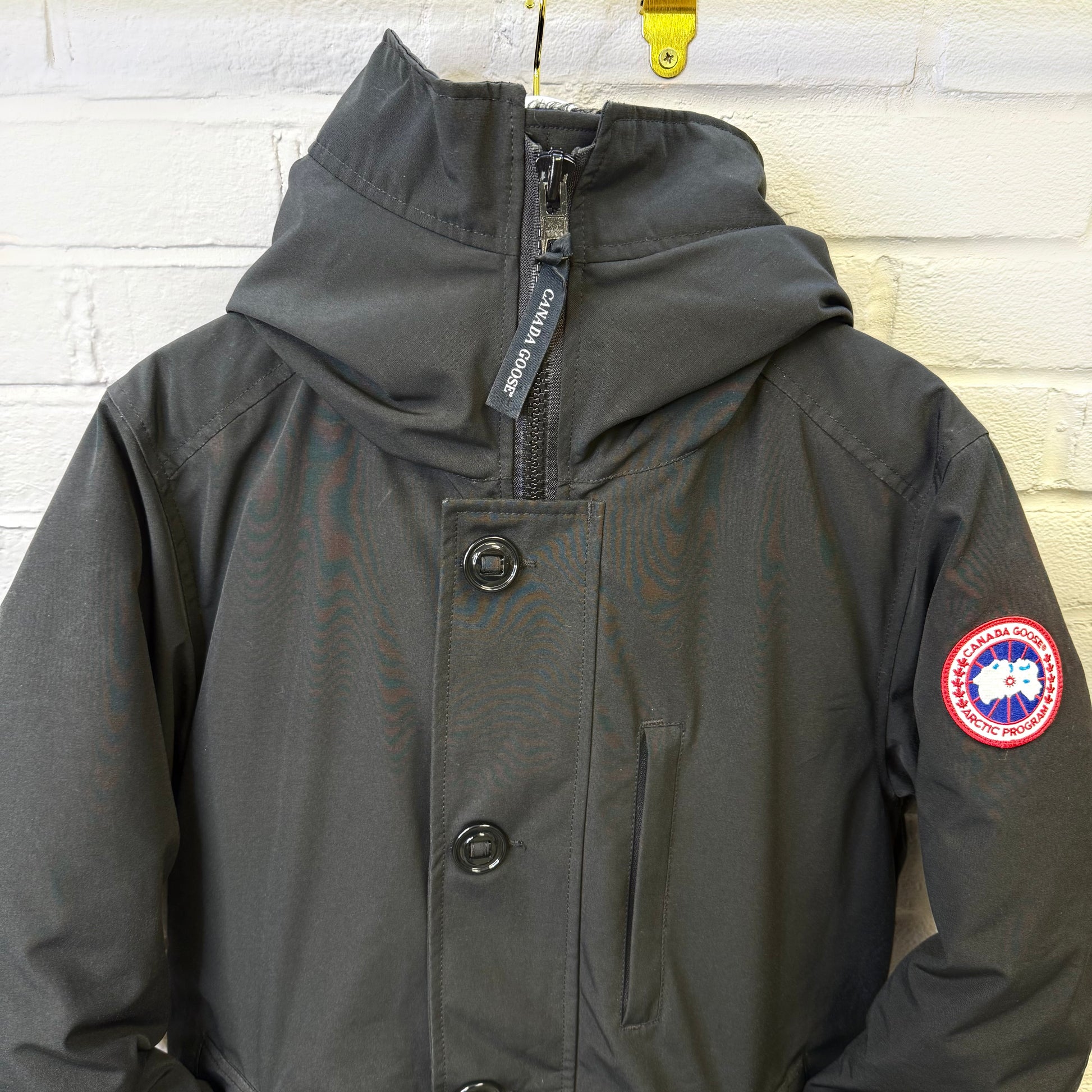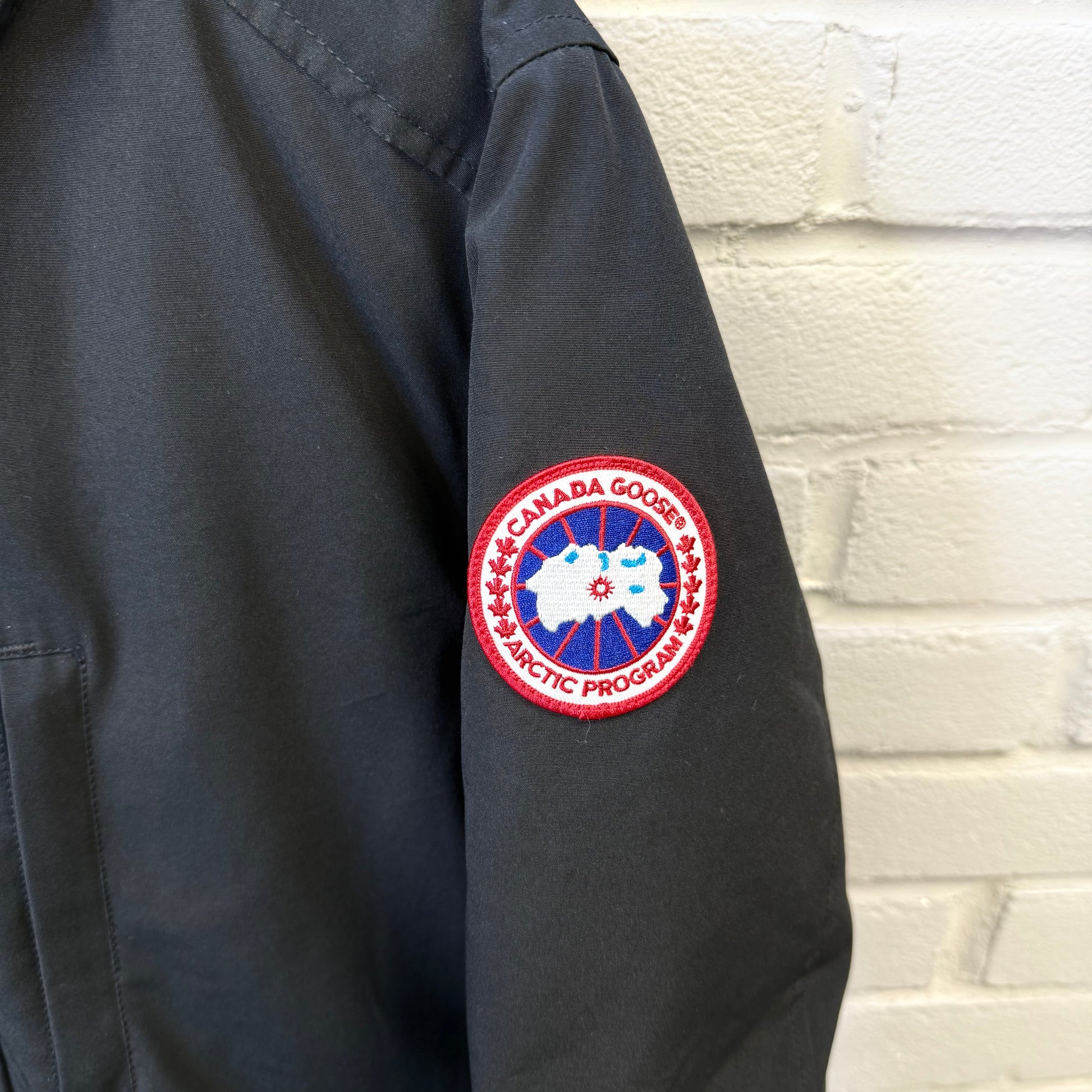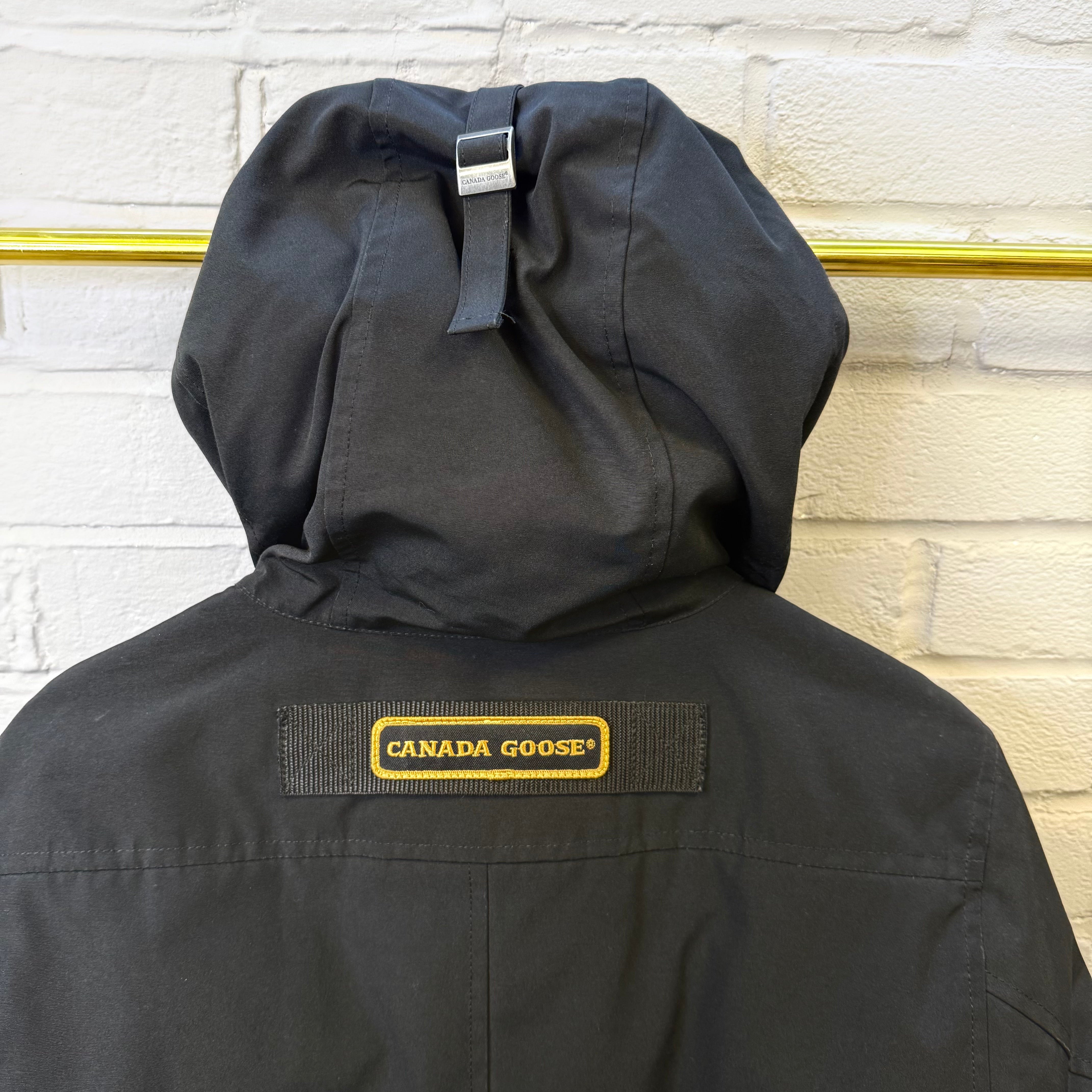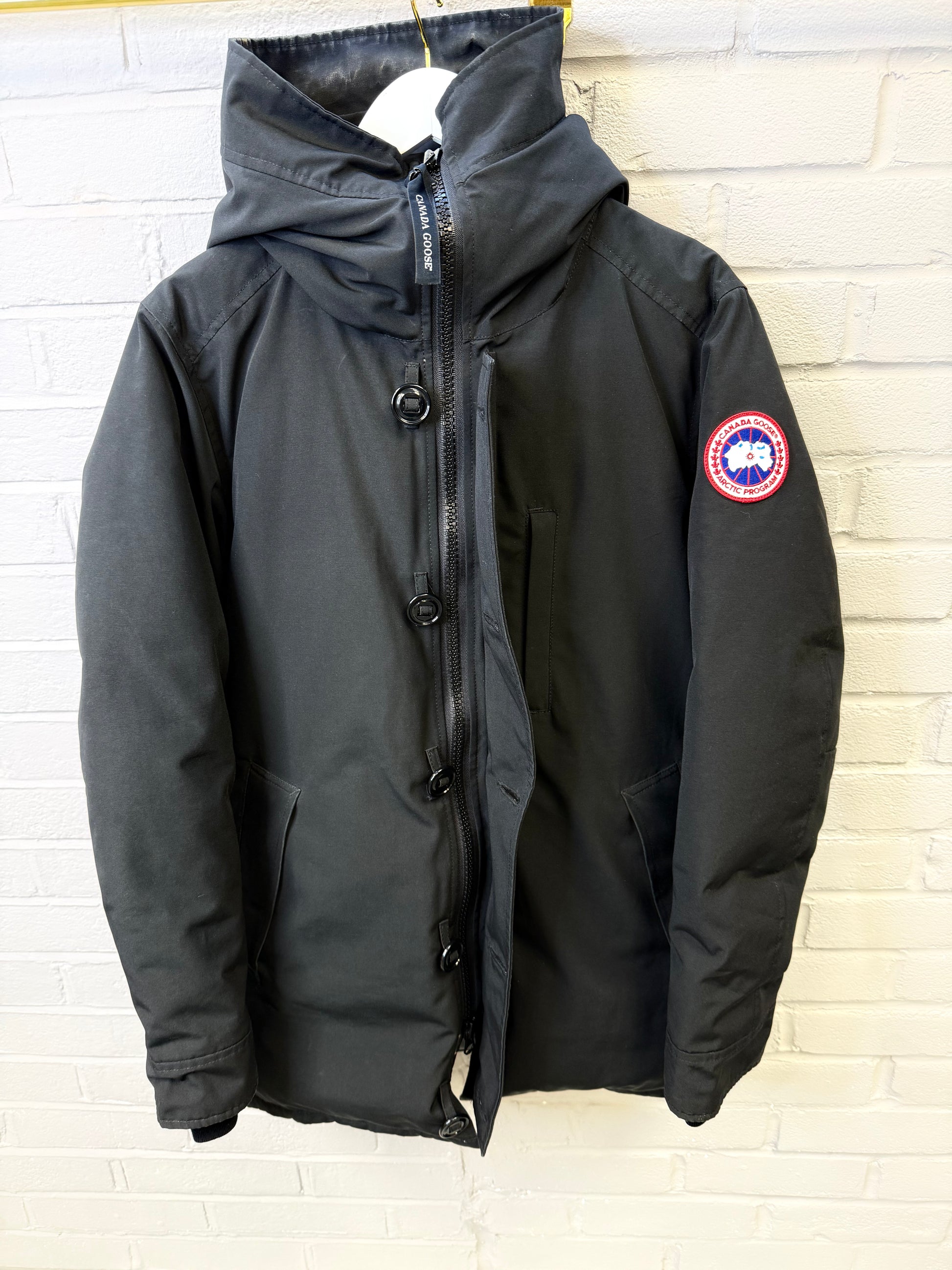 Pre-owned Canada Goose Chateau Parka in black Arctic Tech fabric, offering exceptional warmth and weather resistance with a sleek, slim silhouette. Features the iconic CG patch on the sleeve, insulated hood, heavy-duty zip and button closure, and fleece-lined pockets. Gently worn with light signs of use but overall excellent condition—perfect for reliable winter protection without compromising style.