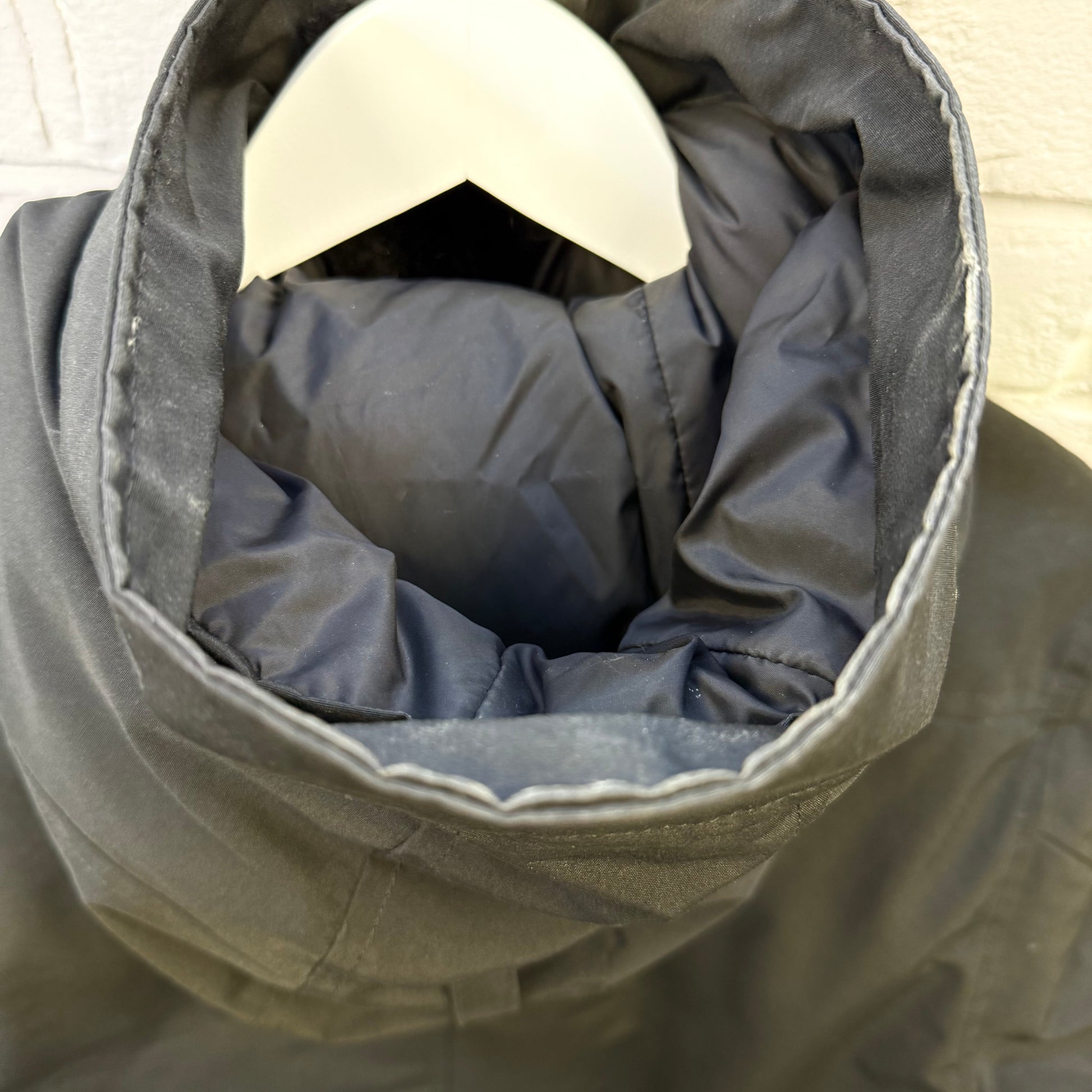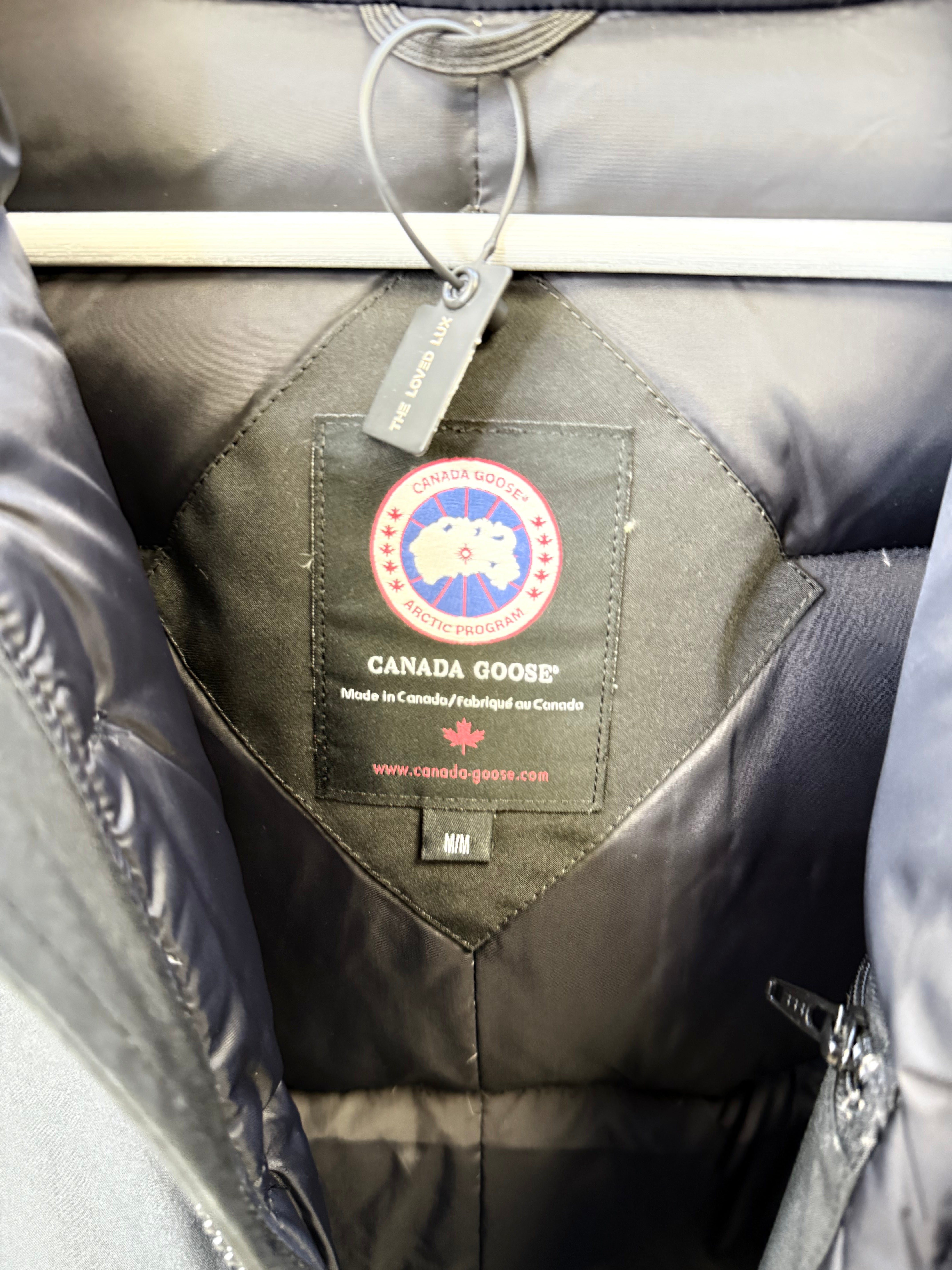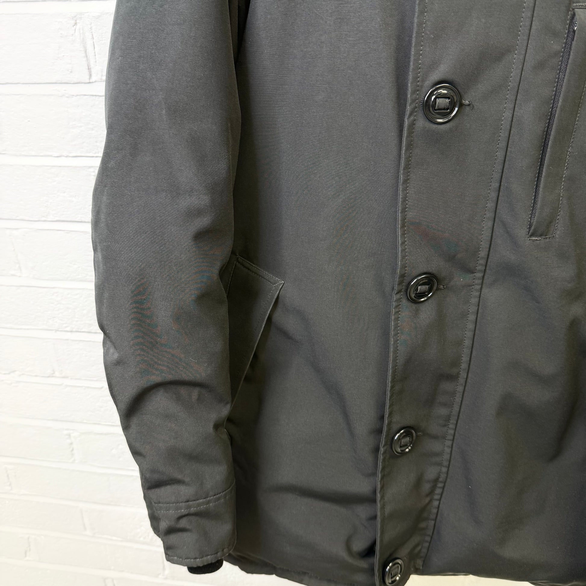 Pre-owned Canada Goose Chateau Parka in black Arctic Tech fabric, offering exceptional warmth and weather resistance with a sleek, slim silhouette. Features the iconic CG patch on the sleeve, insulated hood, heavy-duty zip and button closure, and fleece-lined pockets. Gently worn with light signs of use but overall excellent condition—perfect for reliable winter protection without compromising style.