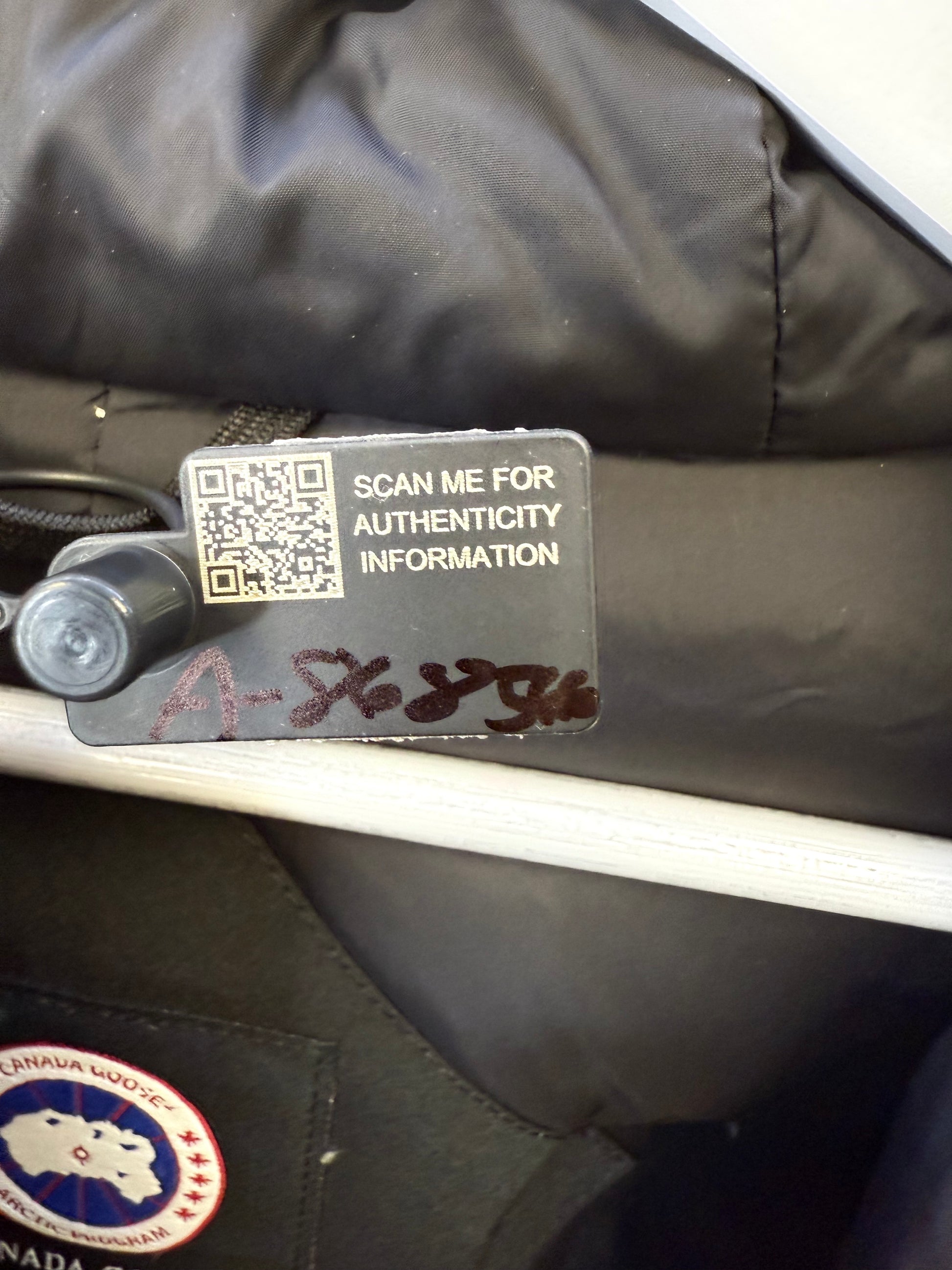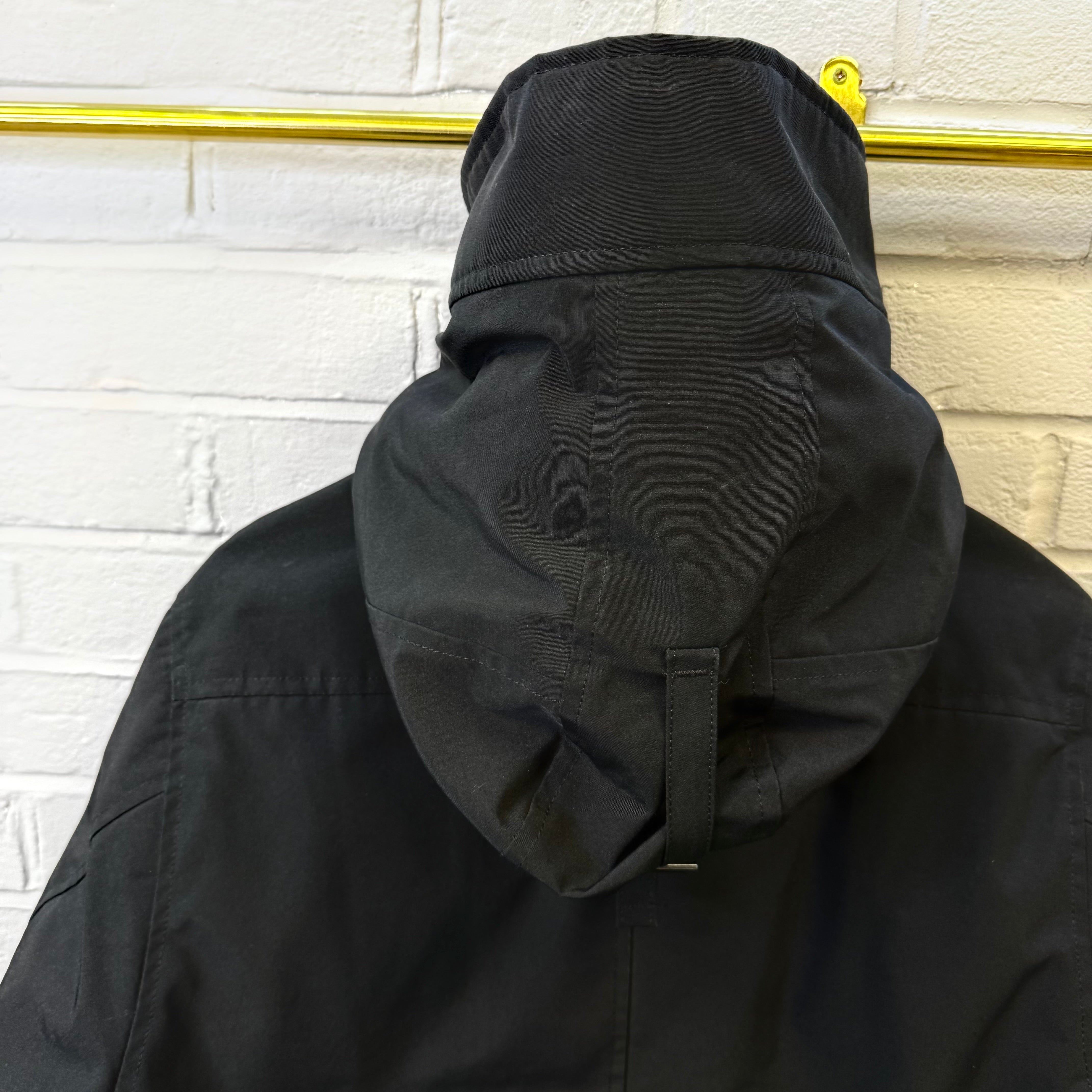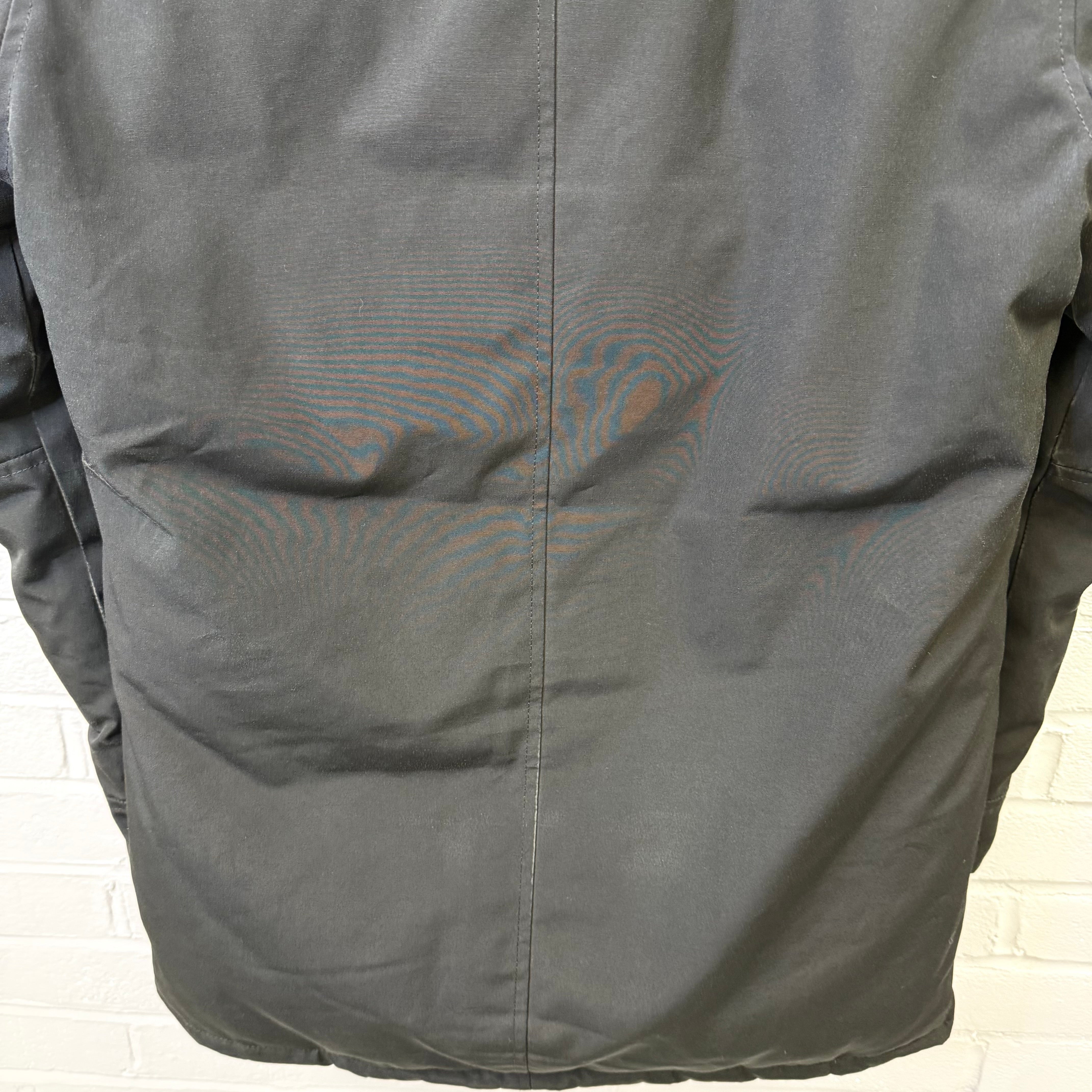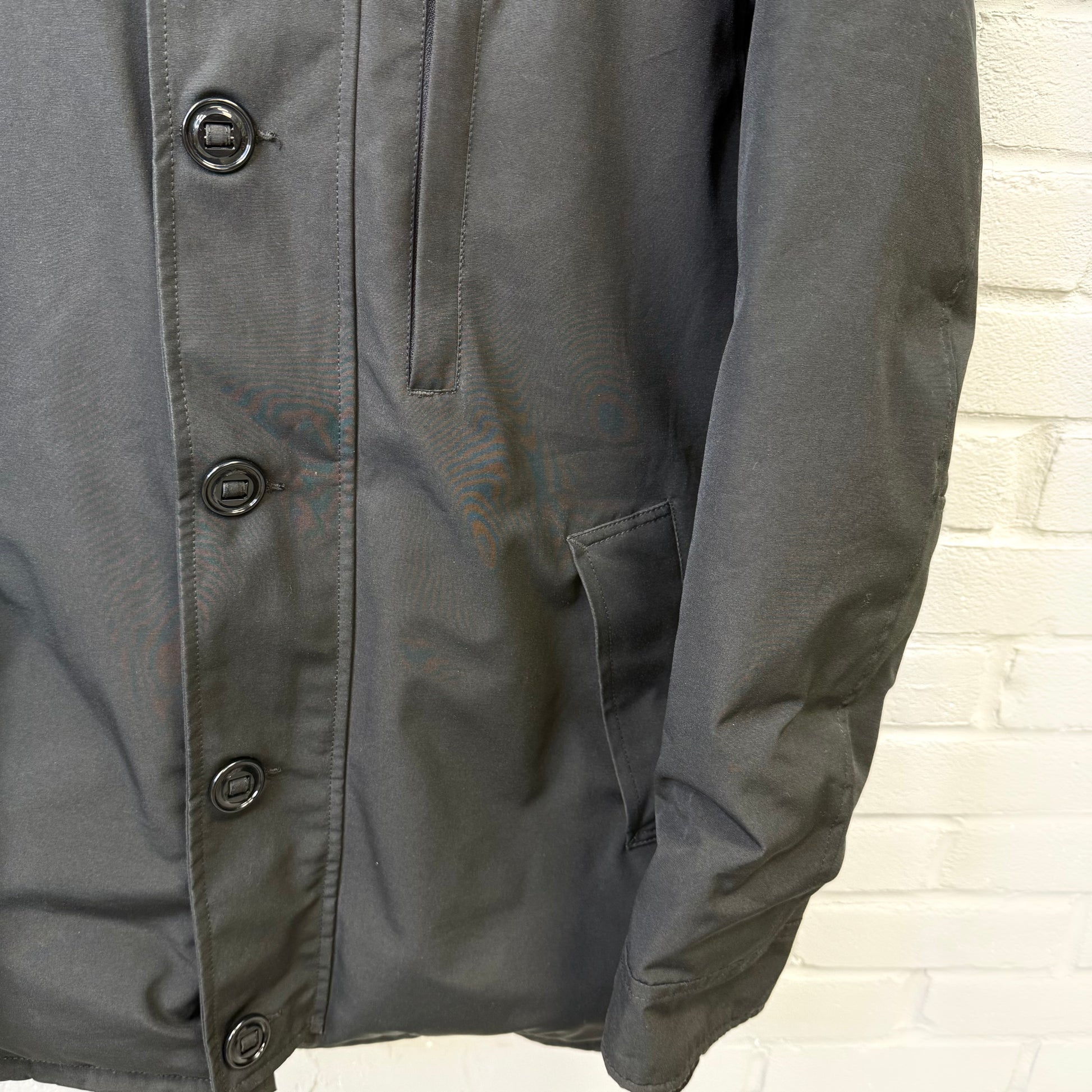 Pre-owned Canada Goose Chateau Parka in black Arctic Tech fabric, offering exceptional warmth and weather resistance with a sleek, slim silhouette. Features the iconic CG patch on the sleeve, insulated hood, heavy-duty zip and button closure, and fleece-lined pockets. Gently worn with light signs of use but overall excellent condition—perfect for reliable winter protection without compromising style.