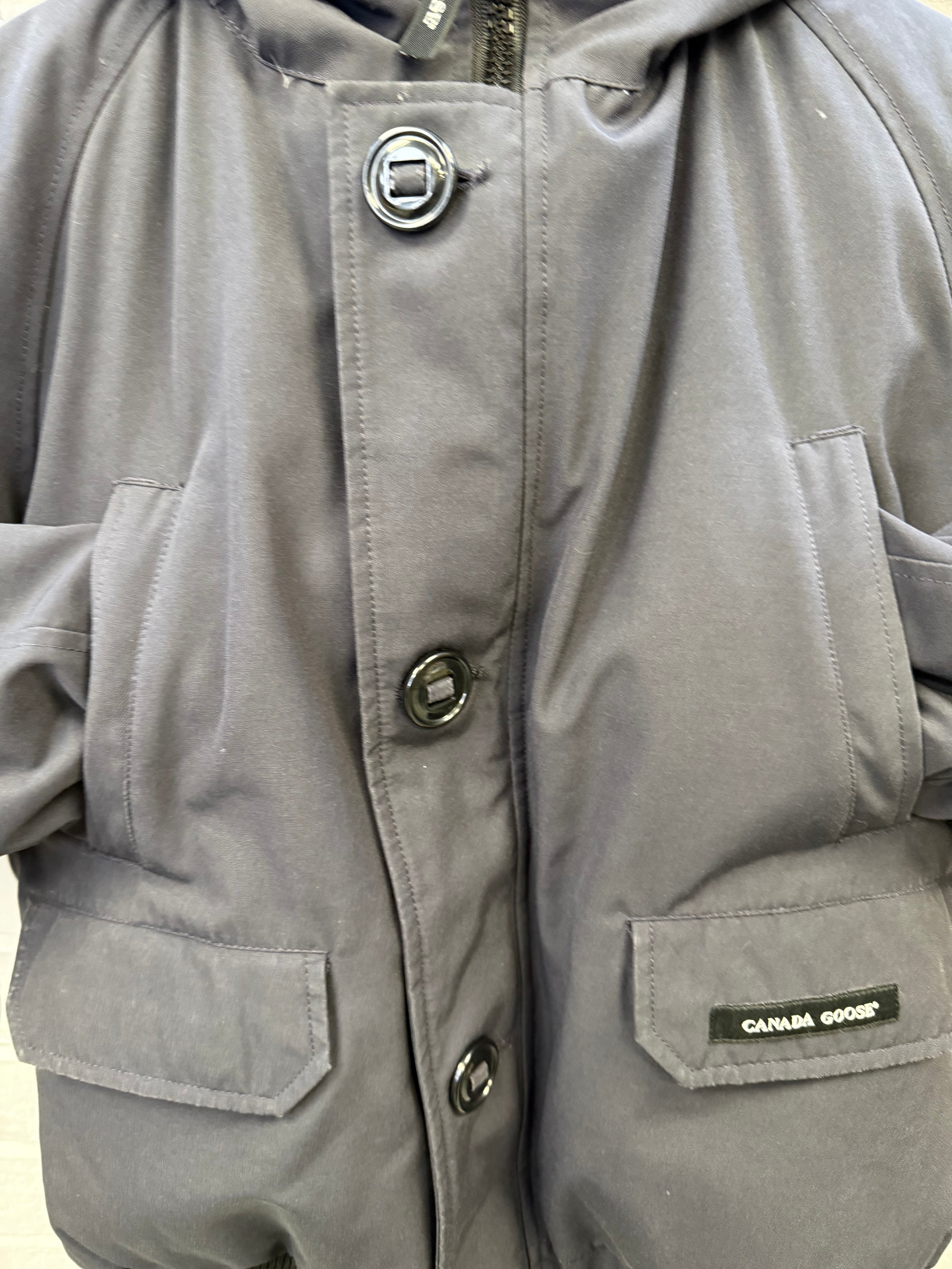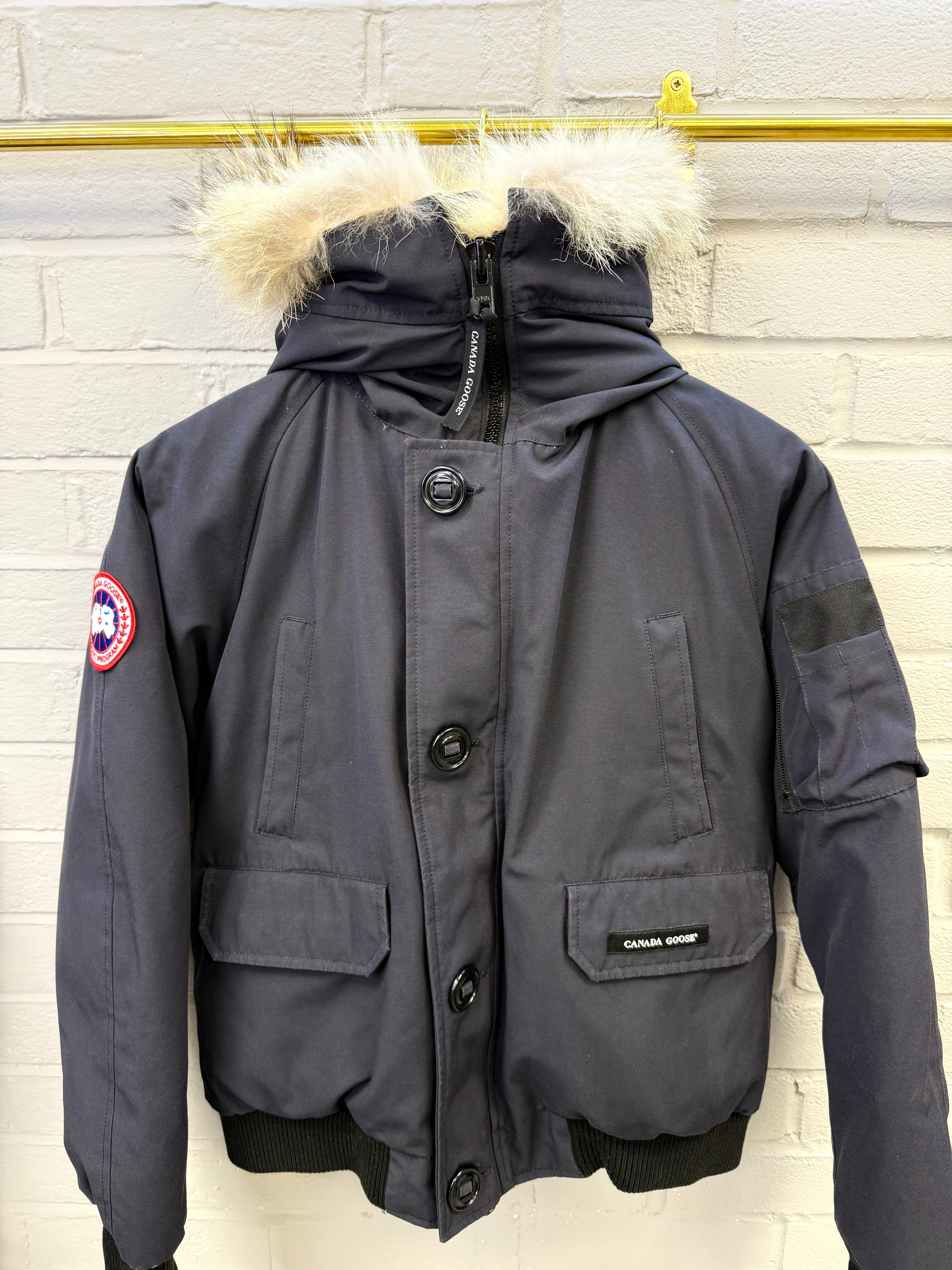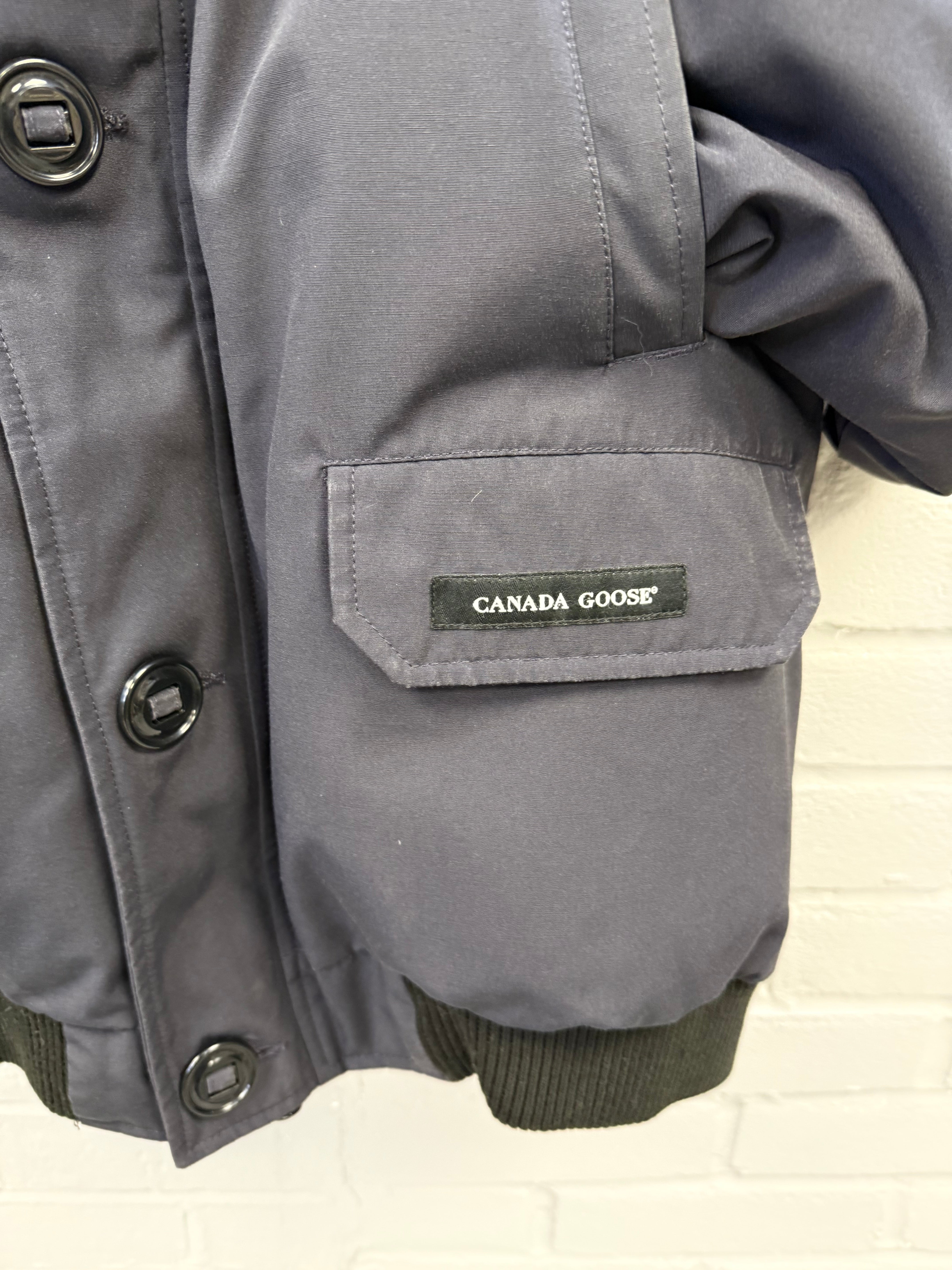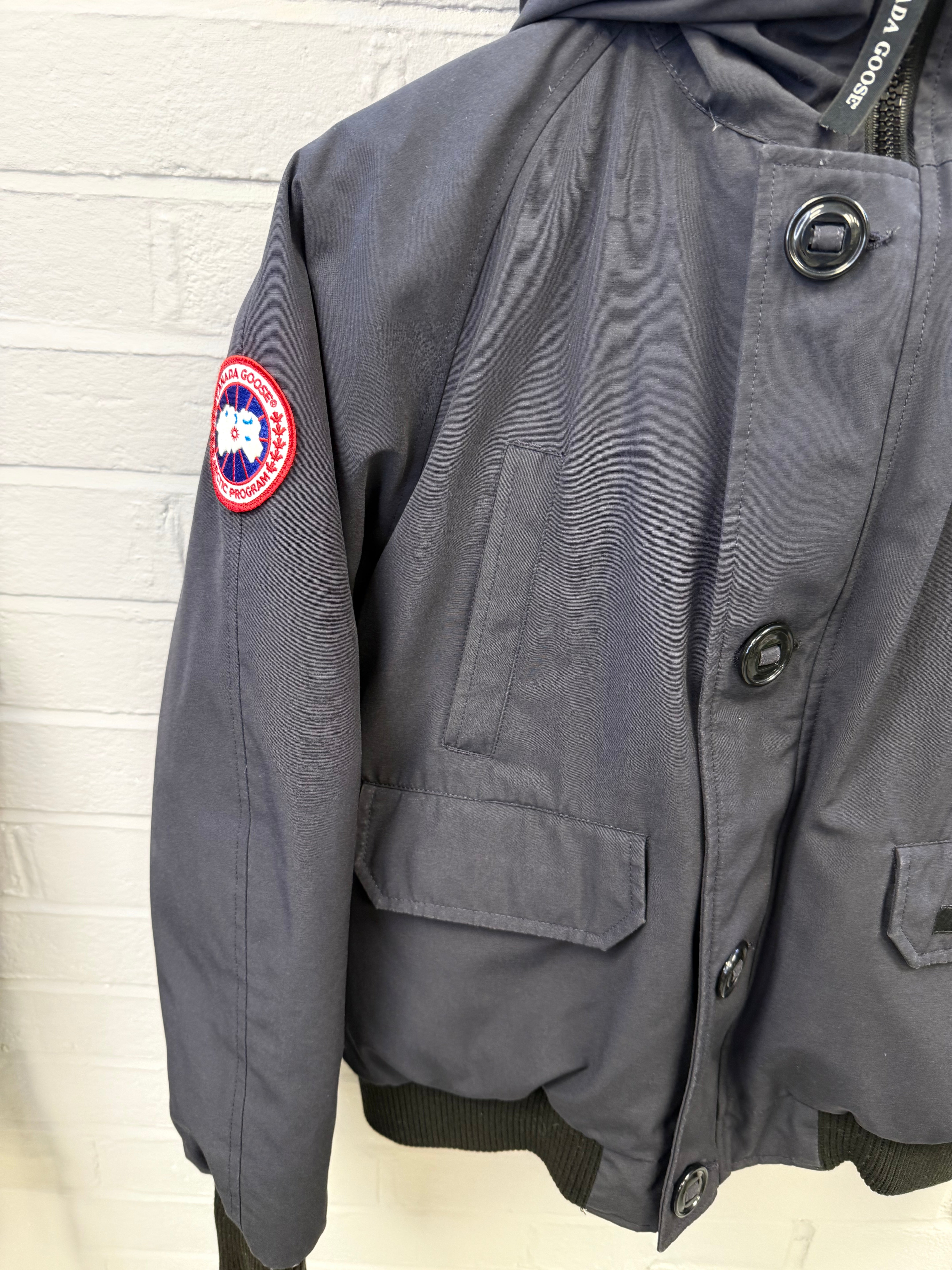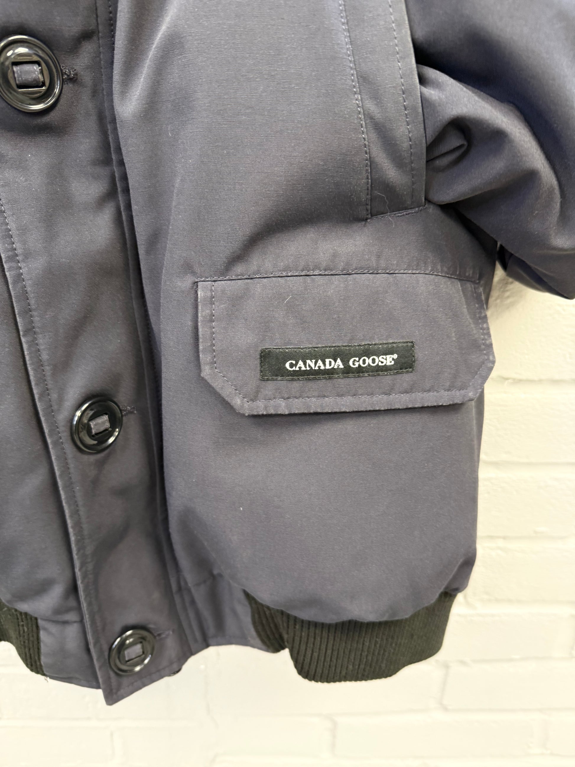 Pre-owned Canada Goose Chilliwack Bomber in Atlantic Navy, featuring a durable Arctic Tech shell, ribbed cuffs and hem, signature sleeve patch, and detachable fur-trimmed hood. Shows light wear consistent with regular use but remains warm, functional, and in solid overall condition—classic short bomber fit built for cold-weather performance.