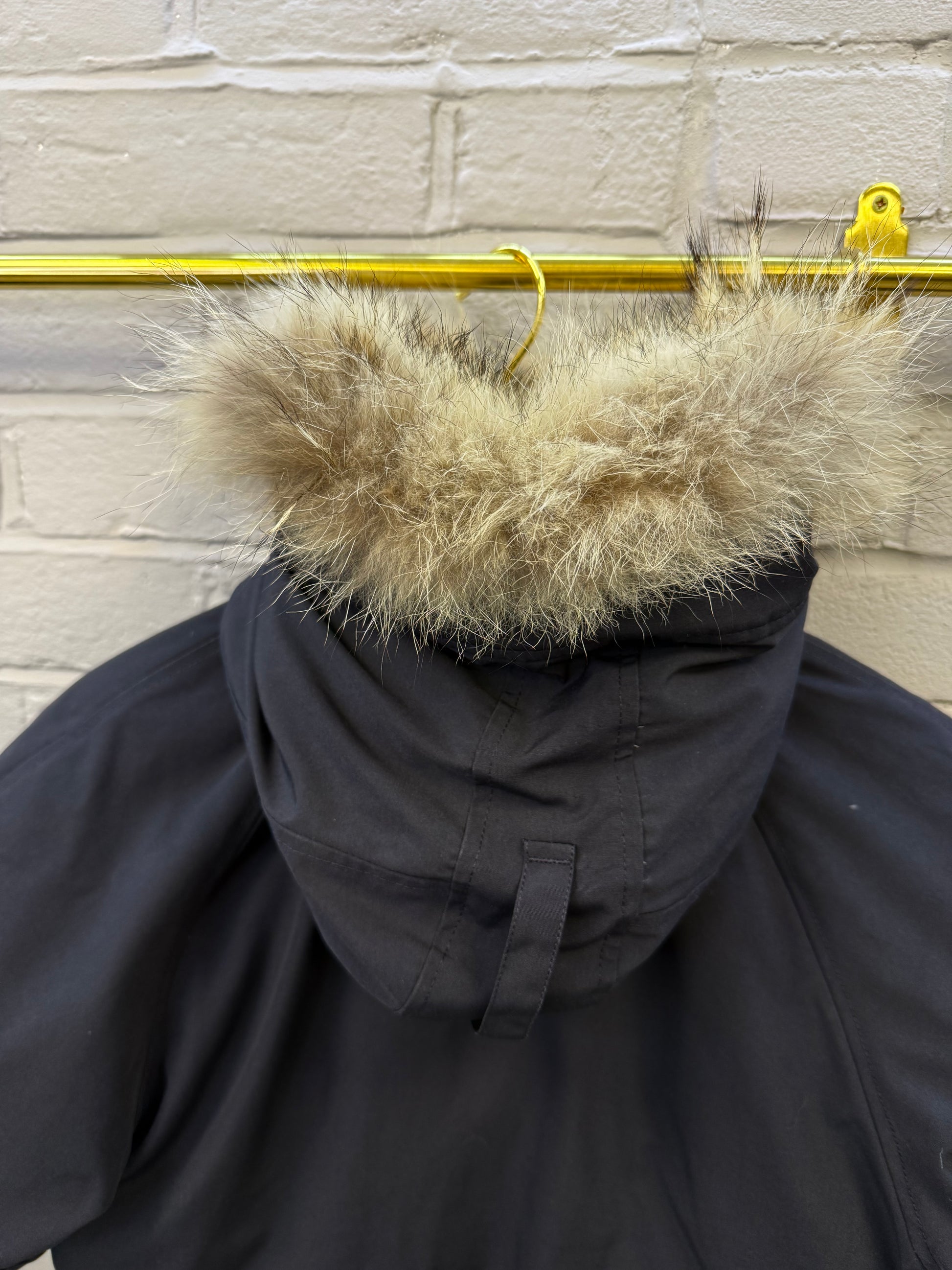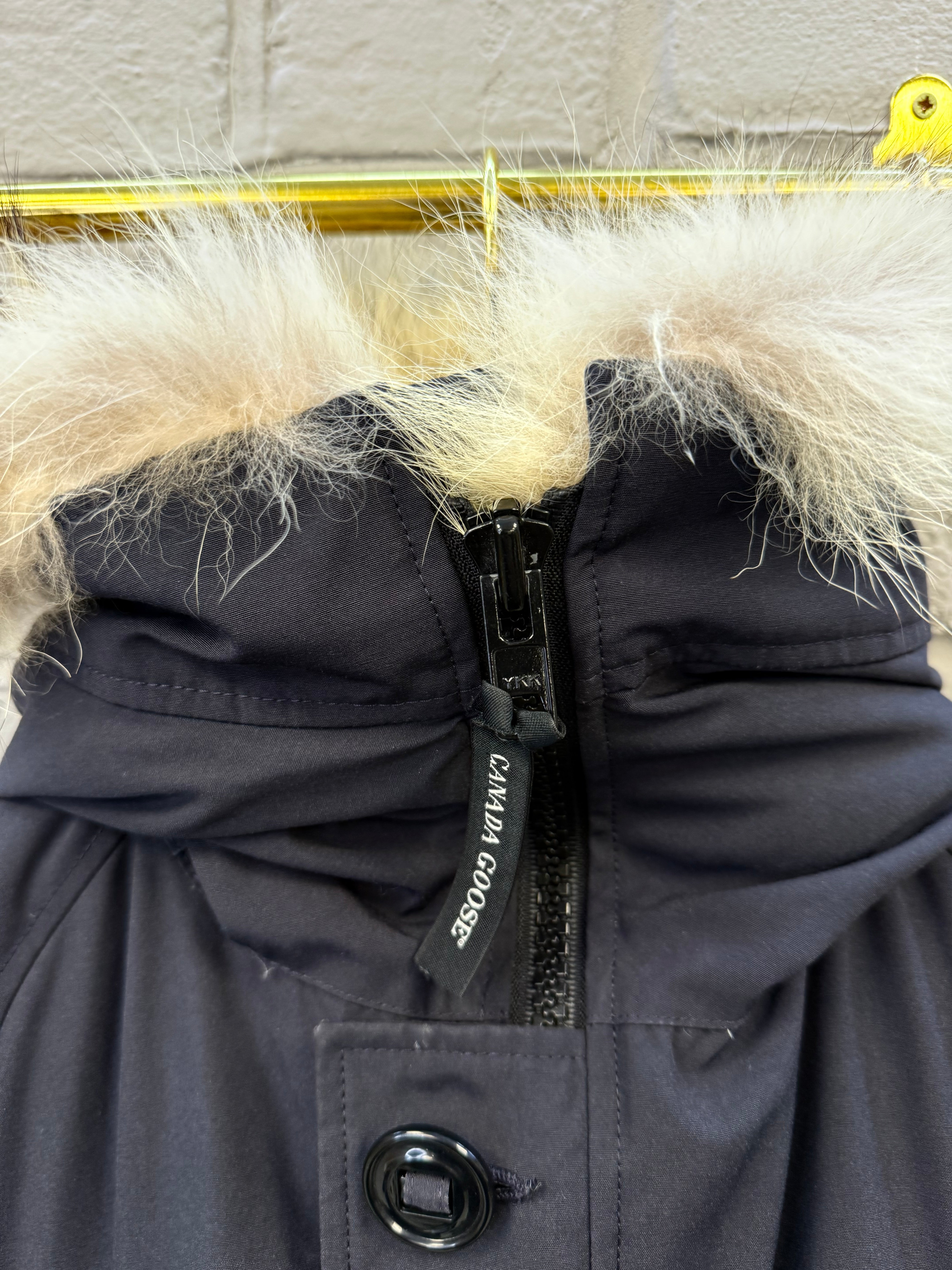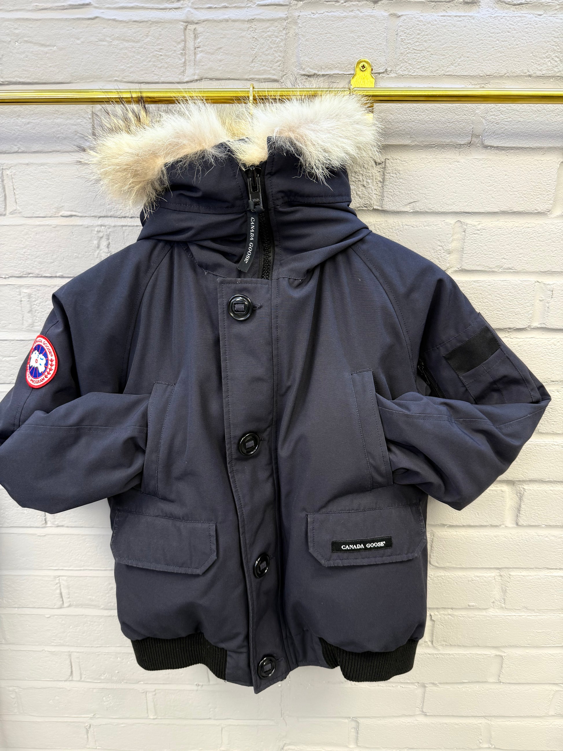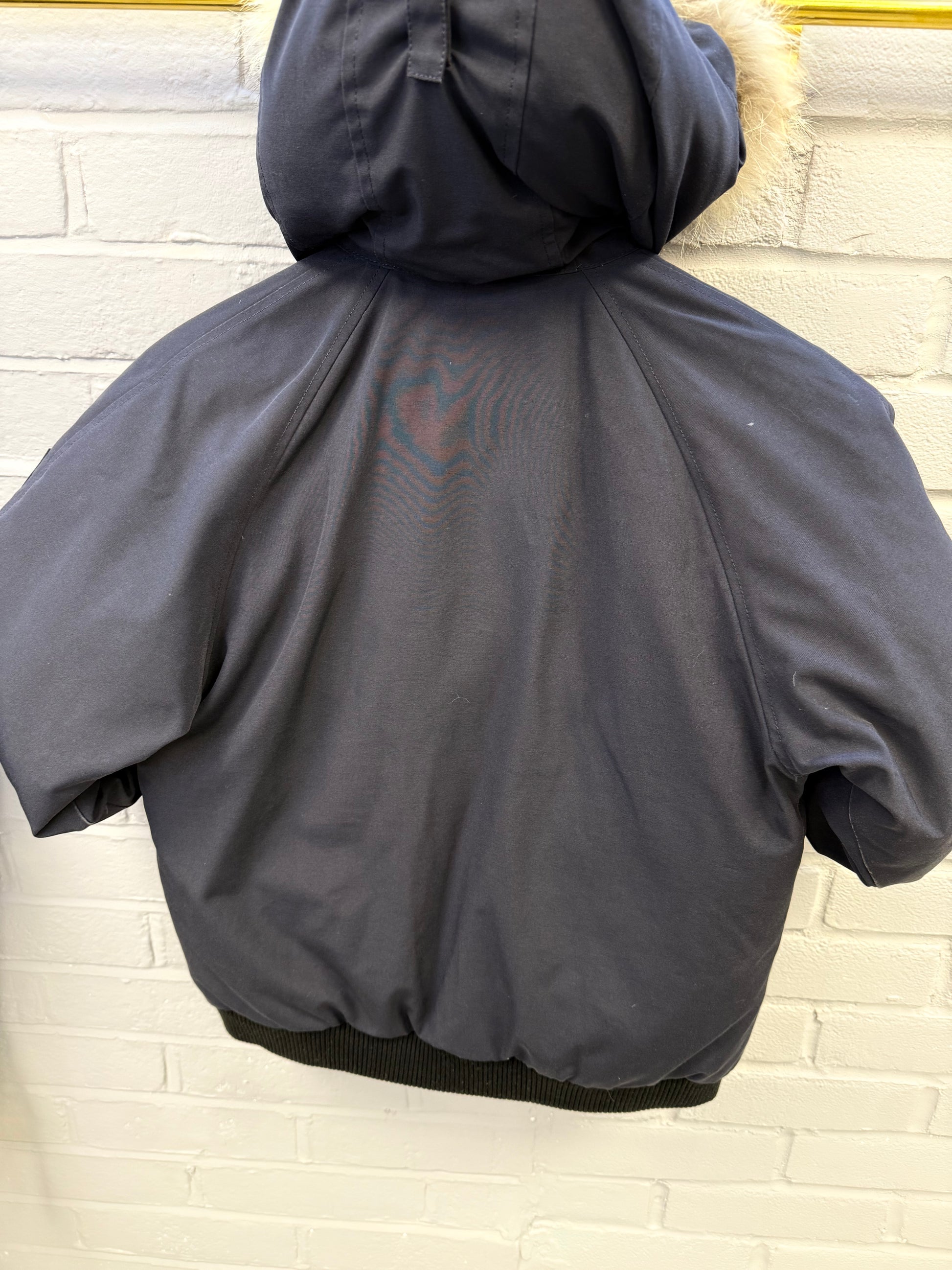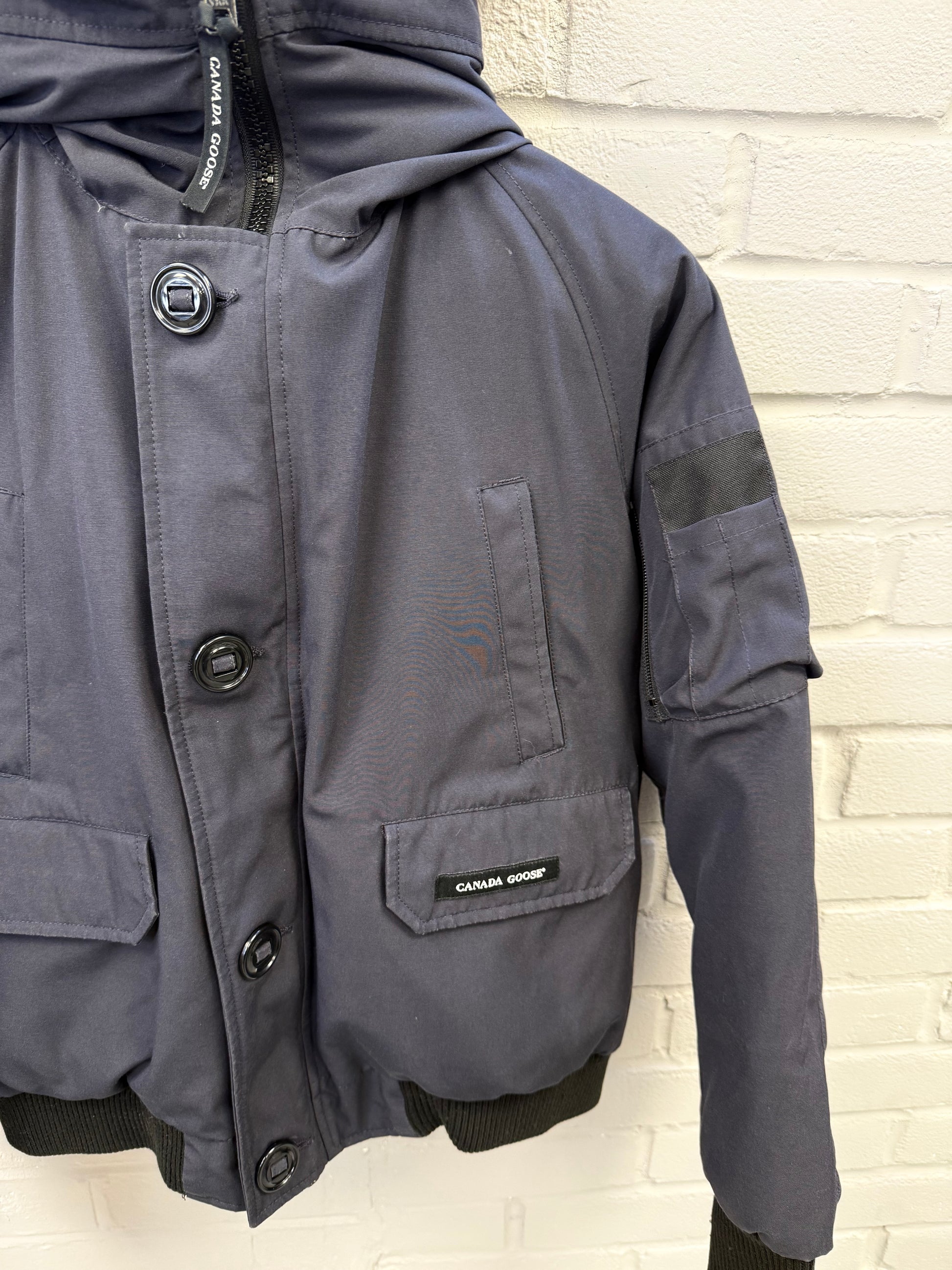 Pre-owned Canada Goose Chilliwack Bomber in Atlantic Navy, featuring a durable Arctic Tech shell, ribbed cuffs and hem, signature sleeve patch, and detachable fur-trimmed hood. Shows light wear consistent with regular use but remains warm, functional, and in solid overall condition—classic short bomber fit built for cold-weather performance.