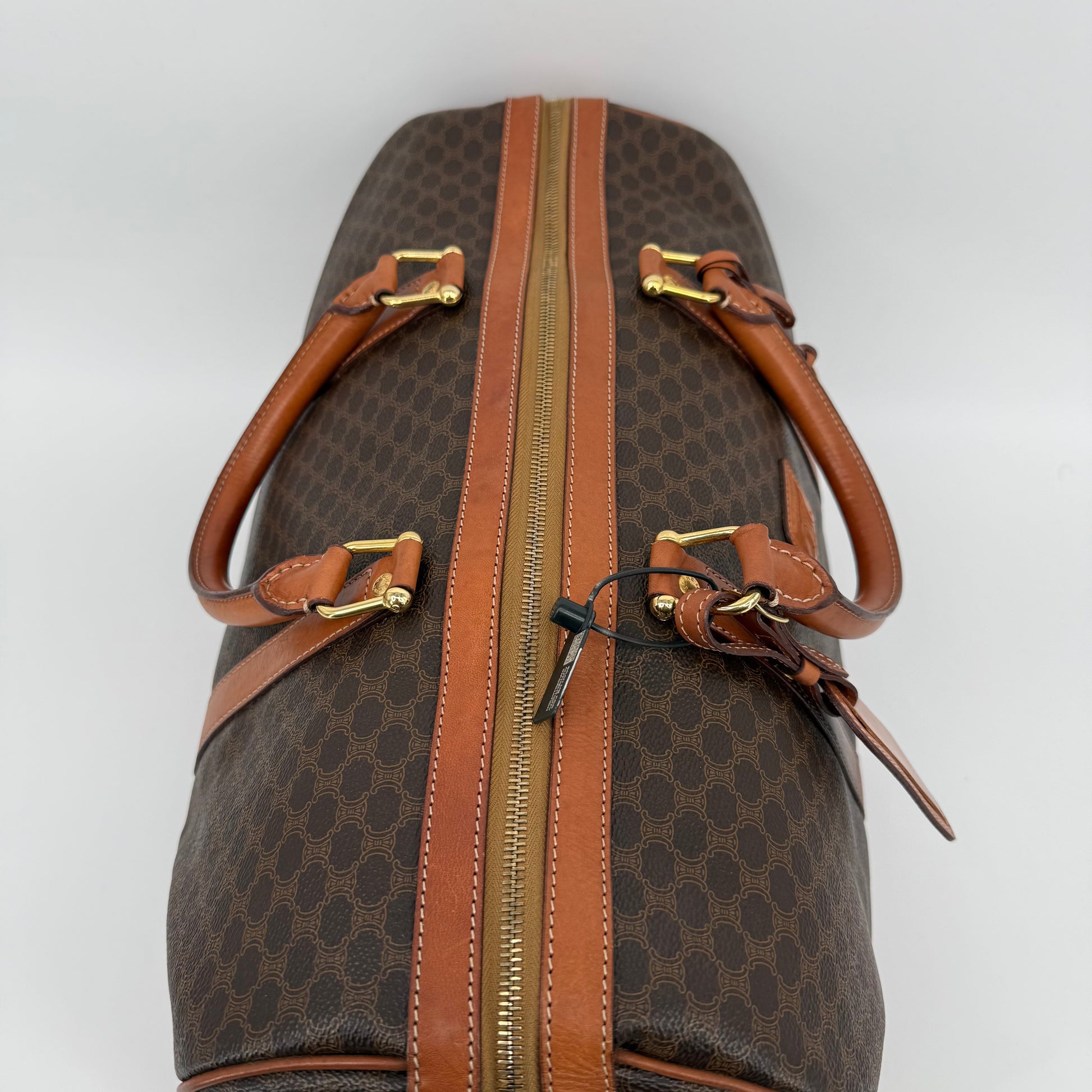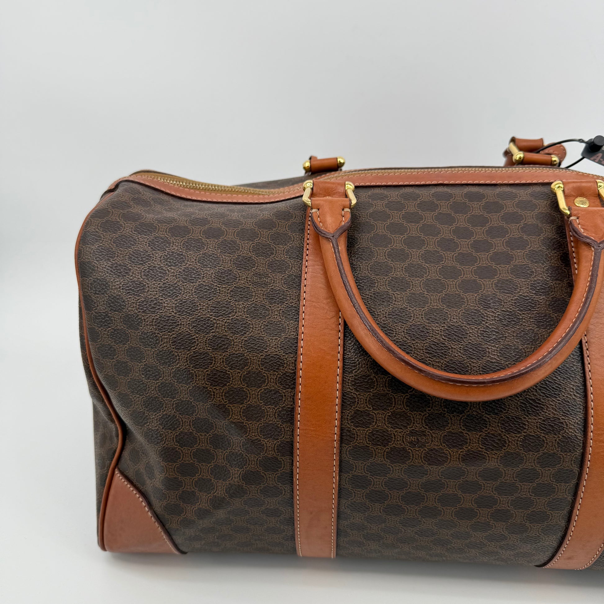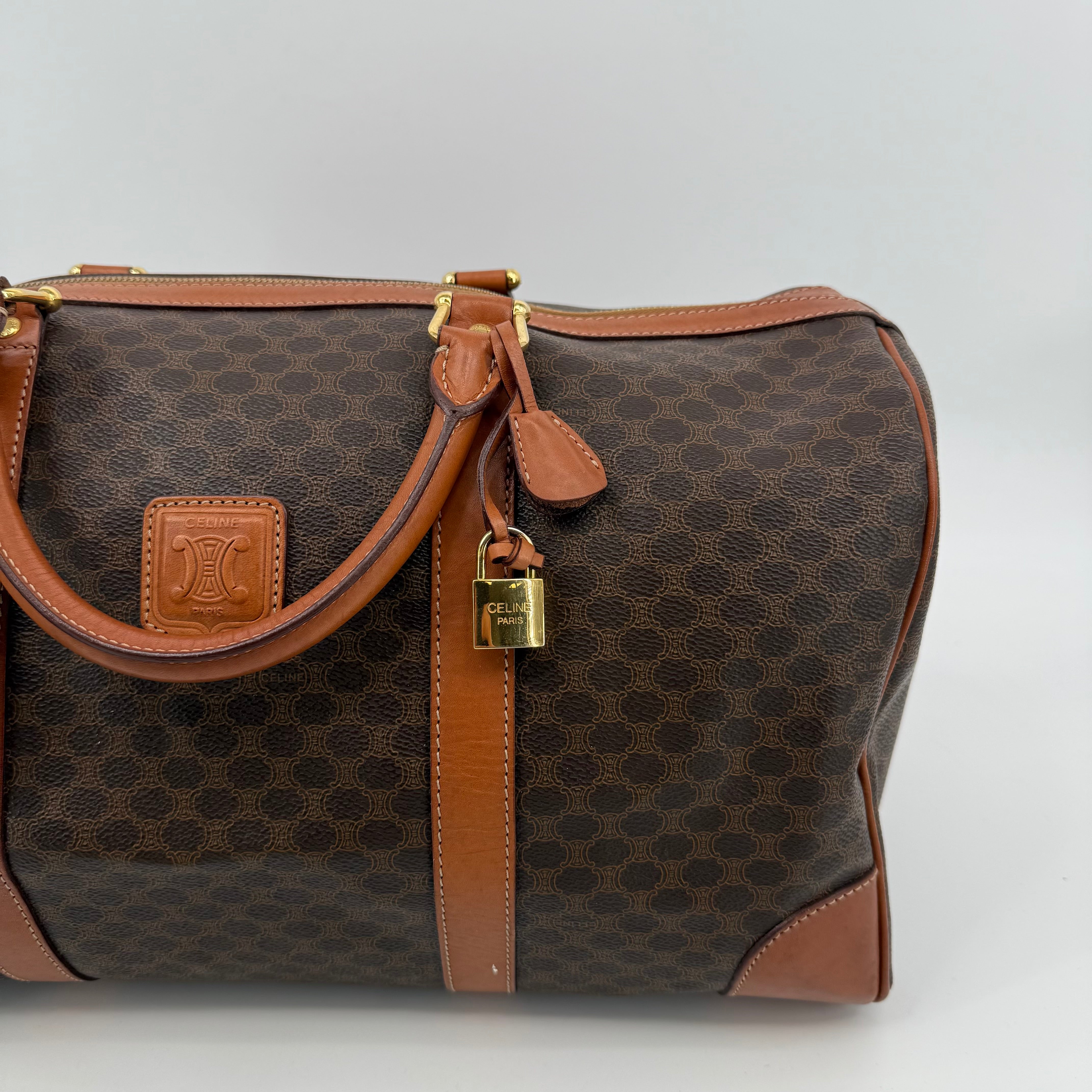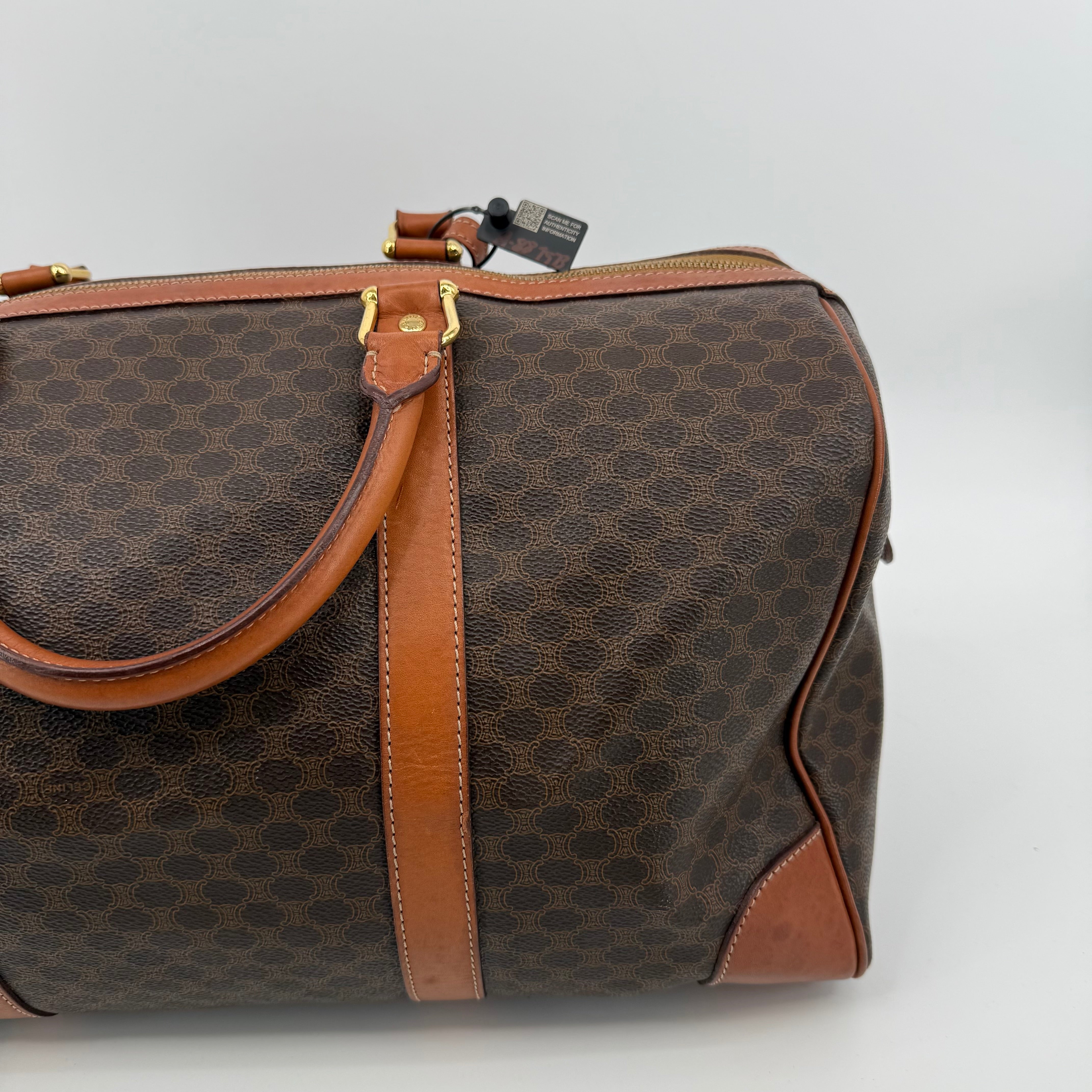 This Celine Macadam Boston bag showcases the house’s iconic vintage elegance, crafted in the classic dark brown Macadam coated canvas with repeating Celine monogram throughout. Accented with smooth tan leather trim, structured rolled handles, and polished gold-tone hardware, the bag offers a refined yet practical silhouette. The zip-top closure provides secure access to a spacious interior, making it ideal for travel or everyday use, while the leather detailing and padlock accent add a timeless luxury finish. Durable, versatile, and unmistakably Celine, this Boston bag is a sophisticated staple that blends heritage design with functional style.