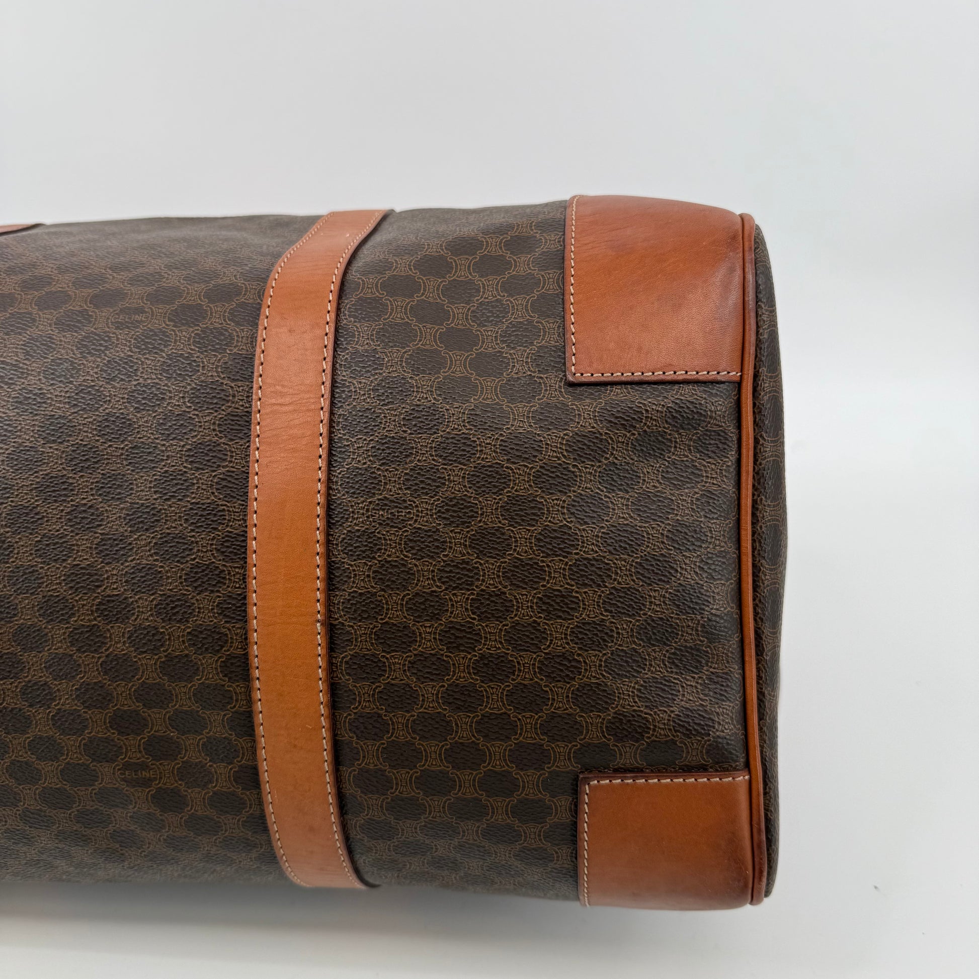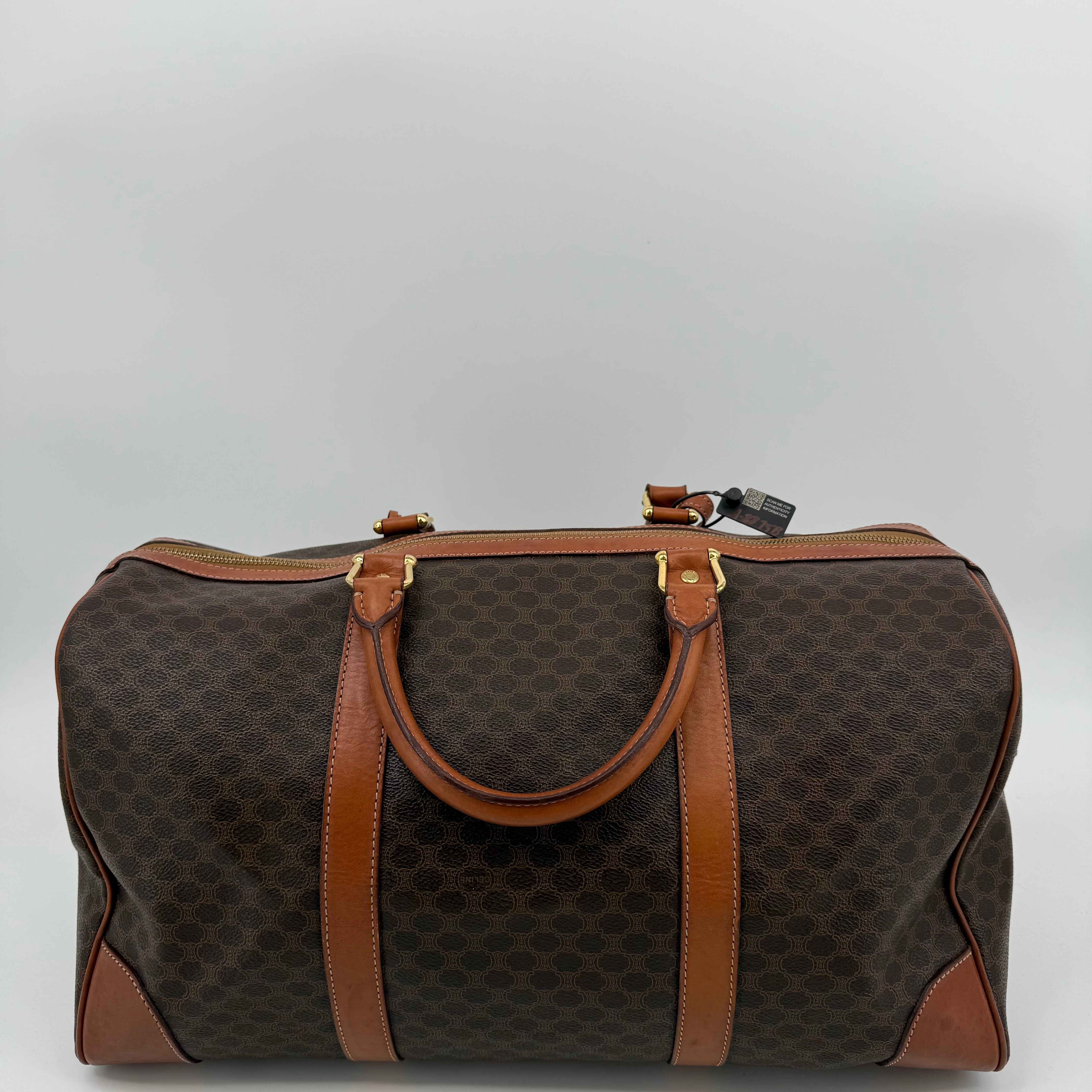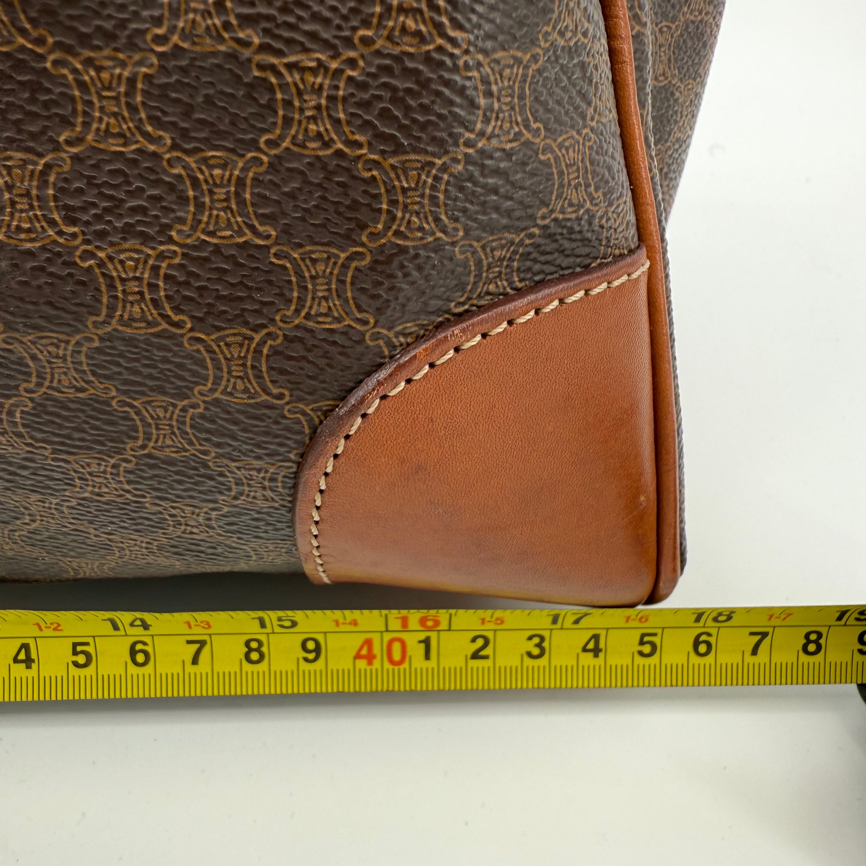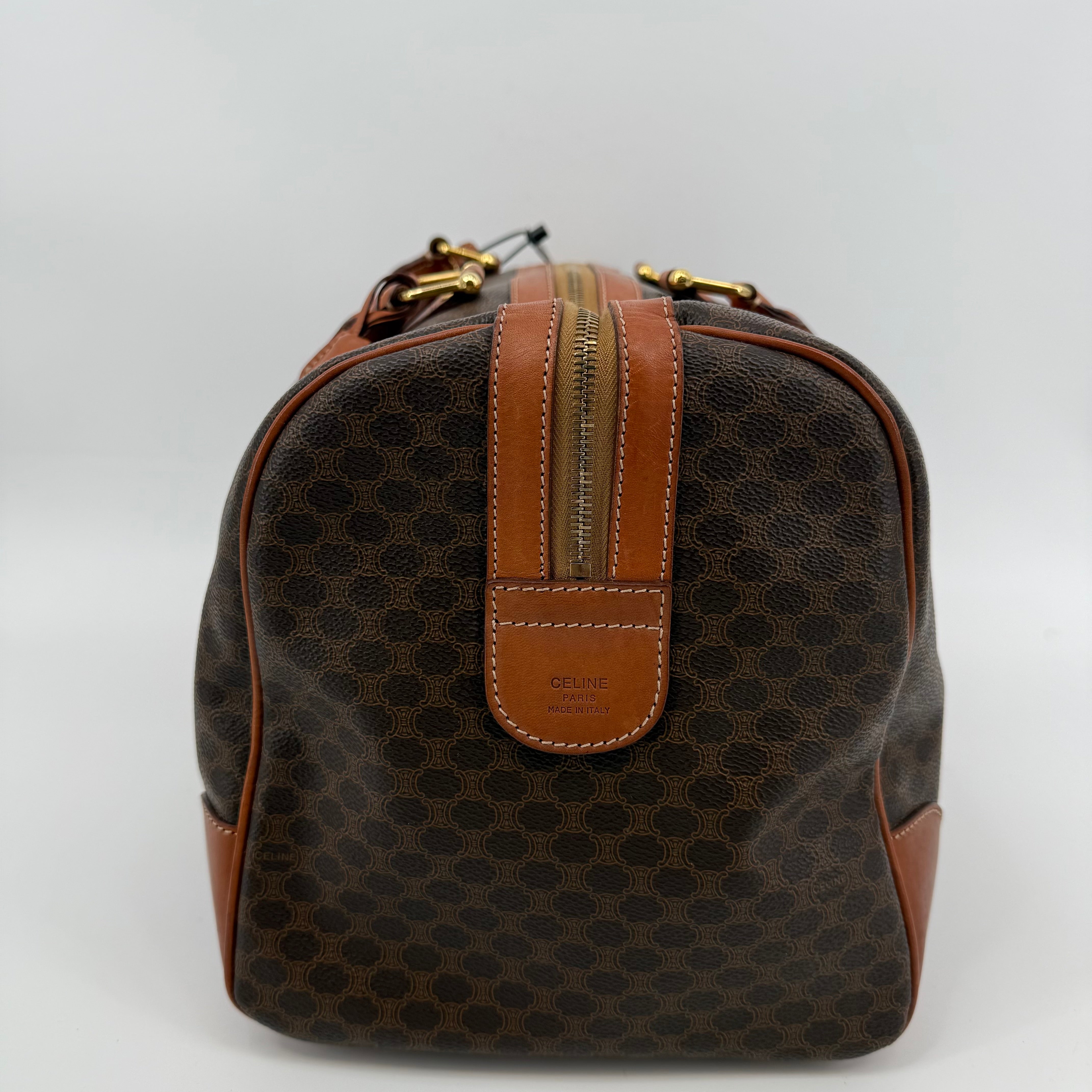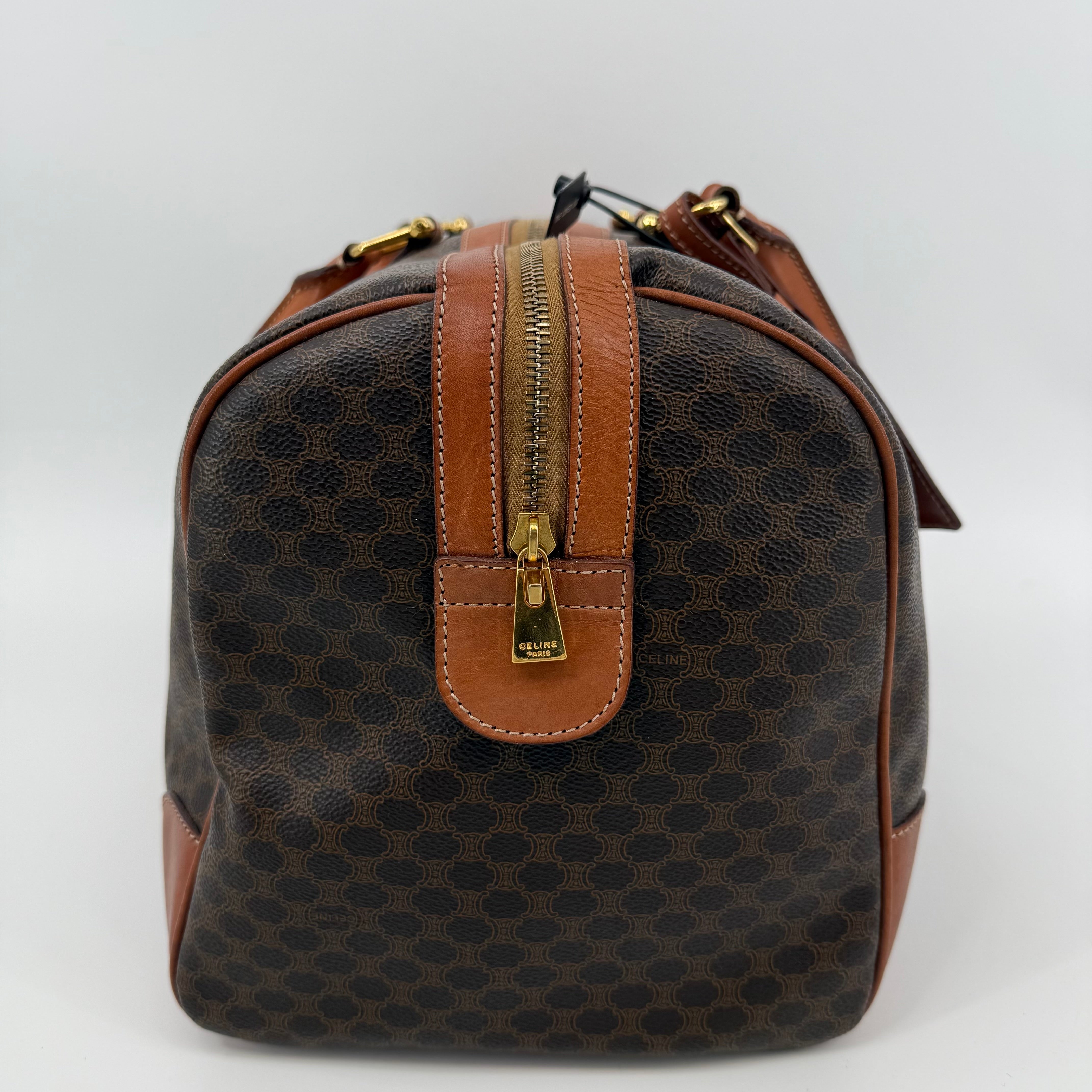 This Celine Macadam Boston bag showcases the house’s iconic vintage elegance, crafted in the classic dark brown Macadam coated canvas with repeating Celine monogram throughout. Accented with smooth tan leather trim, structured rolled handles, and polished gold-tone hardware, the bag offers a refined yet practical silhouette. The zip-top closure provides secure access to a spacious interior, making it ideal for travel or everyday use, while the leather detailing and padlock accent add a timeless luxury finish. Durable, versatile, and unmistakably Celine, this Boston bag is a sophisticated staple that blends heritage design with functional style.
