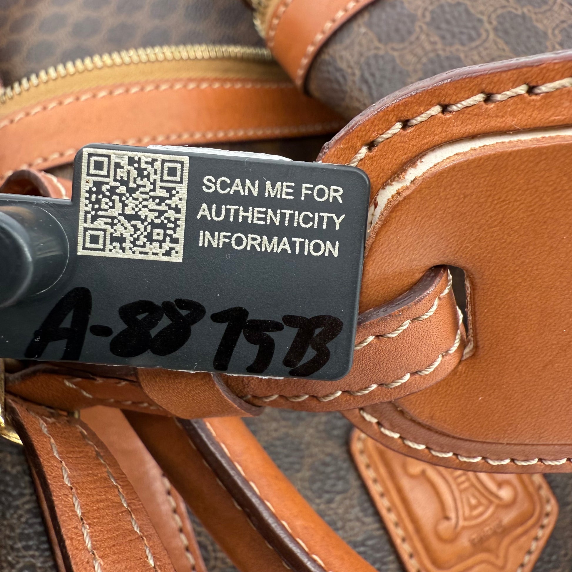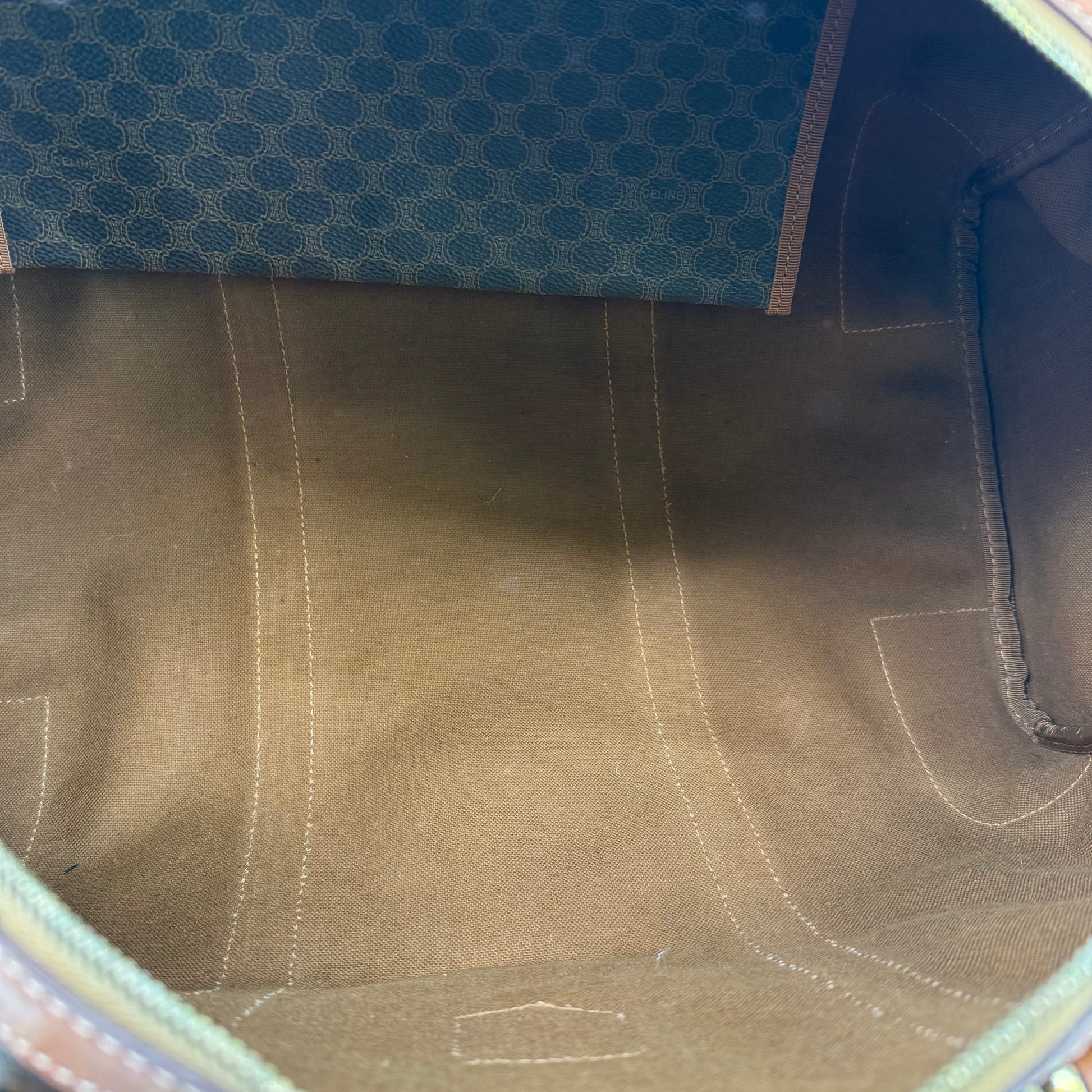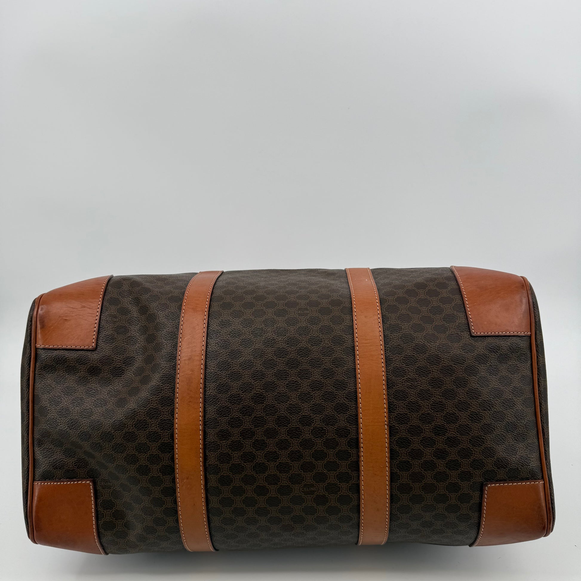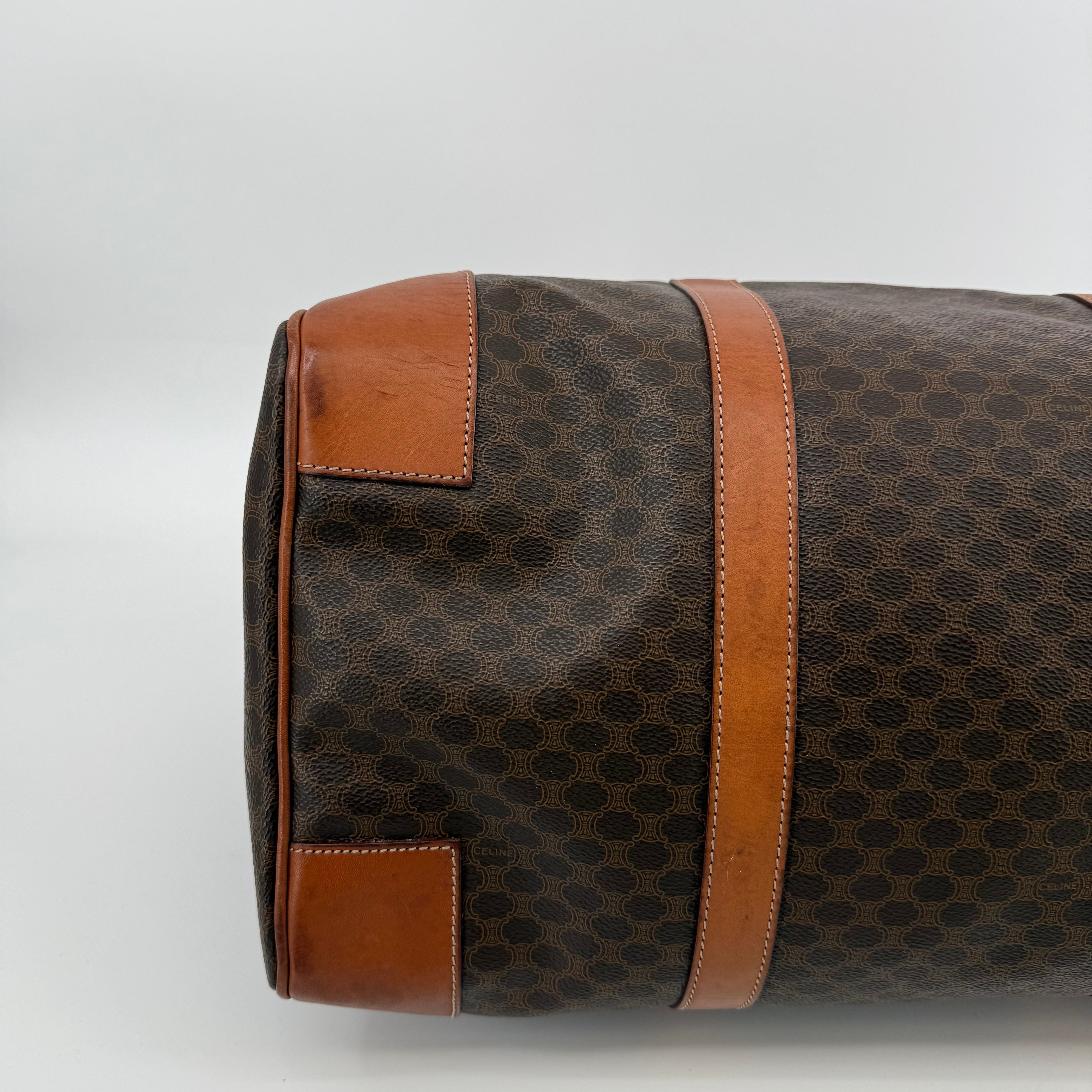 This Celine Macadam Boston bag showcases the house’s iconic vintage elegance, crafted in the classic dark brown Macadam coated canvas with repeating Celine monogram throughout. Accented with smooth tan leather trim, structured rolled handles, and polished gold-tone hardware, the bag offers a refined yet practical silhouette. The zip-top closure provides secure access to a spacious interior, making it ideal for travel or everyday use, while the leather detailing and padlock accent add a timeless luxury finish. Durable, versatile, and unmistakably Celine, this Boston bag is a sophisticated staple that blends heritage design with functional style.
