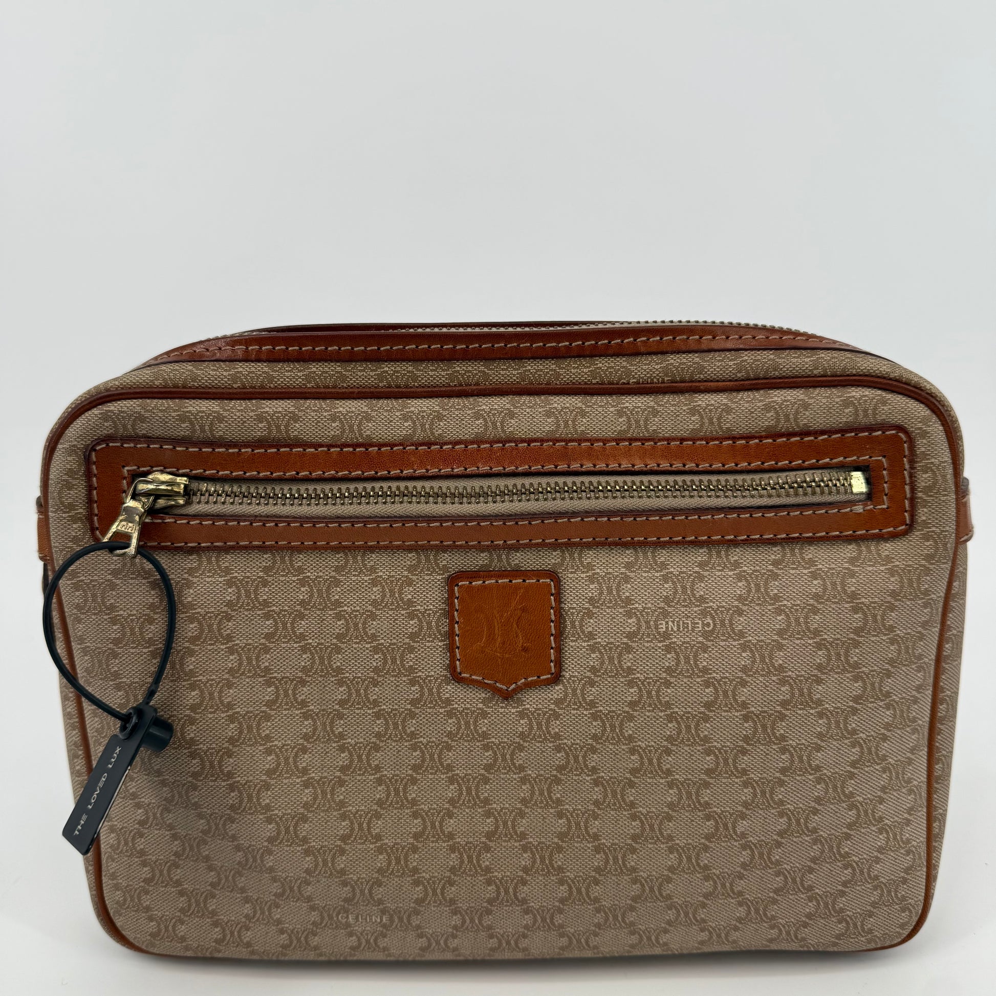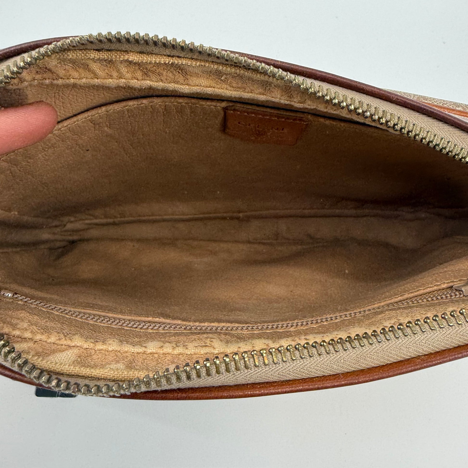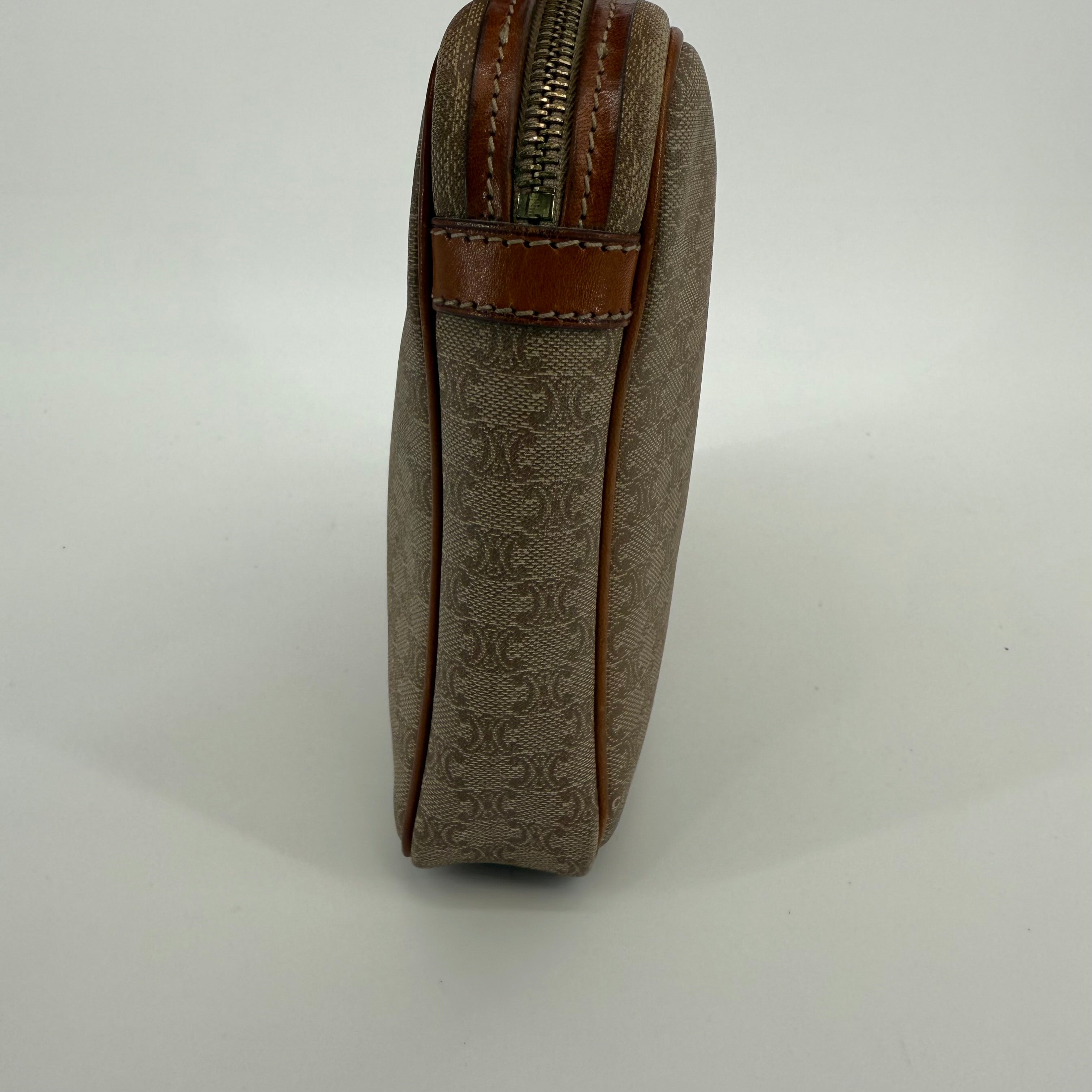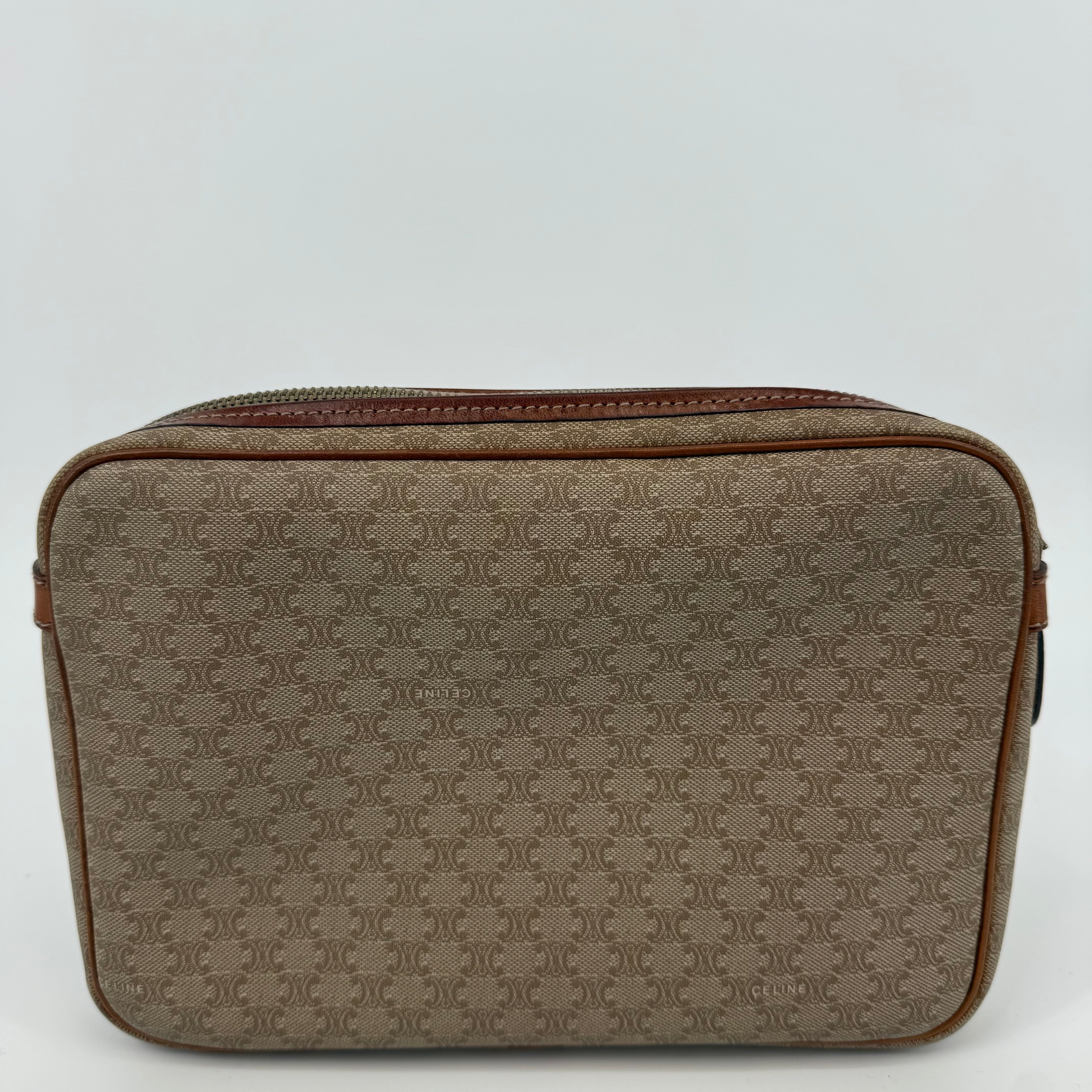 Pre-owned Celine monogram washbag featuring the signature macadam pattern with leather trim and zip closure. Spacious interior ideal for toiletries or daily essentials, with lining showing light, expected signs of use. Exterior canvas remains in good condition with minor wear consistent with age. A classic and practical Celine accessory.