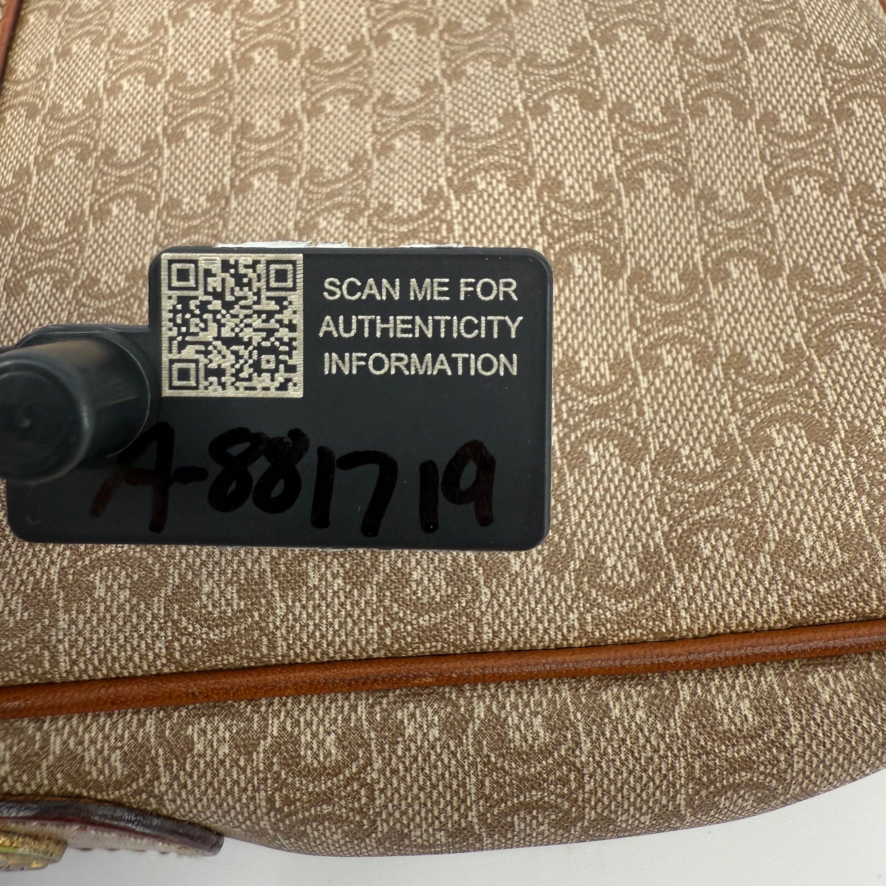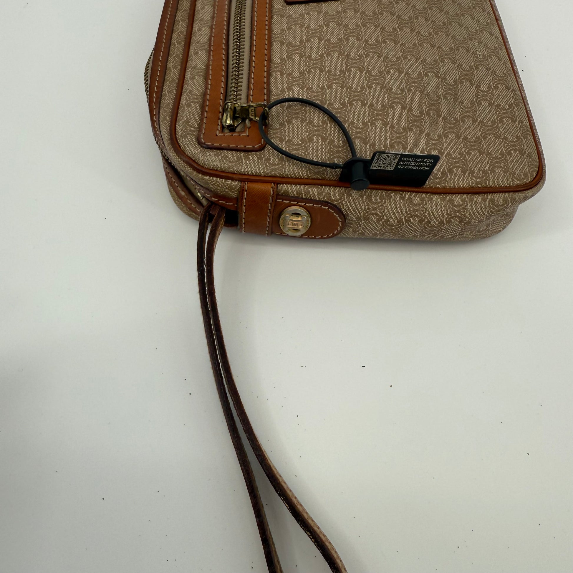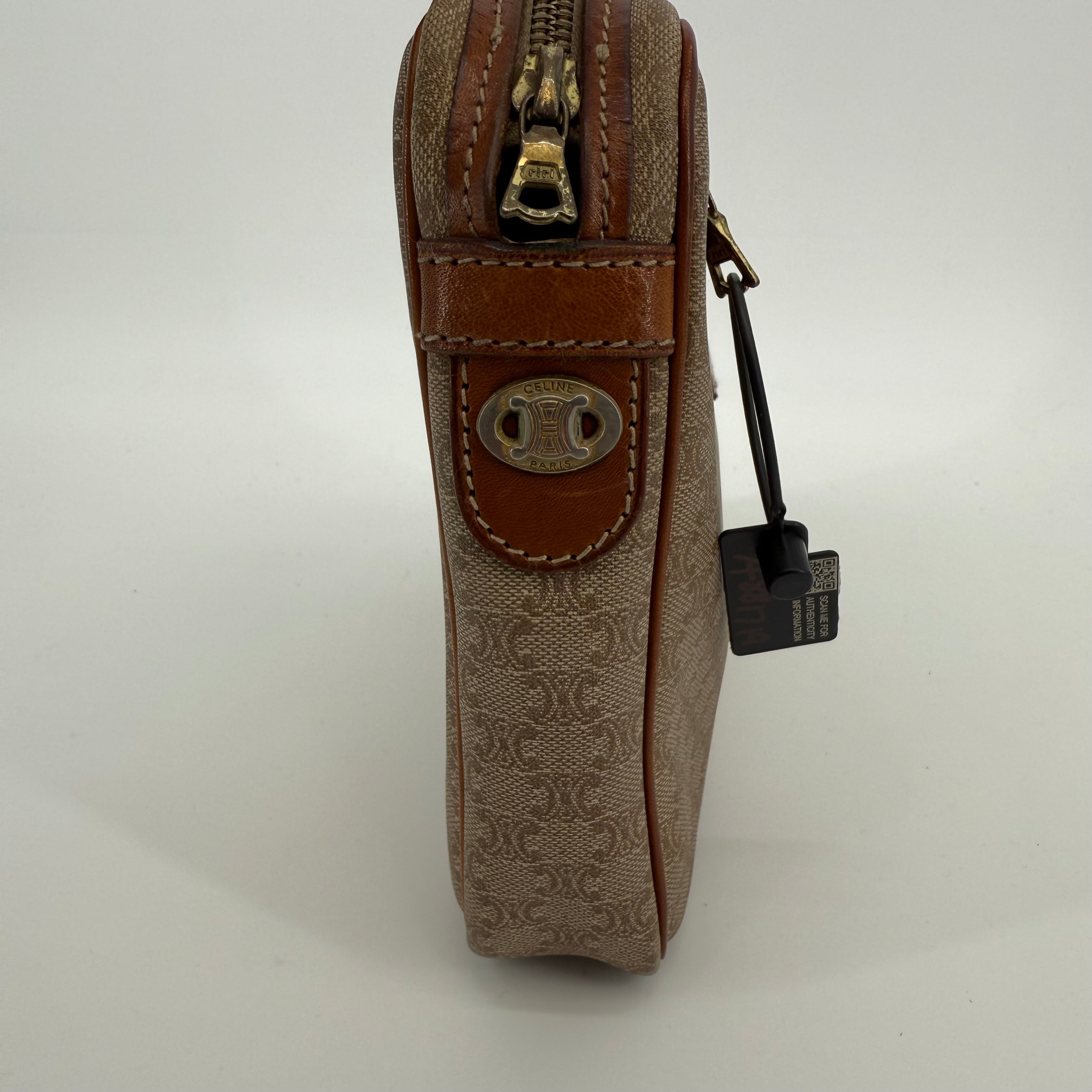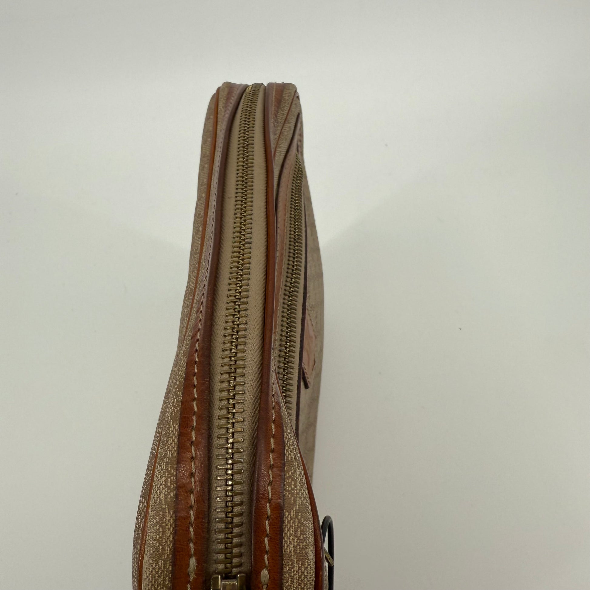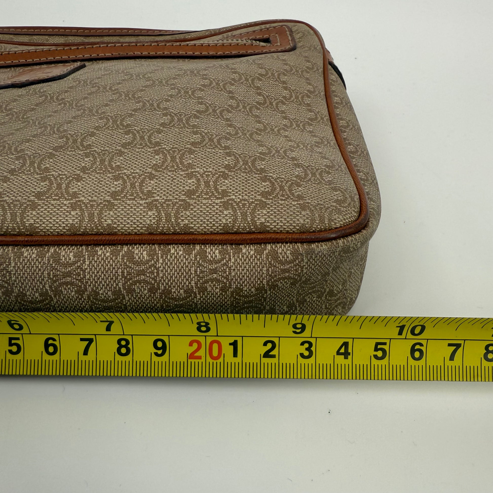 Pre-owned Celine monogram washbag featuring the signature macadam pattern with leather trim and zip closure. Spacious interior ideal for toiletries or daily essentials, with lining showing light, expected signs of use. Exterior canvas remains in good condition with minor wear consistent with age. A classic and practical Celine accessory.