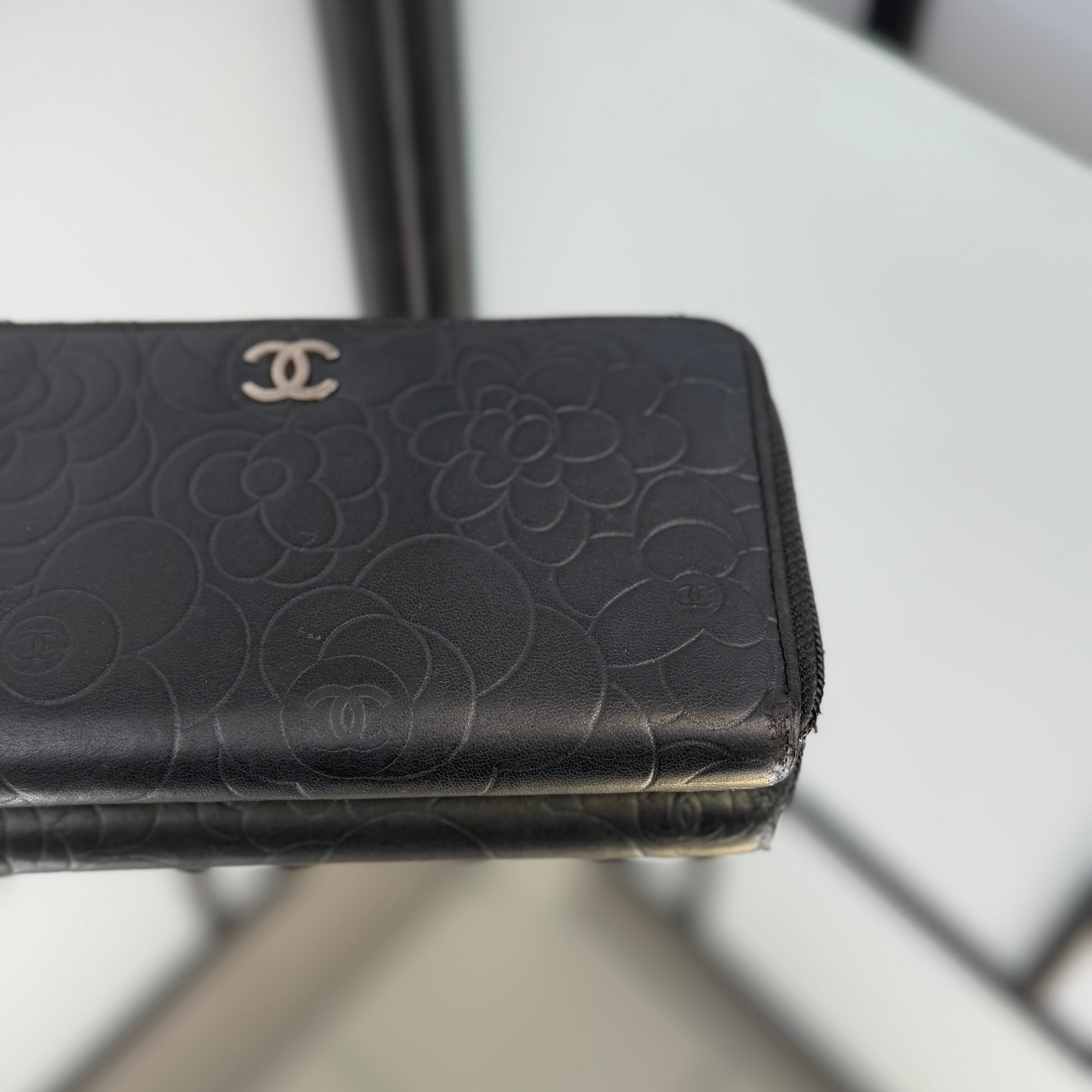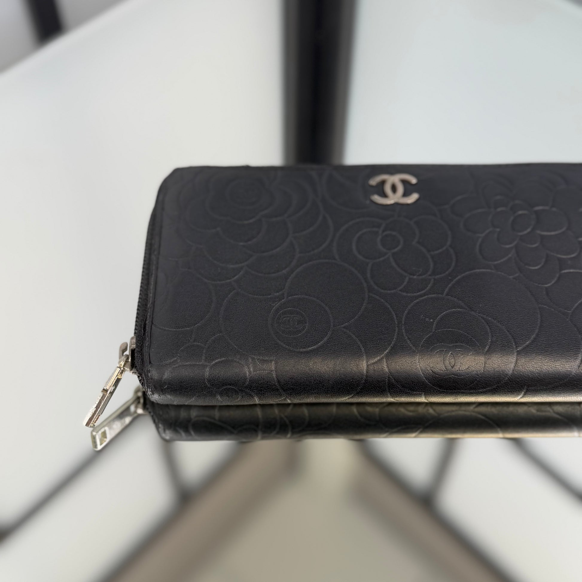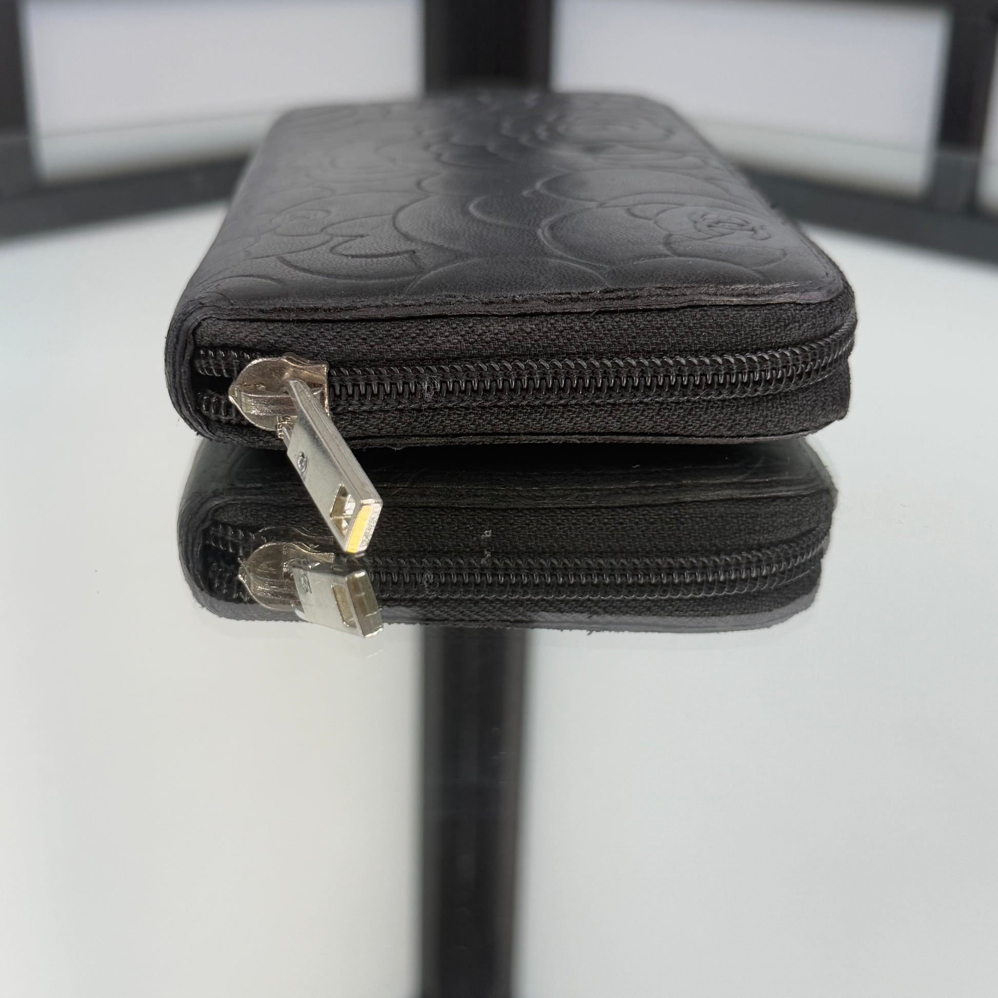 The CHANEL Black Camélia Zip Long Wallet is an exquisite blend of femininity and timeless design. Featuring the iconic Camélia flower motif embossed on supple black leather, this piece captures Chanel’s romantic elegance. With its practical zip-around closure and spacious interior, it’s both a statement of luxury and an everyday essential.