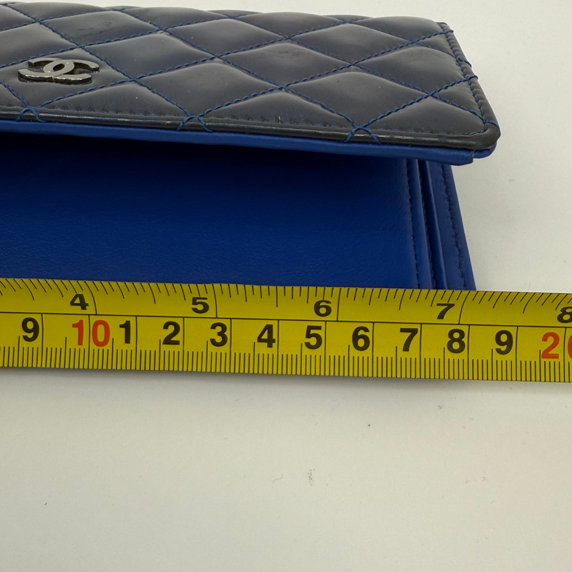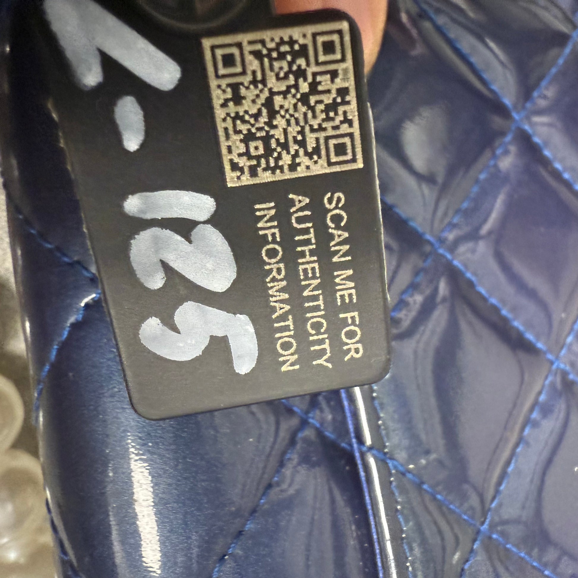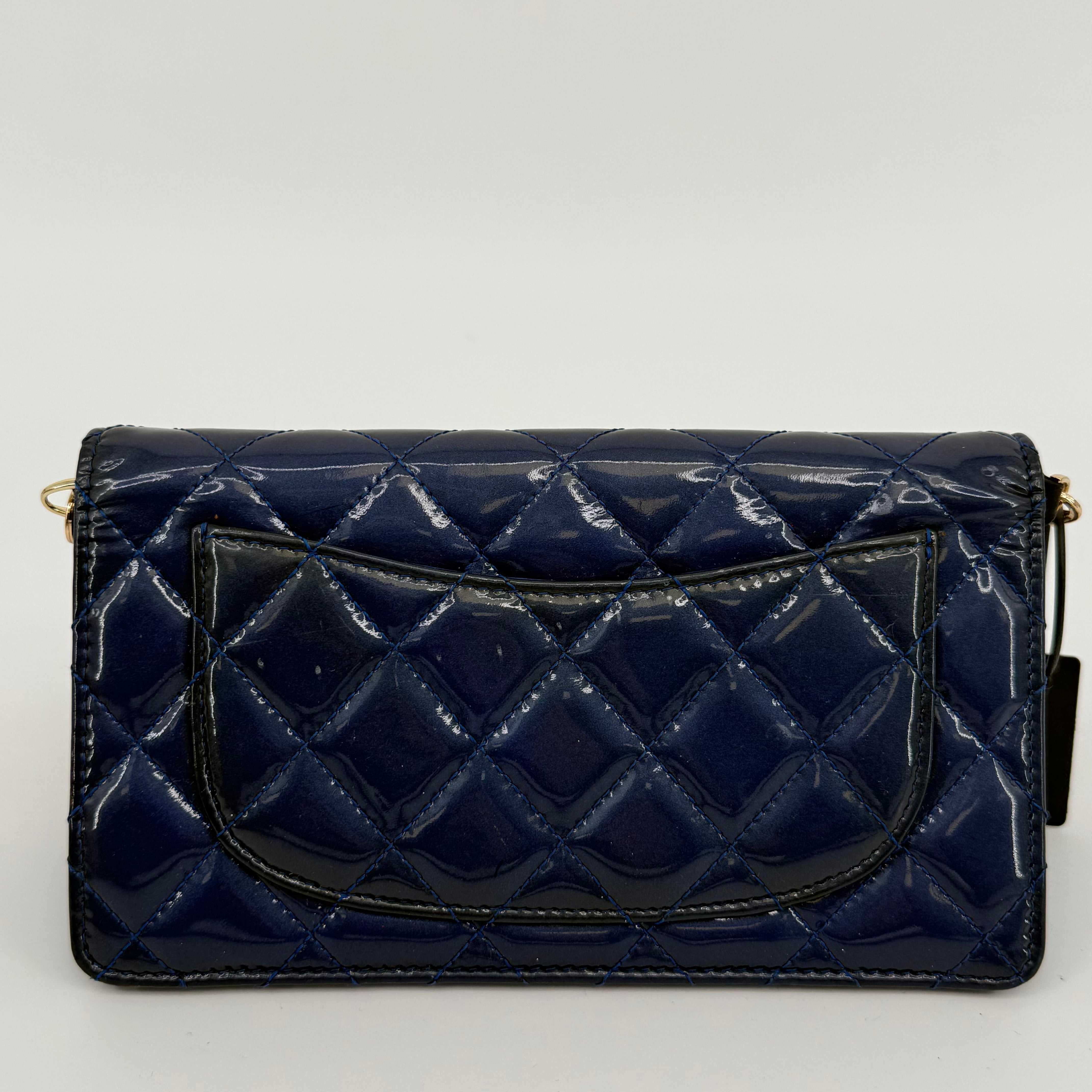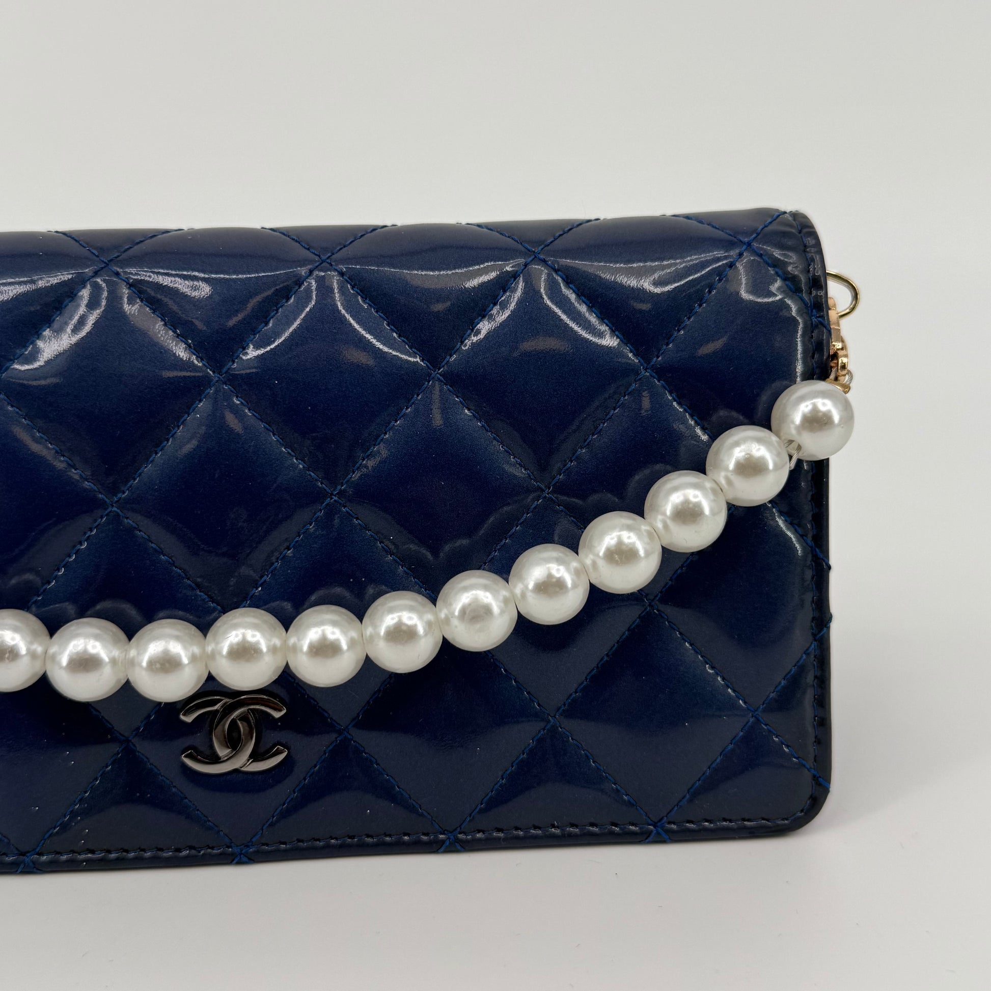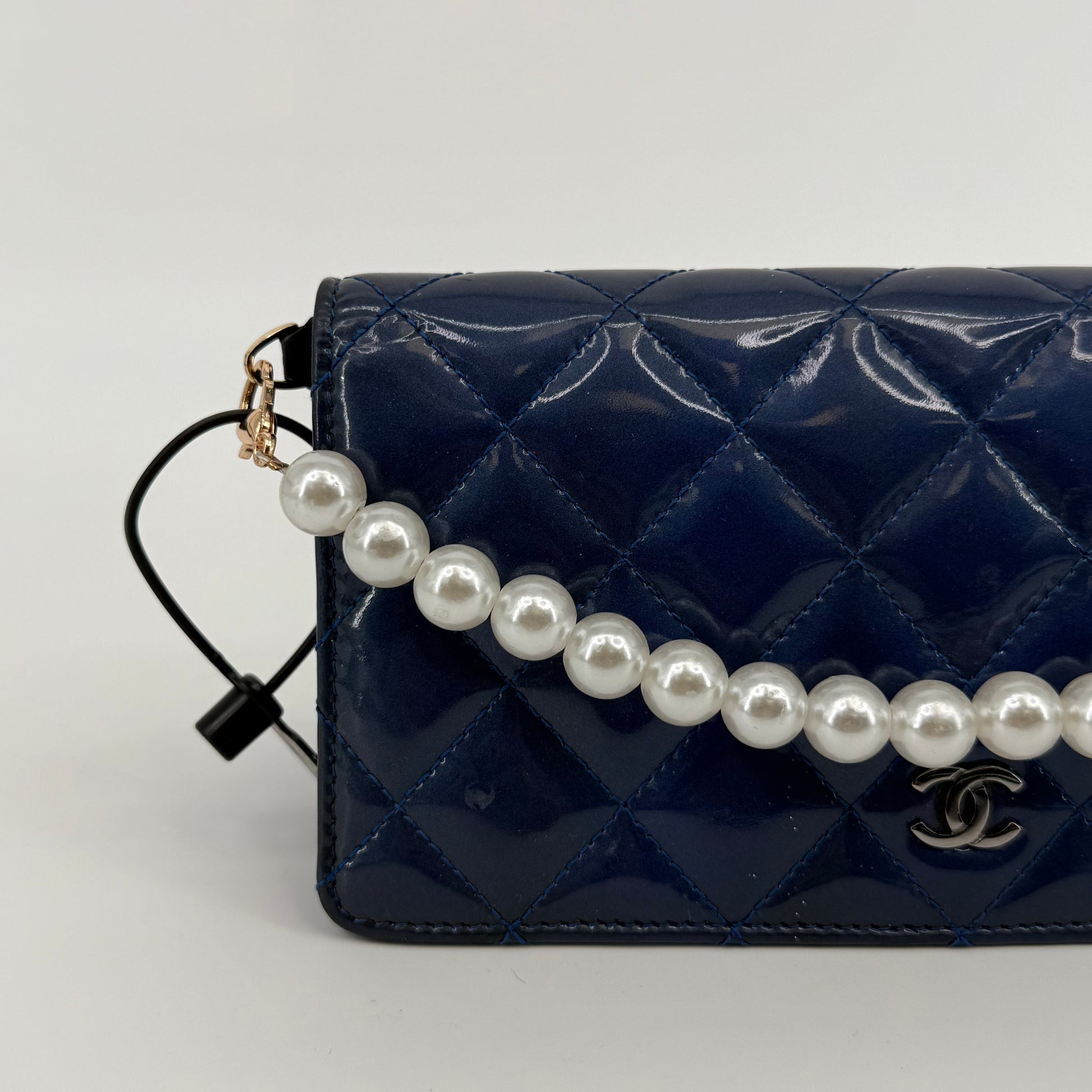 A stunning Chanel Wallet on Chain in glossy navy blue patent leather, featuring the iconic diamond-quilted pattern and signature CC logo in silver-tone hardware. This elegant piece is elevated with a detachable pearl top handle, adding a chic and feminine touch. Compact yet functional, it’s perfect for carrying essentials while making a sophisticated statement.