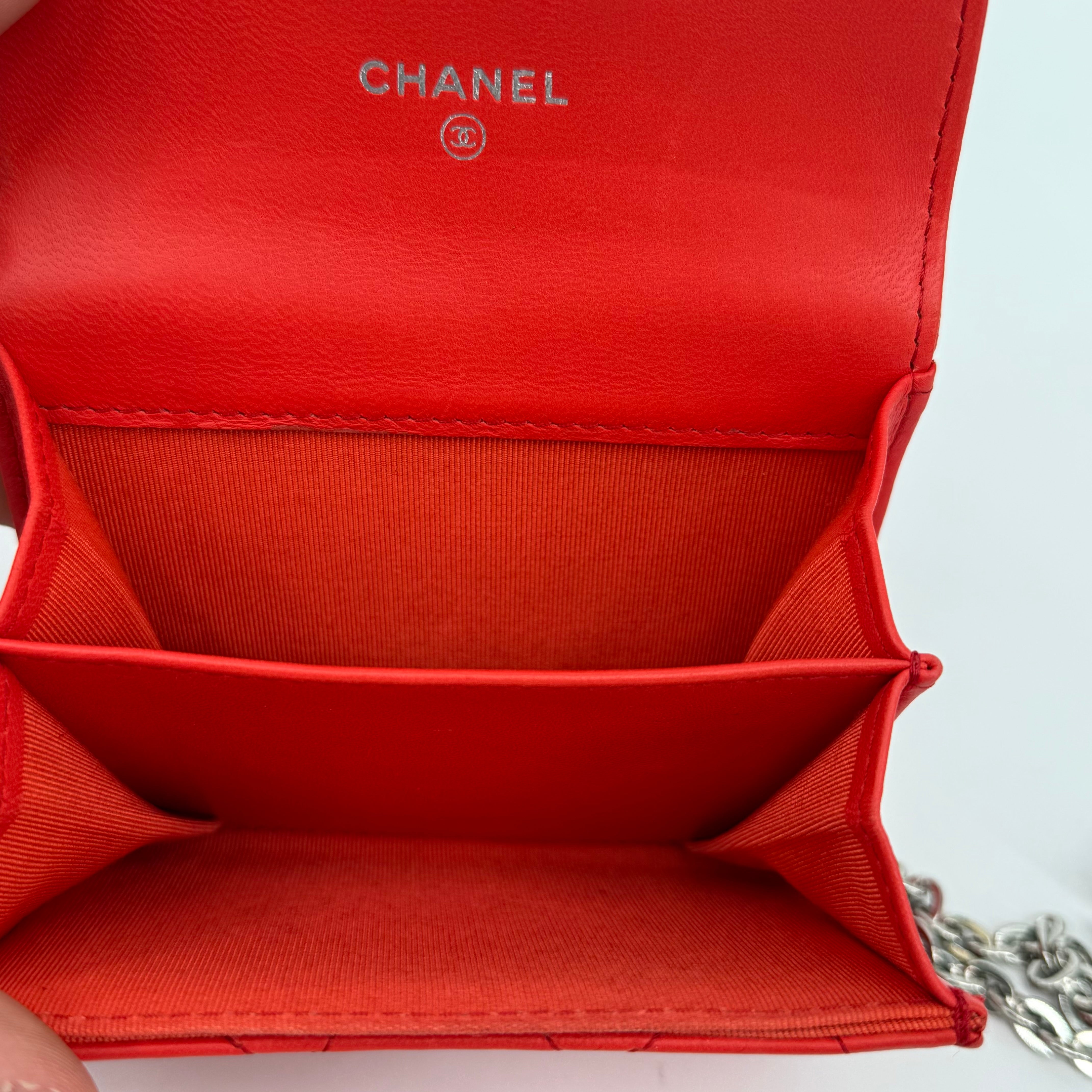 Stunning Chanel Mini Wallet on Chain crafted from vibrant red caviar leather with the iconic diamond quilting and silver-tone CC clasp. Compact yet elegant, this piece is perfect for carrying essentials—phone, cards, keys—while adding a pop of colour to any outfit. Finished with a classic interwoven chain strap for crossbody or shoulder wear.