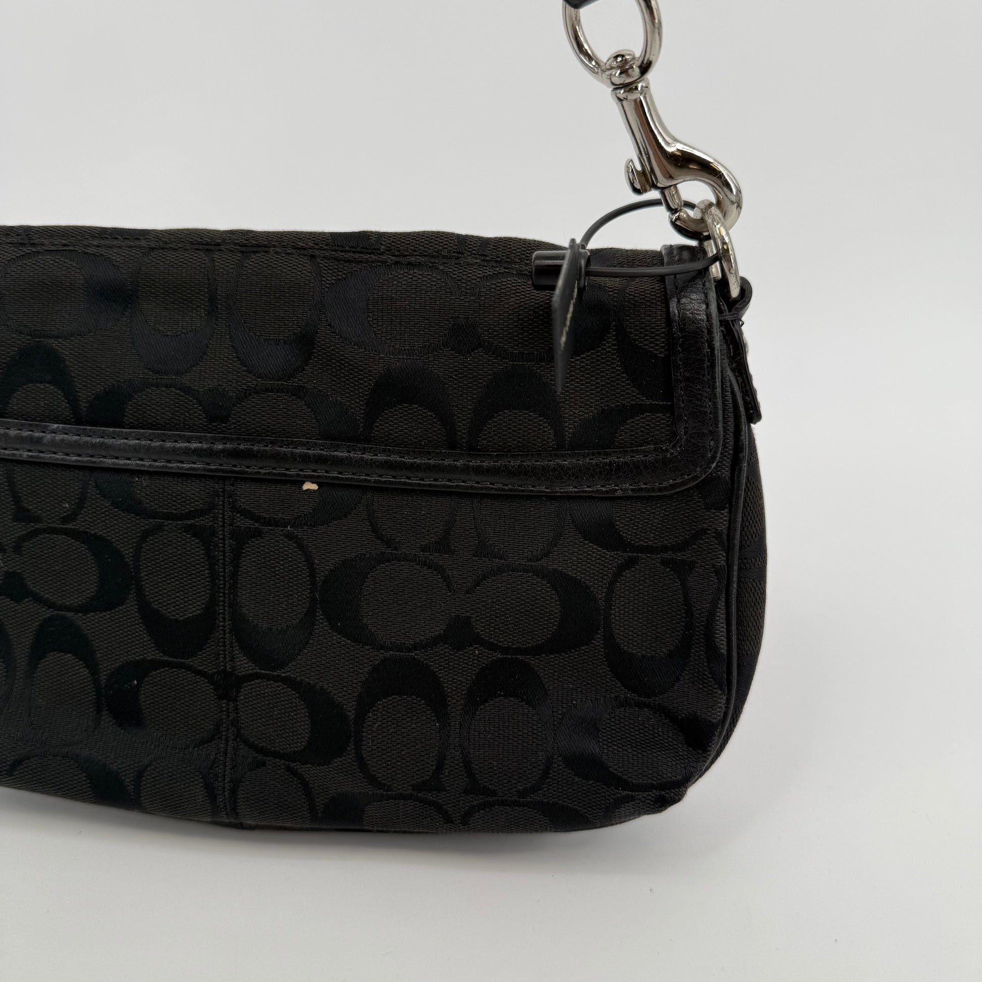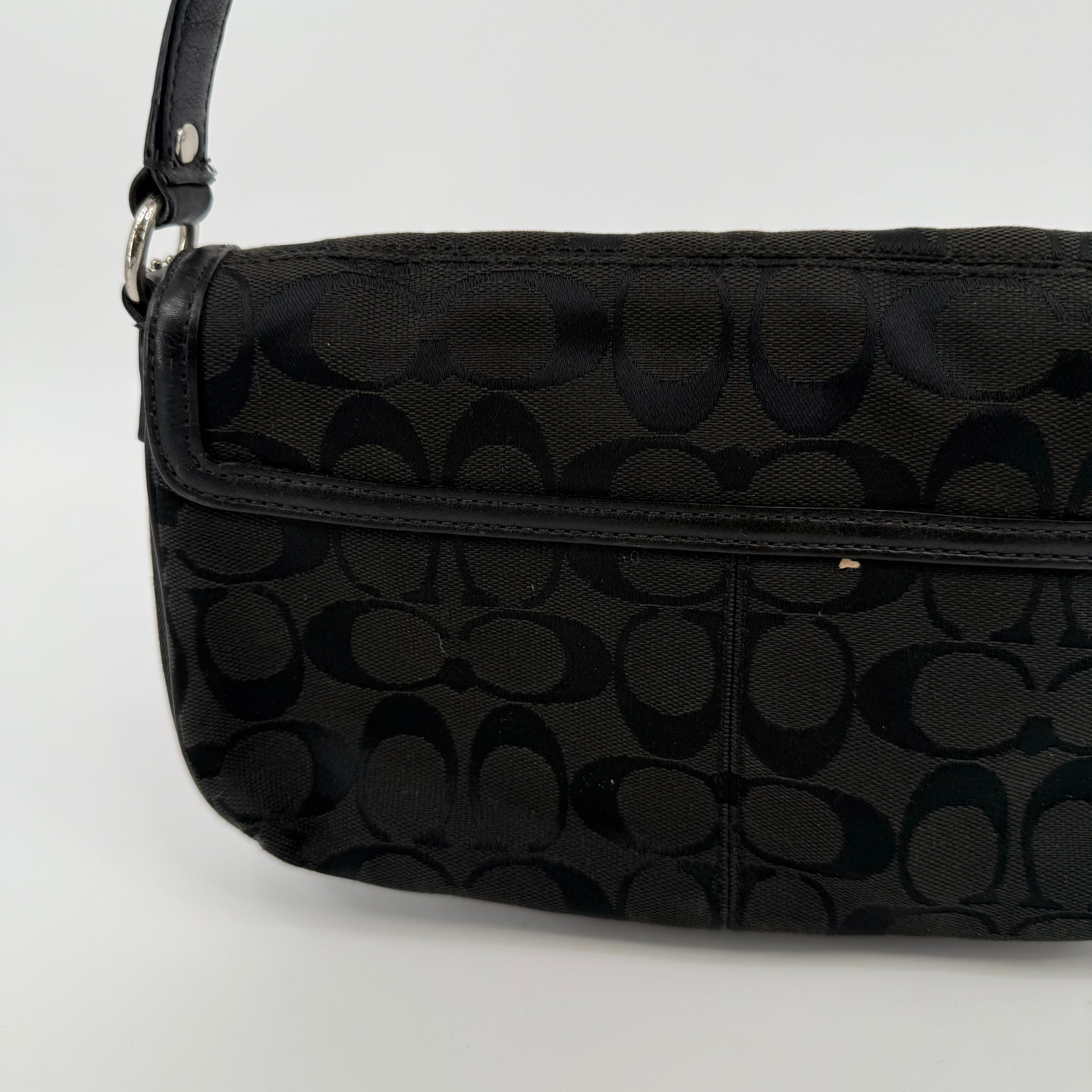 This Coach shoulder bag showcases a sleek and sophisticated design crafted from black signature jacquard fabric with tonal “C” patterning for a refined, understated look. It features a structured flap-front silhouette accented by a polished oval Coach logo plaque, adding a classic brand touch. The adjustable leather shoulder strap and silver-tone hardware enhance both comfort and durability, while the compact interior is ideal for carrying everyday essentials. Elegant yet versatile, this bag is perfect for effortless day-to-night styling.