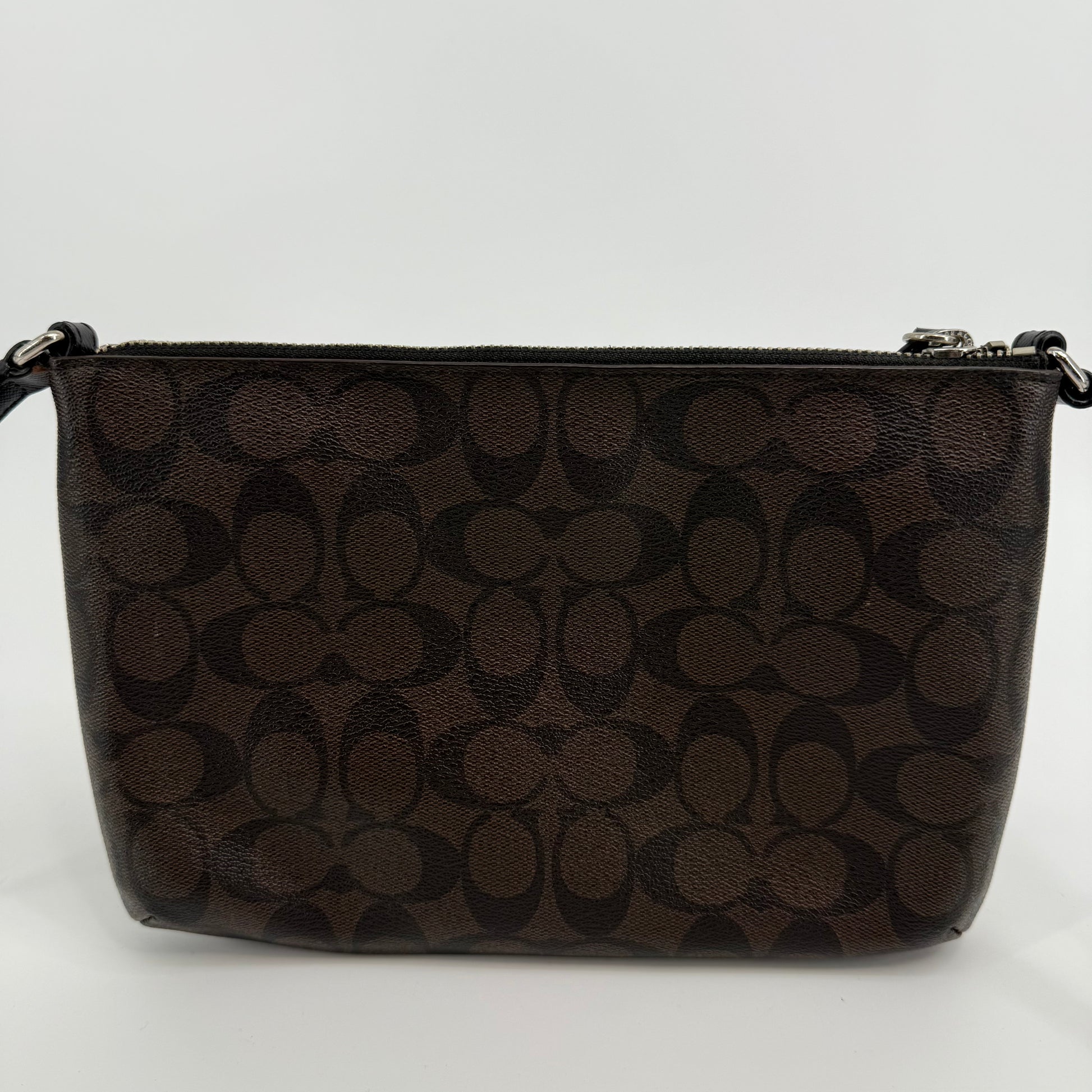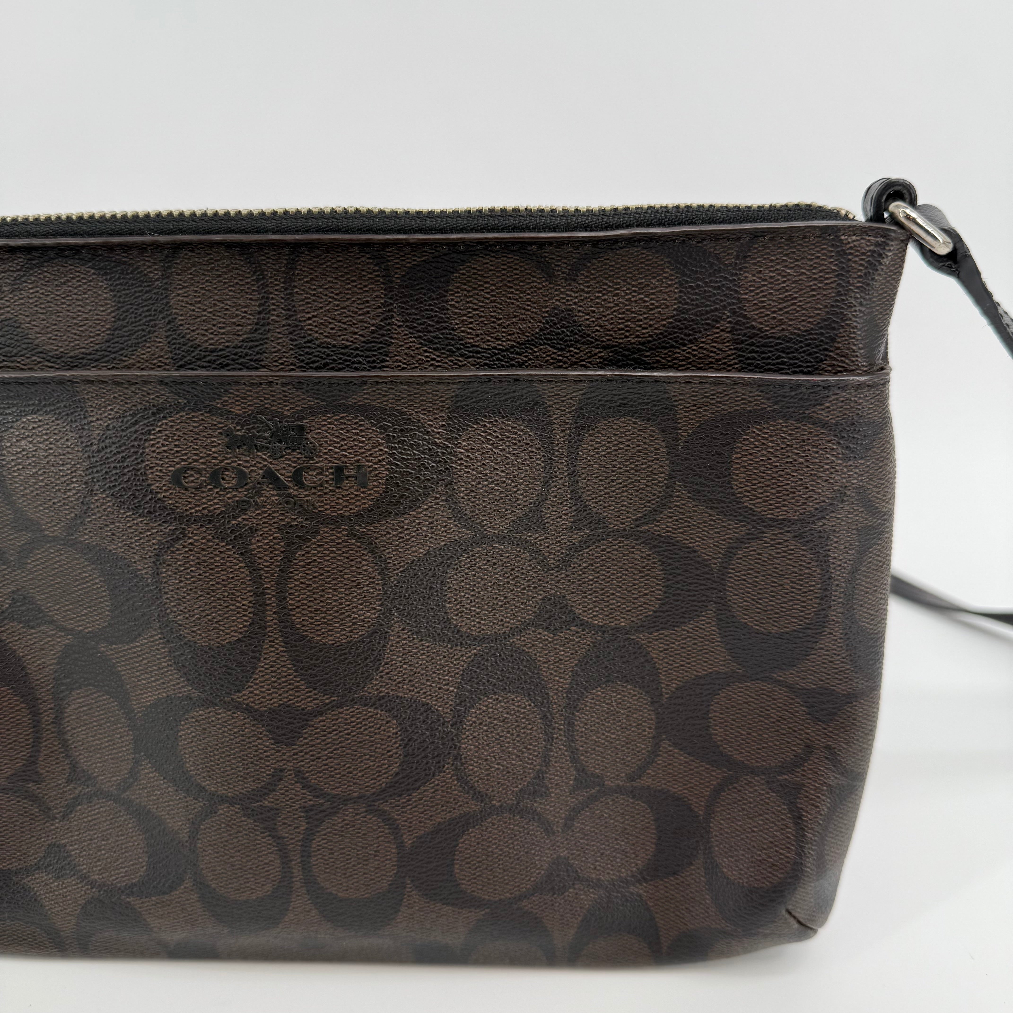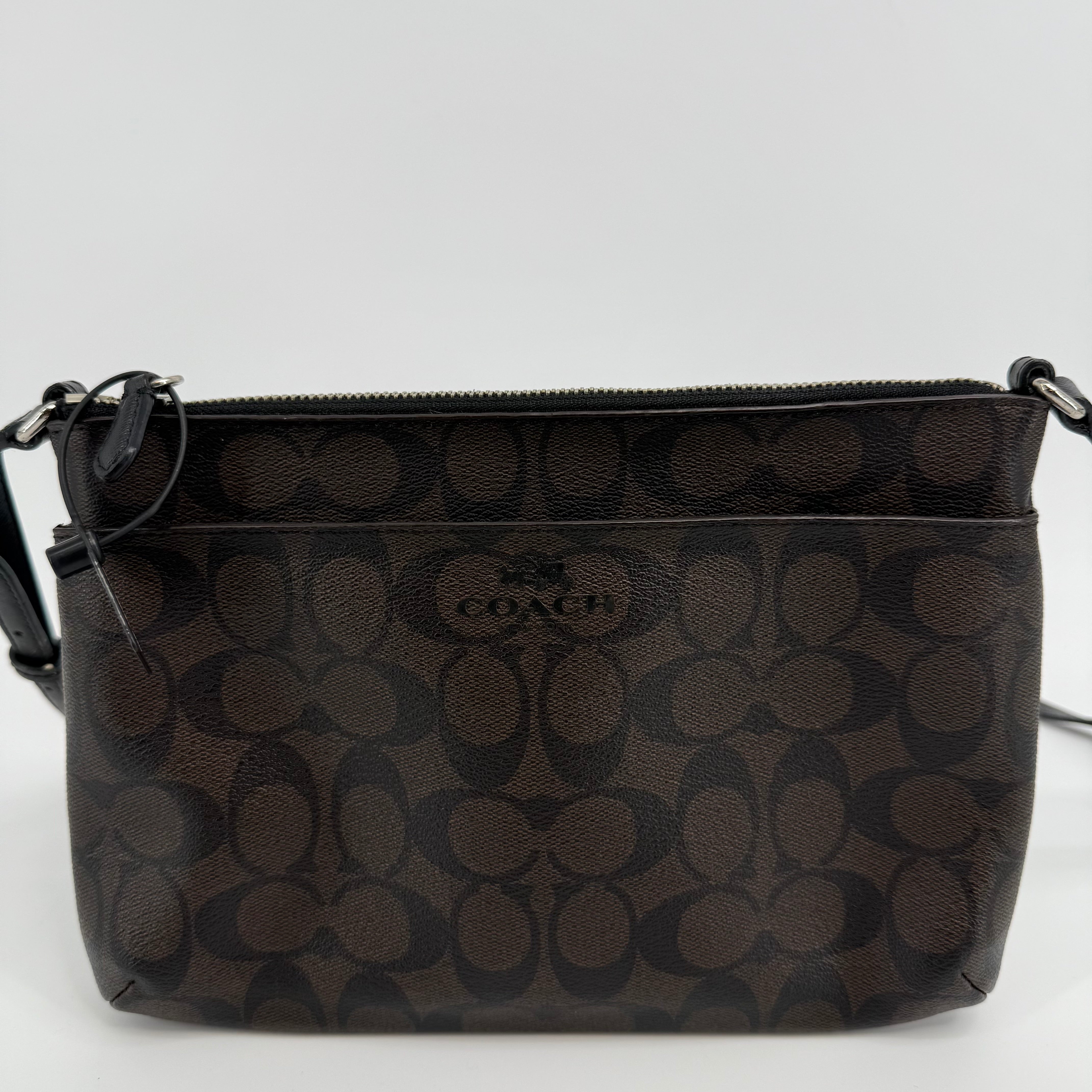 A sleek and practical piece from Coach, this Signature Crossbody Bag blends classic design with everyday function. Crafted in durable coated canvas featuring the iconic Coach monogram pattern, it’s accented with smooth black leather trim and silver-tone hardware. Perfectly sized for your daily essentials, this crossbody offers hands-free convenience and timeless appeal.