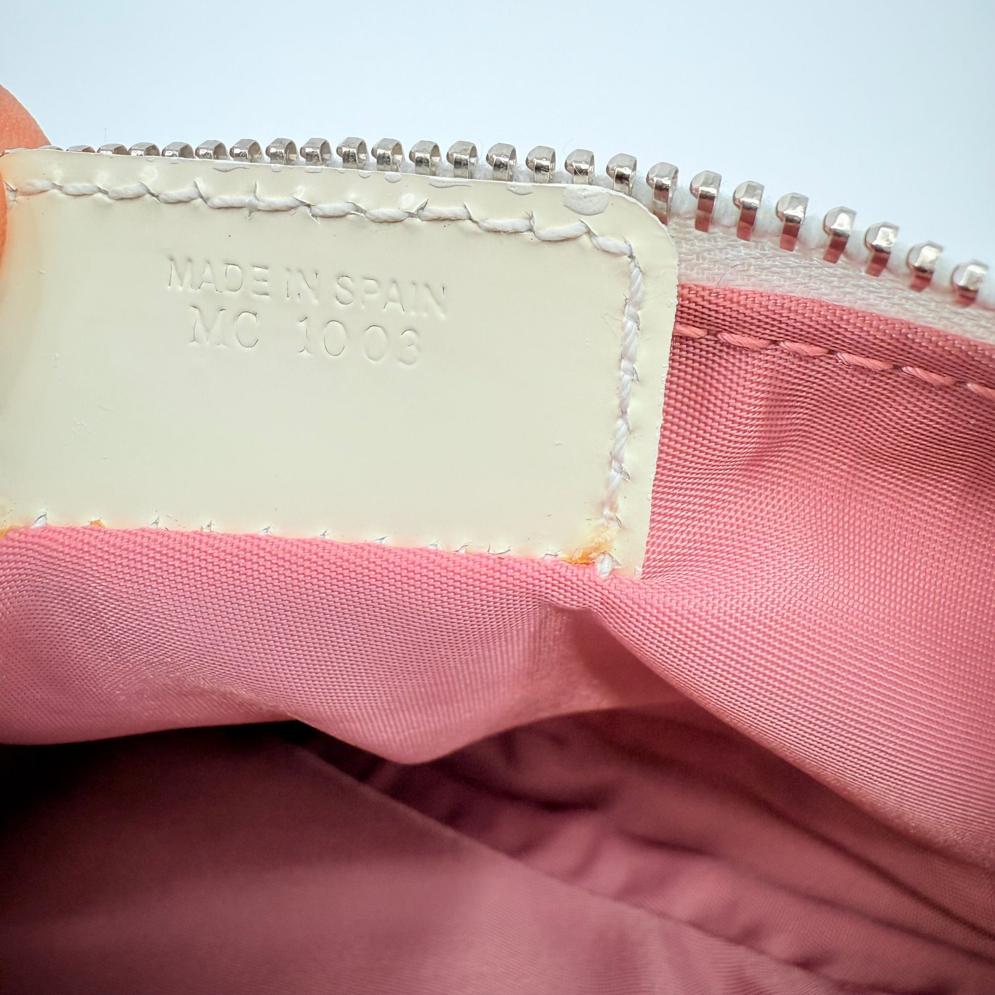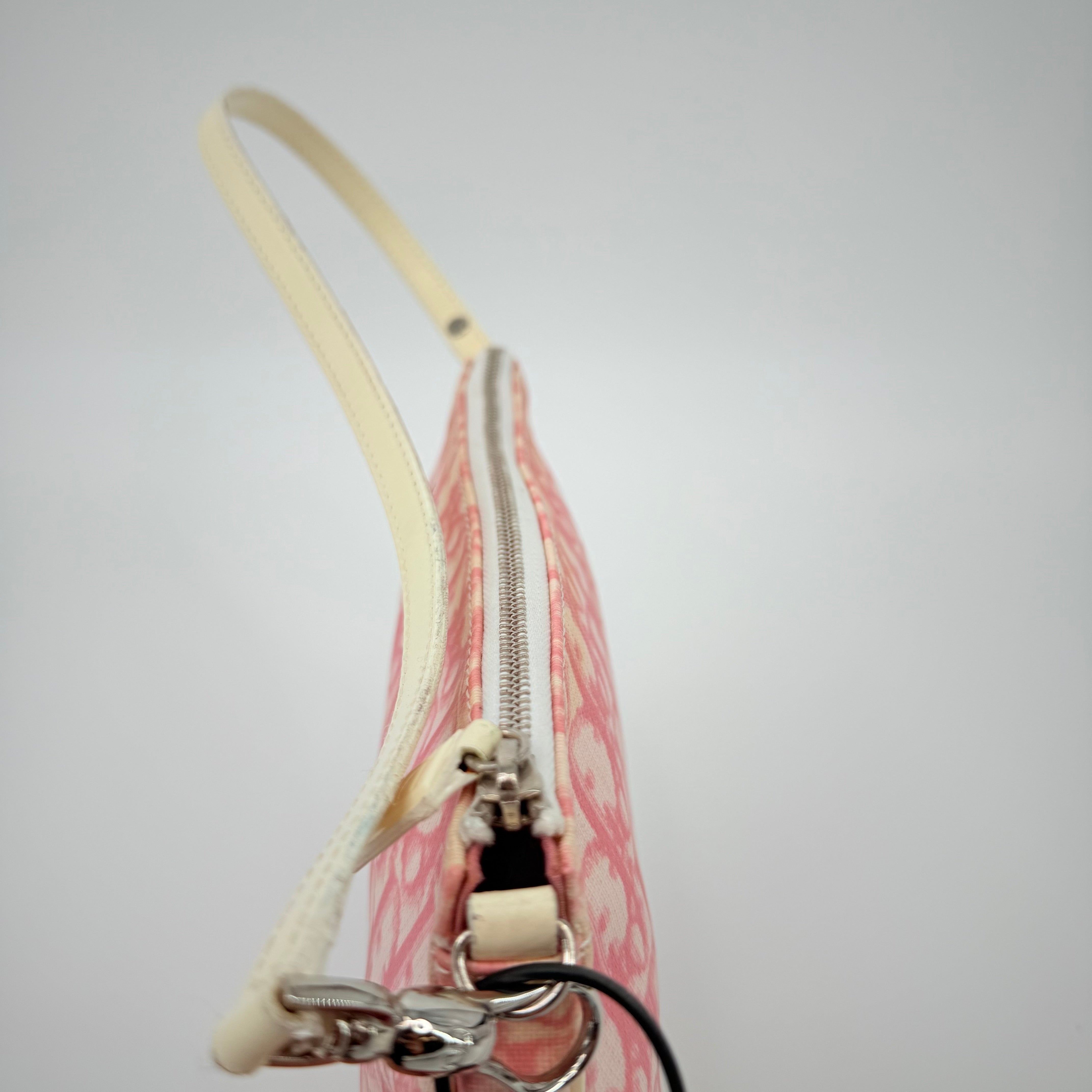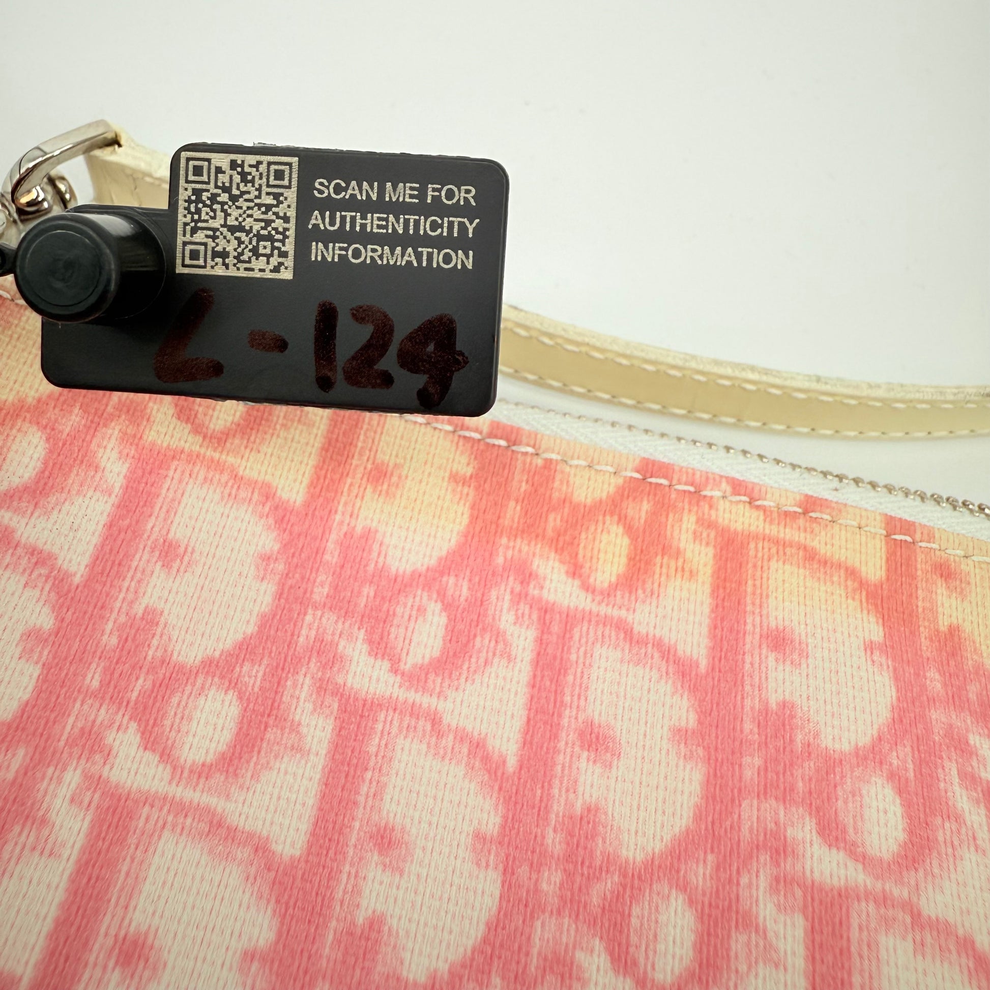 This Christian Dior Mini Saddle Pochette in pink Oblique canvas is a playful yet timeless piece that captures the spirit of early 2000s Dior. Crafted from signature jacquard with ivory leather trim and silver-tone hardware, it features the iconic curved saddle silhouette in a compact form. Perfect for carrying just the essentials, it can be worn on the shoulder or by hand for an effortlessly chic Y2K look.