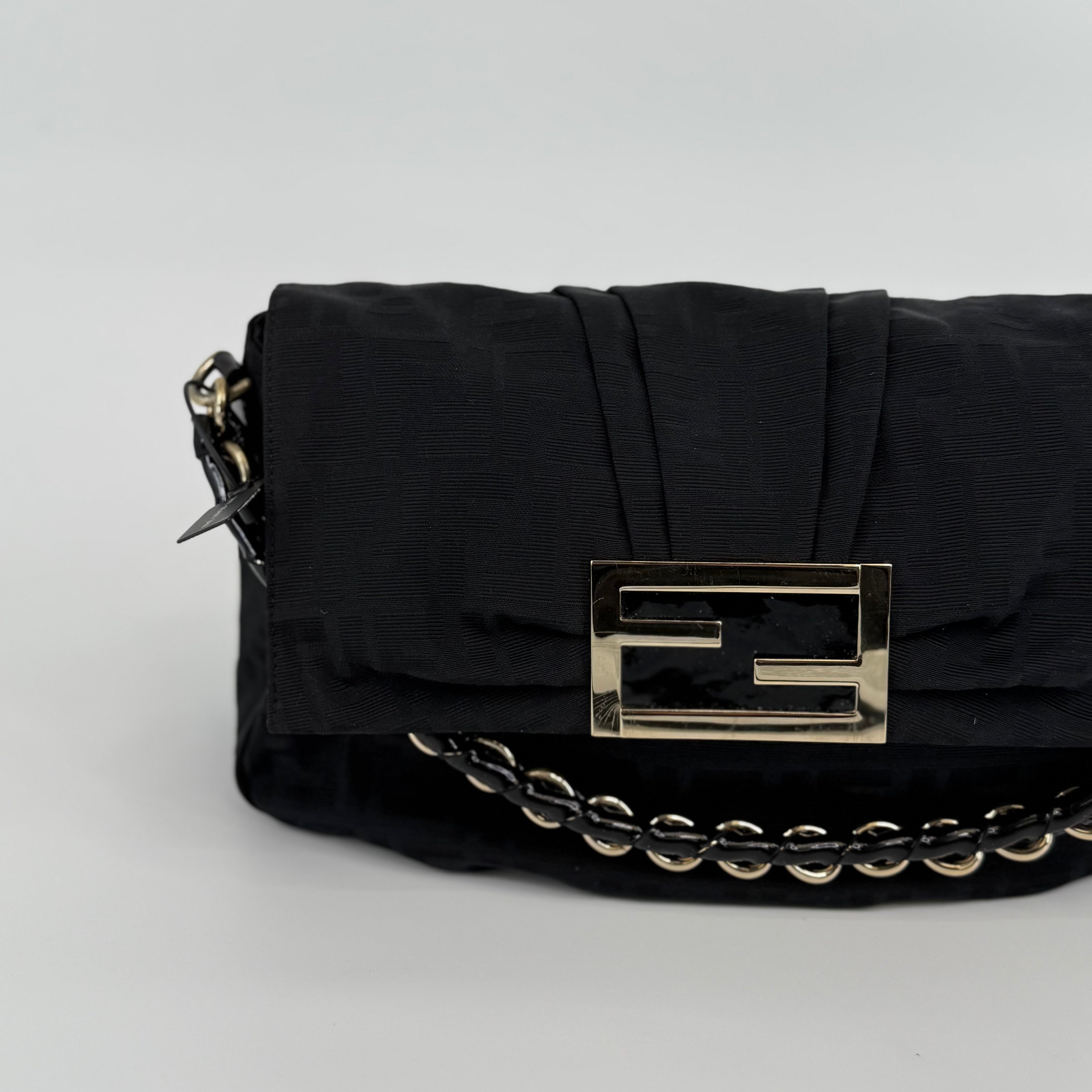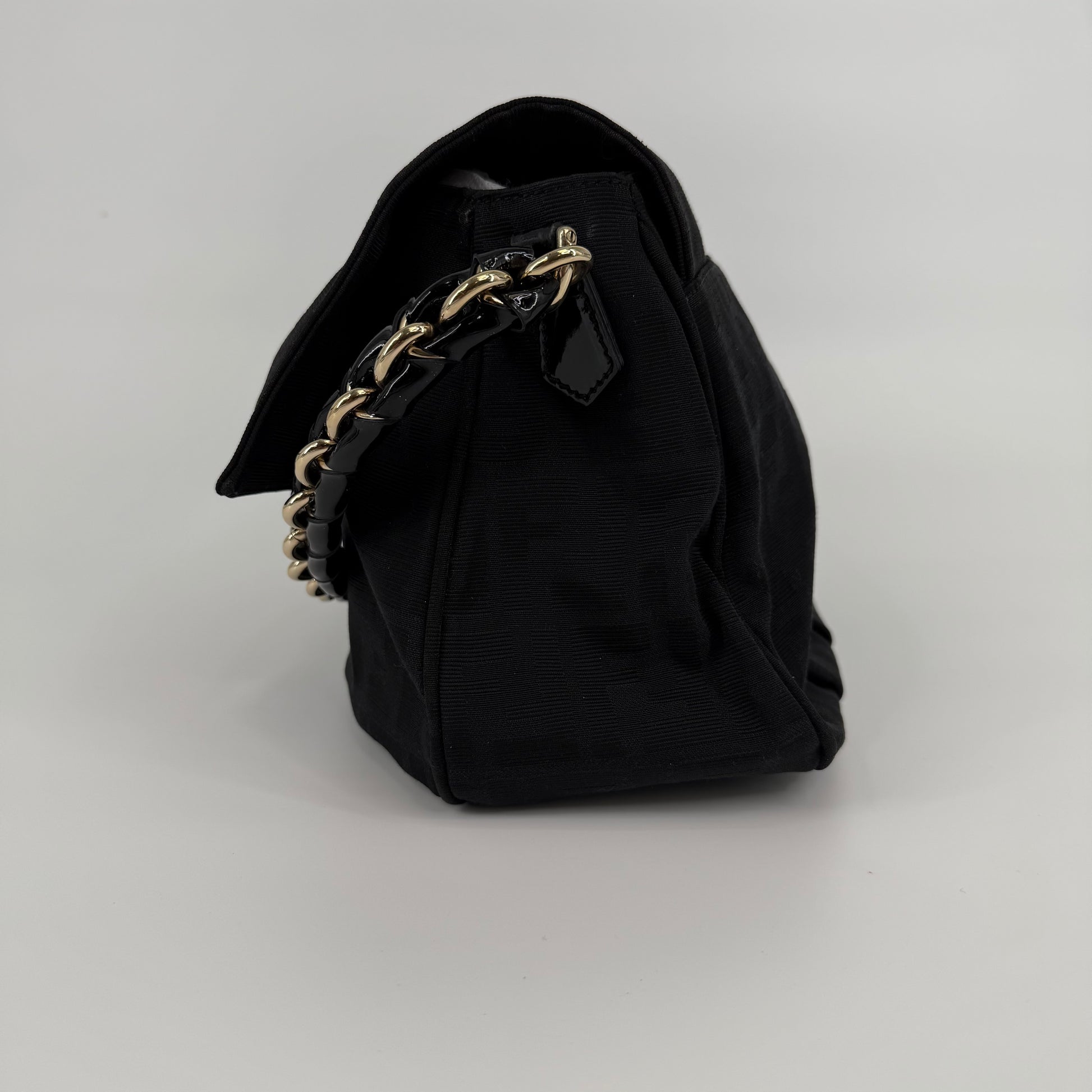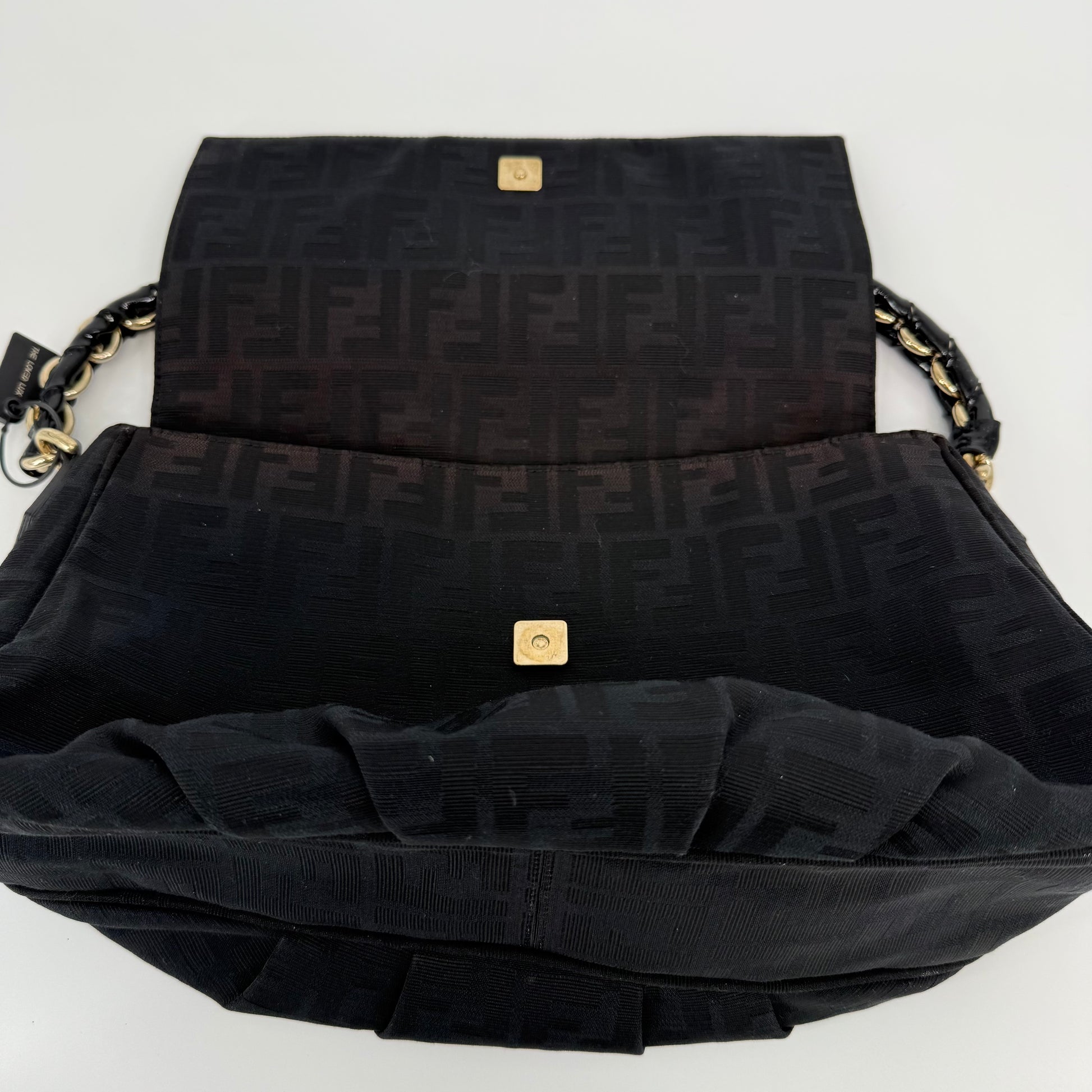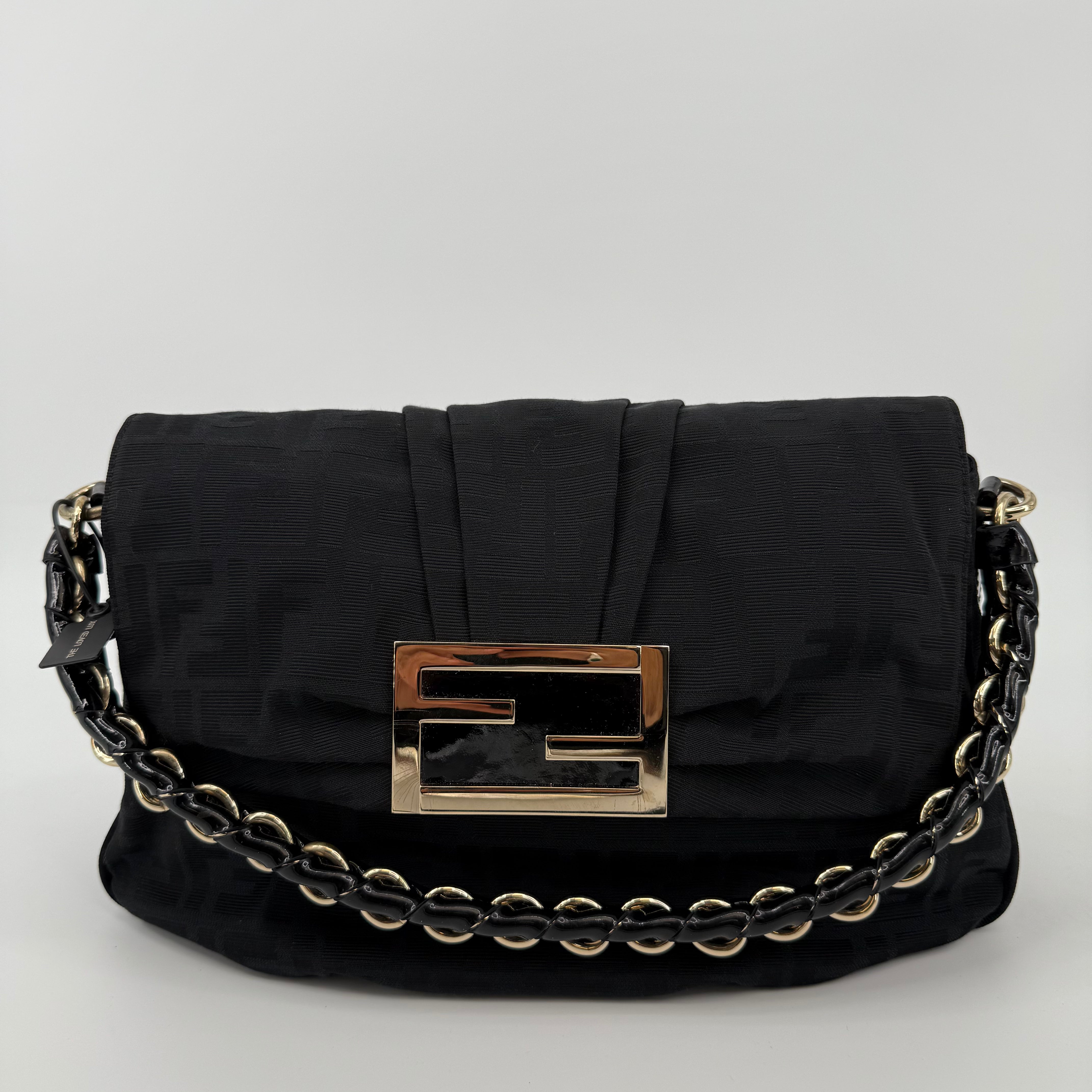 The Fendi Mia Flap Shoulder Bag in black Zucca fabric is a sophisticated evolution of the brand’s iconic monogram style. Crafted from jacquard canvas with the signature FF motif, it features a structured silhouette accented by a statement chain-link strap and a bold gold-tone logo clasp. The Mia embodies Fendi’s balance of femininity and edge — elegant enough for evening wear yet versatile for everyday sophistication. Its combination of texture, hardware, and timeless black finish makes it a standout addition to any modern luxury collection.