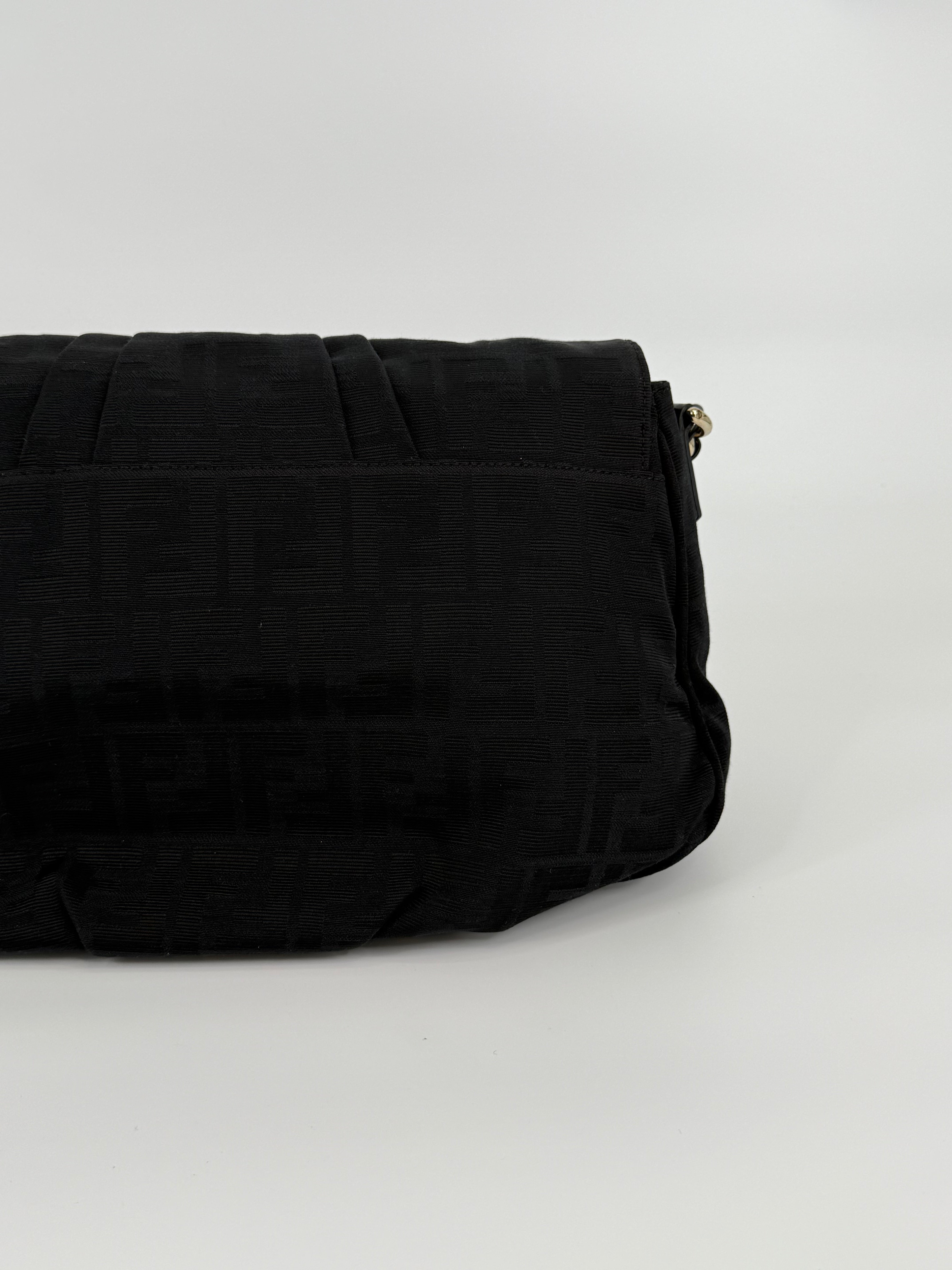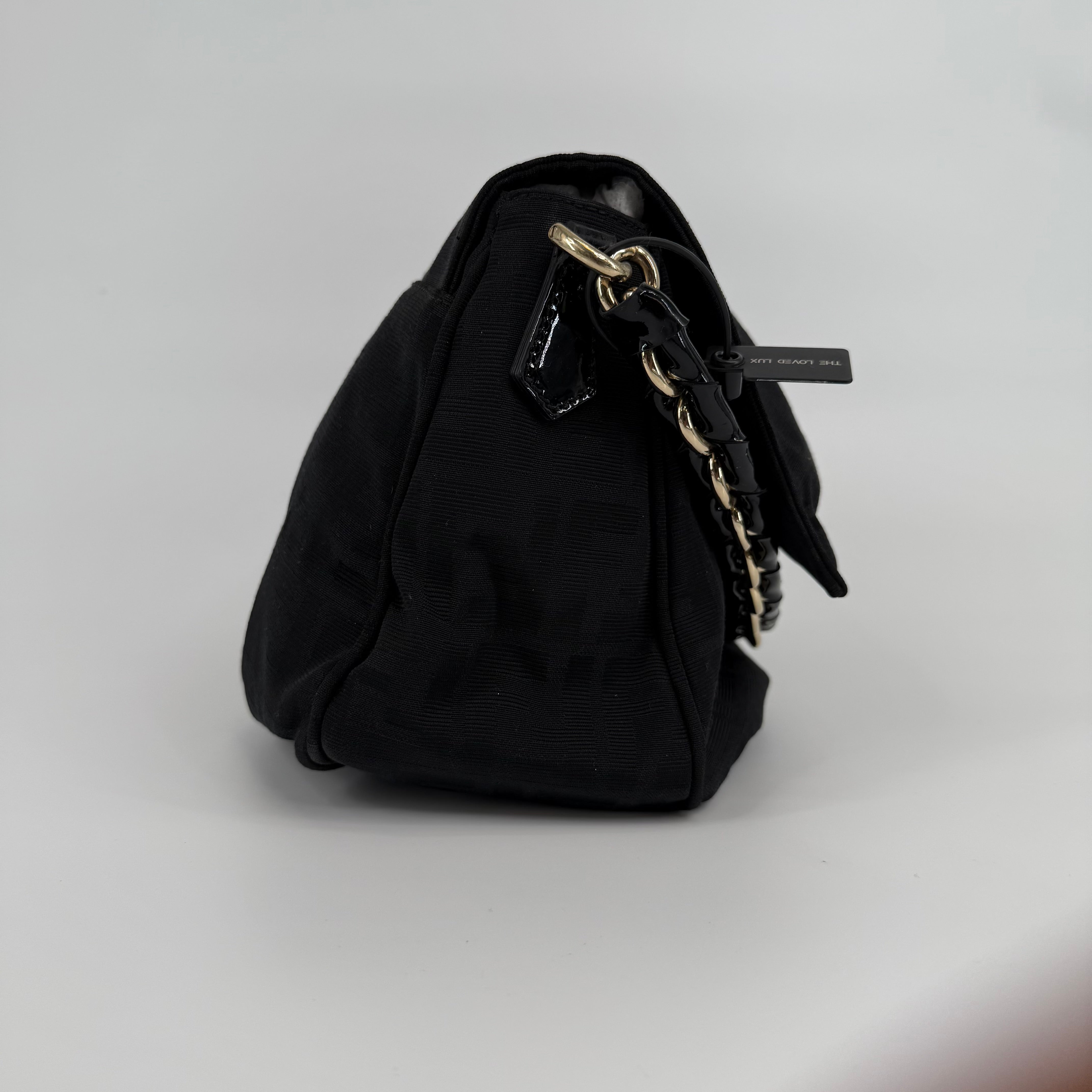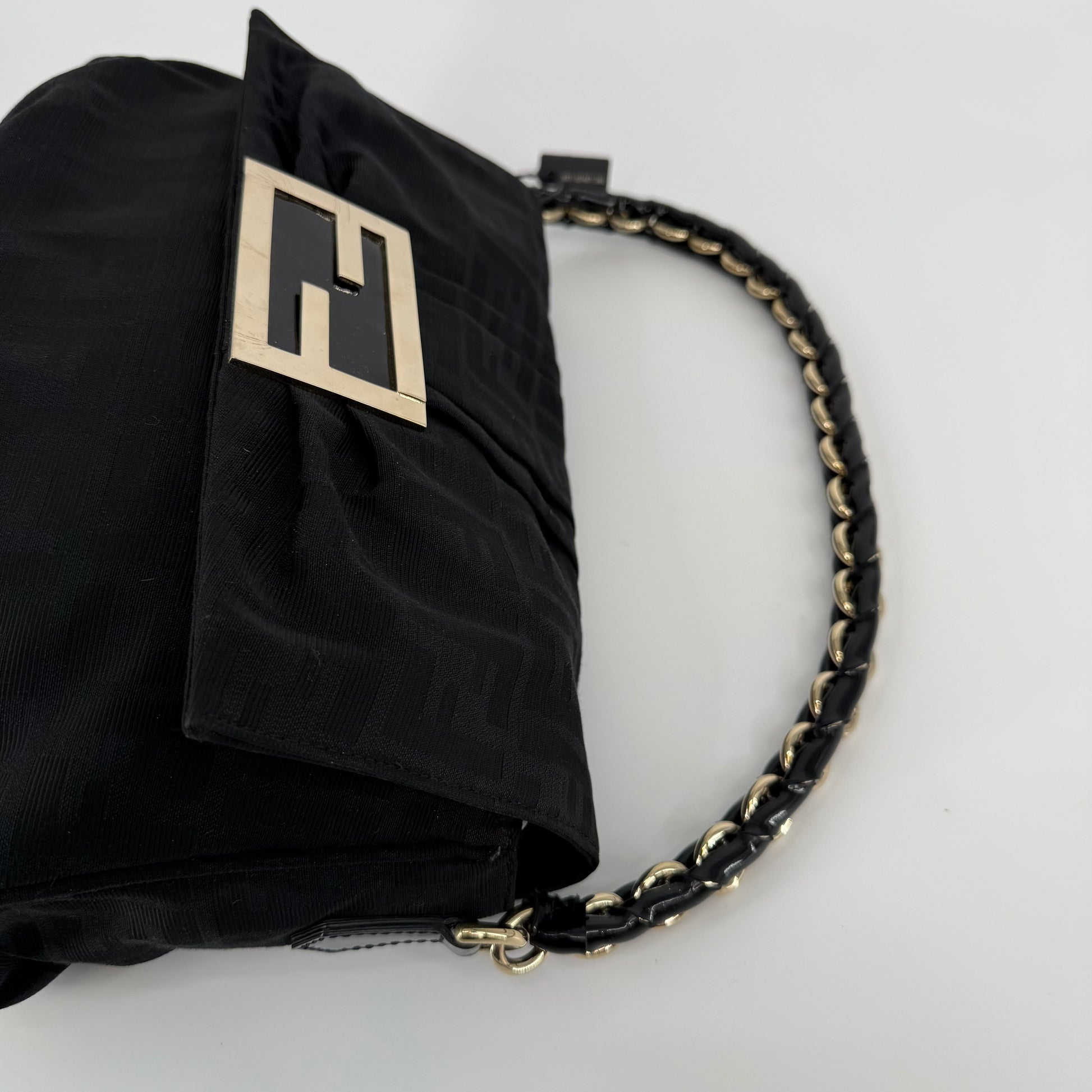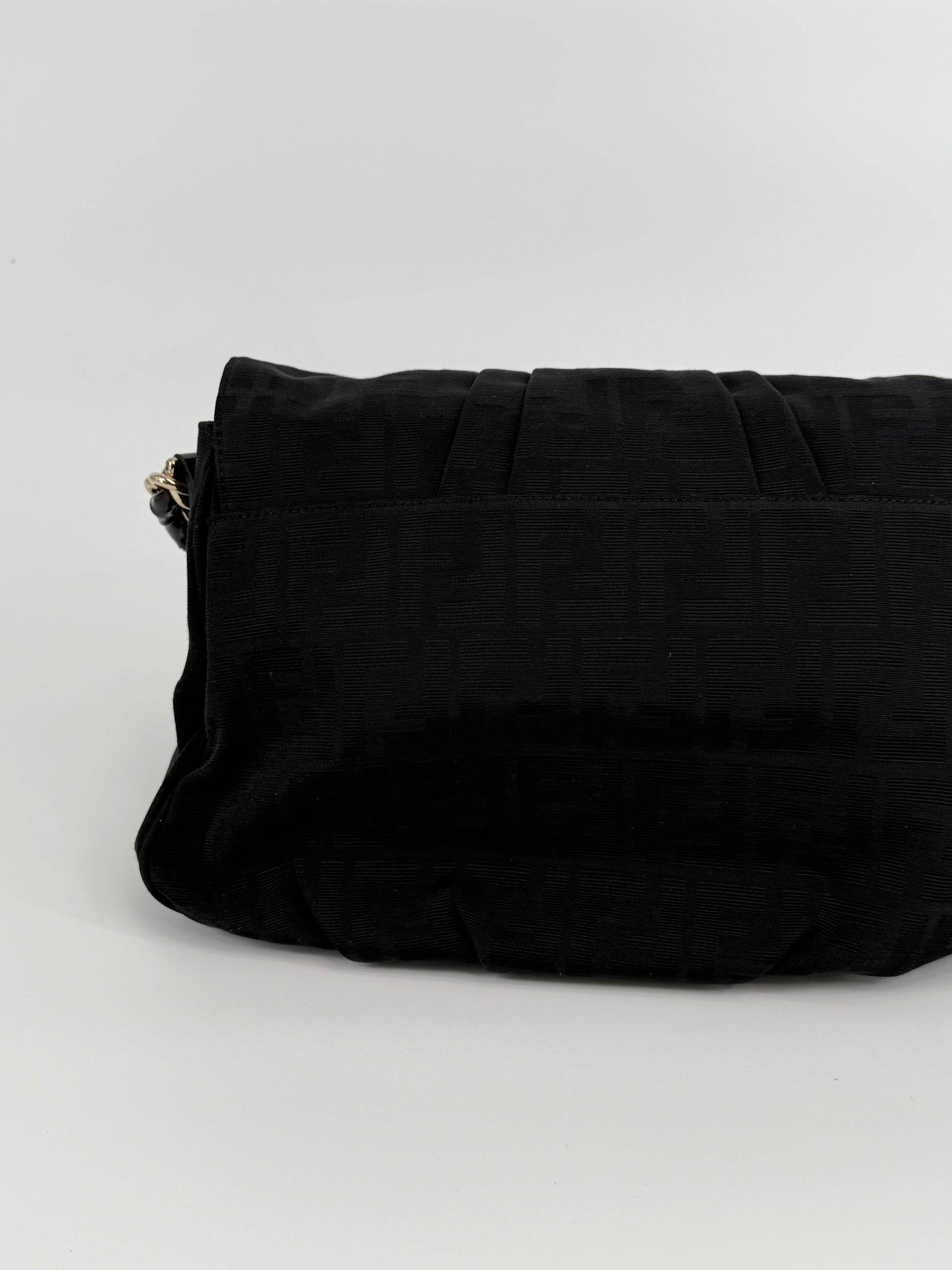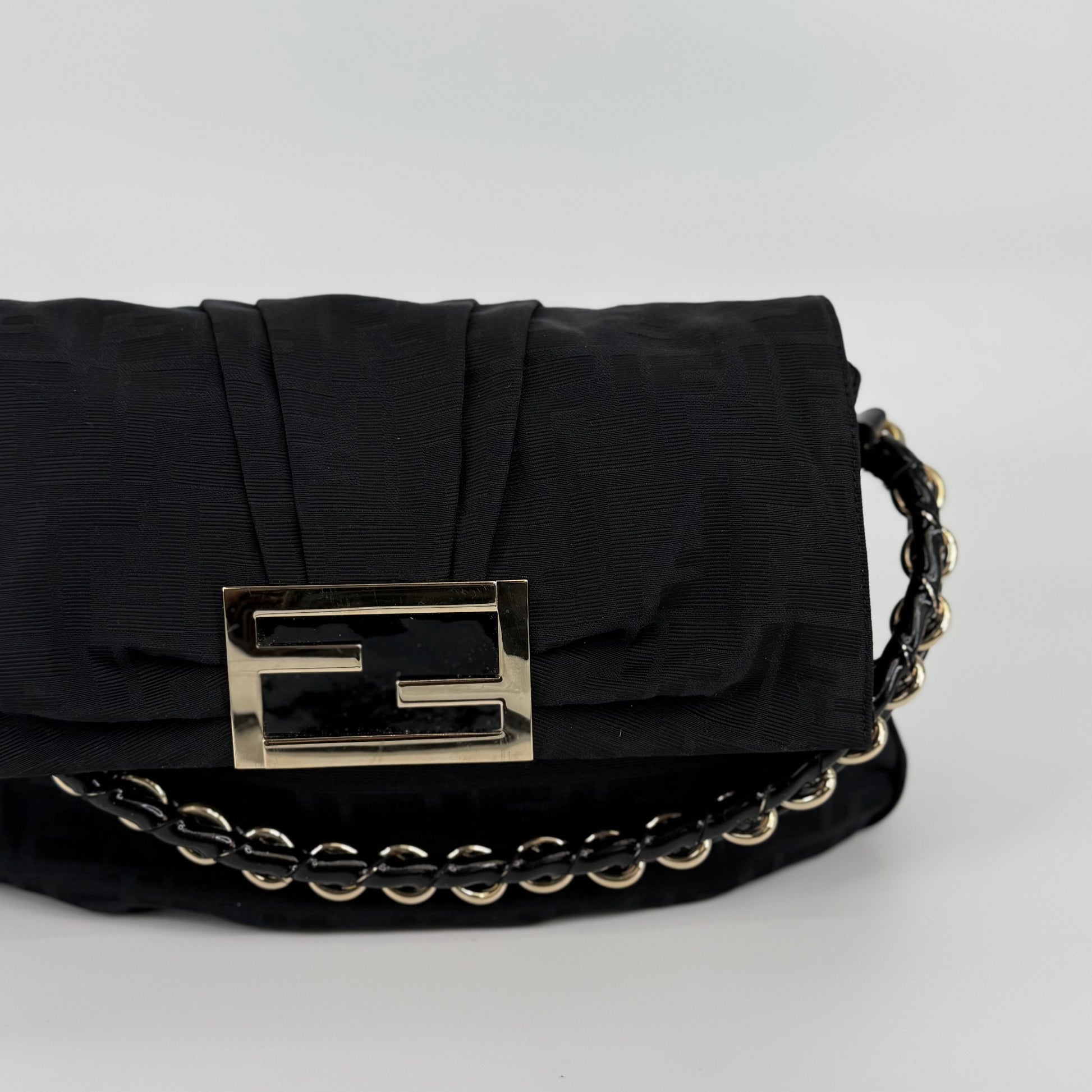 The Fendi Mia Flap Shoulder Bag in black Zucca fabric is a sophisticated evolution of the brand’s iconic monogram style. Crafted from jacquard canvas with the signature FF motif, it features a structured silhouette accented by a statement chain-link strap and a bold gold-tone logo clasp. The Mia embodies Fendi’s balance of femininity and edge — elegant enough for evening wear yet versatile for everyday sophistication. Its combination of texture, hardware, and timeless black finish makes it a standout addition to any modern luxury collection.