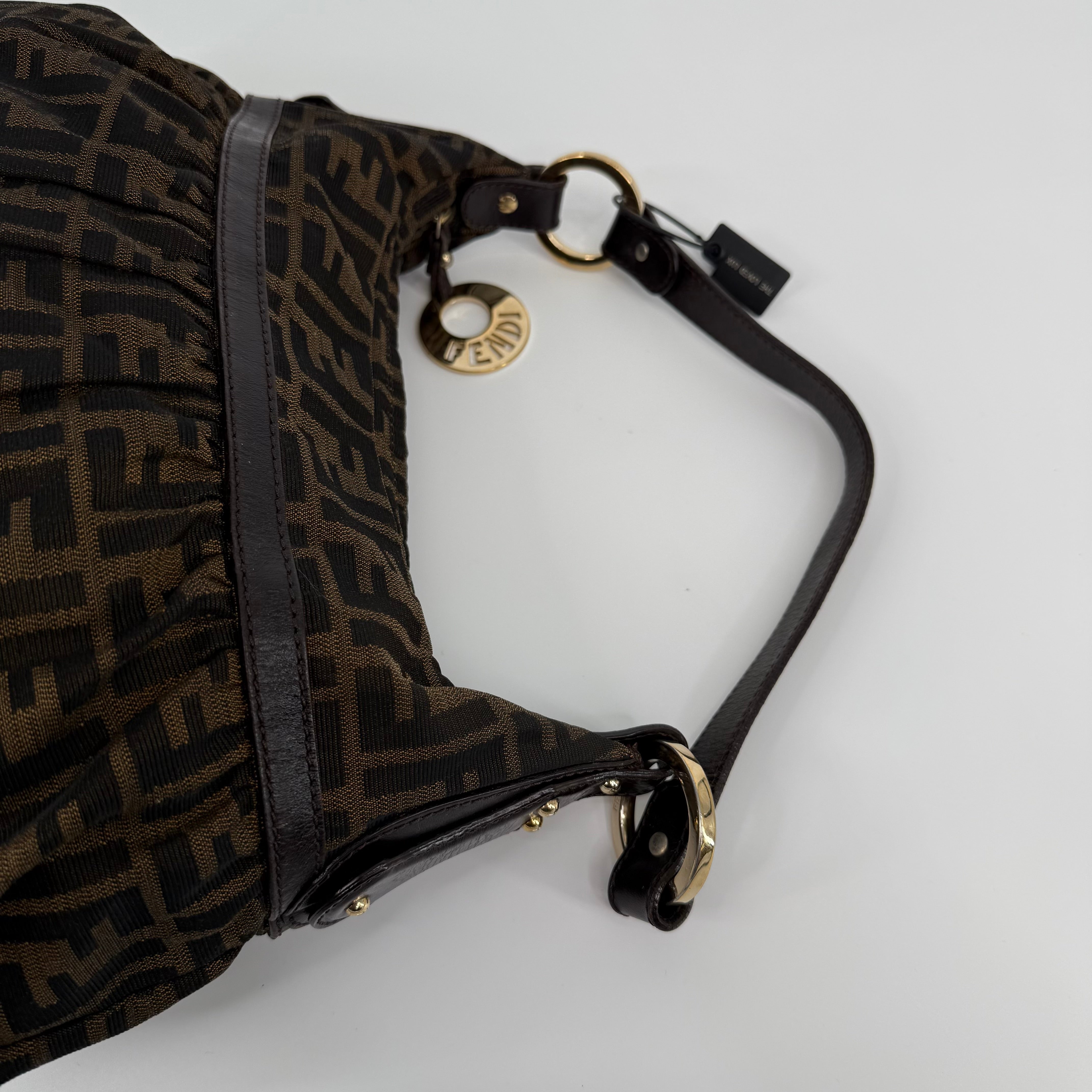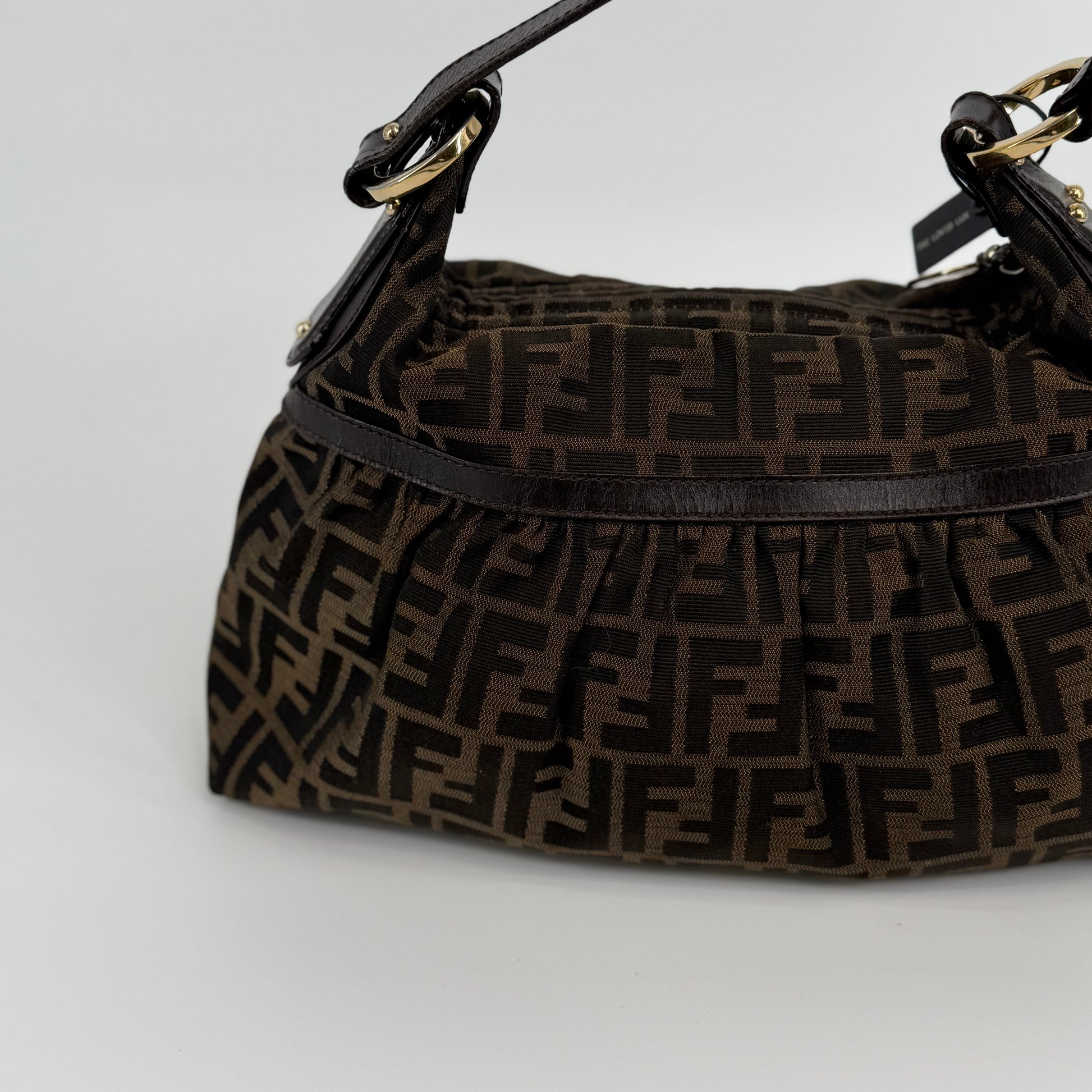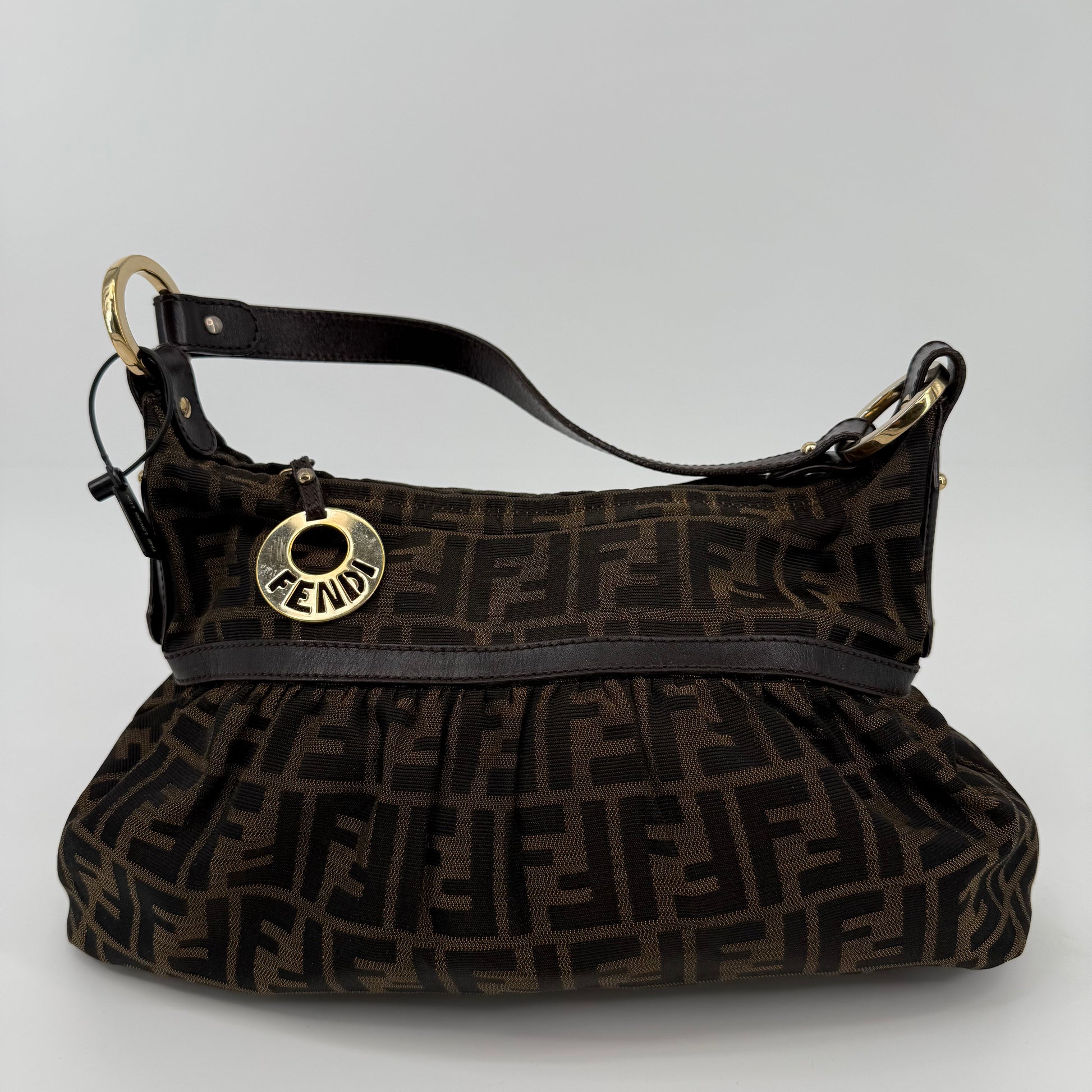 The Fendi Chef Shoulder Bag in Zucca Logo Jacquard is a chic embodiment of early-2000s Fendi style — relaxed, feminine, and unmistakably luxurious. Crafted from the house’s signature brown FF monogram fabric with soft curved lines and leather trim, it balances casual ease with timeless sophistication. The gold-tone hardware and signature Fendi medallion charm add a refined touch, while the slouchy silhouette makes it effortlessly wearable for everyday or evening. A true representation of vintage Fendi charm, the Chef bag captures the era’s iconic blend of elegance and attitude.