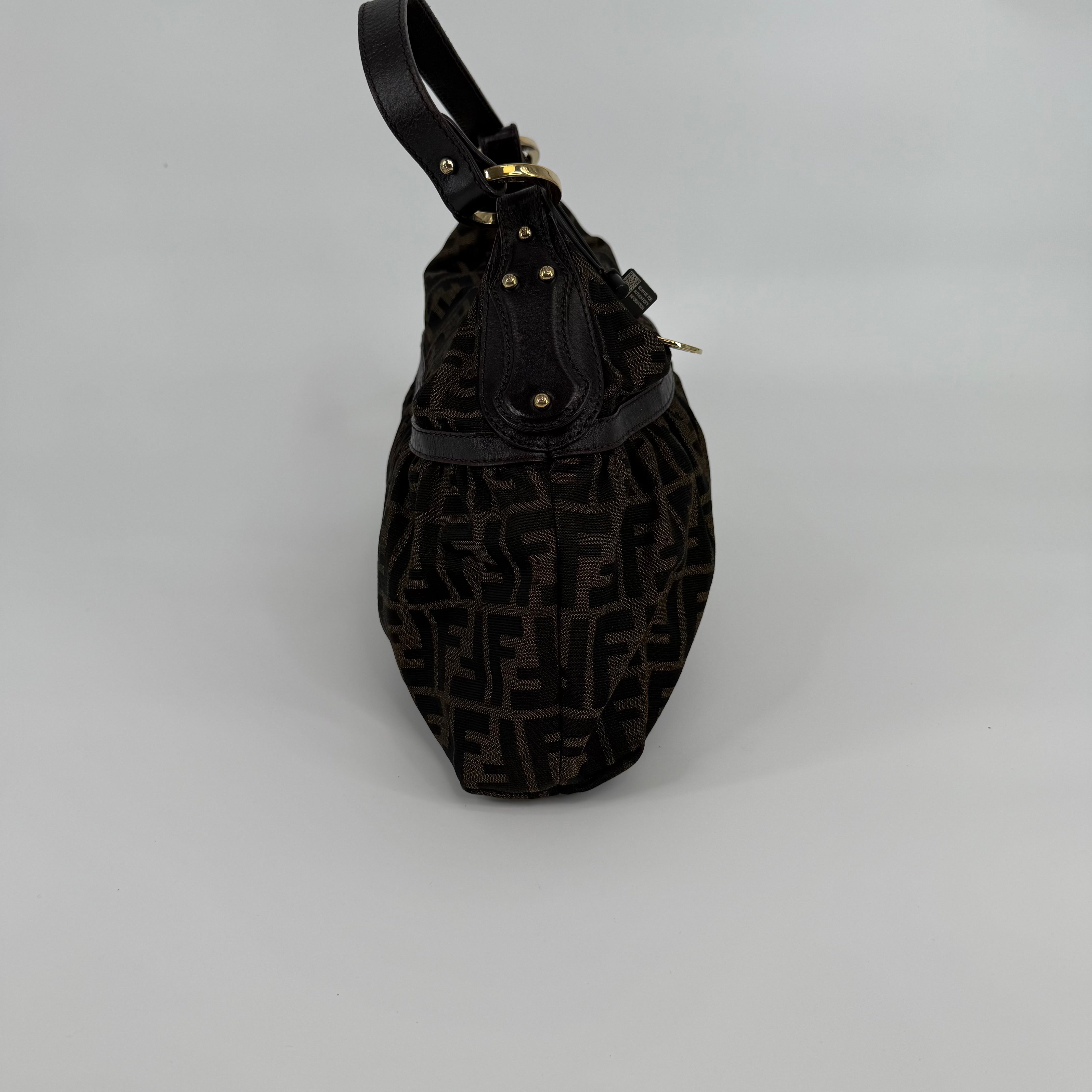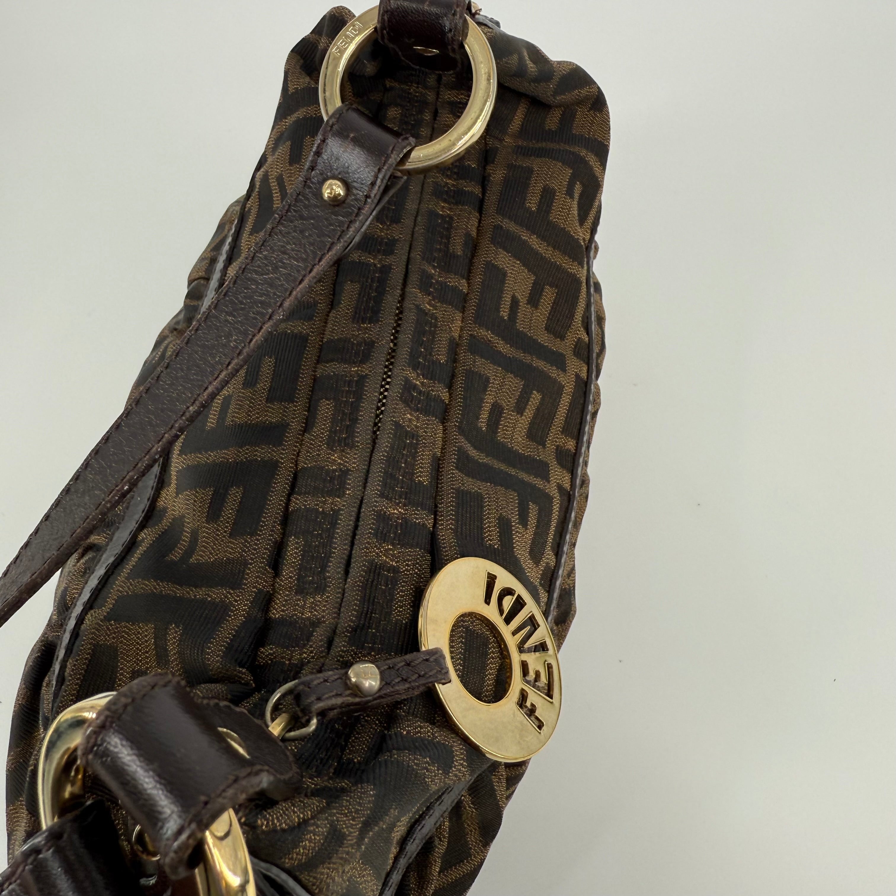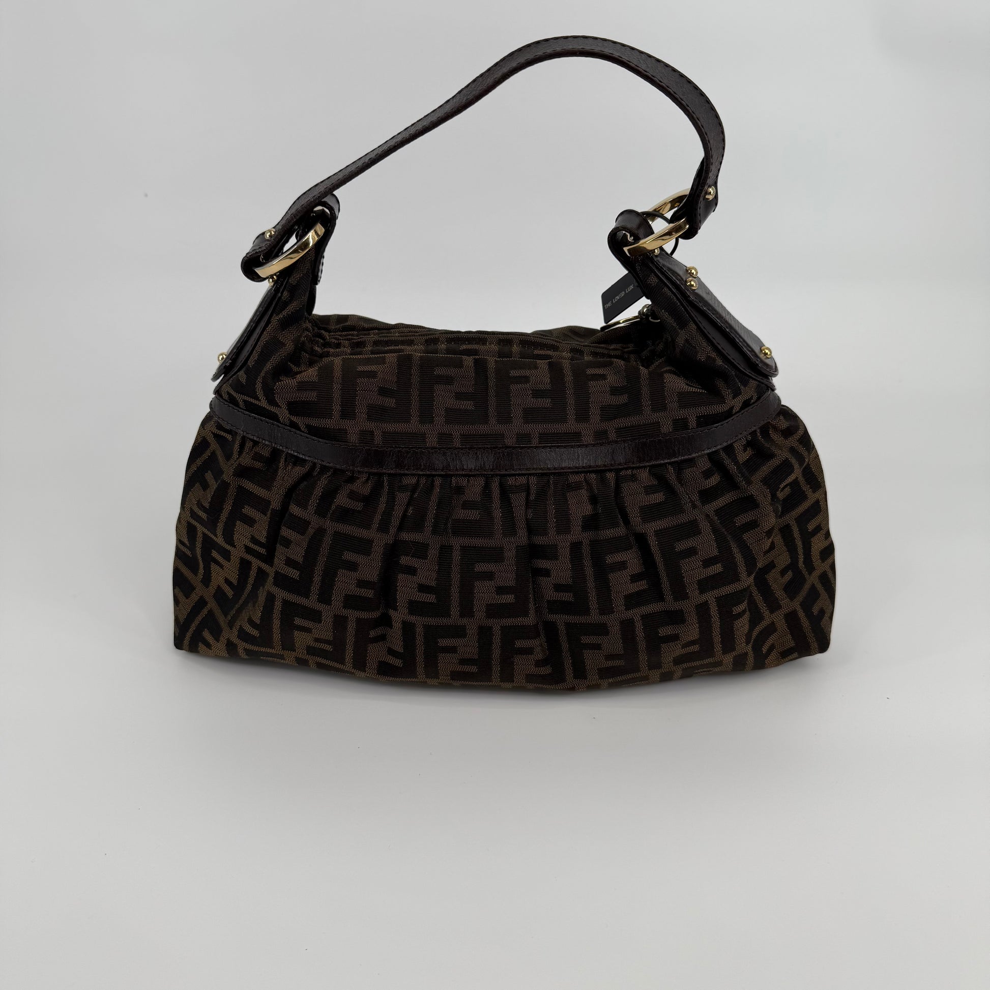 The Fendi Chef Shoulder Bag in Zucca Logo Jacquard is a chic embodiment of early-2000s Fendi style — relaxed, feminine, and unmistakably luxurious. Crafted from the house’s signature brown FF monogram fabric with soft curved lines and leather trim, it balances casual ease with timeless sophistication. The gold-tone hardware and signature Fendi medallion charm add a refined touch, while the slouchy silhouette makes it effortlessly wearable for everyday or evening. A true representation of vintage Fendi charm, the Chef bag captures the era’s iconic blend of elegance and attitude.
