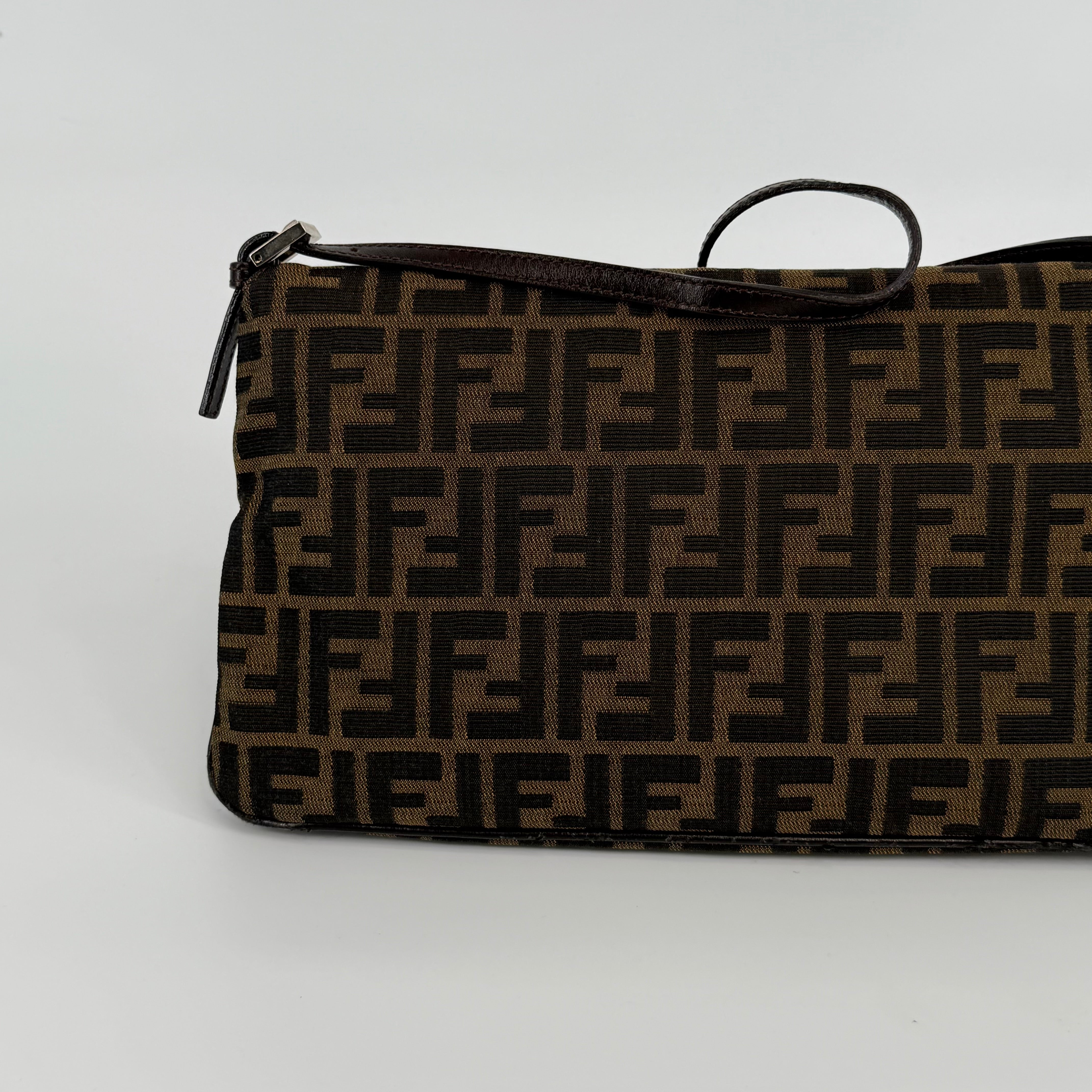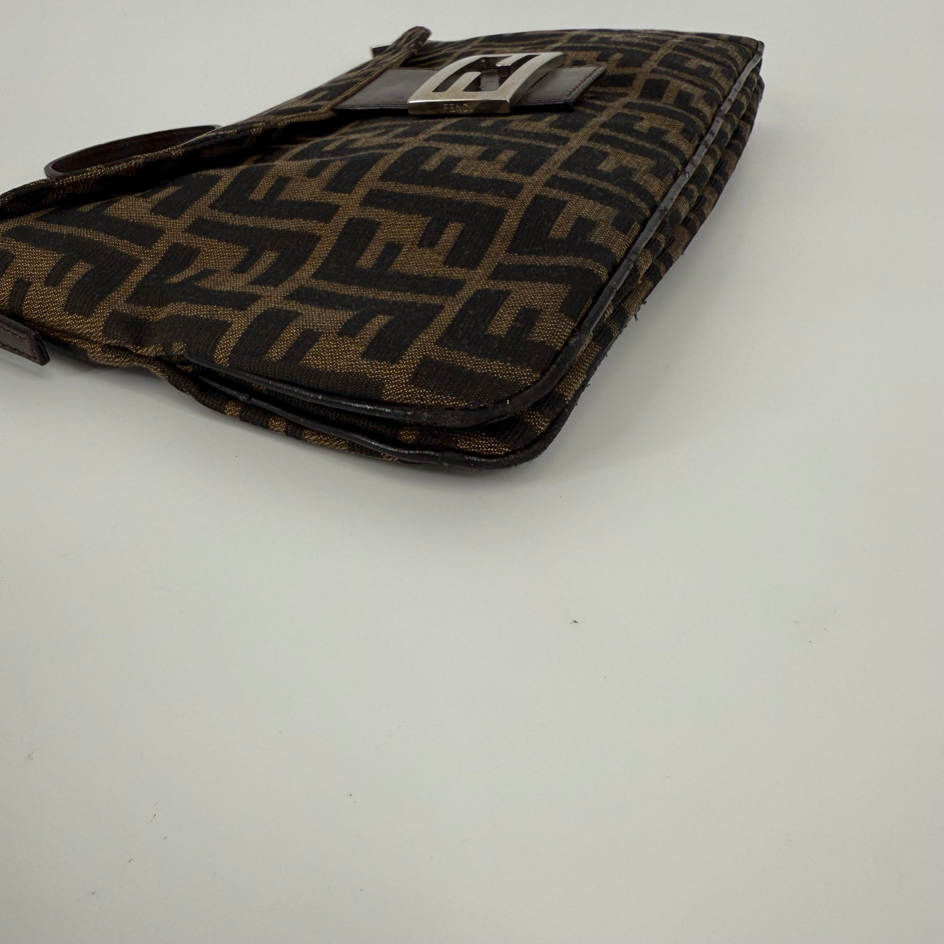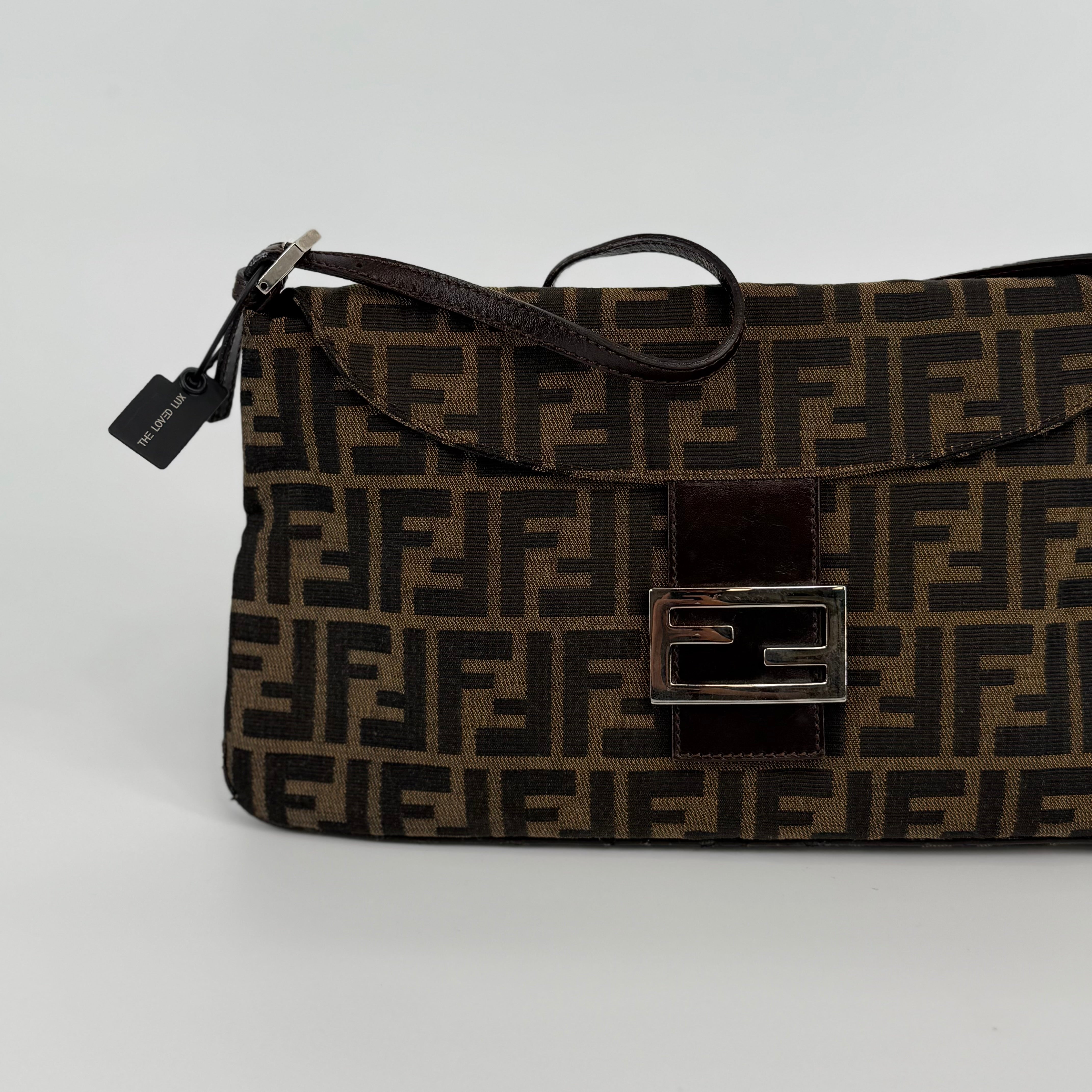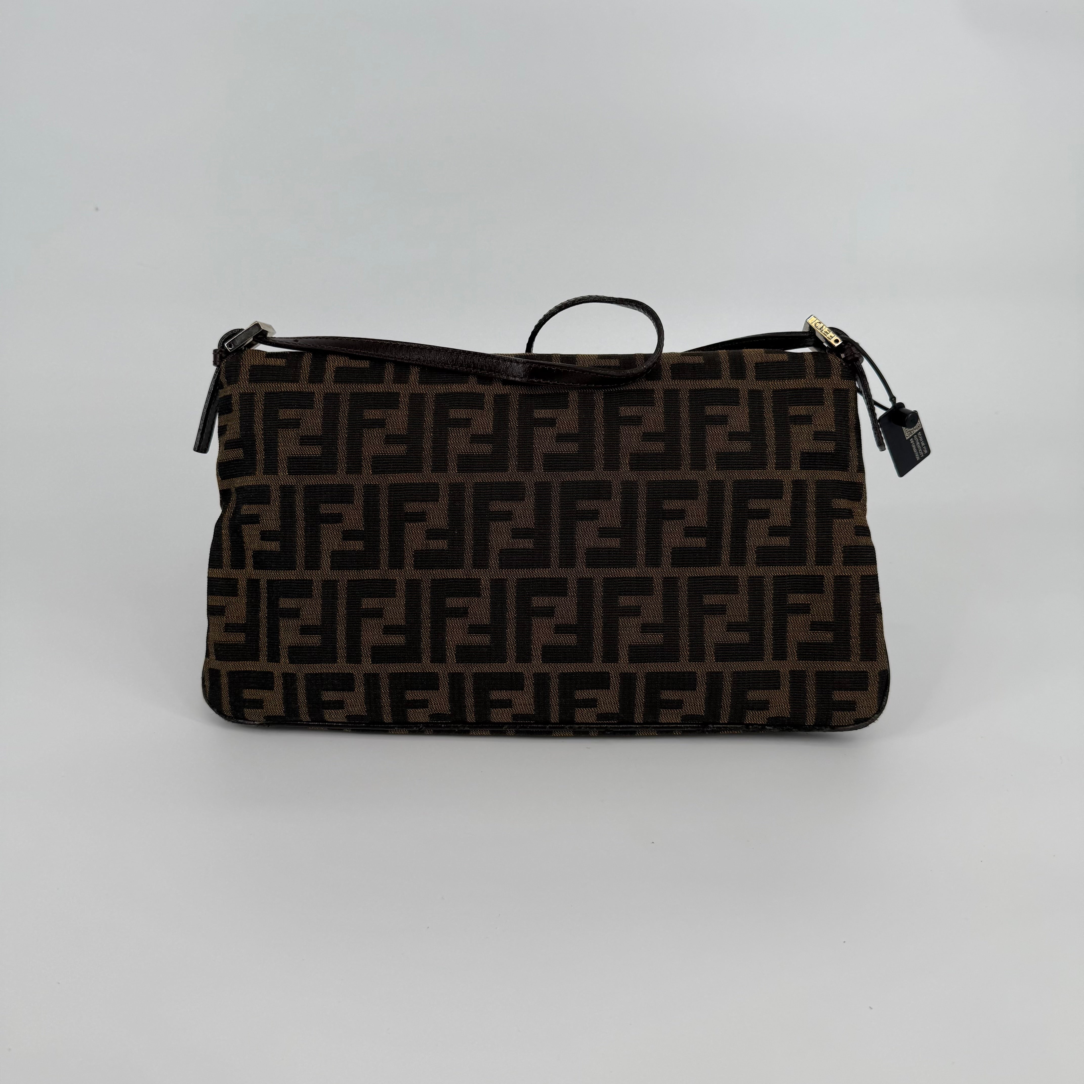 The Fendi FF Baguette Handbag in brown Zucca canvas is a true icon of Italian fashion and one of the most celebrated designs in modern handbag history. Introduced in 1997 by Silvia Venturini Fendi, the Baguette quickly became synonymous with effortless chic and individuality. Crafted from the brand’s signature FF monogram fabric with leather trim and the distinctive front flap closure, this piece exudes timeless sophistication. Compact yet statement-making, it perfectly captures Fendi’s blend of heritage craftsmanship and bold contemporary flair — the ultimate collectible for lovers of iconic luxury.