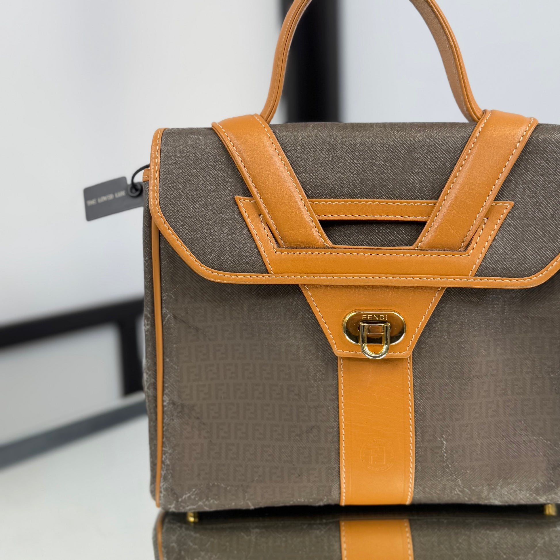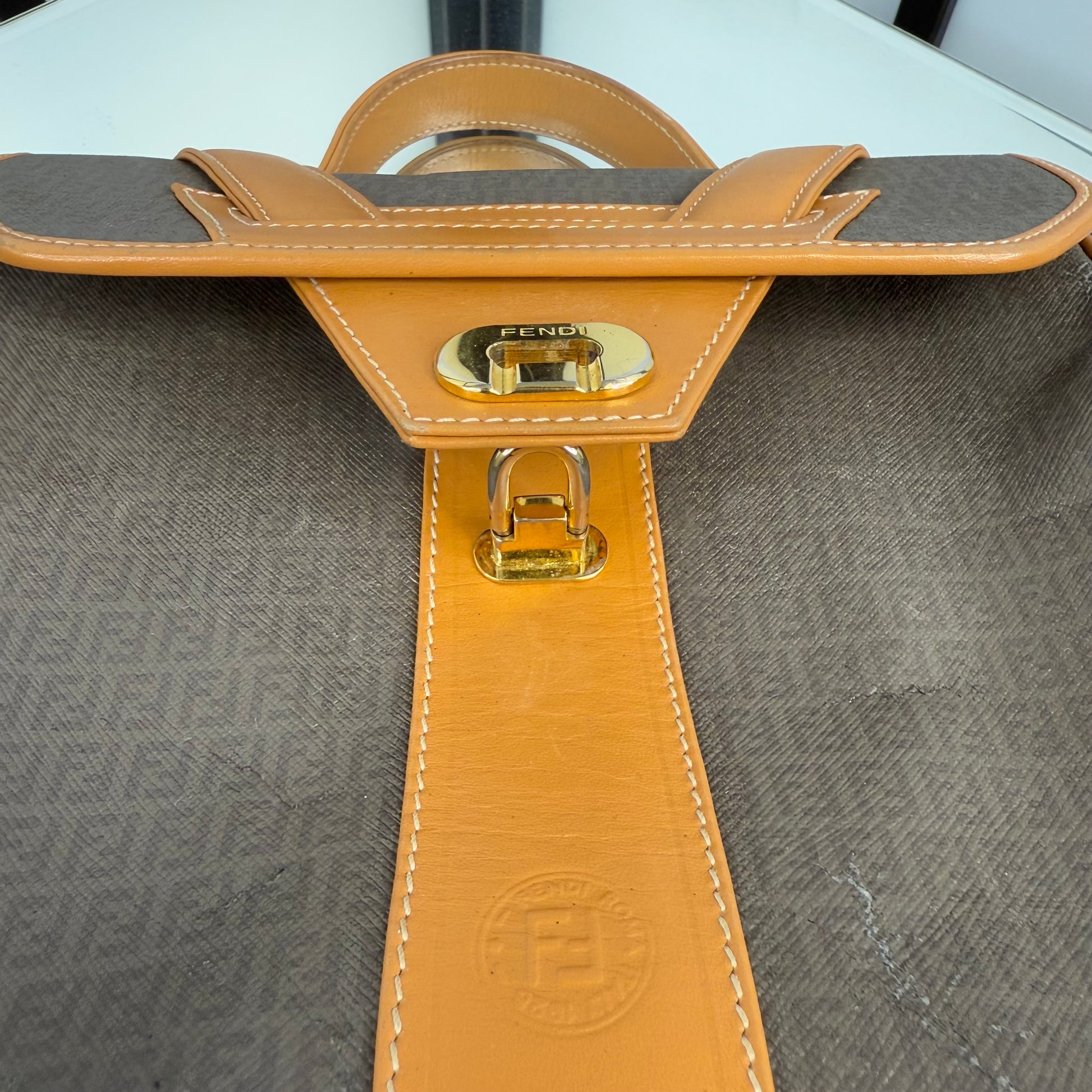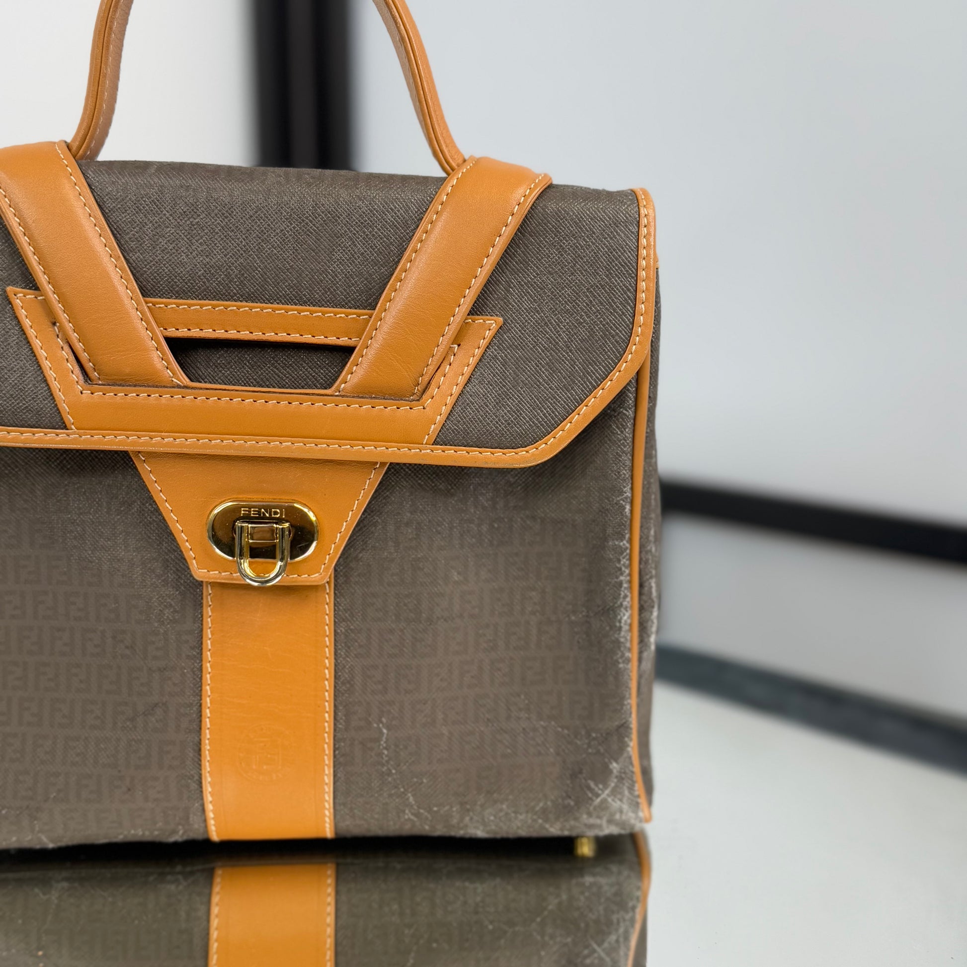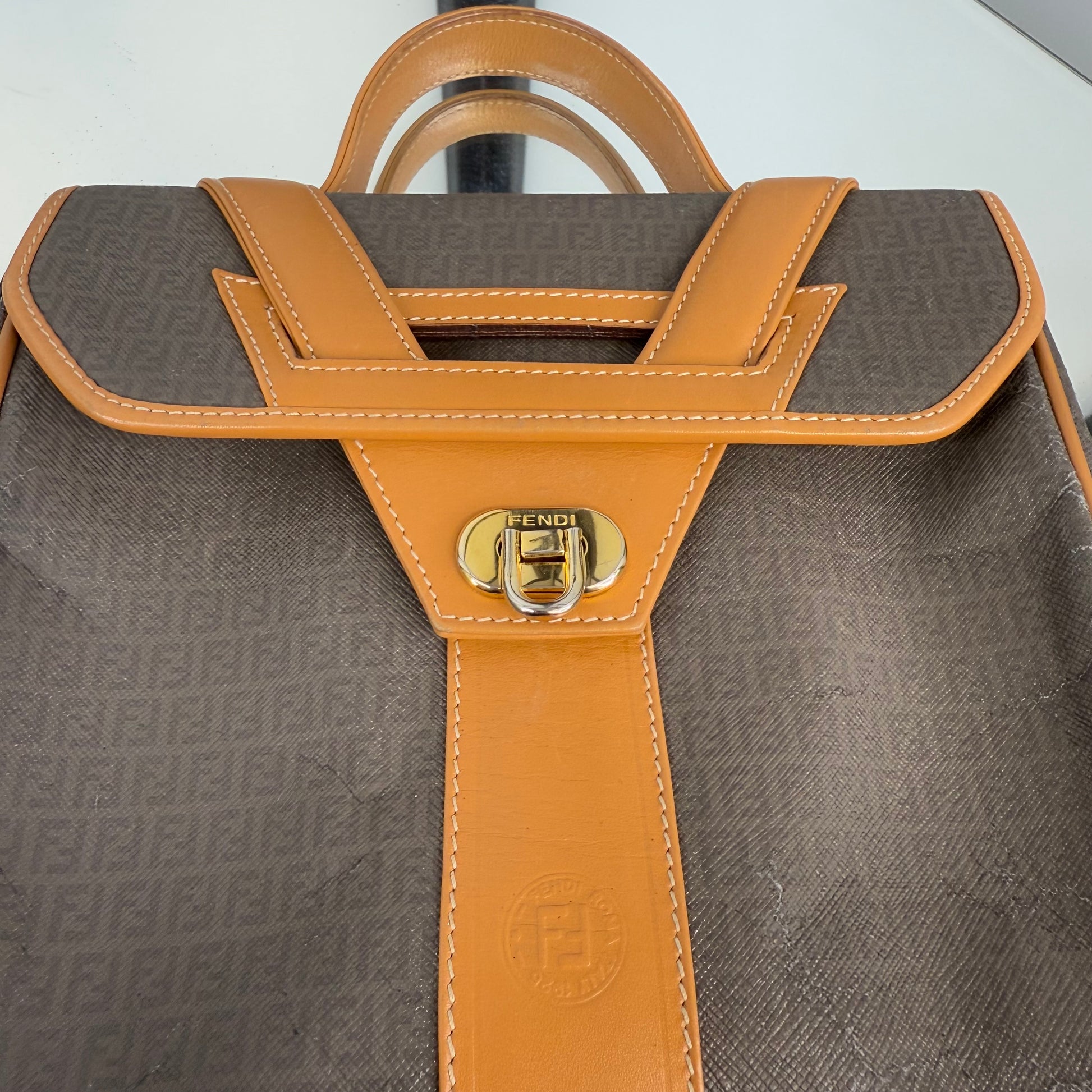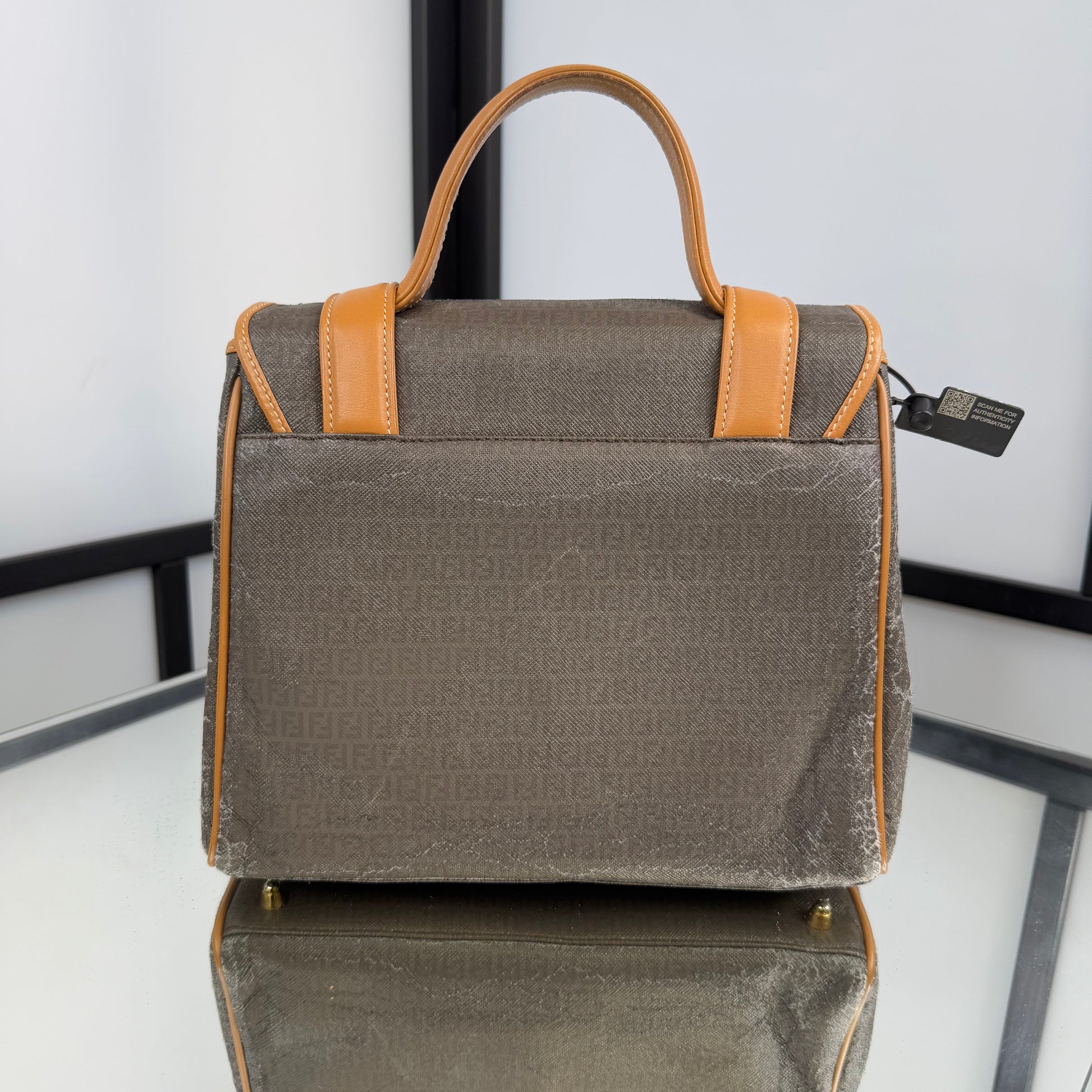 The FENDI FF Zucchino Handbag showcases the brand’s signature monogram canvas in a structured, vintage silhouette. Accented with tan leather trim and gold-tone hardware, it blends timeless Italian craftsmanship with everyday functionality. A classic statement piece that embodies Fendi’s refined aesthetic, perfect for both casual and polished looks.