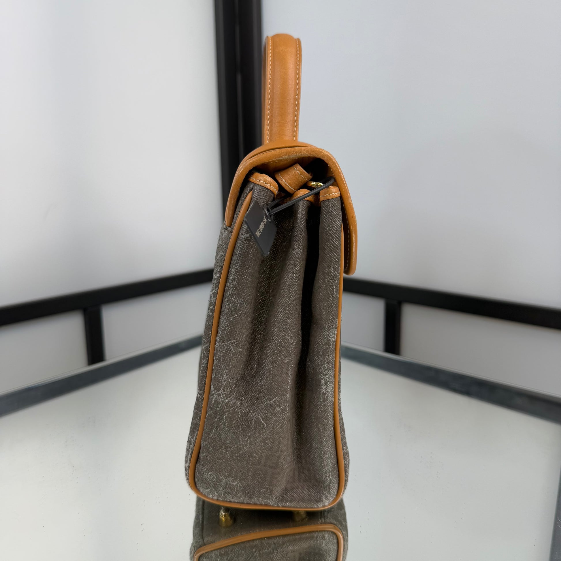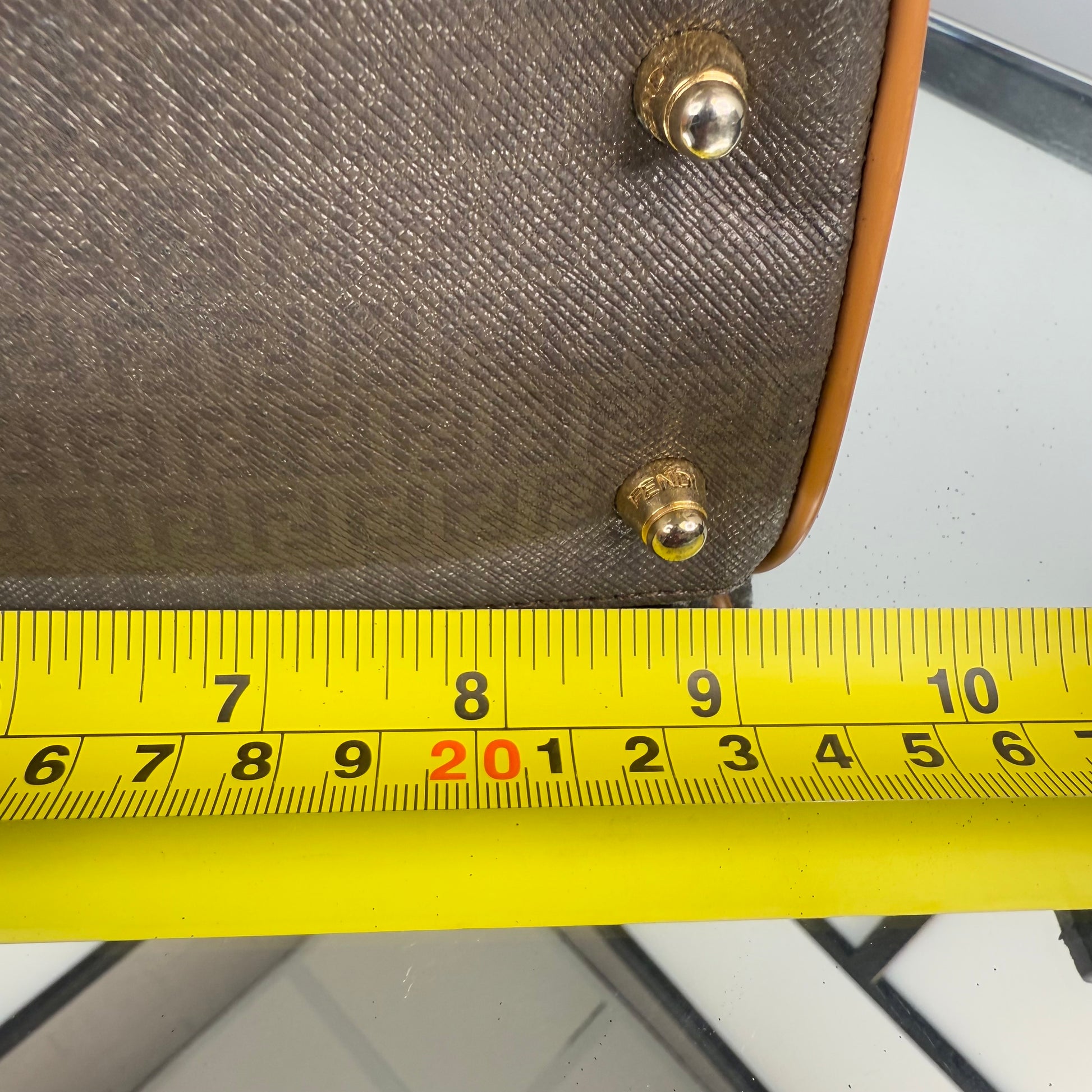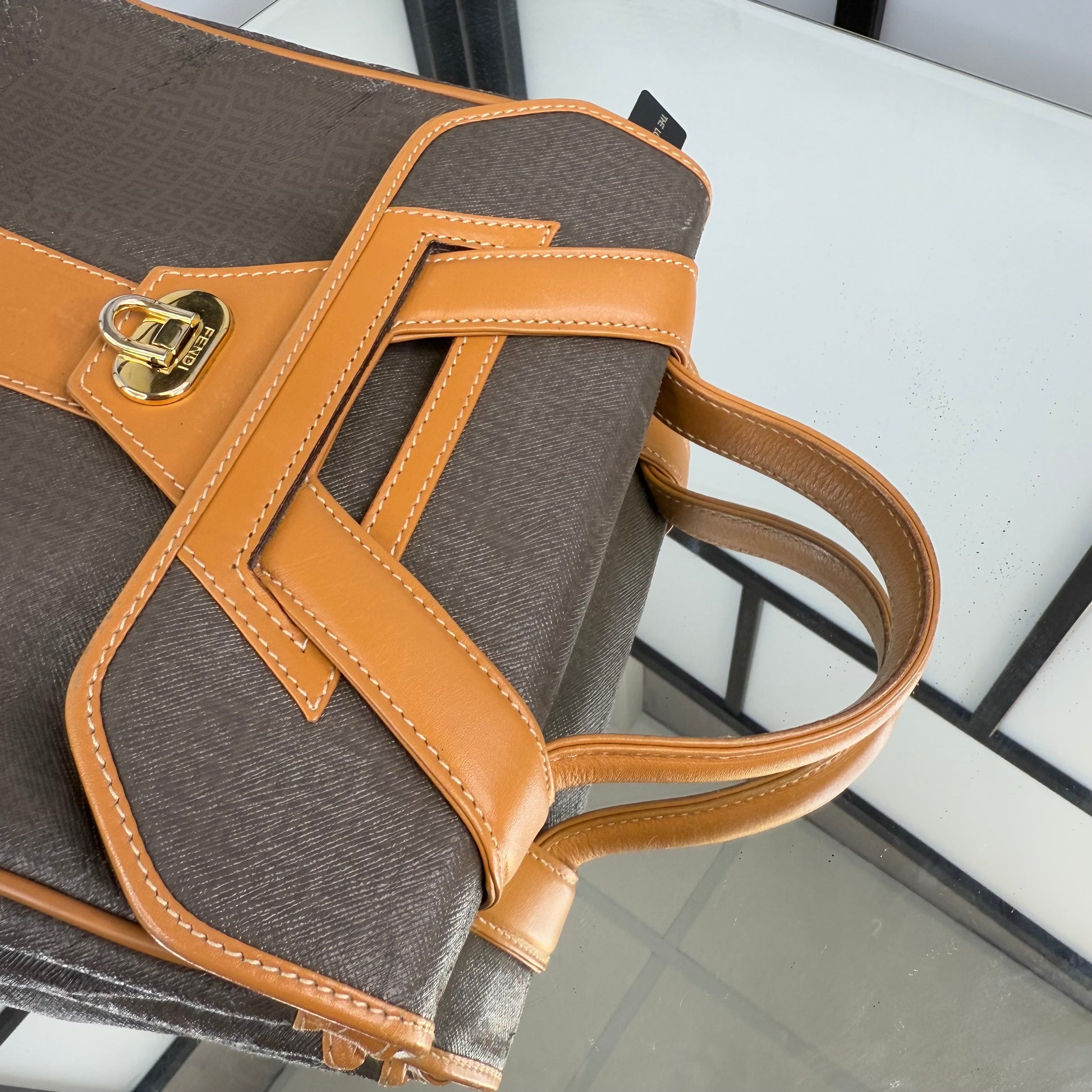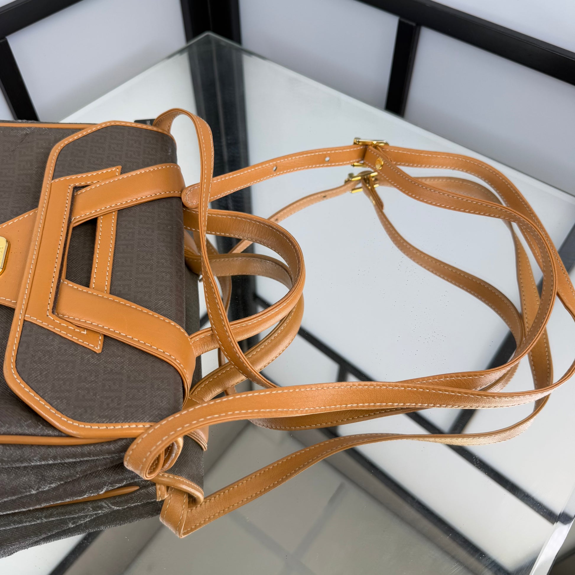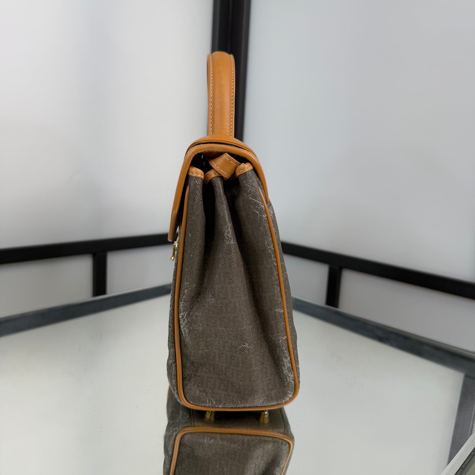 The FENDI FF Zucchino Handbag showcases the brand’s signature monogram canvas in a structured, vintage silhouette. Accented with tan leather trim and gold-tone hardware, it blends timeless Italian craftsmanship with everyday functionality. A classic statement piece that embodies Fendi’s refined aesthetic, perfect for both casual and polished looks.