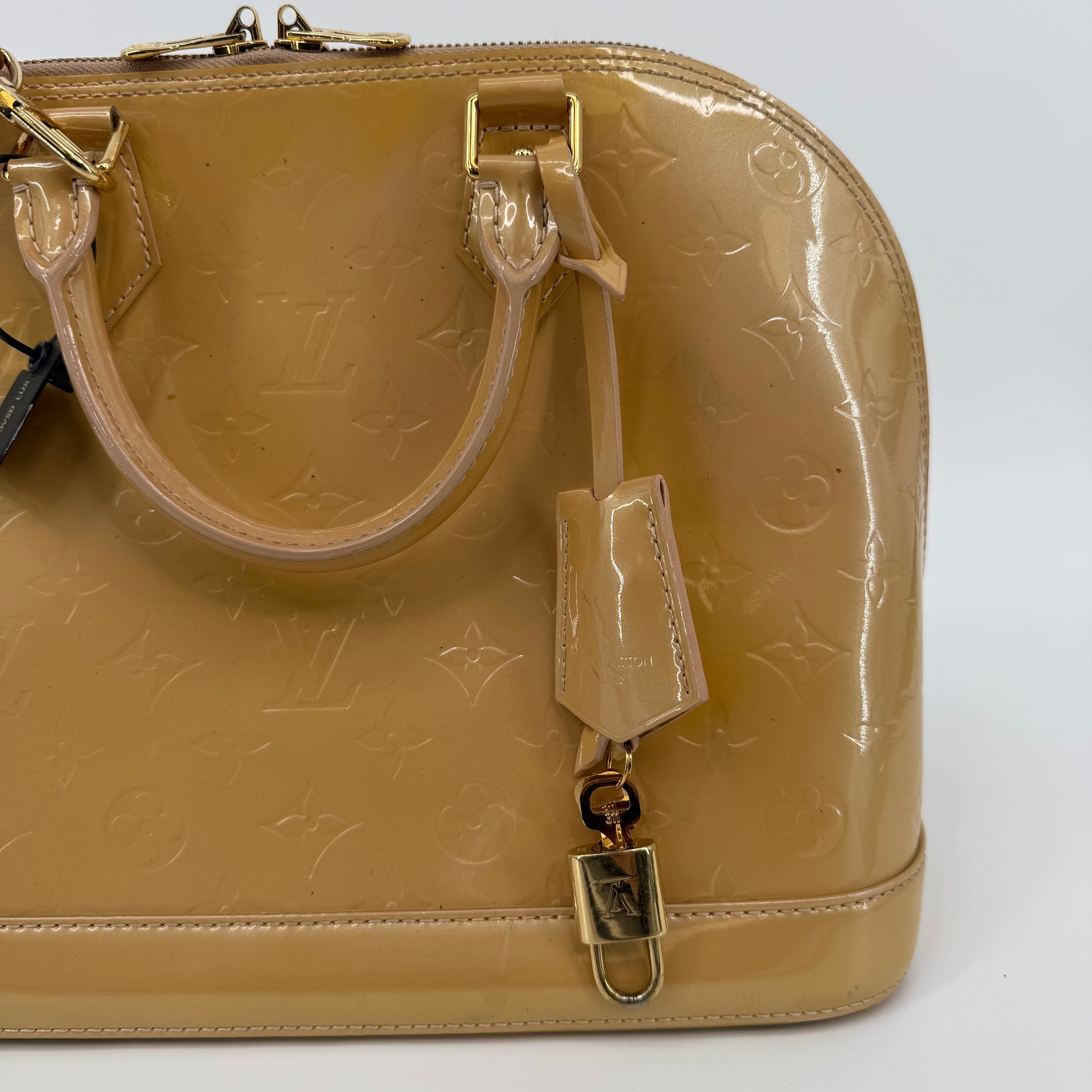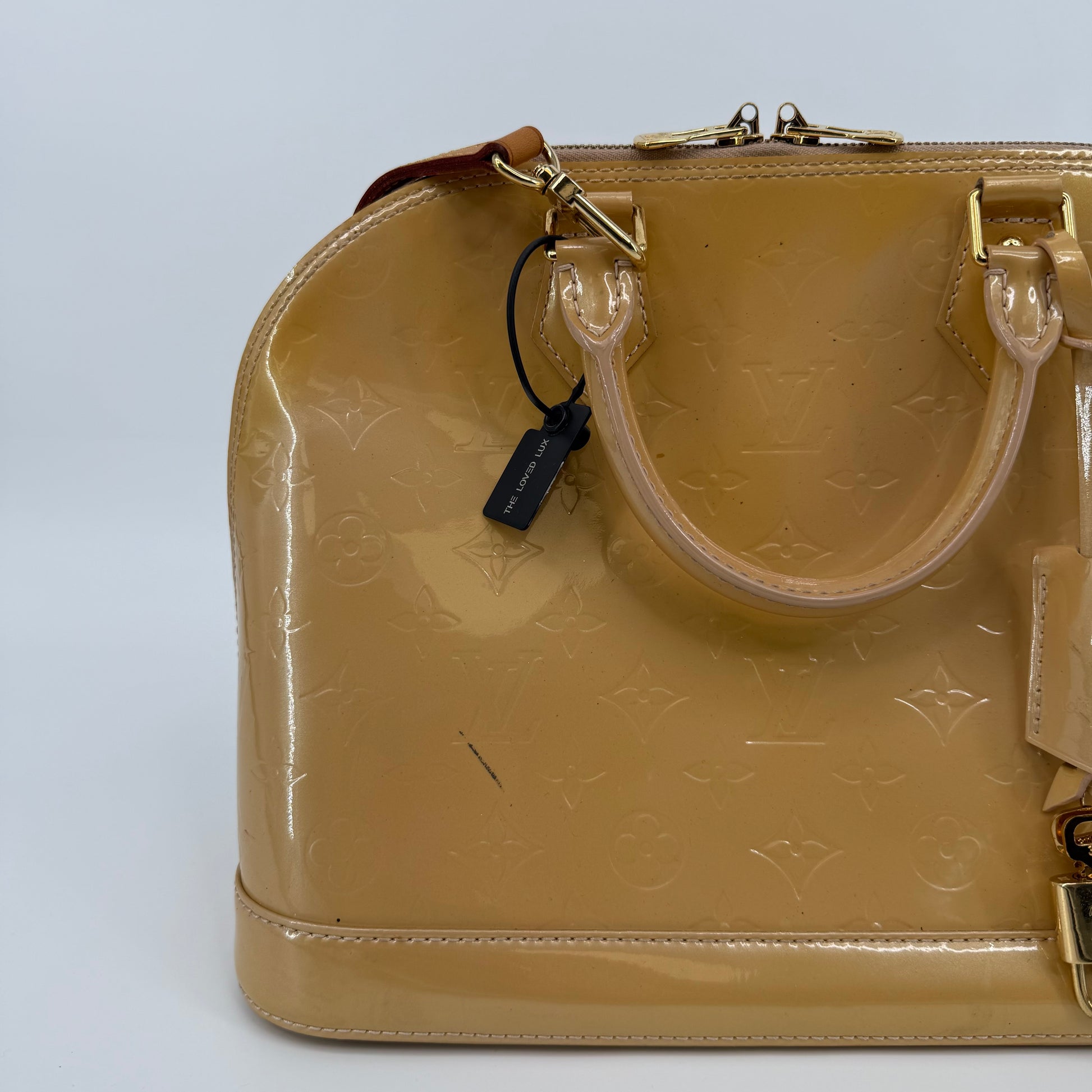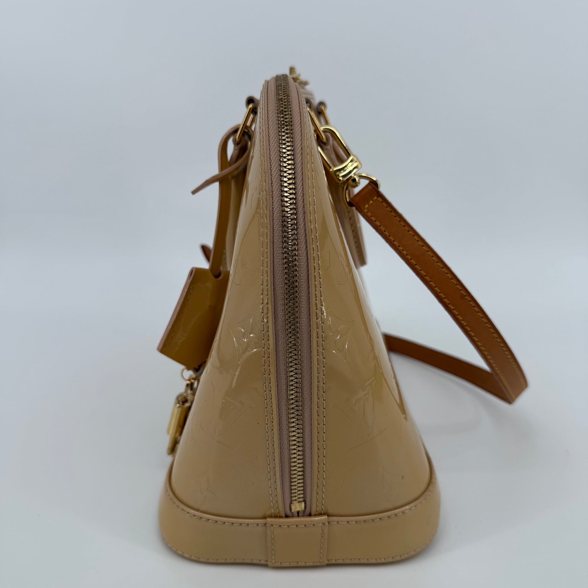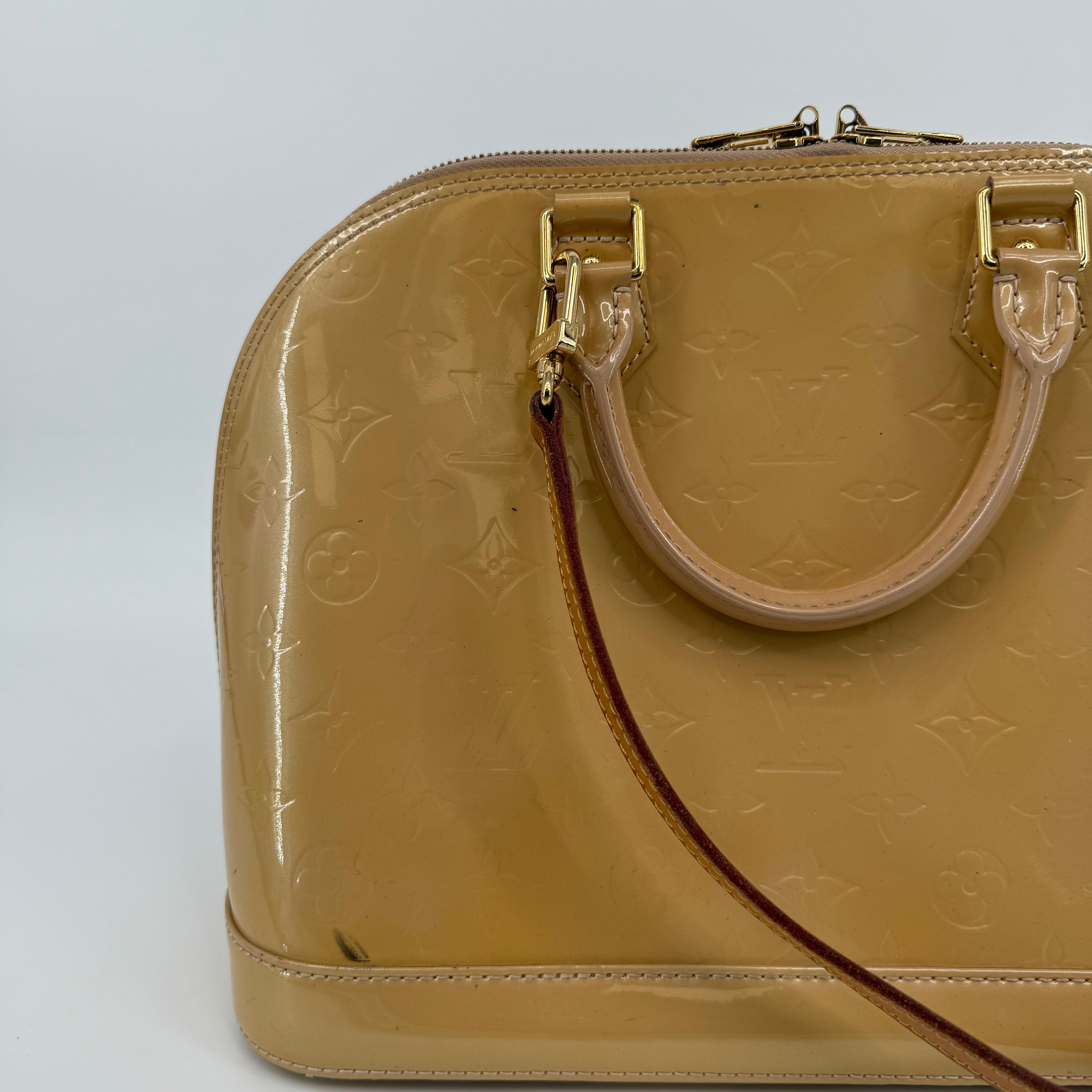 Chic Louis Vuitton Alma PM in glossy Vernis patent leather with the iconic embossed Monogram pattern. Finished in a warm beige tone with gold-tone hardware, dual top handles, and the signature structured silhouette. The Alma is one of Louis Vuitton’s most timeless designs—elegant, polished, and perfect for everyday luxury.