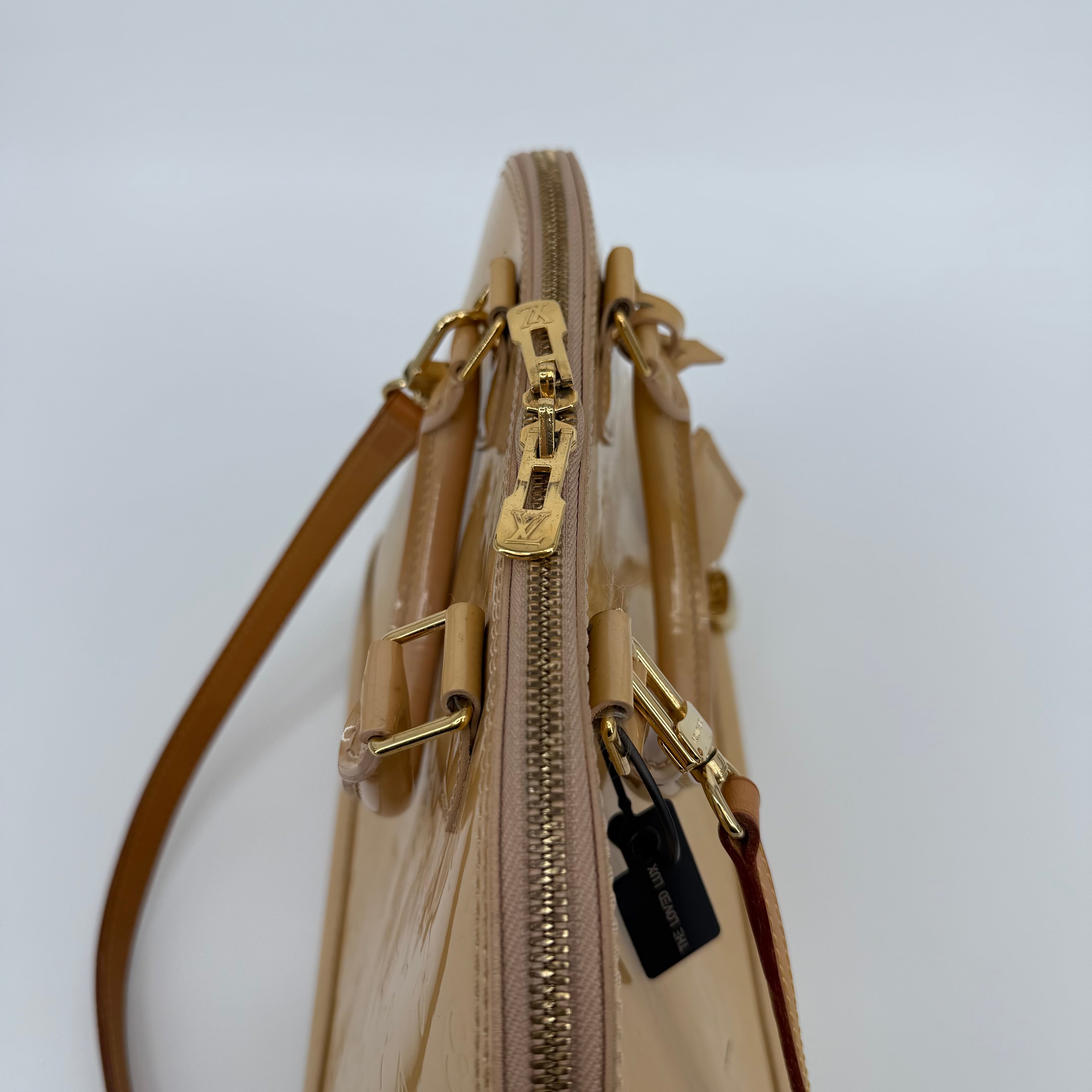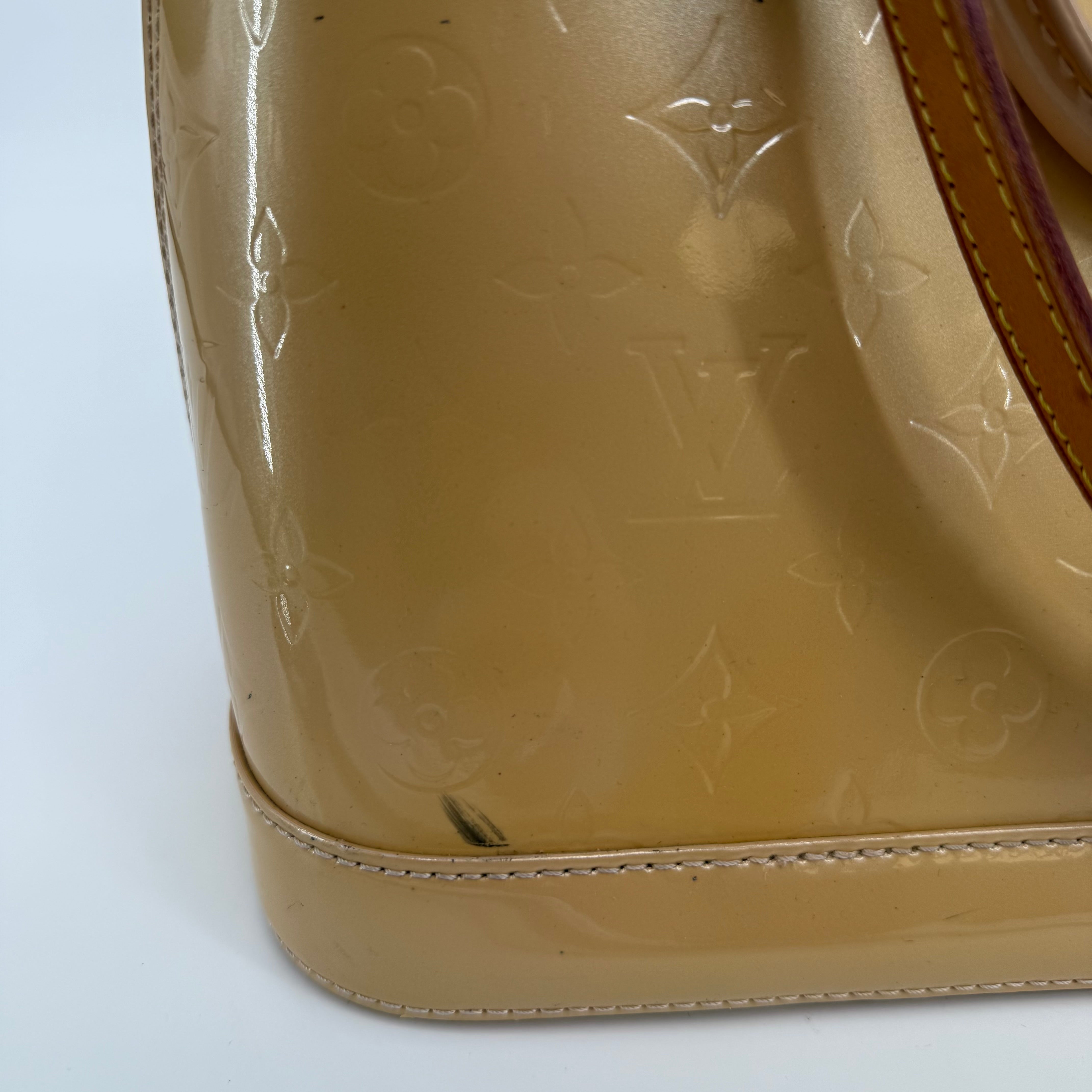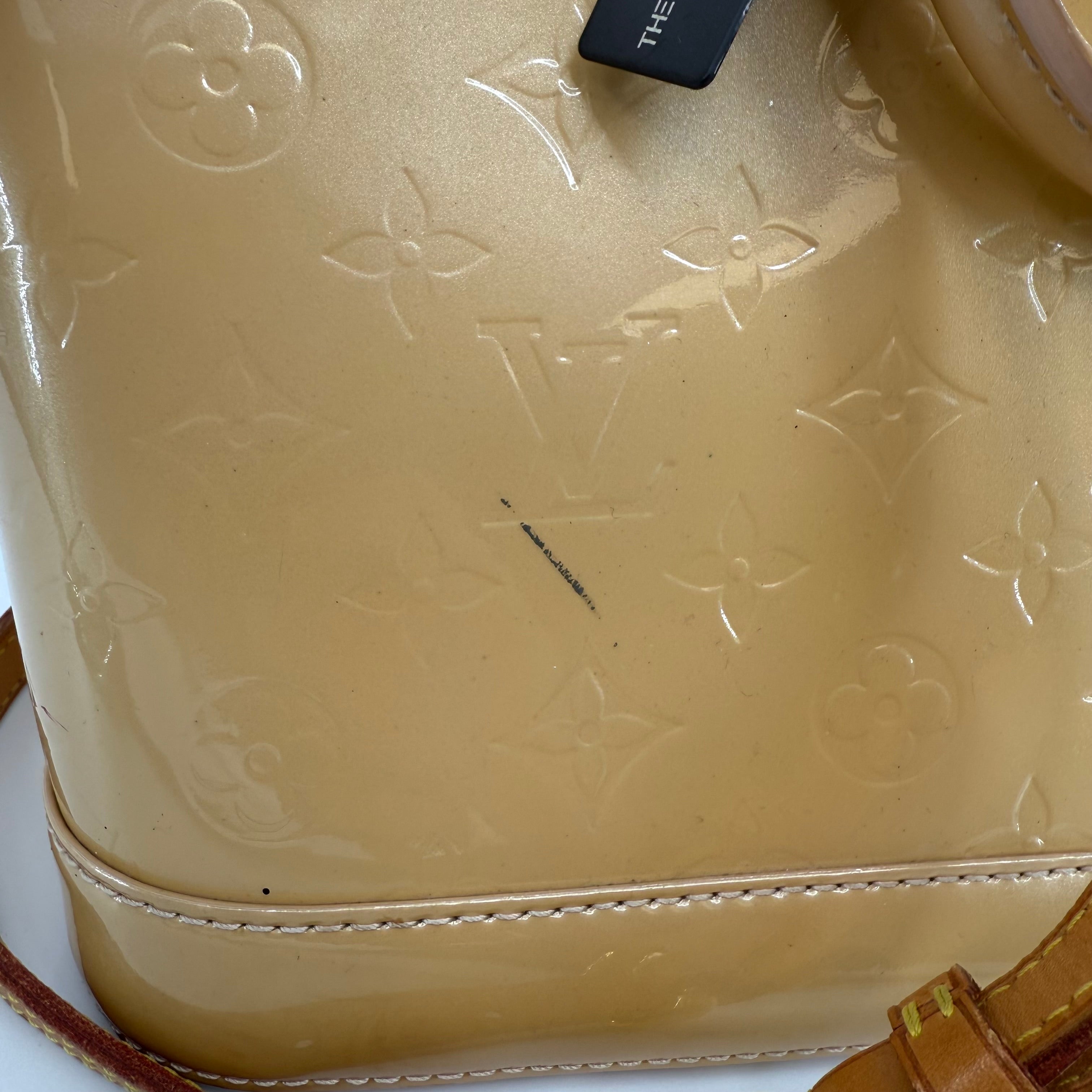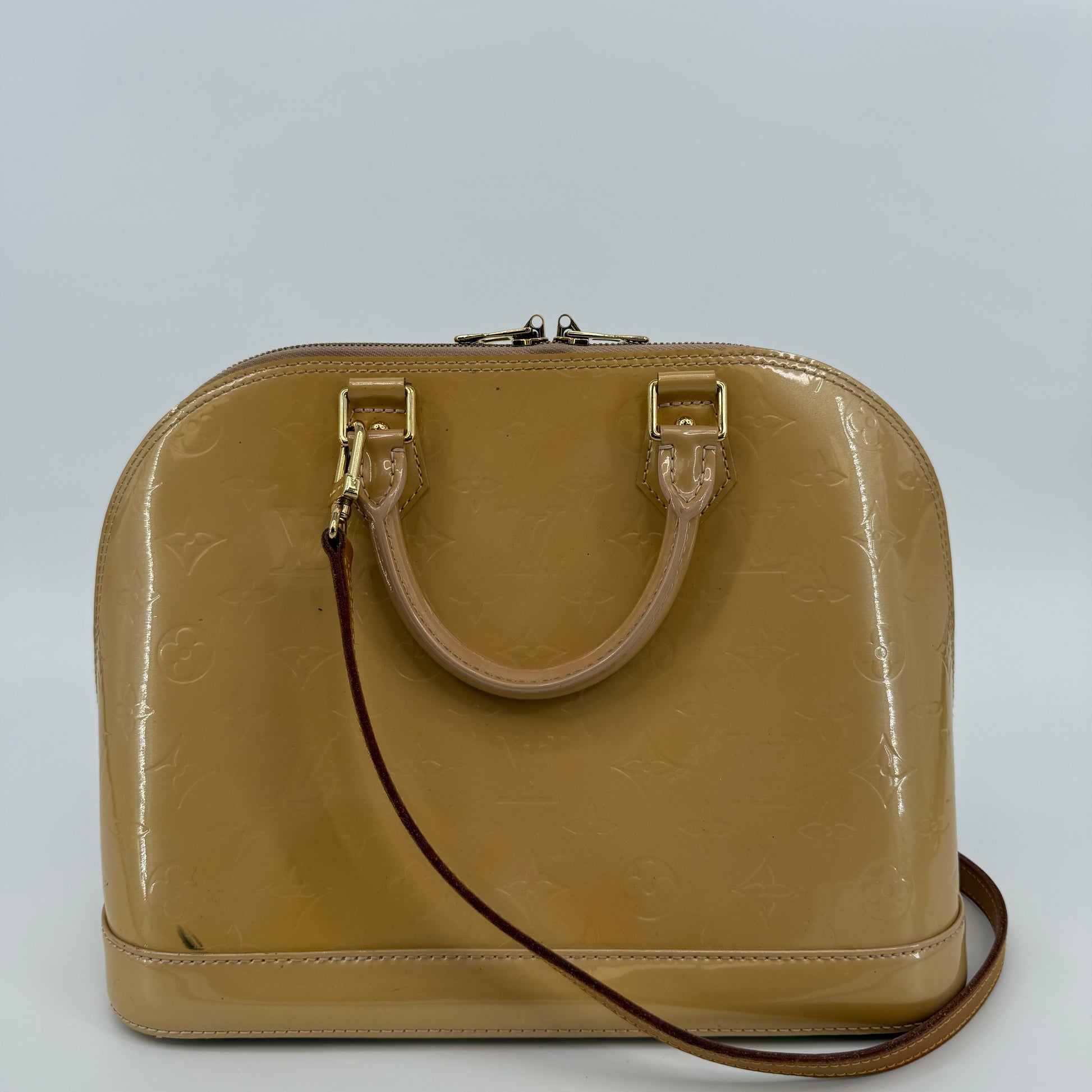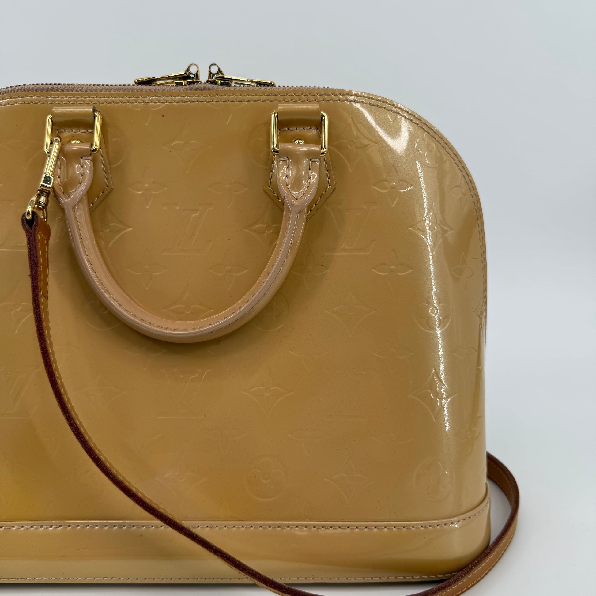 Chic Louis Vuitton Alma PM in glossy Vernis patent leather with the iconic embossed Monogram pattern. Finished in a warm beige tone with gold-tone hardware, dual top handles, and the signature structured silhouette. The Alma is one of Louis Vuitton’s most timeless designs—elegant, polished, and perfect for everyday luxury.