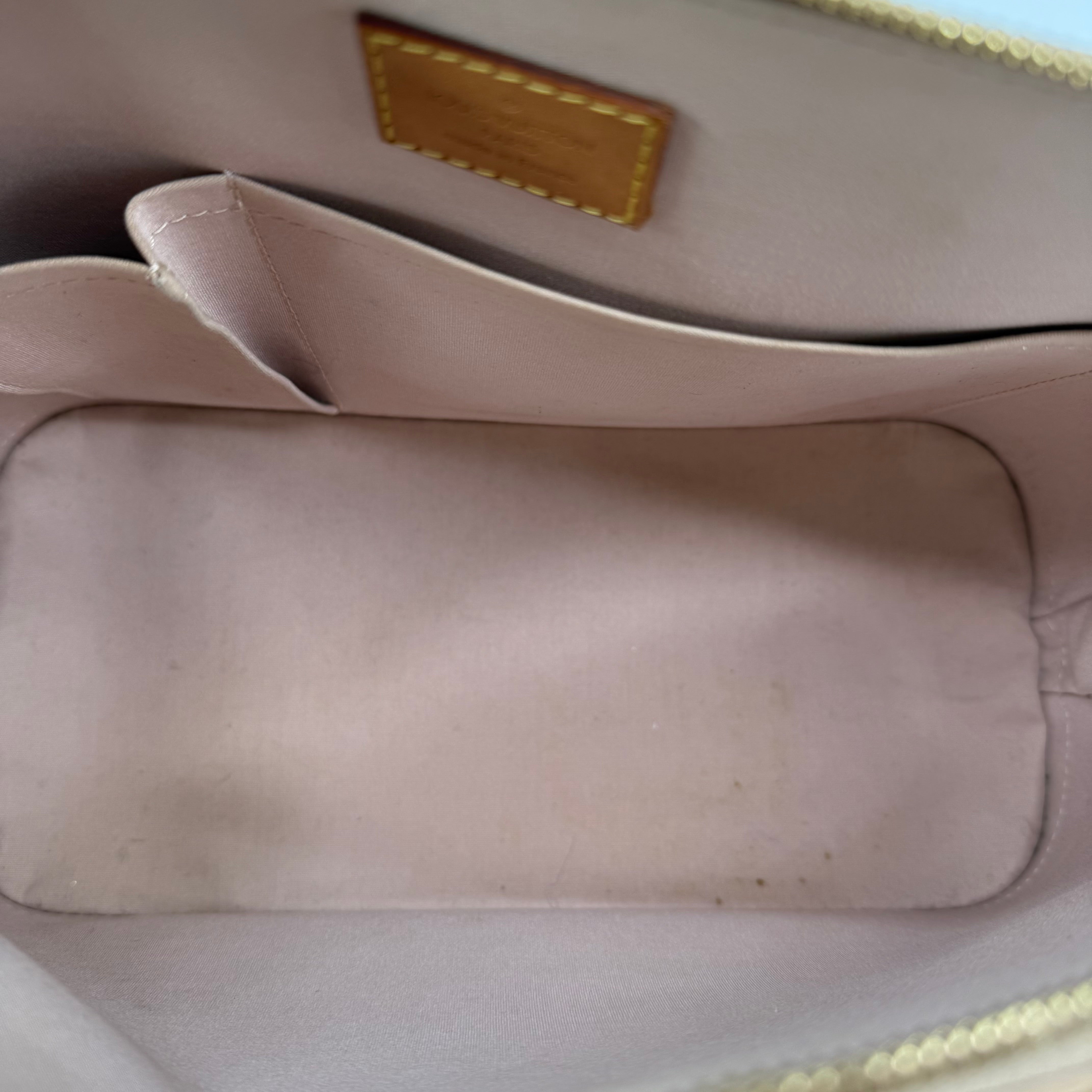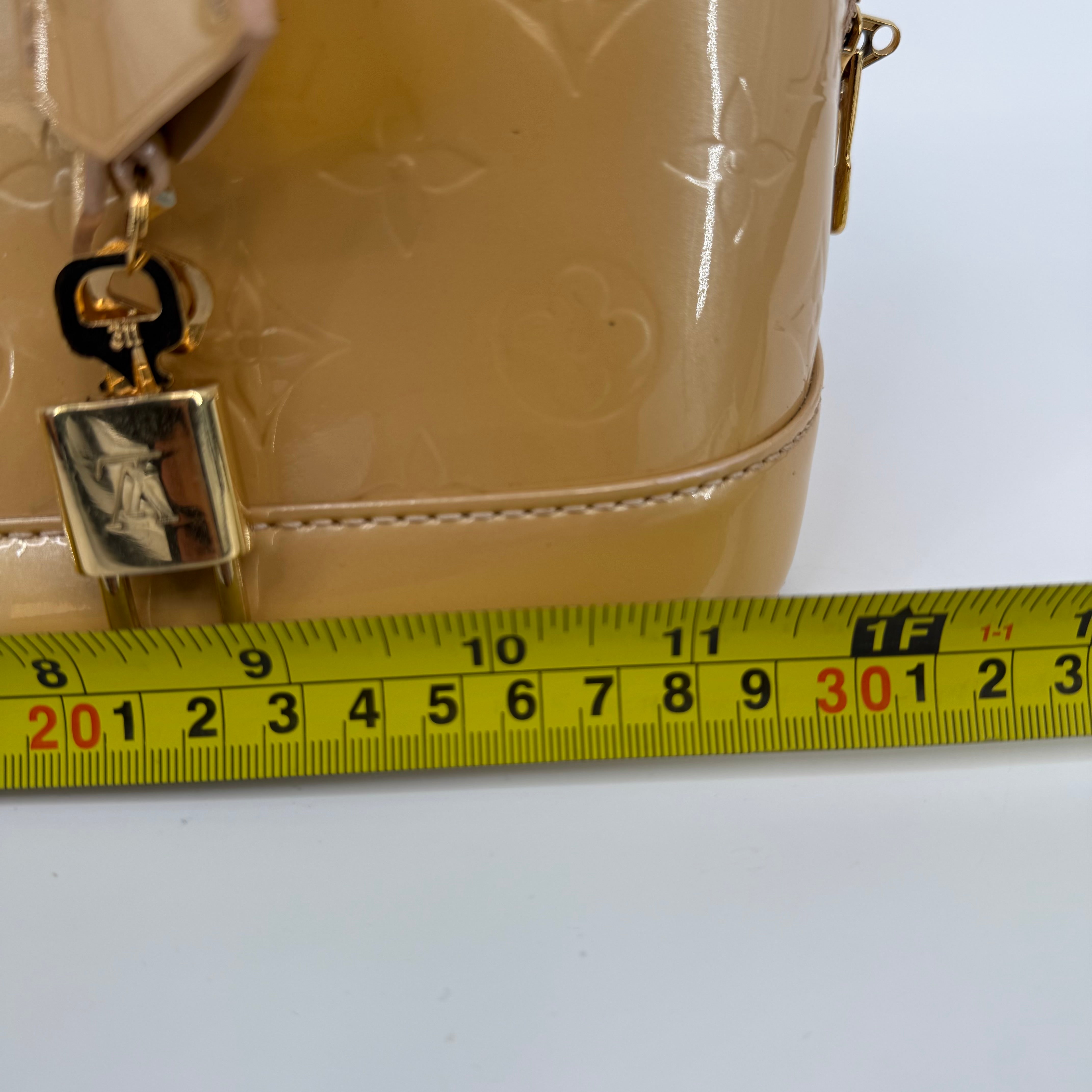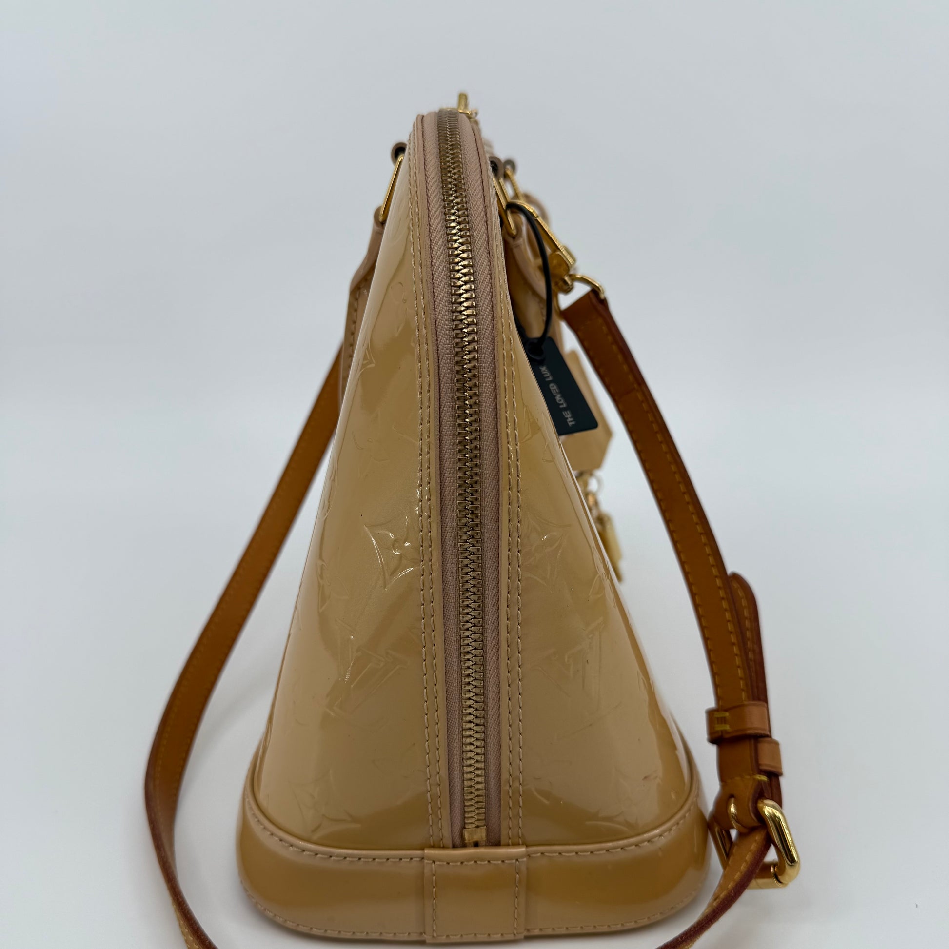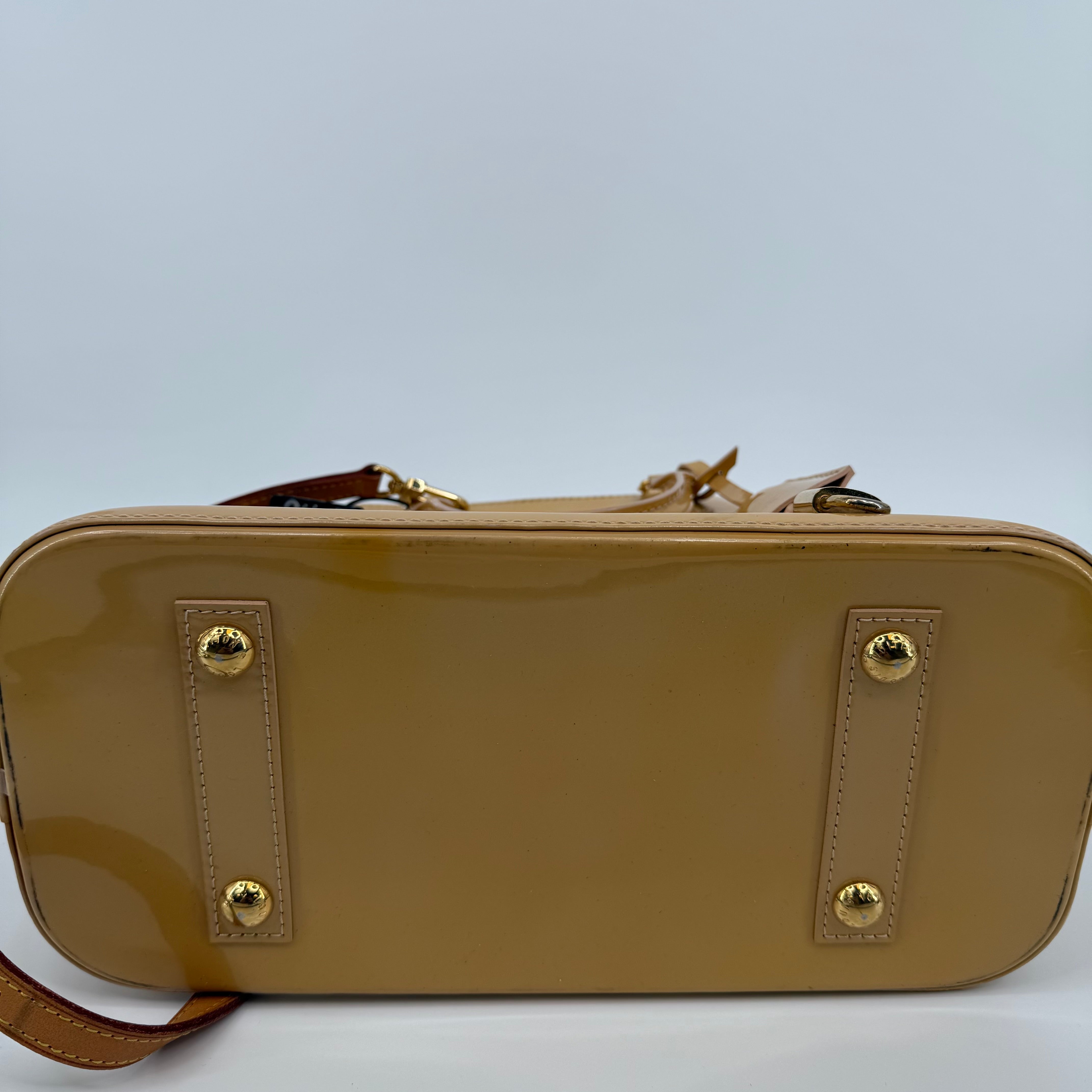 Chic Louis Vuitton Alma PM in glossy Vernis patent leather with the iconic embossed Monogram pattern. Finished in a warm beige tone with gold-tone hardware, dual top handles, and the signature structured silhouette. The Alma is one of Louis Vuitton’s most timeless designs—elegant, polished, and perfect for everyday luxury.