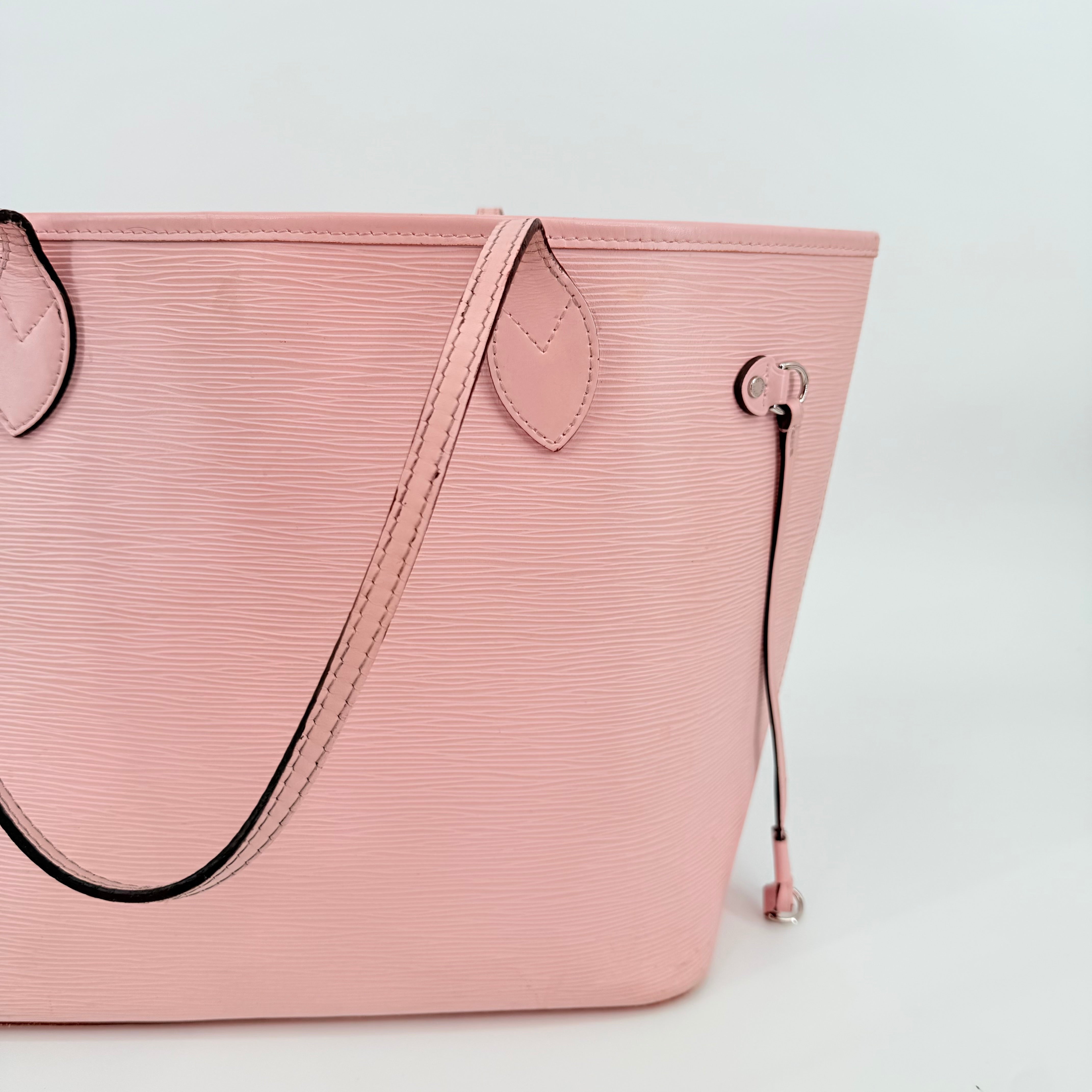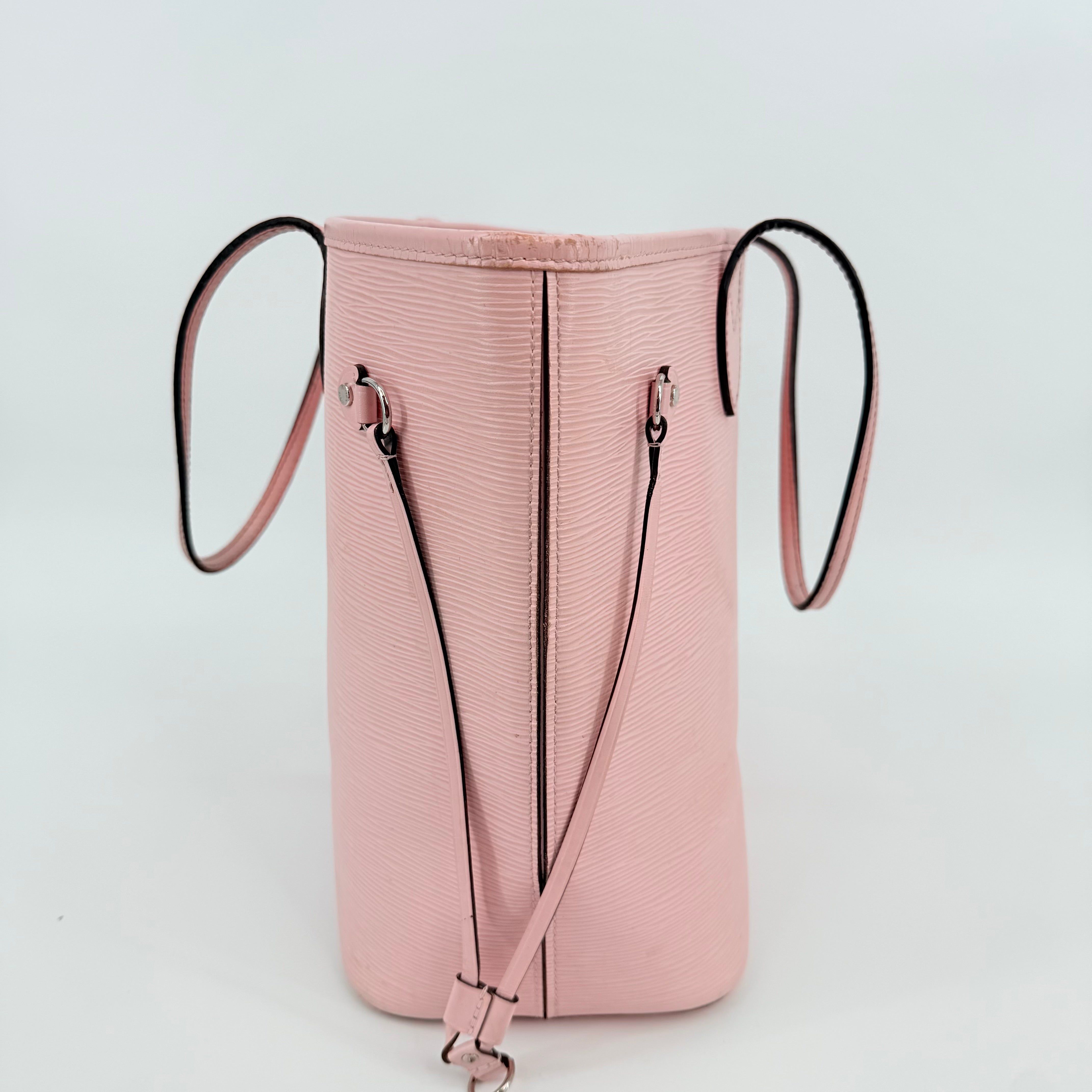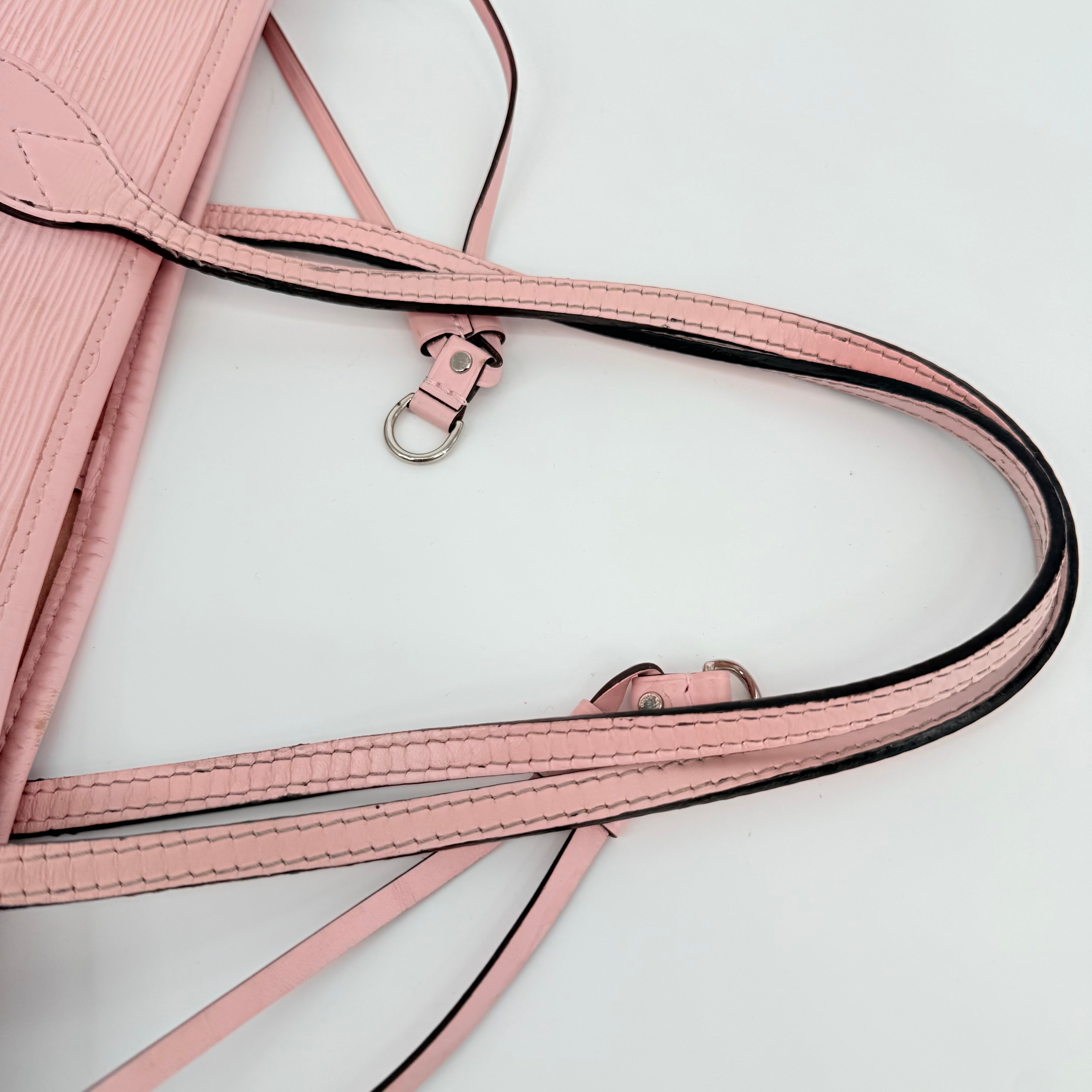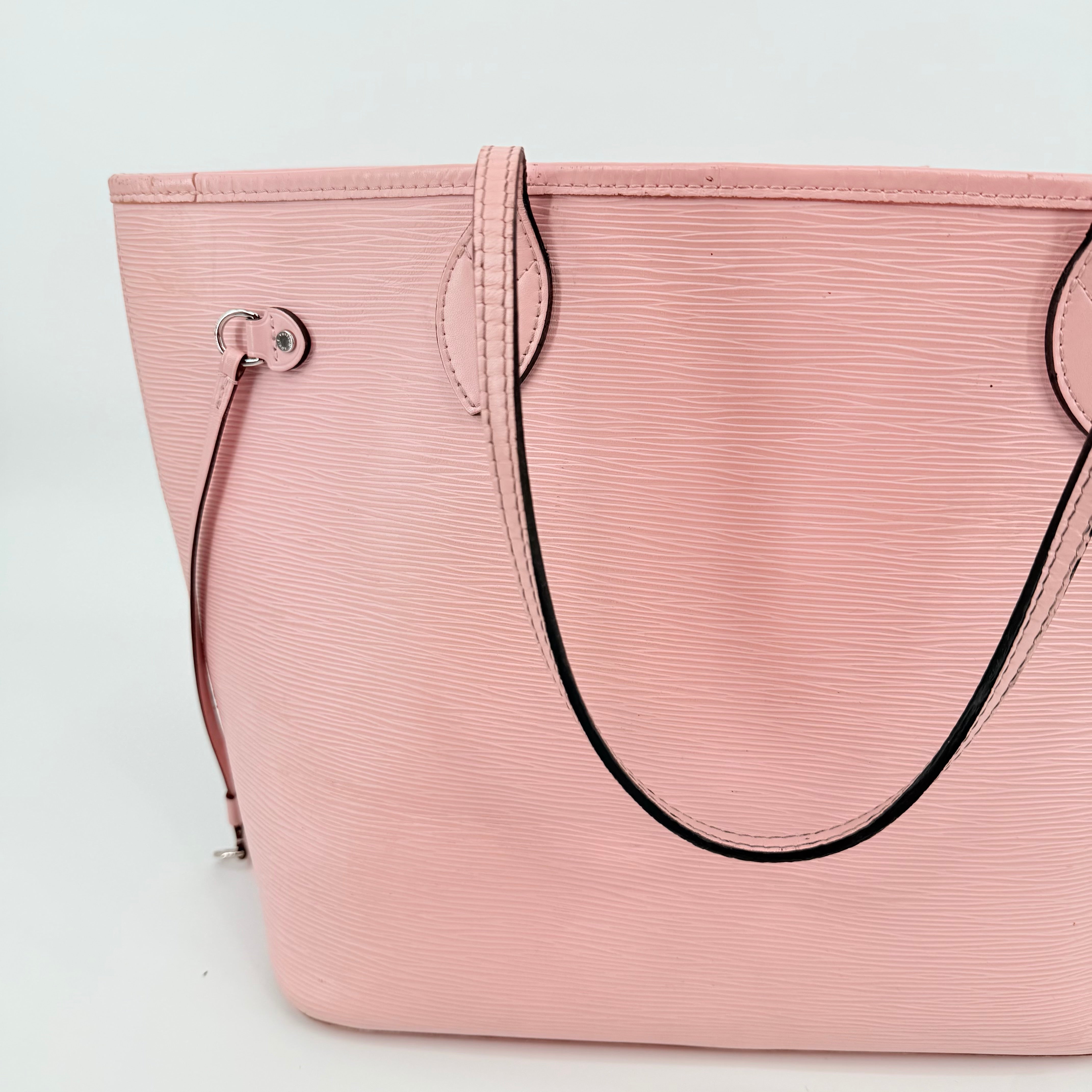 Louis Vuitton Epi Leather Neverfull MM in a soft pink shade. Crafted from durable textured Epi leather with matching pink trim and long shoulder straps. Side cinch cords allow the bag to be worn wide or tapered. Spacious open interior with a light-coloured lining and hook closure at the top. Elegant, structured and rare in this colourway – a standout everyday tote with minimal signs of wear for its style and age.
