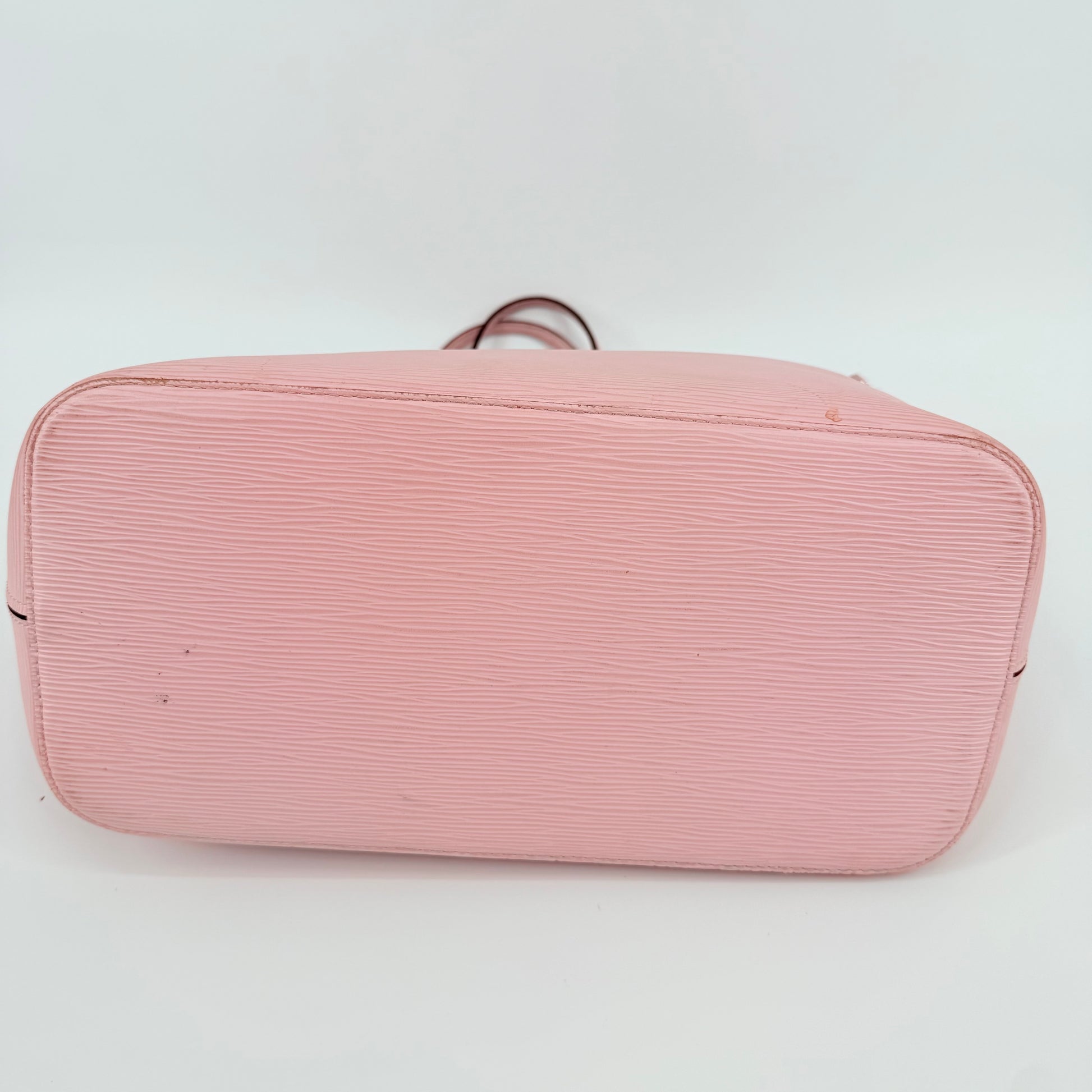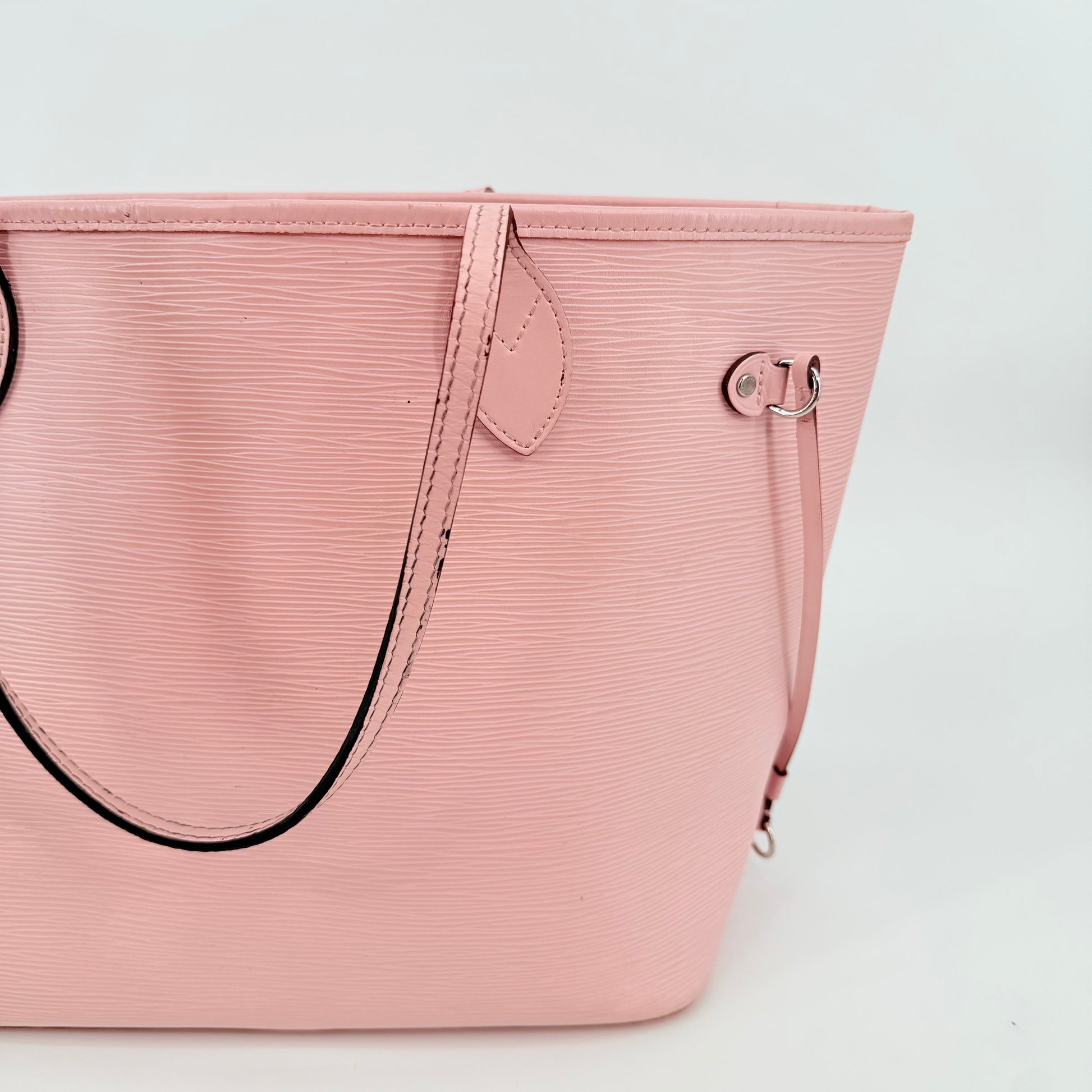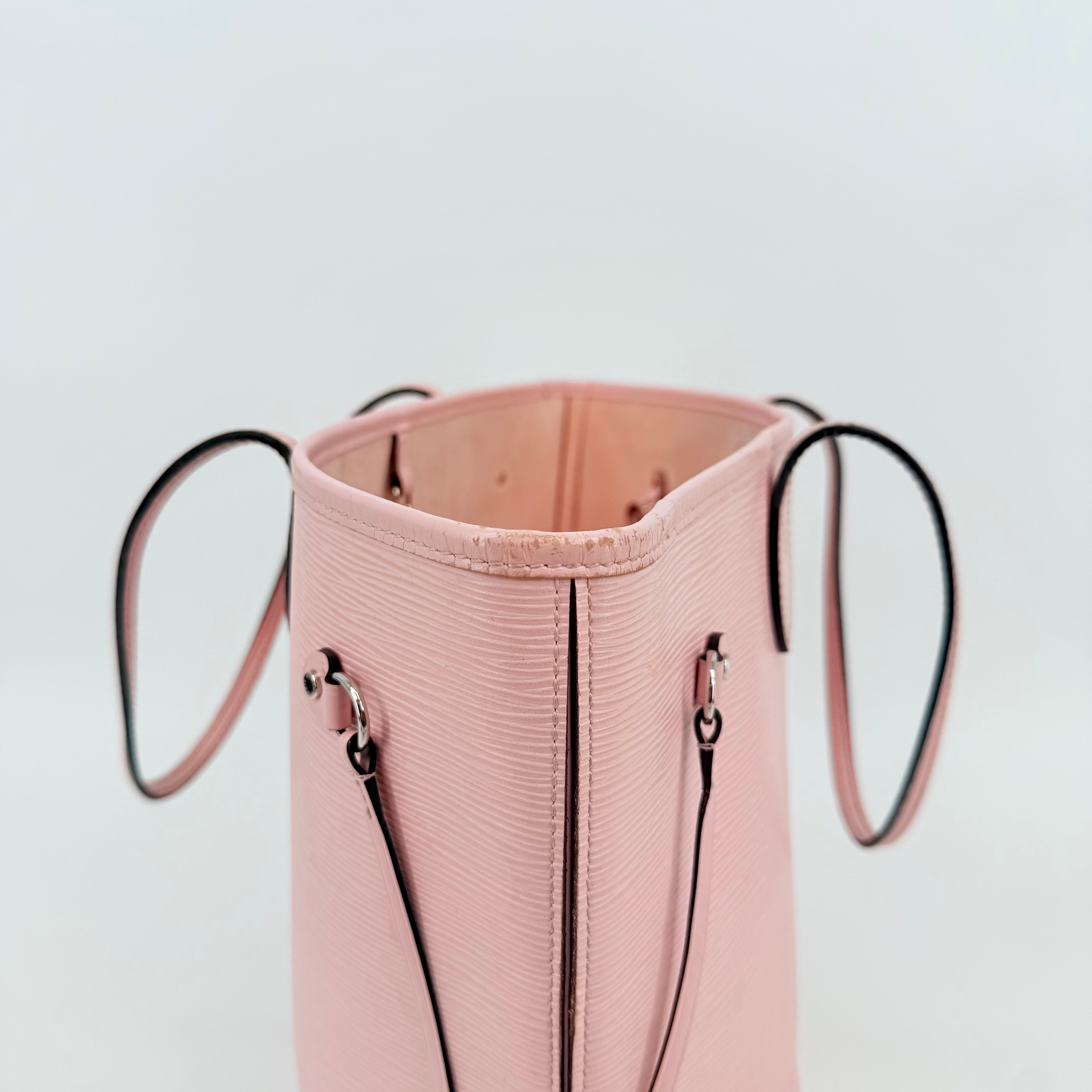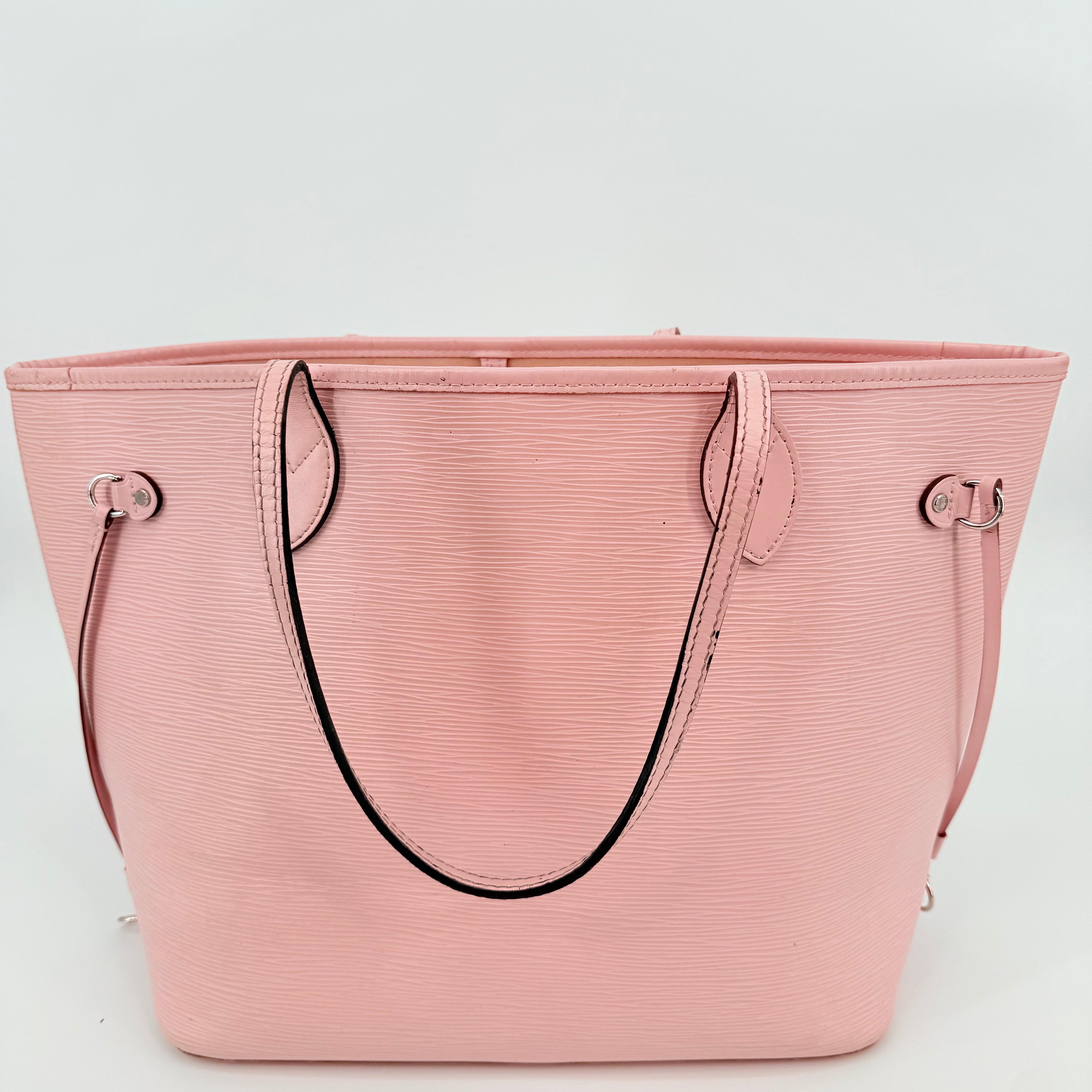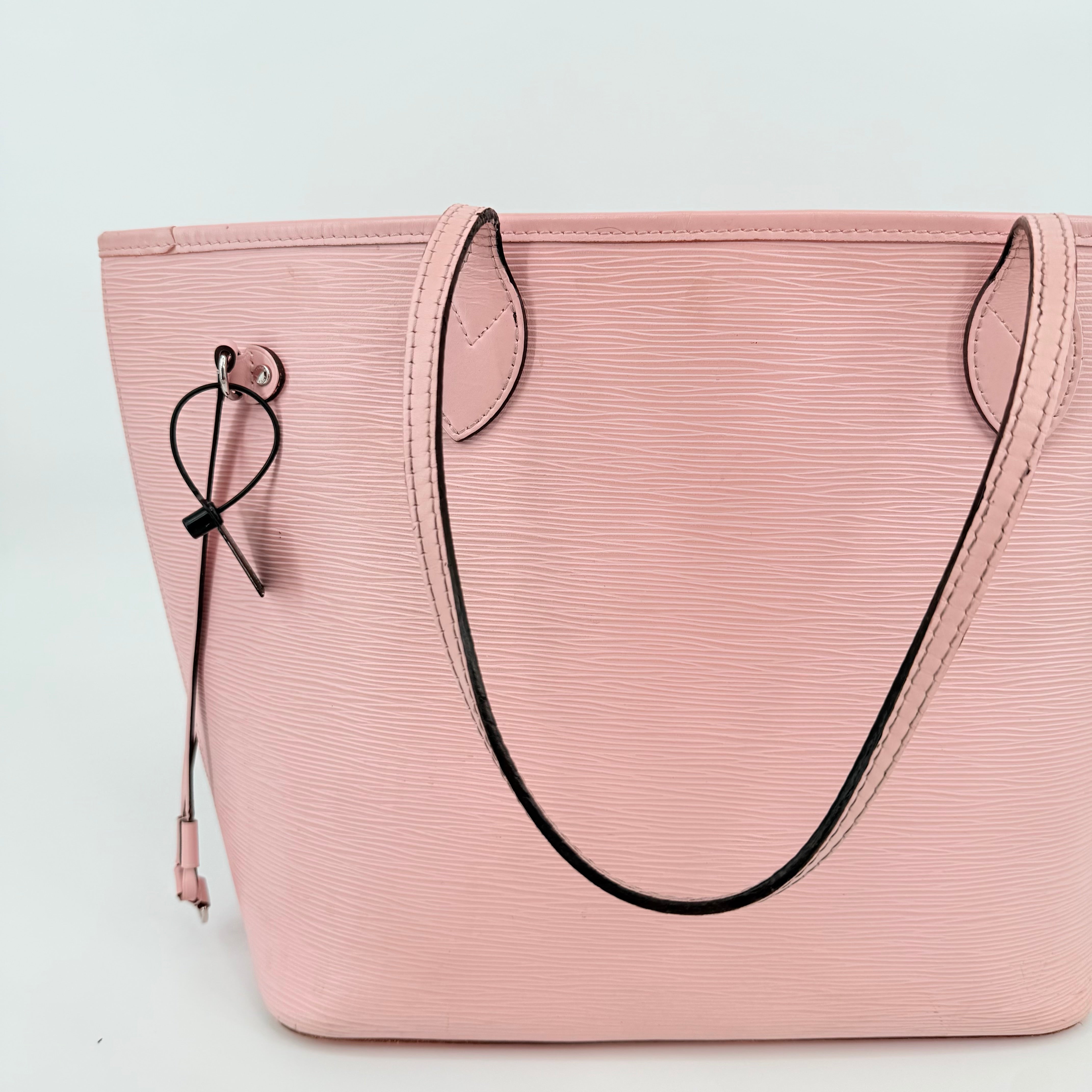 Louis Vuitton Epi Leather Neverfull MM in a soft pink shade. Crafted from durable textured Epi leather with matching pink trim and long shoulder straps. Side cinch cords allow the bag to be worn wide or tapered. Spacious open interior with a light-coloured lining and hook closure at the top. Elegant, structured and rare in this colourway – a standout everyday tote with minimal signs of wear for its style and age.