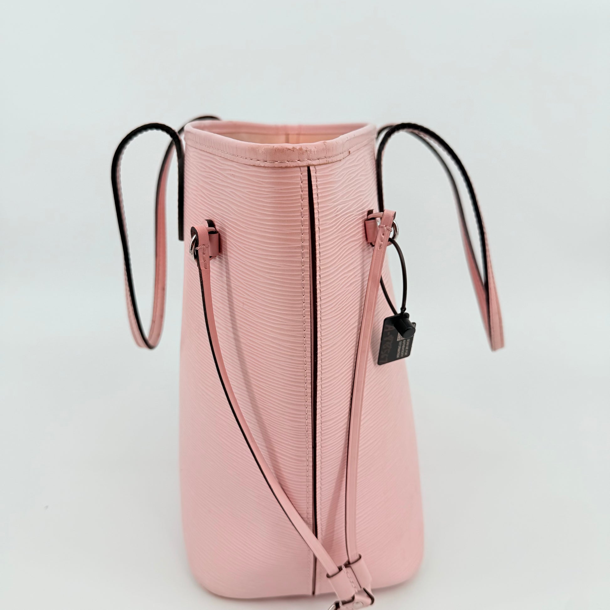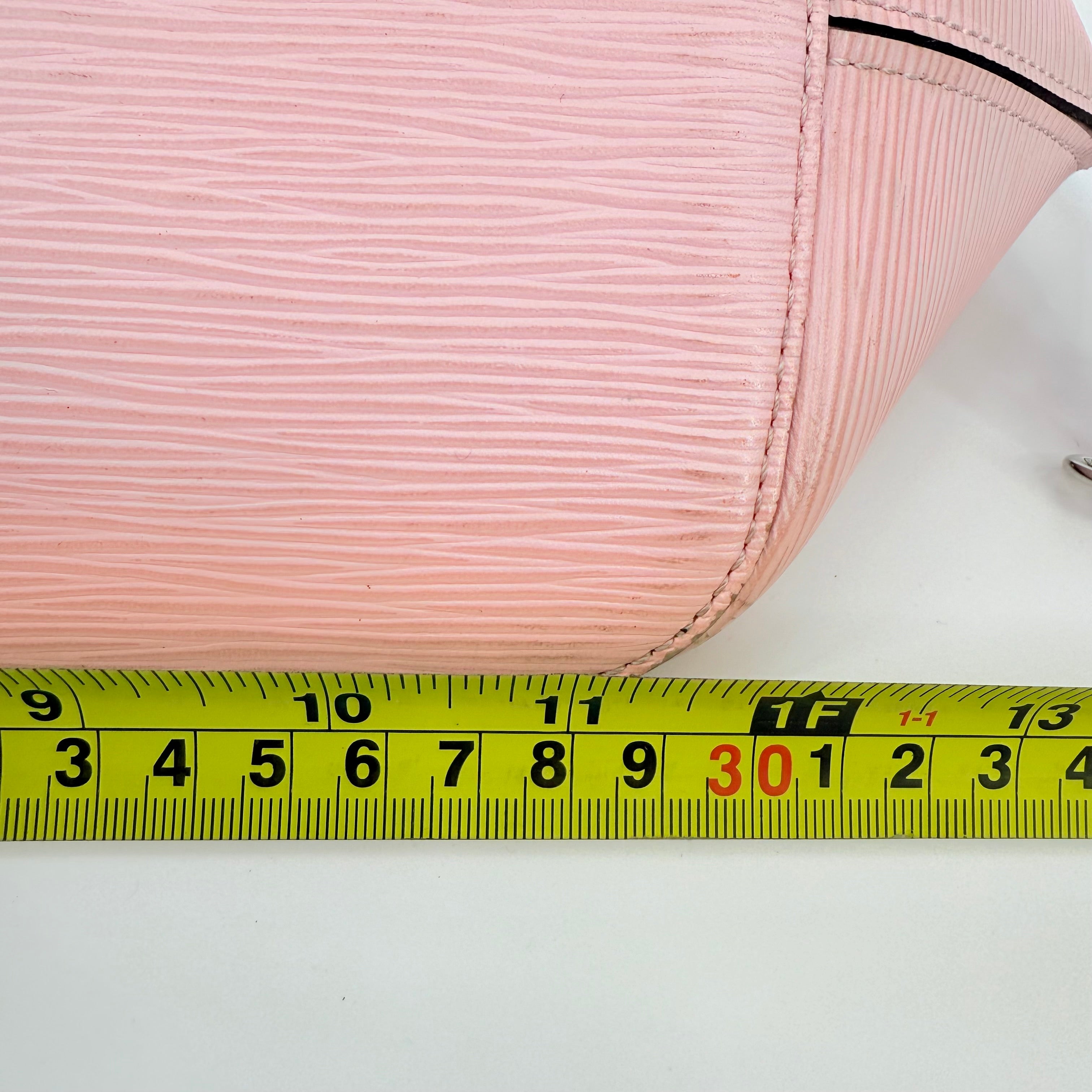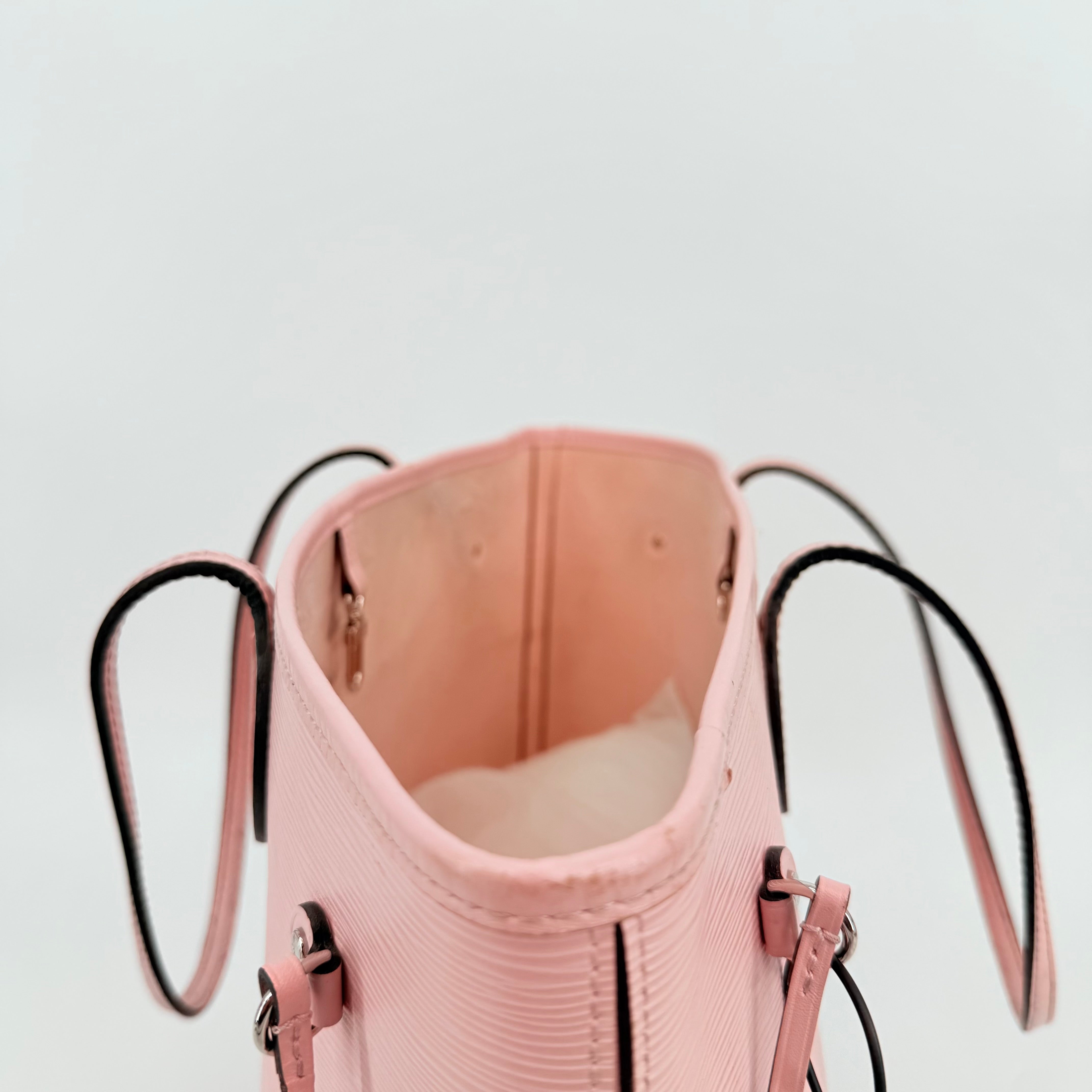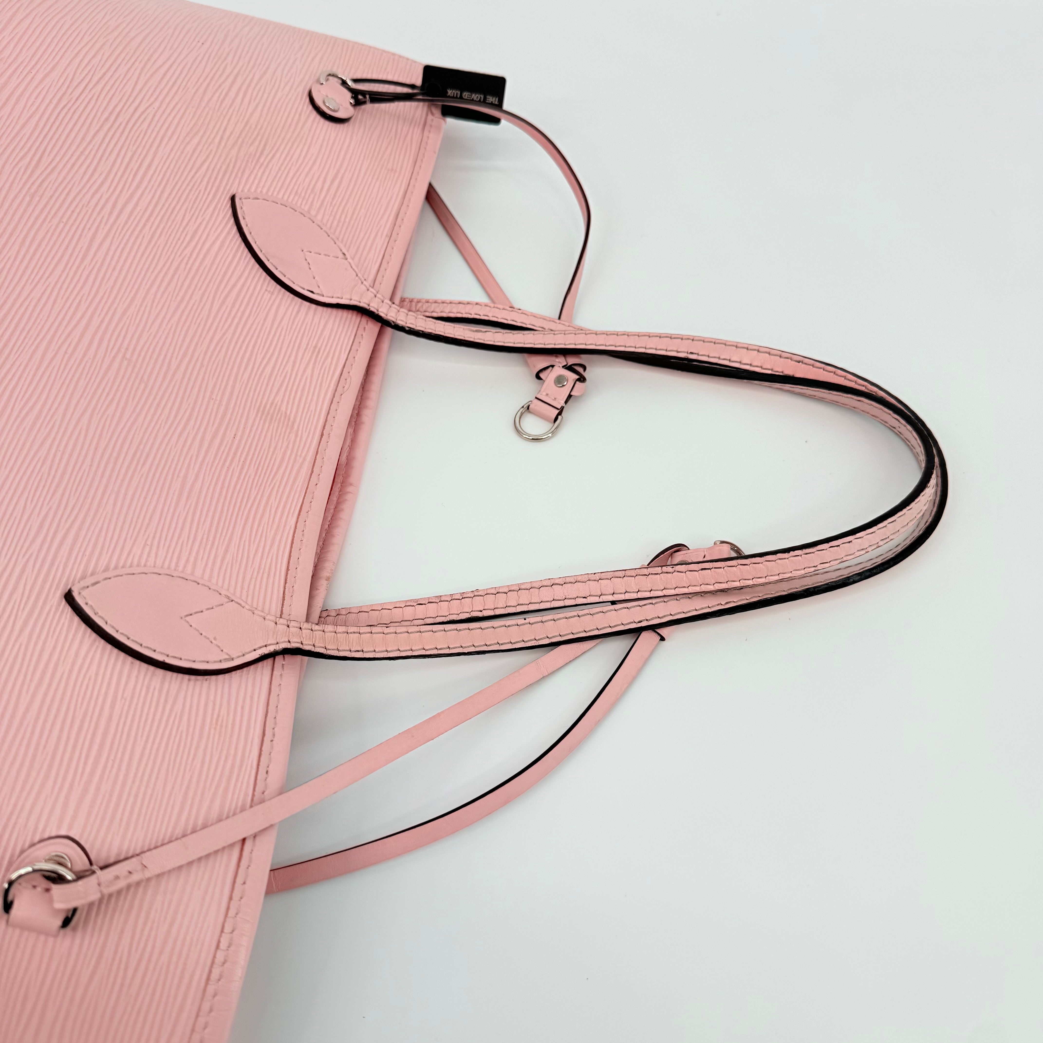 Louis Vuitton Epi Leather Neverfull MM in a soft pink shade. Crafted from durable textured Epi leather with matching pink trim and long shoulder straps. Side cinch cords allow the bag to be worn wide or tapered. Spacious open interior with a light-coloured lining and hook closure at the top. Elegant, structured and rare in this colourway – a standout everyday tote with minimal signs of wear for its style and age.