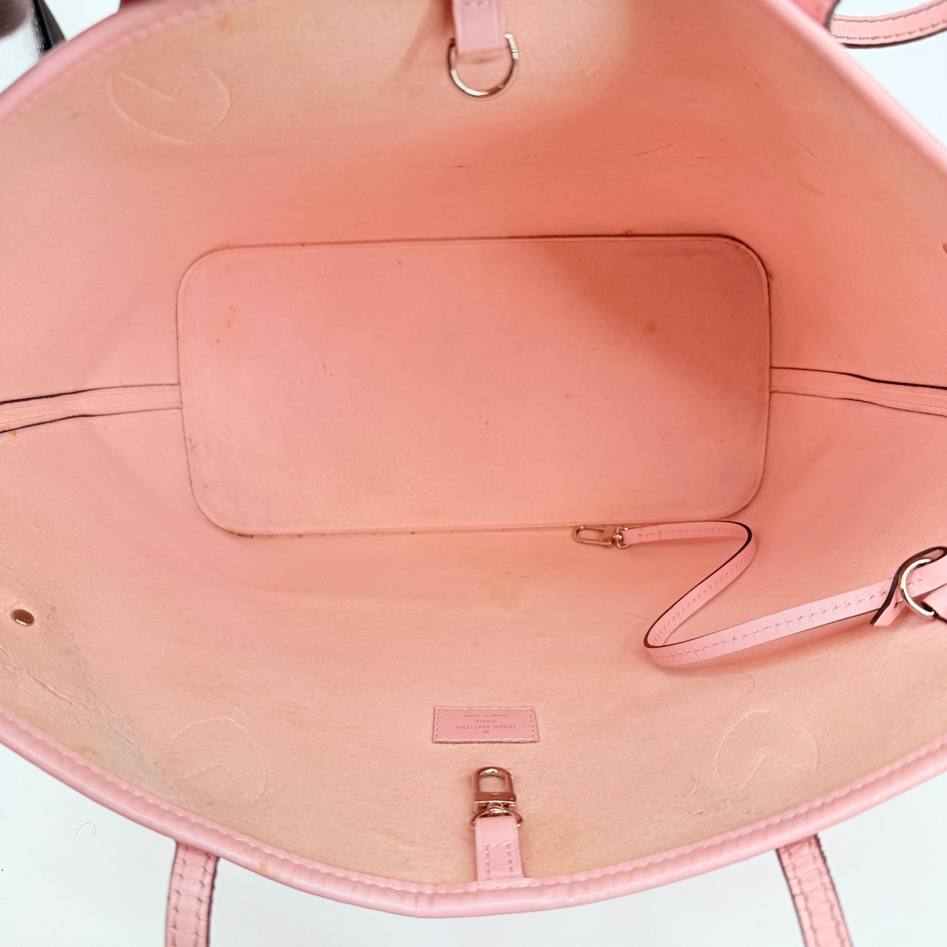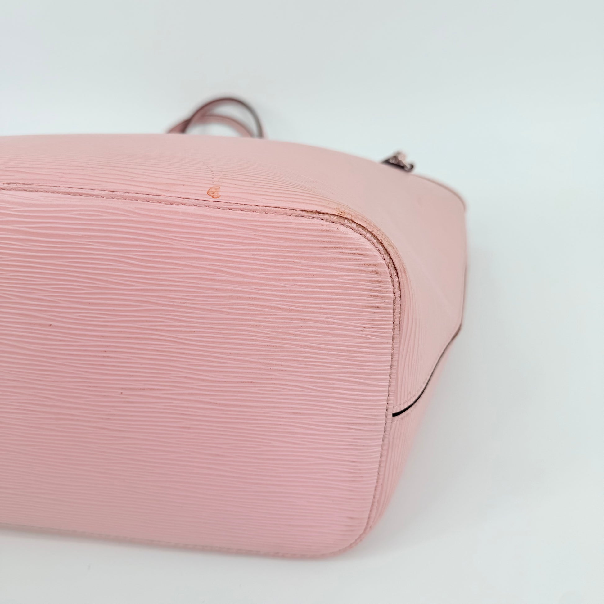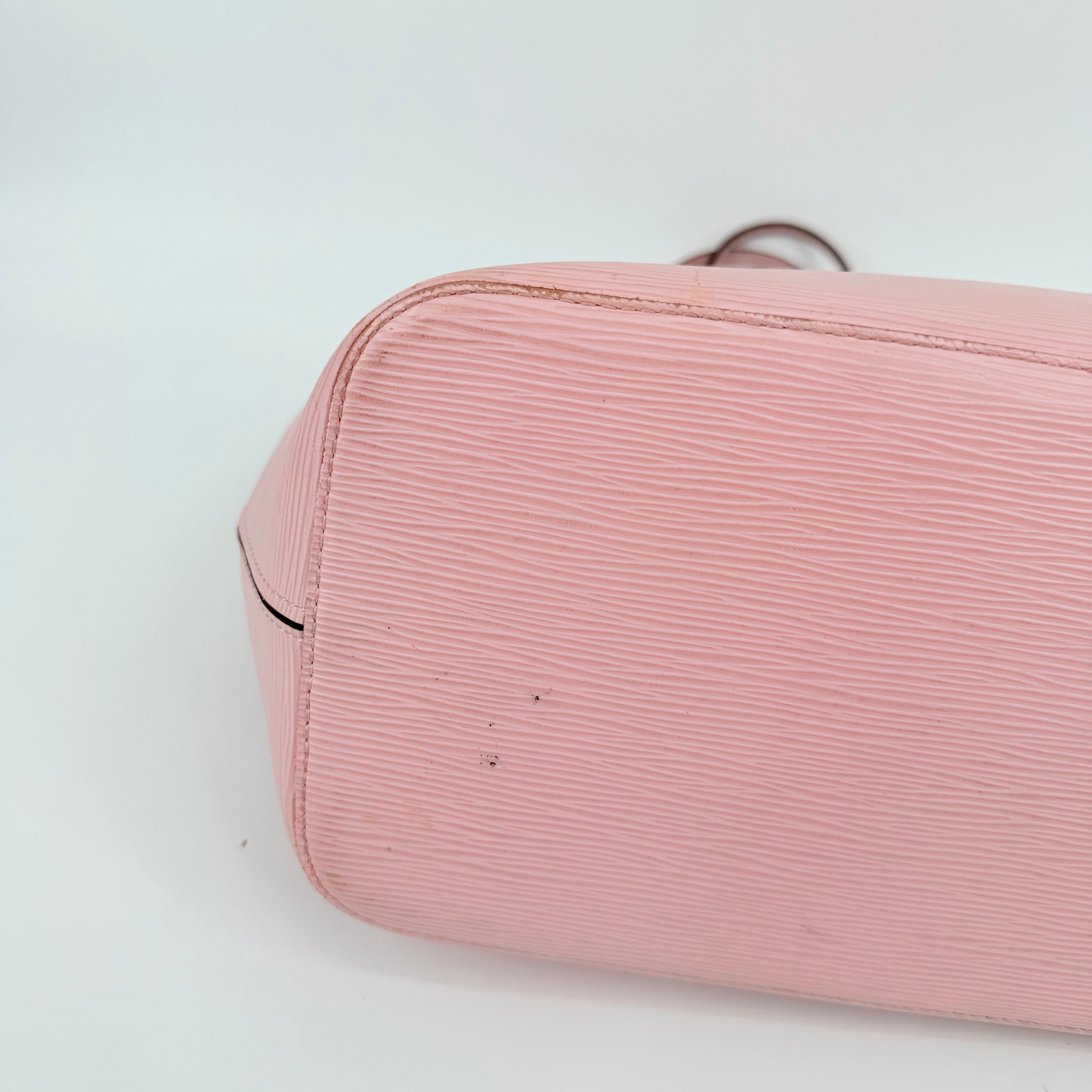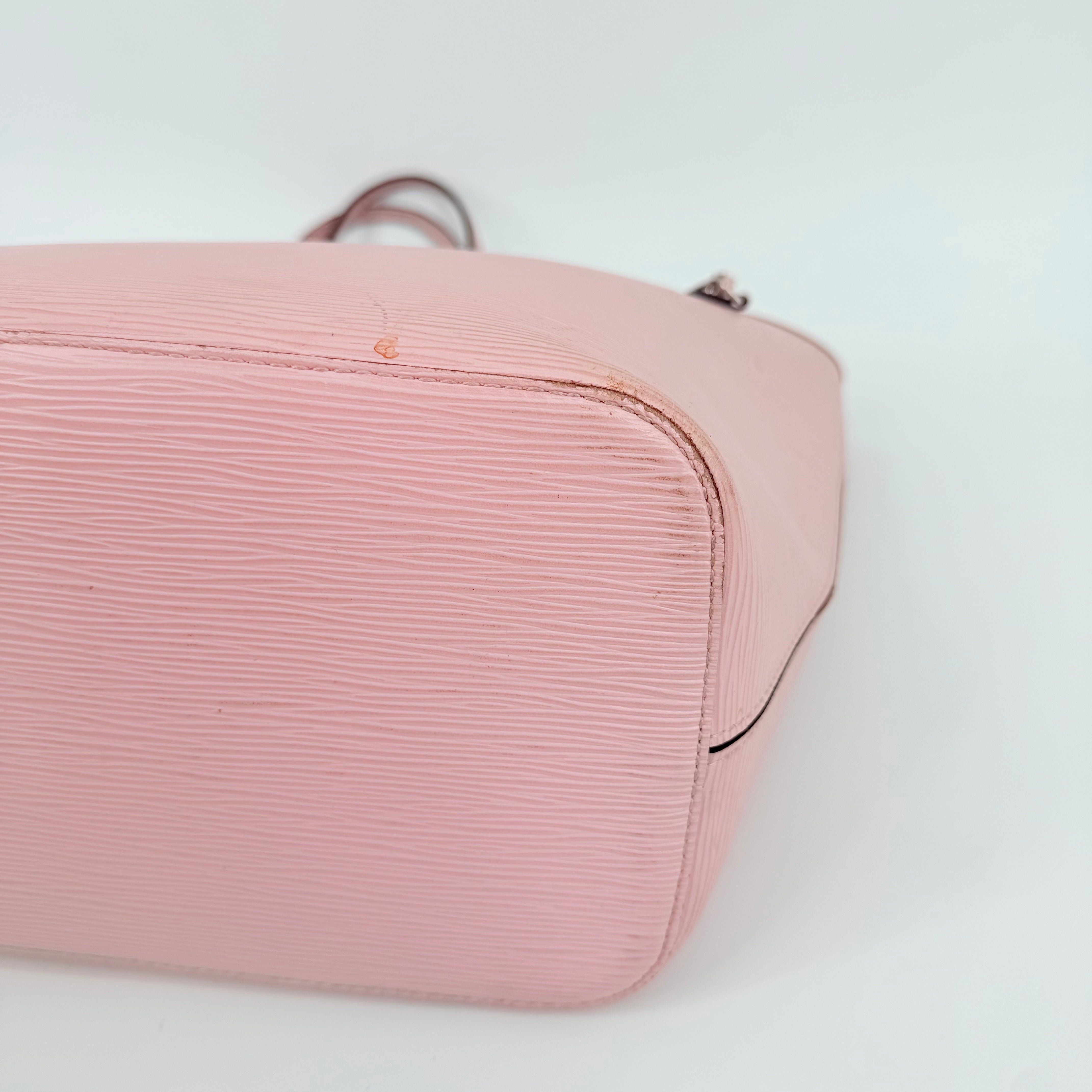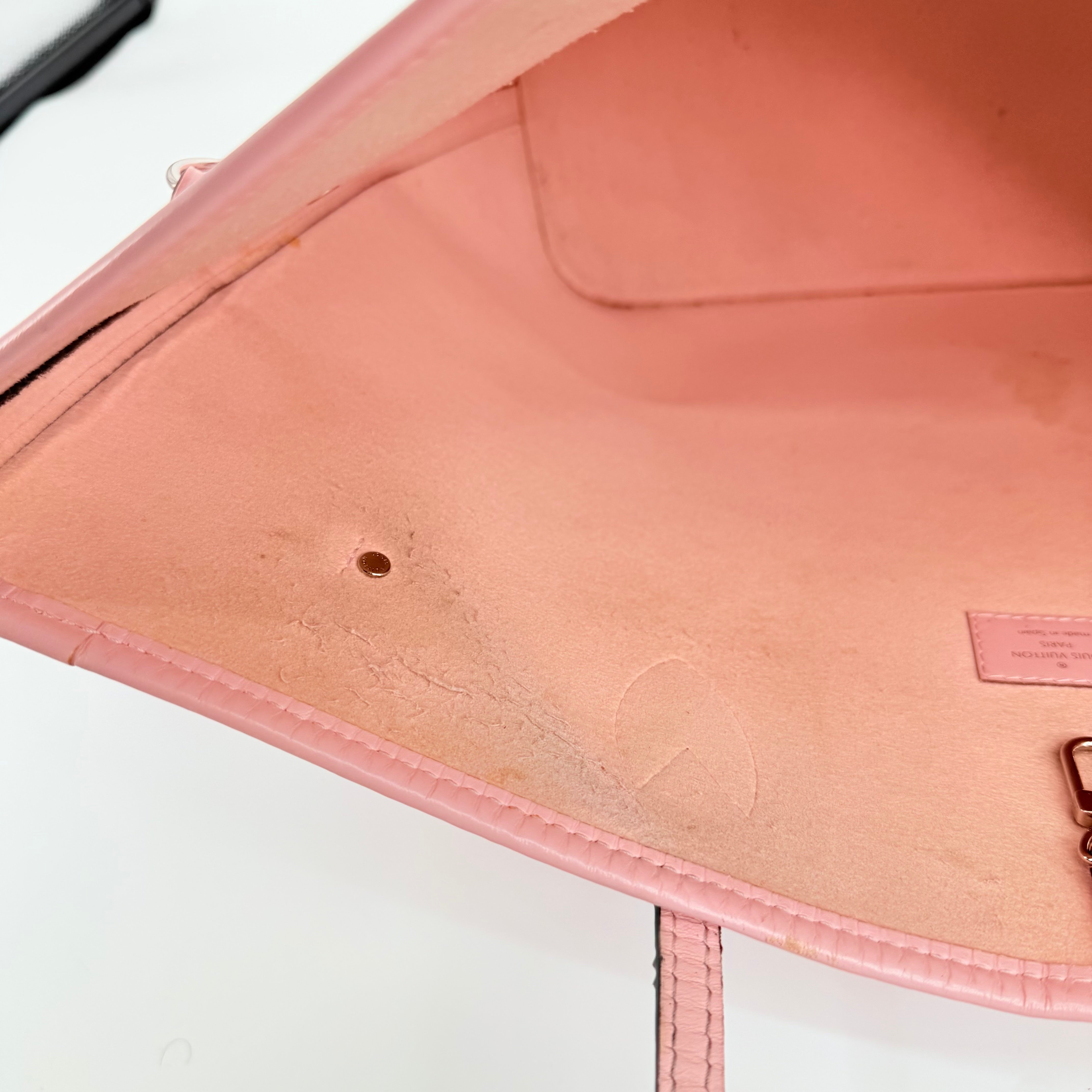 Louis Vuitton Epi Leather Neverfull MM in a soft pink shade. Crafted from durable textured Epi leather with matching pink trim and long shoulder straps. Side cinch cords allow the bag to be worn wide or tapered. Spacious open interior with a light-coloured lining and hook closure at the top. Elegant, structured and rare in this colourway – a standout everyday tote with minimal signs of wear for its style and age.