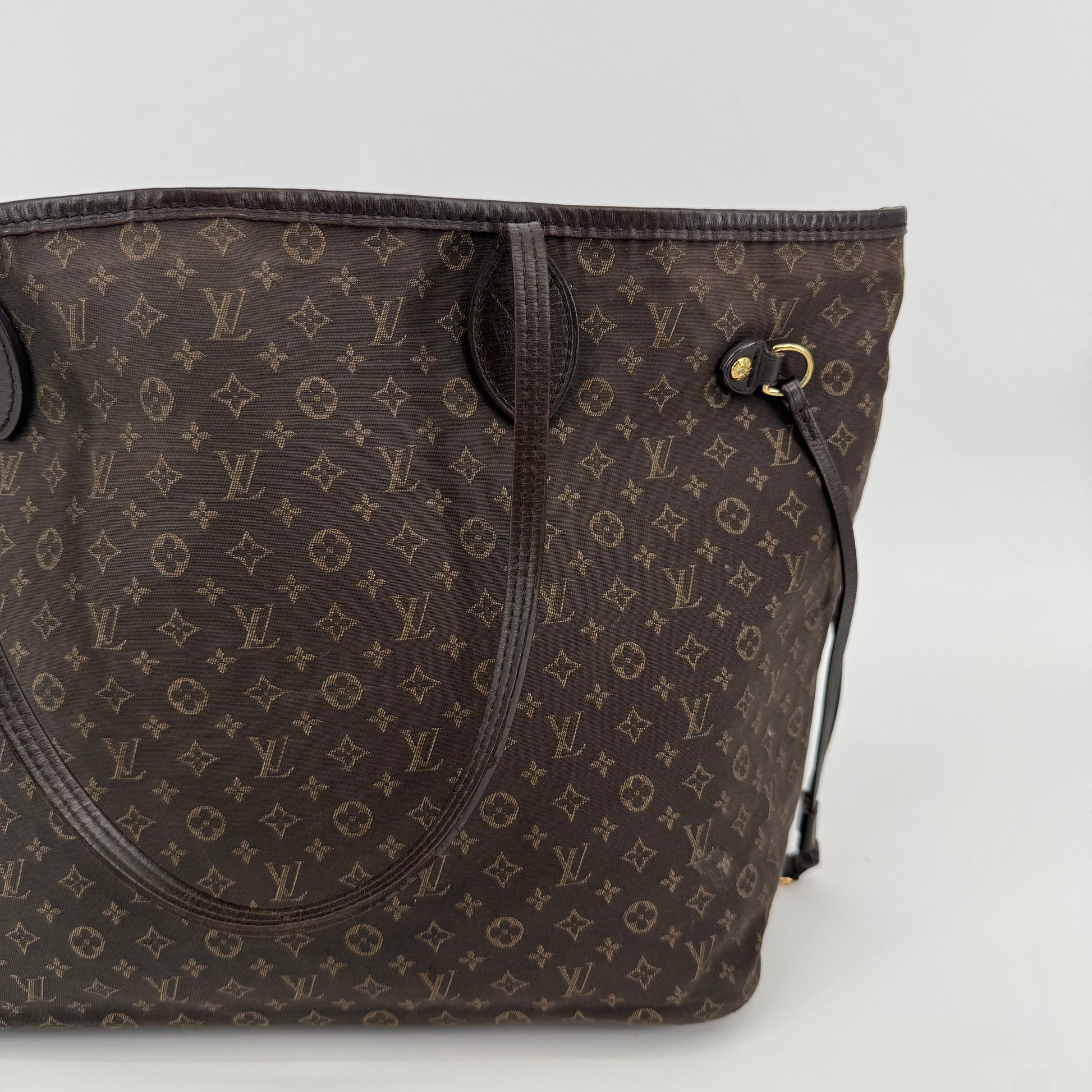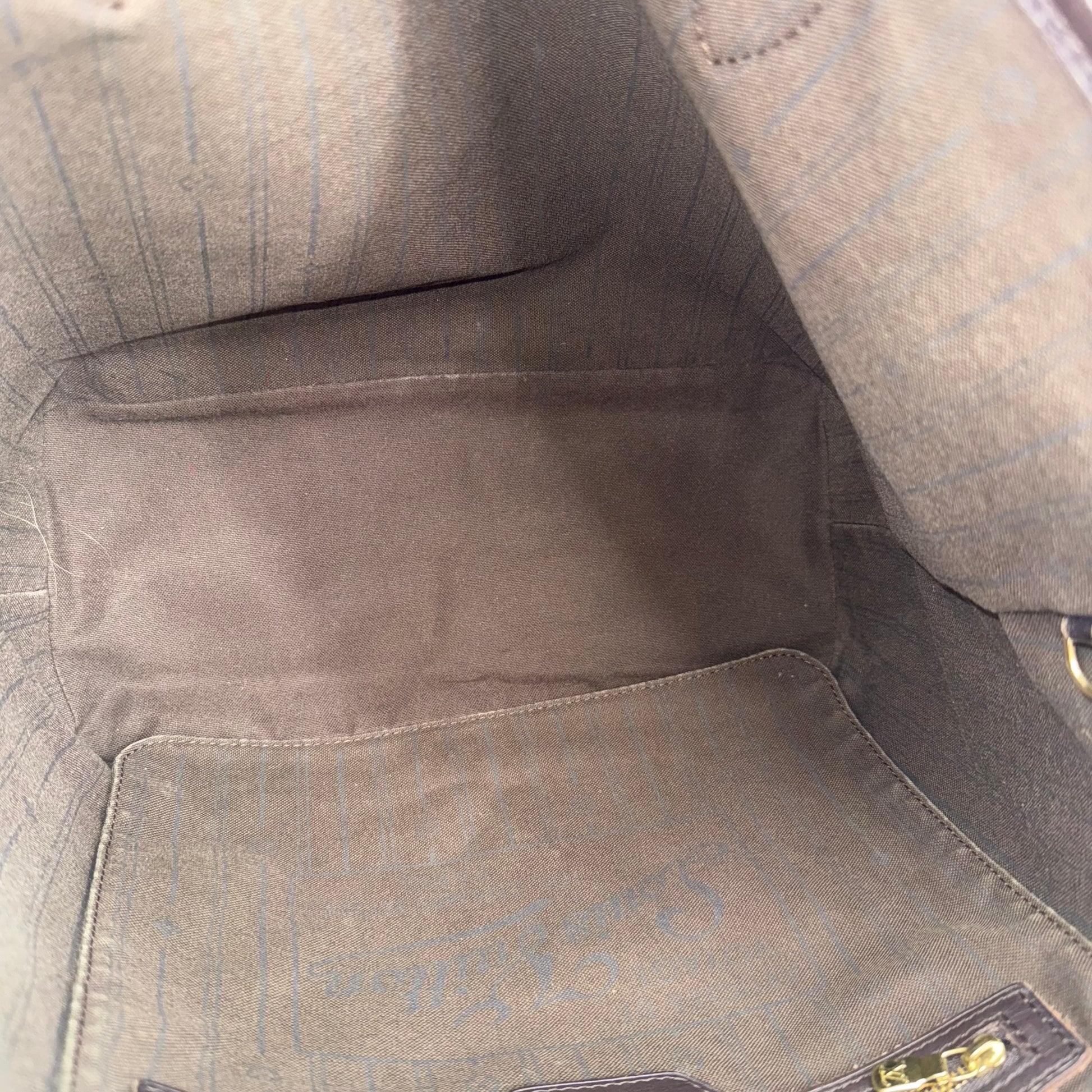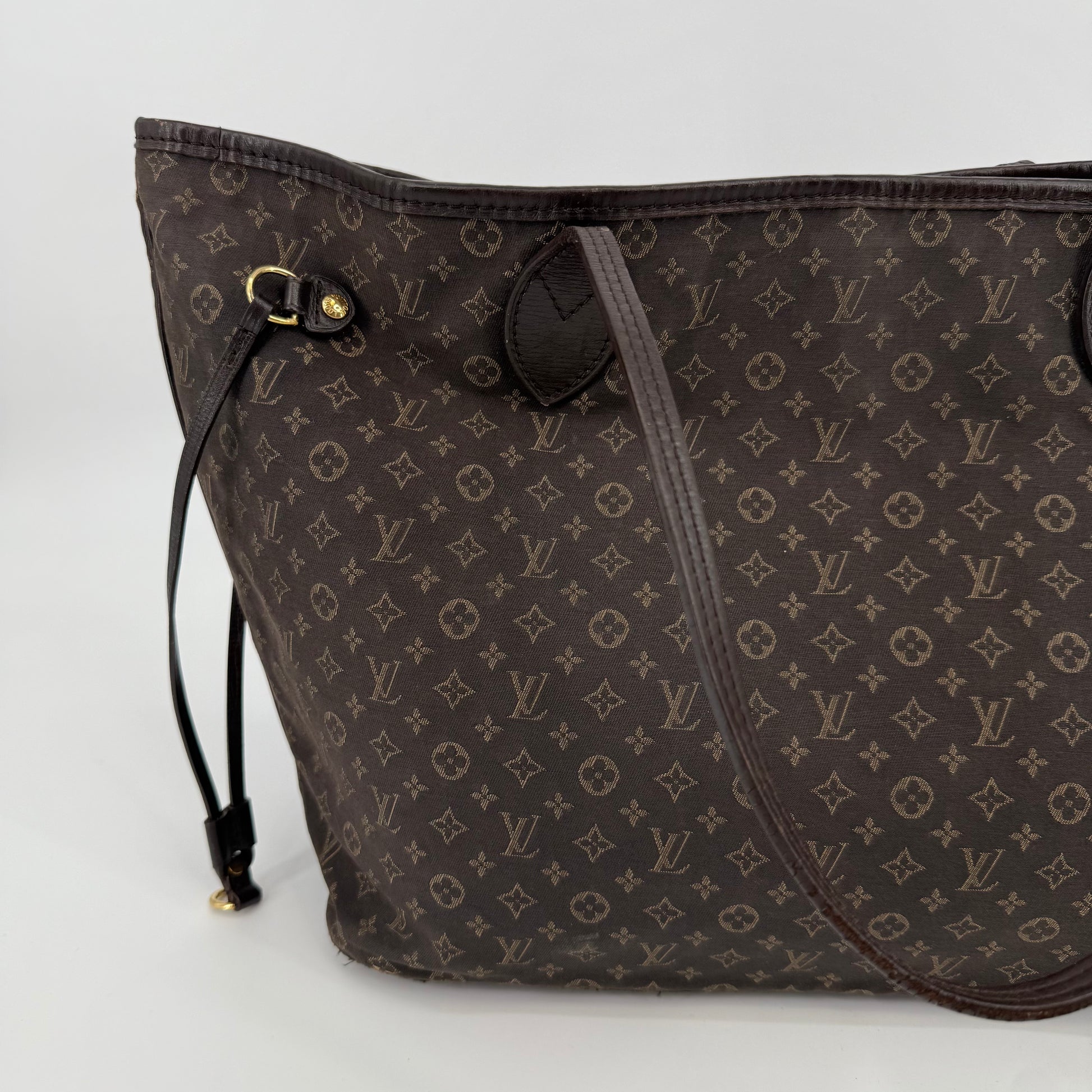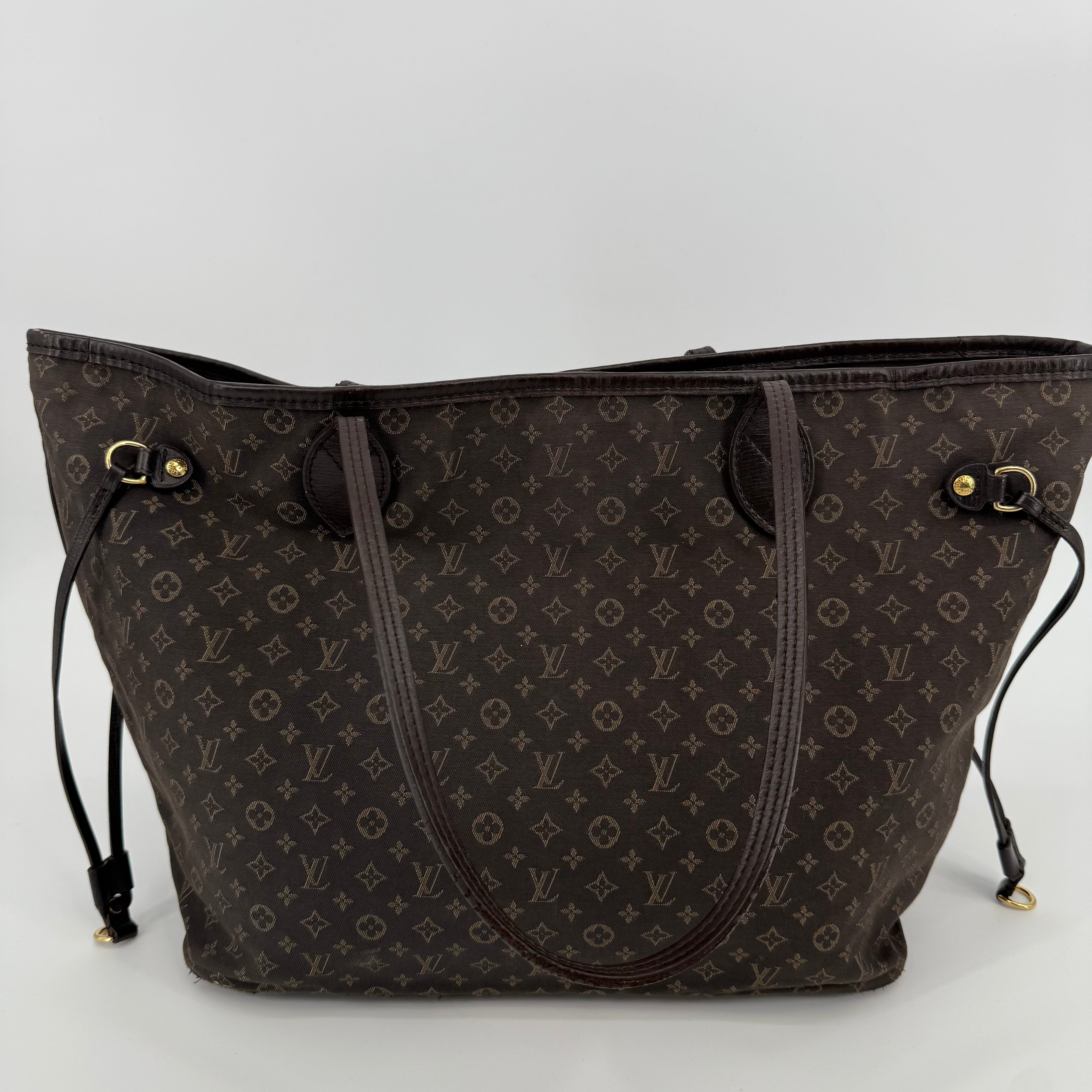 This Louis Vuitton Monogram Neverfull MM features the classic brown monogram canvas with dark brown leather trim and slim shoulder straps. The exterior shows gentle wear with a soft, relaxed shape typical of vintage Neverfulls, while still maintaining good structure. Side cinch cords and gold-tone hardware are intact. The interior is not shown in this specific image, so condition may need separate detailing if required. A timeless everyday tote in the highly sought-after MM size.