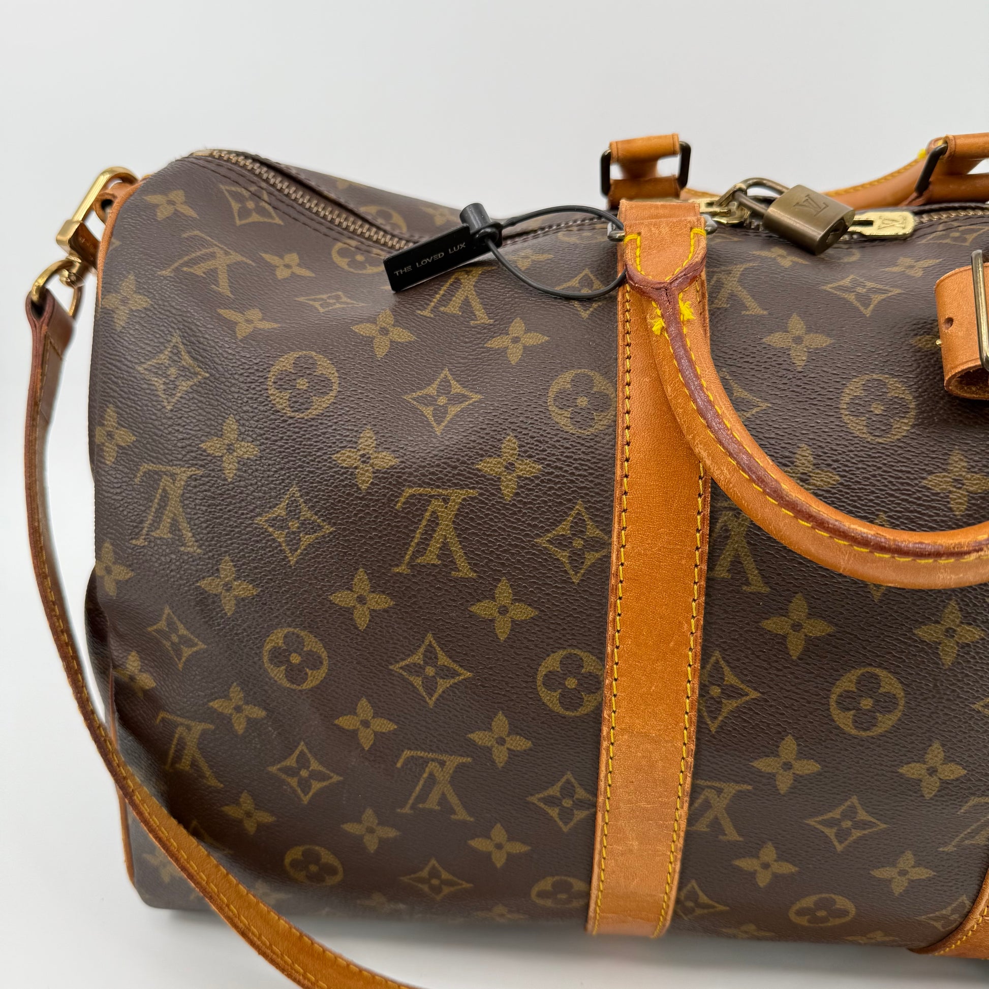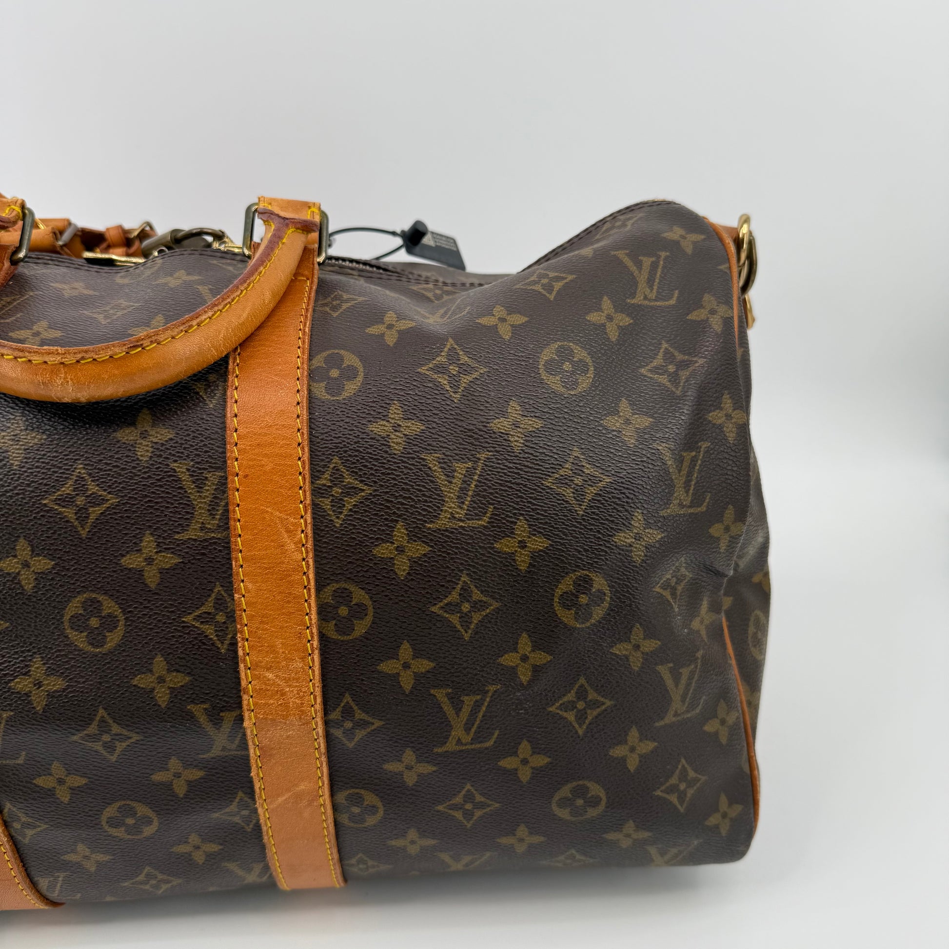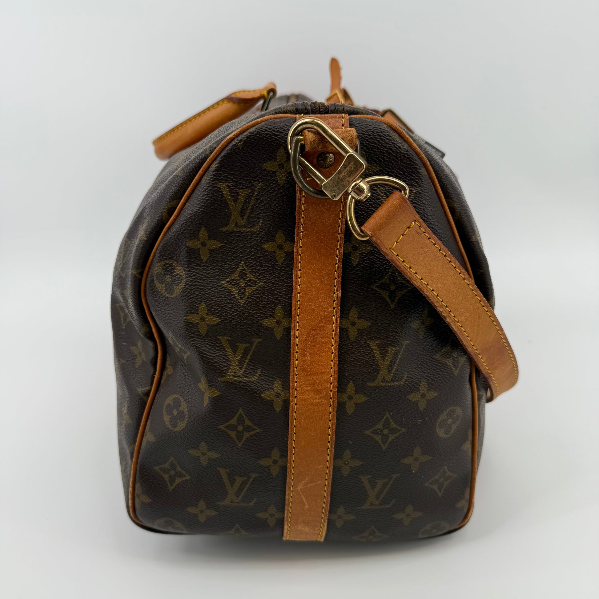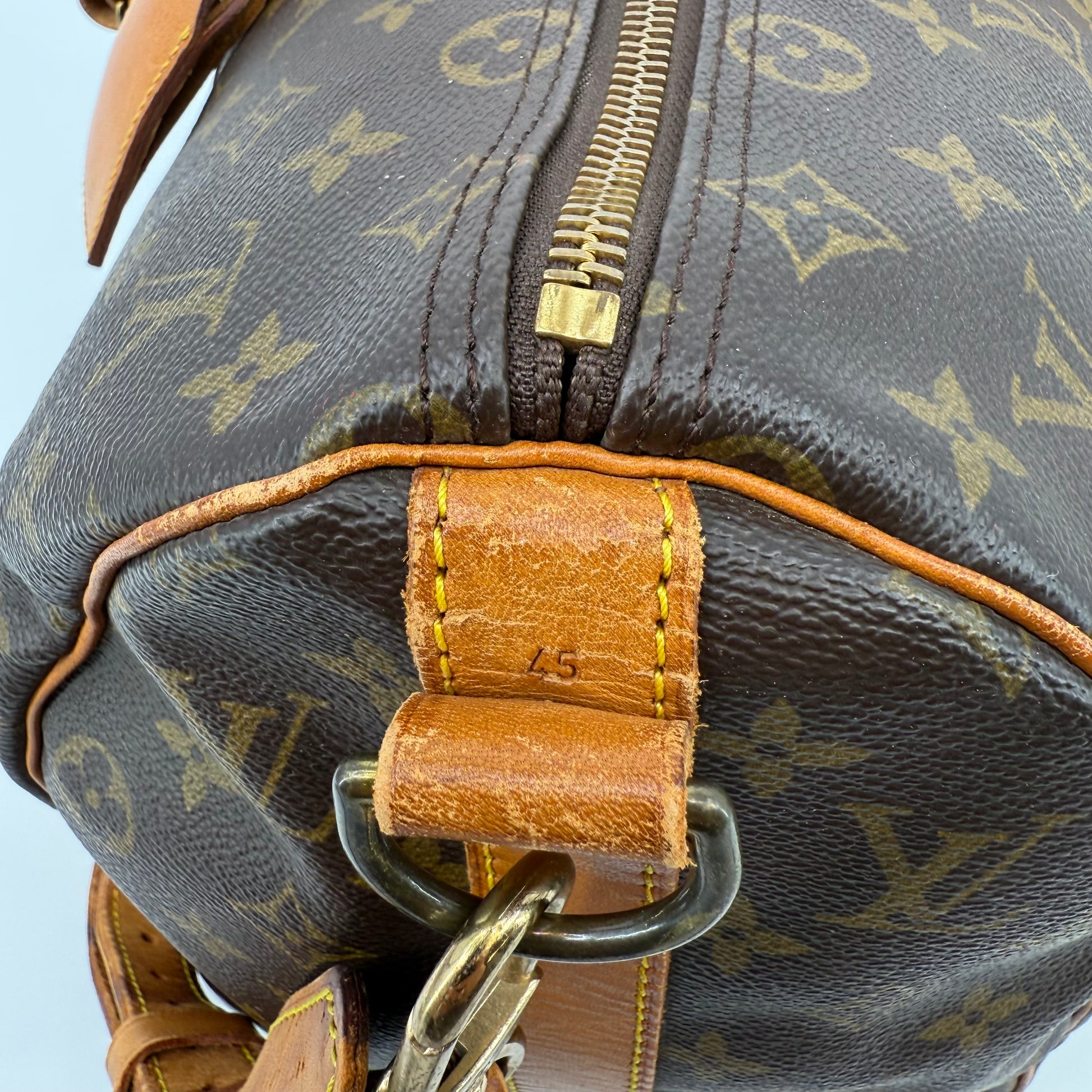 The Louis Vuitton Keepall Bandoulière 45 is the quintessential travel bag, representing effortless luxury and timeless craftsmanship. Made from the signature Monogram coated canvas with natural cowhide leather trim, it features gold-tone hardware, dual rolled leather handles, a removable and adjustable shoulder strap, and the iconic padlock and luggage tag. The 45 size is perfect for weekend getaways or as a carry-on for air travel — spacious yet easy to carry.