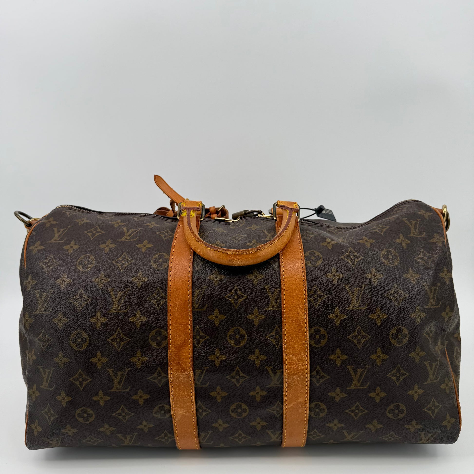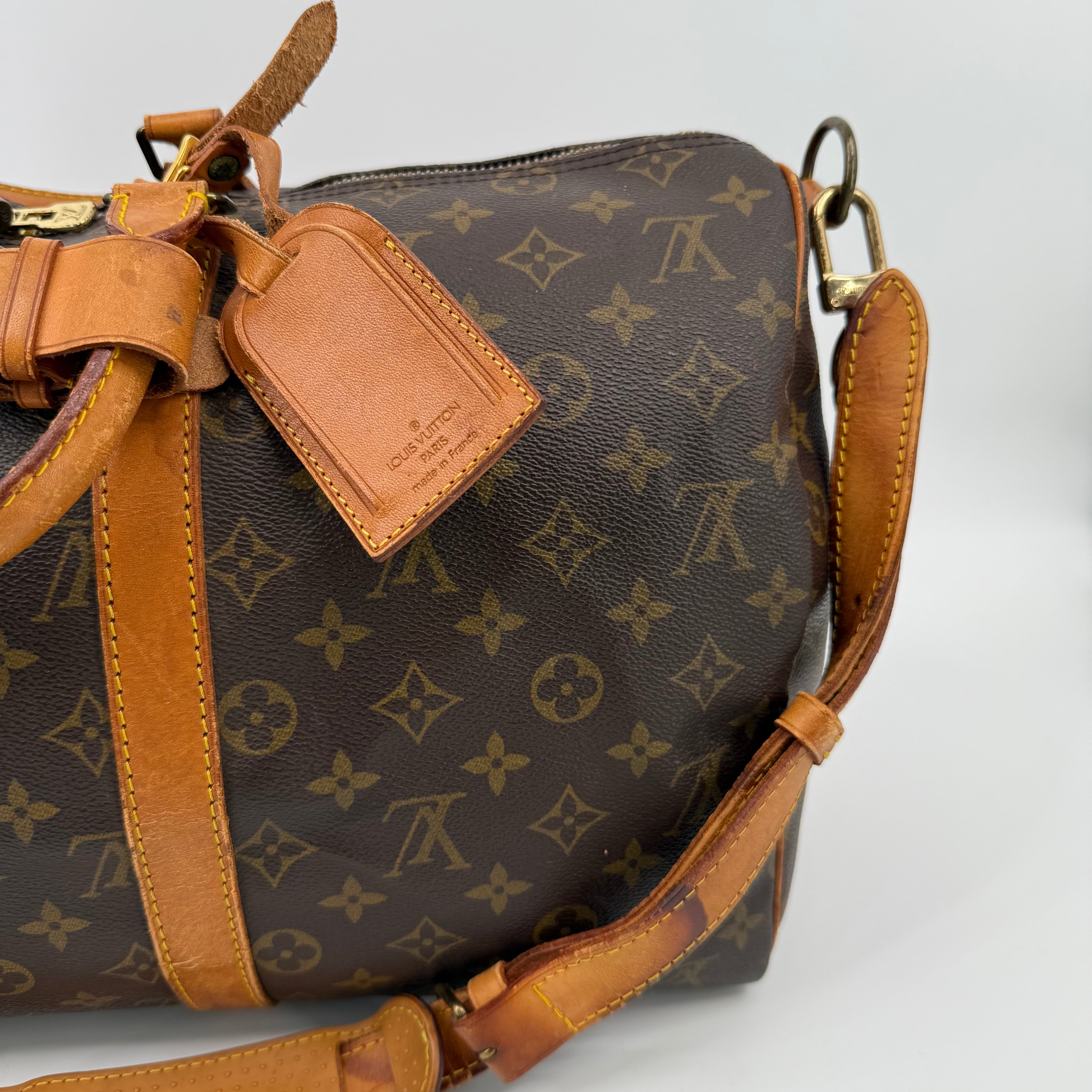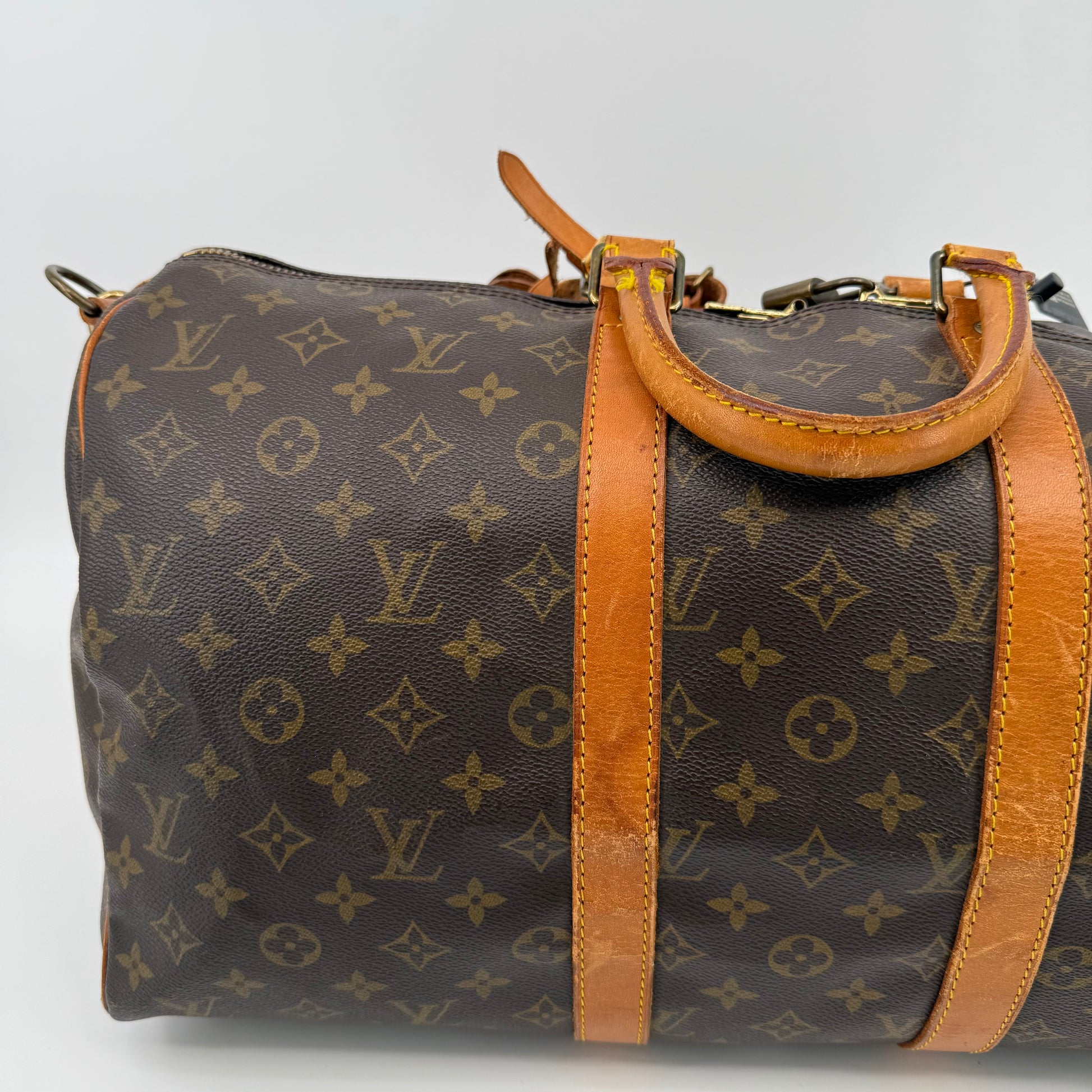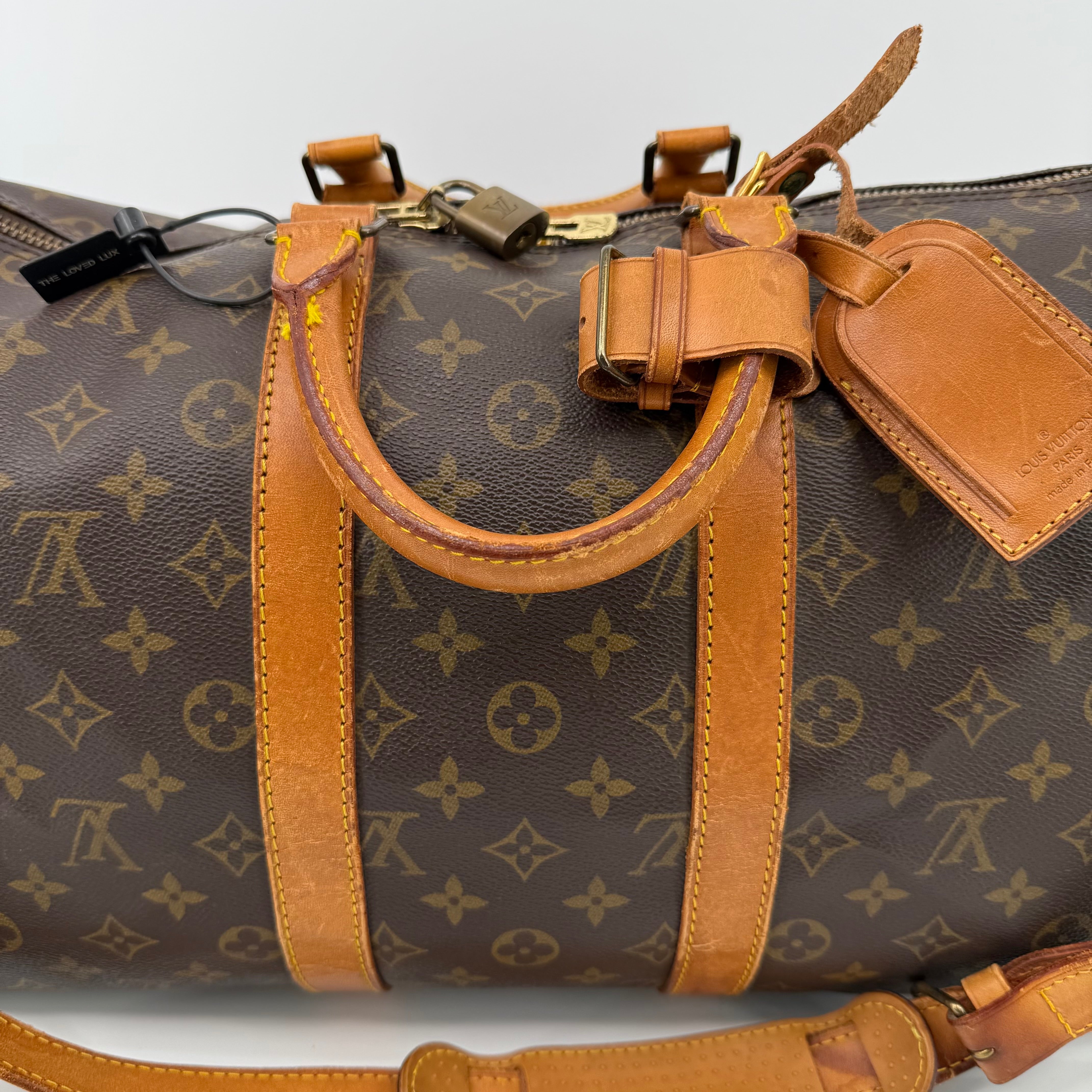 The Louis Vuitton Keepall Bandoulière 45 is the quintessential travel bag, representing effortless luxury and timeless craftsmanship. Made from the signature Monogram coated canvas with natural cowhide leather trim, it features gold-tone hardware, dual rolled leather handles, a removable and adjustable shoulder strap, and the iconic padlock and luggage tag. The 45 size is perfect for weekend getaways or as a carry-on for air travel — spacious yet easy to carry.