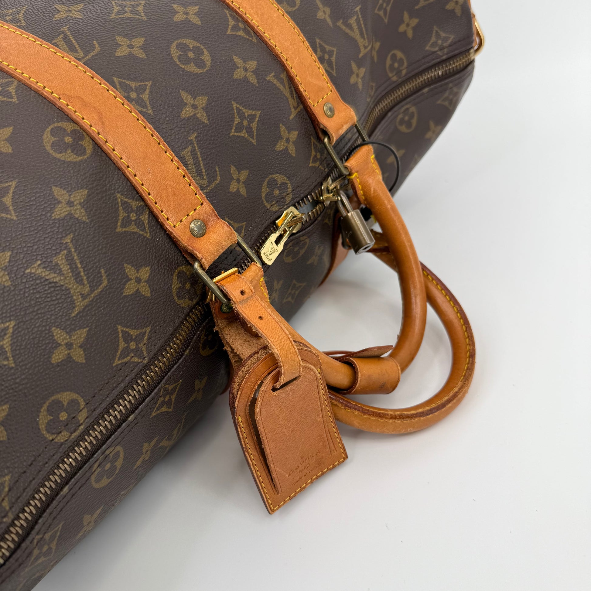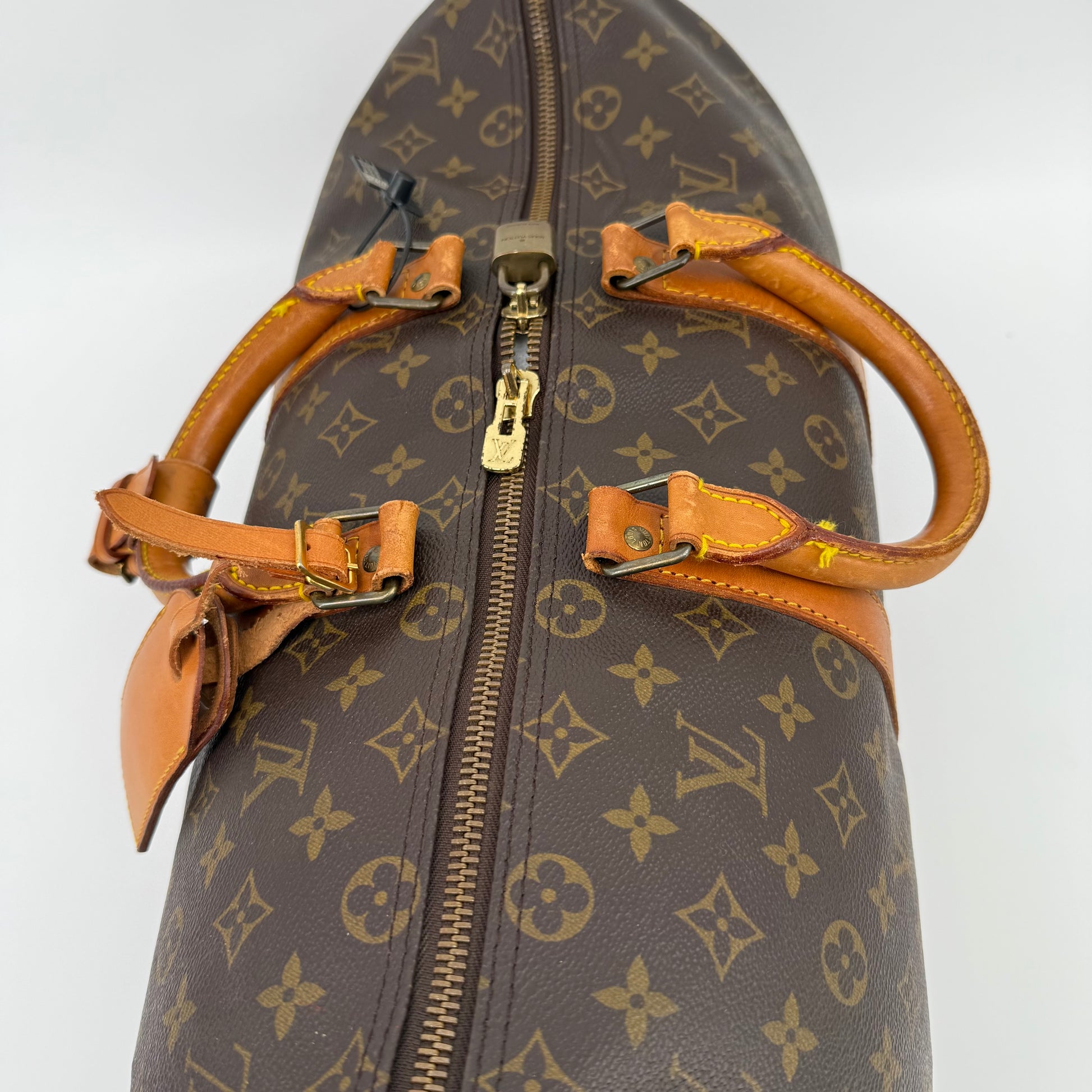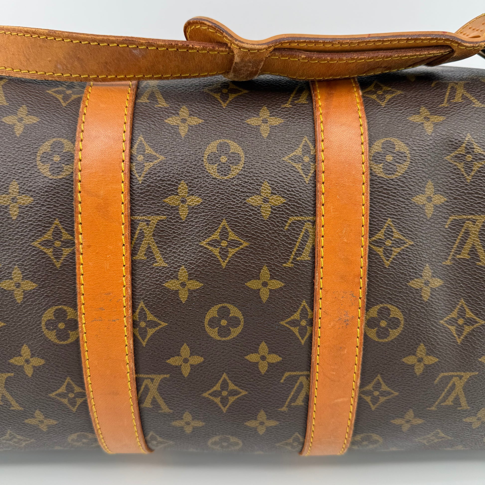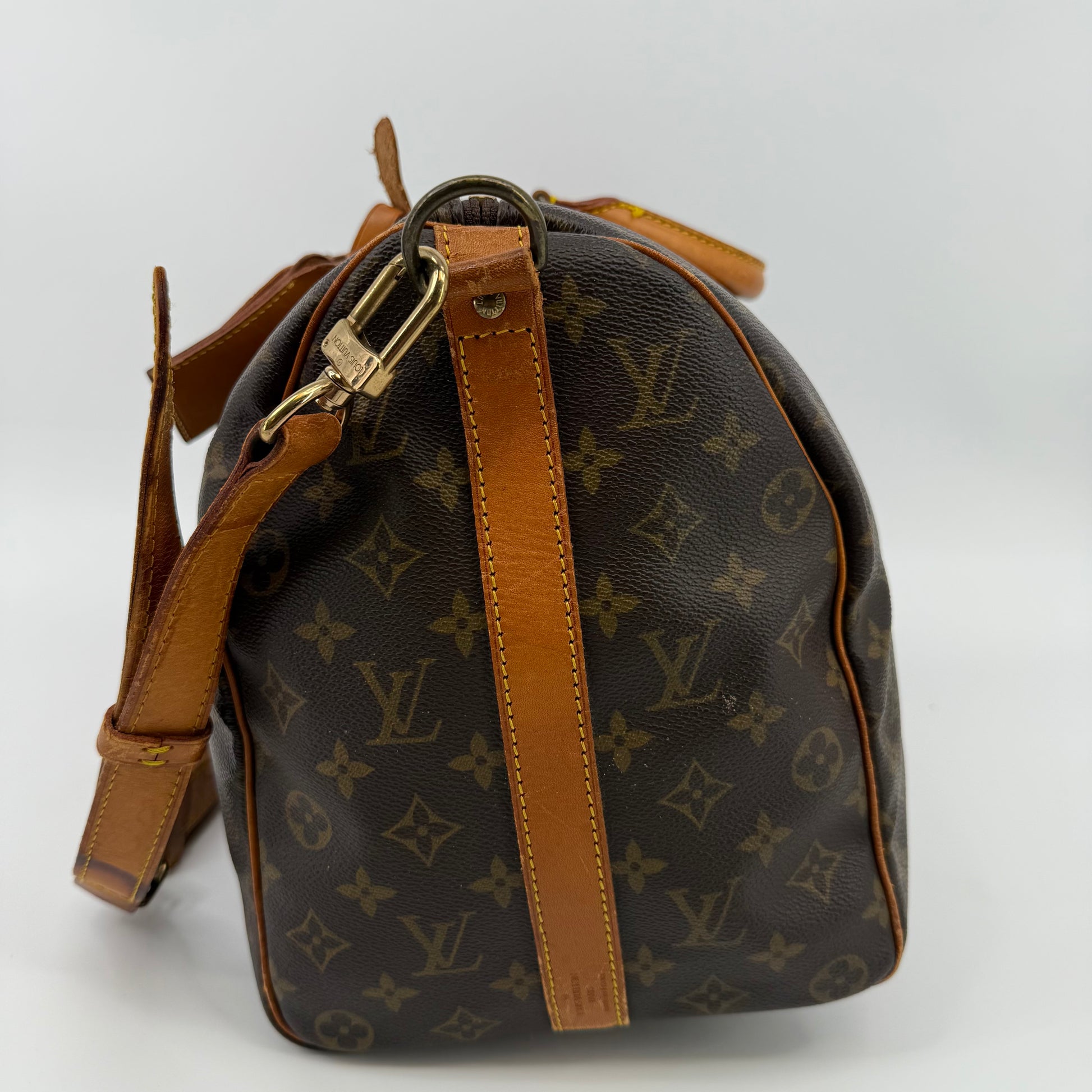 The Louis Vuitton Keepall Bandoulière 45 is the quintessential travel bag, representing effortless luxury and timeless craftsmanship. Made from the signature Monogram coated canvas with natural cowhide leather trim, it features gold-tone hardware, dual rolled leather handles, a removable and adjustable shoulder strap, and the iconic padlock and luggage tag. The 45 size is perfect for weekend getaways or as a carry-on for air travel — spacious yet easy to carry.