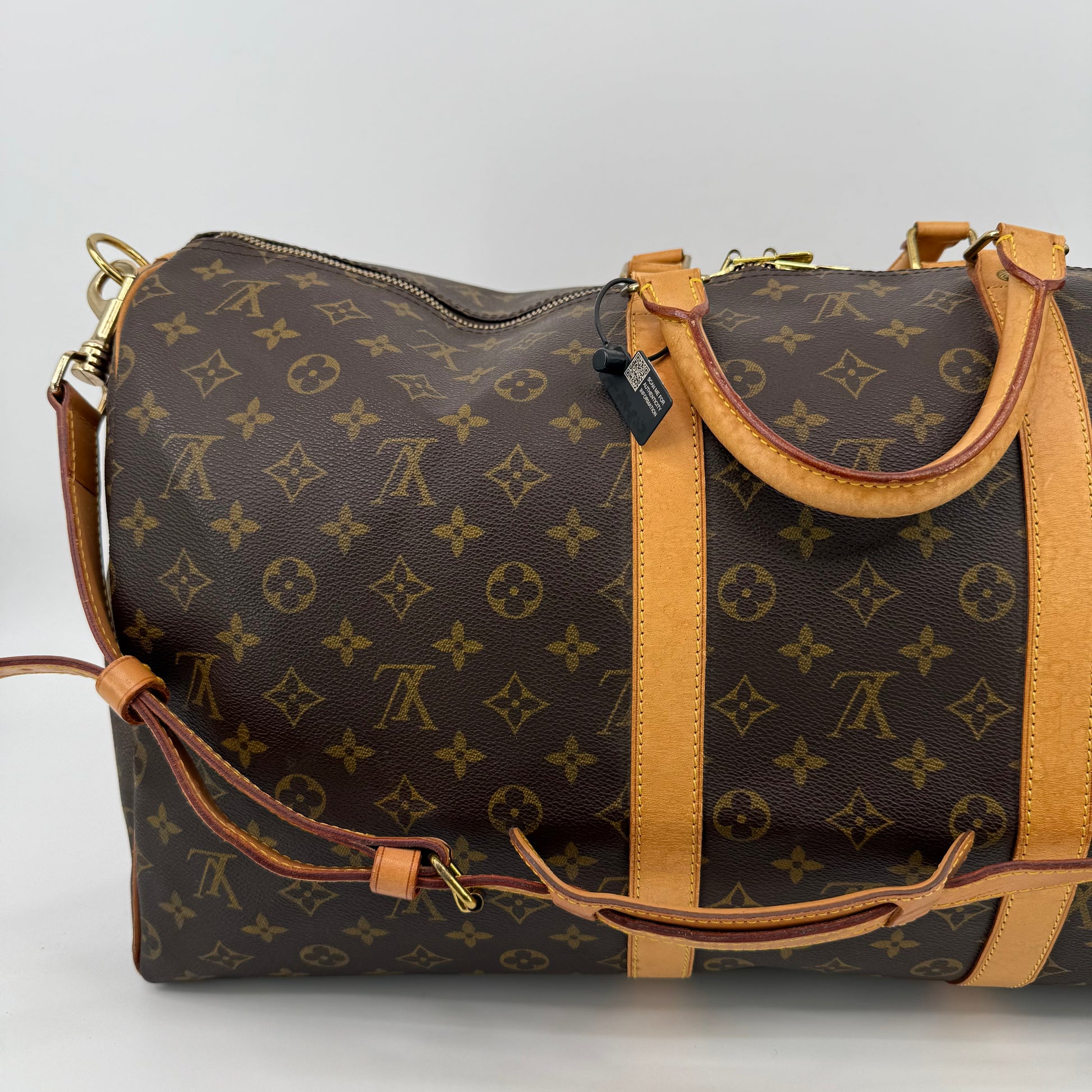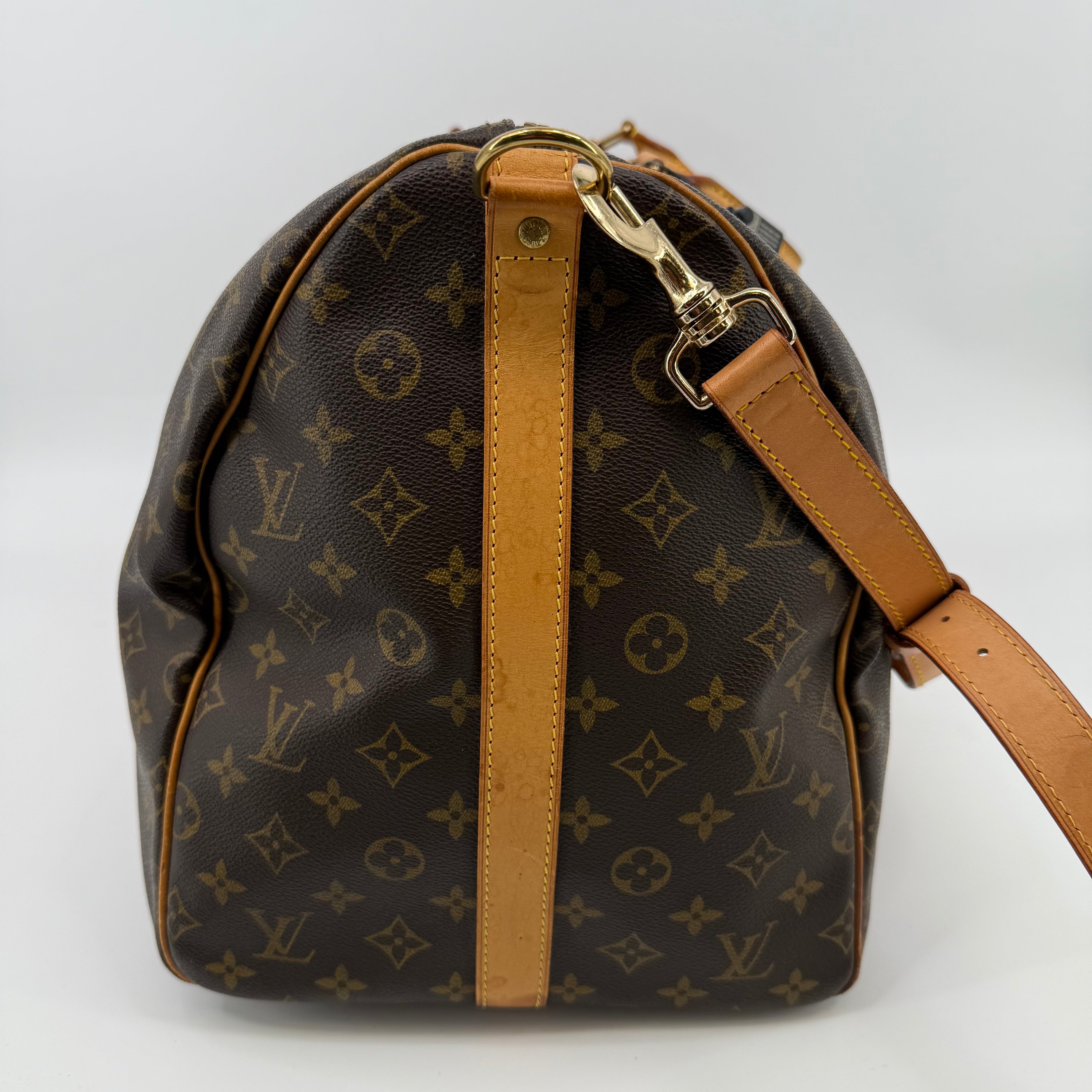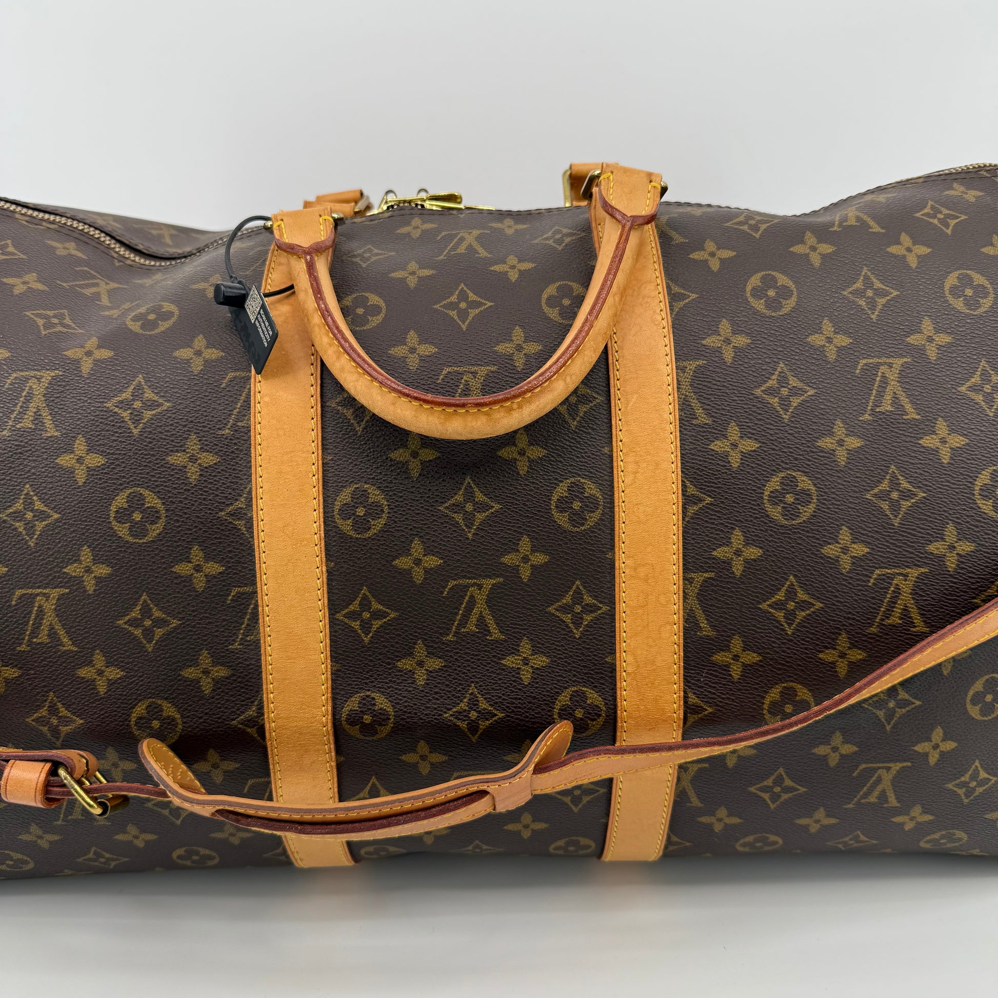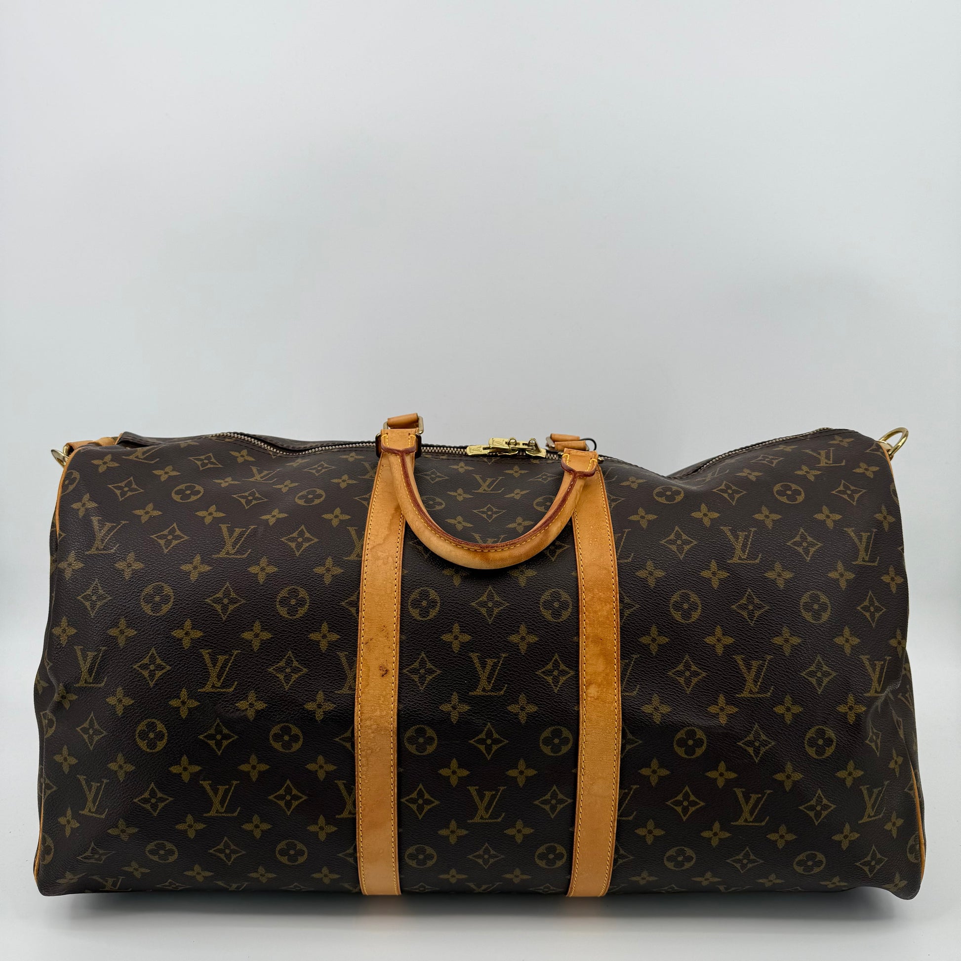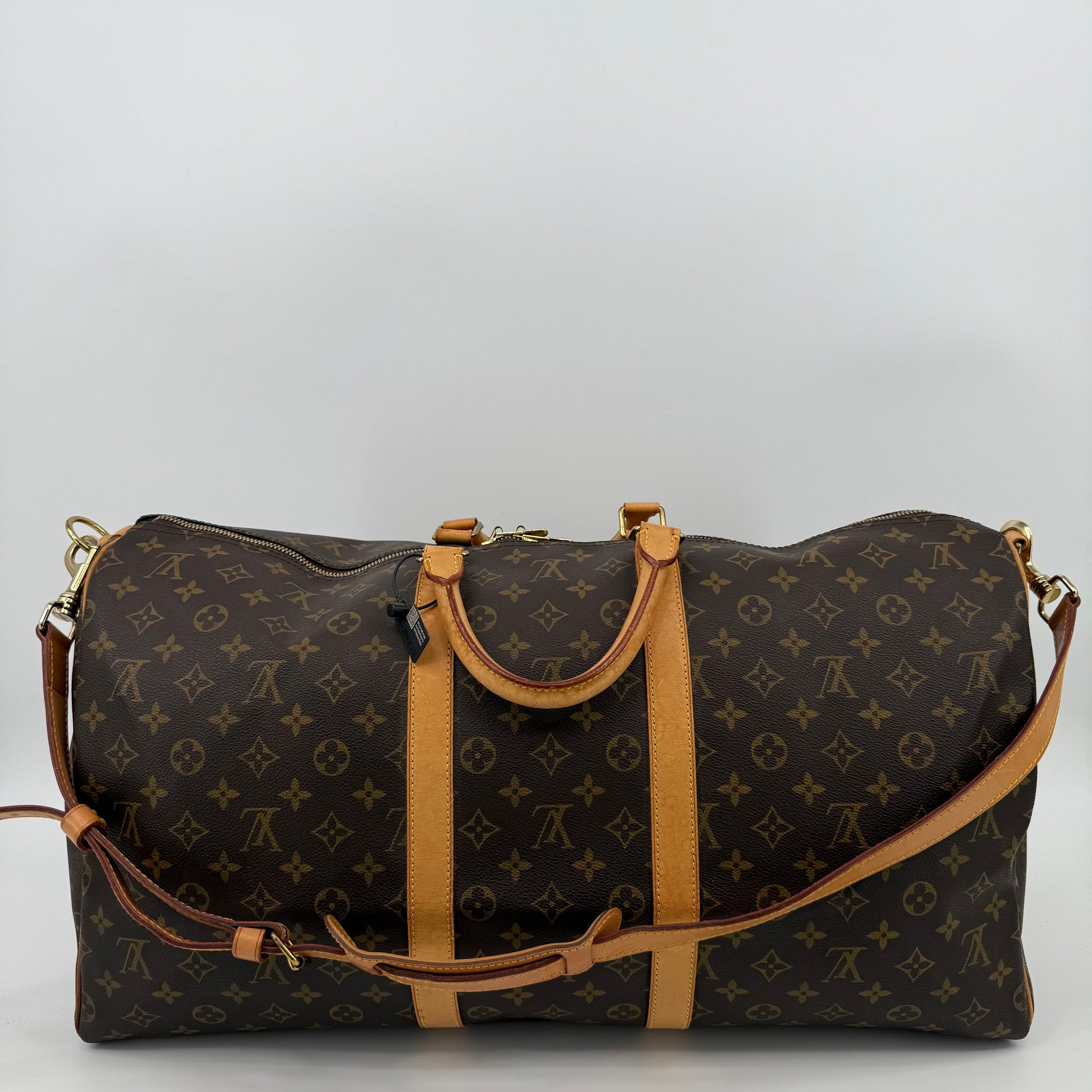 The Louis Vuitton Keepall Bandoulière 55 is the epitome of classic travel style — elegant, spacious, and unmistakably iconic. Crafted from Monogram coated canvas with natural cowhide leather trim and gold-tone hardware, this timeless duffle features double top handles, an adjustable and removable shoulder strap, and the signature padlock and leather name tag. Its generous size fits perfectly in overhead compartments, making it the ideal carry-on for luxury getaways.