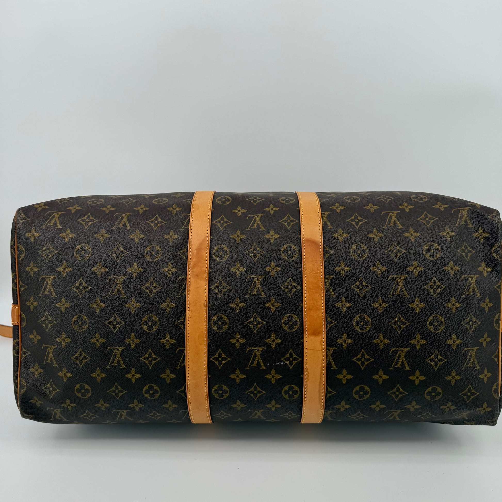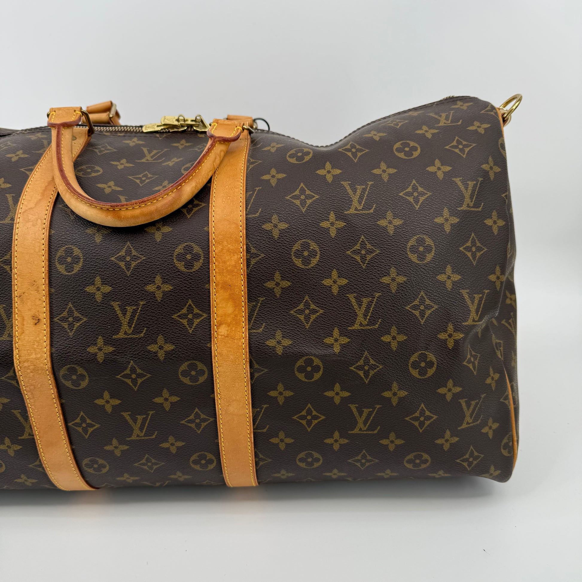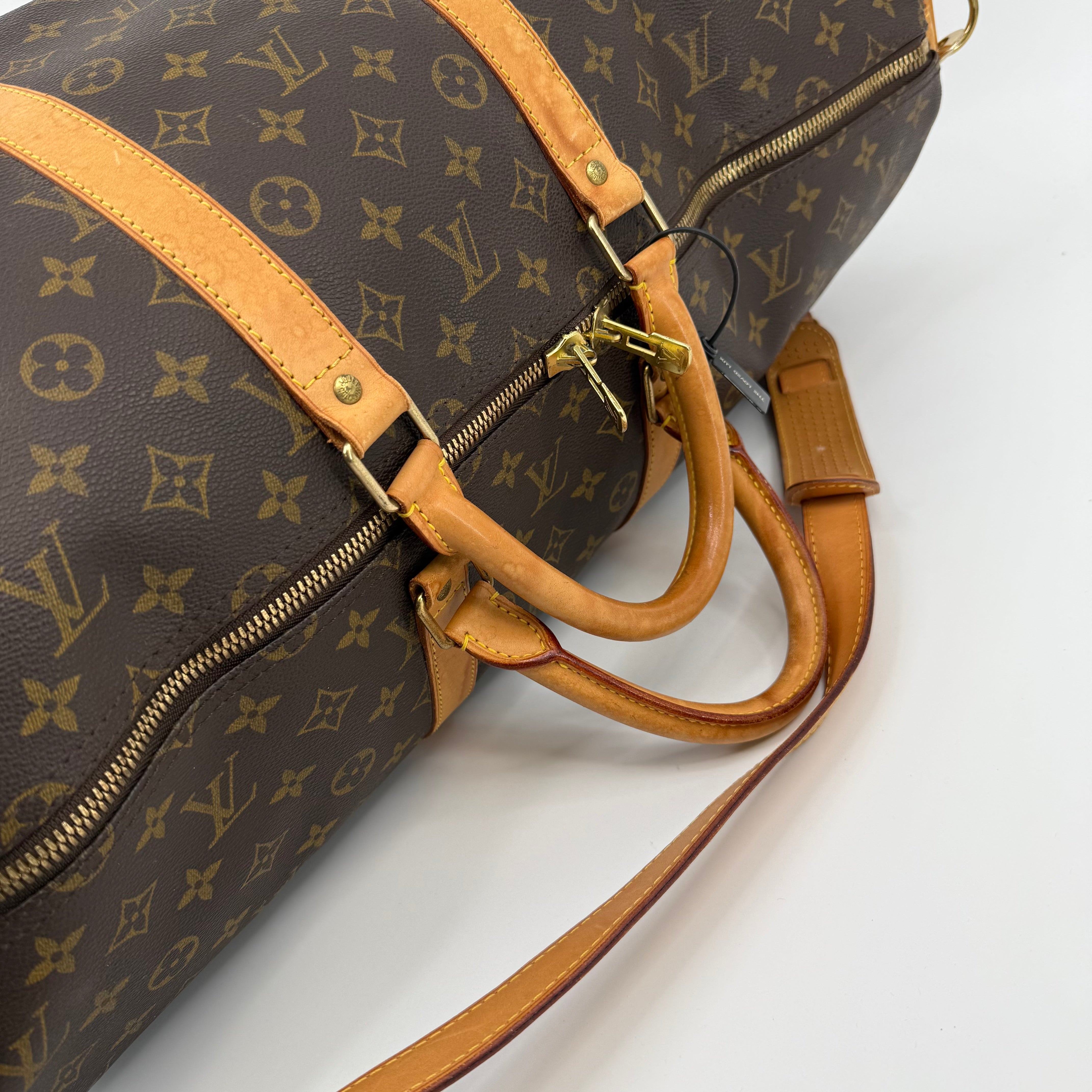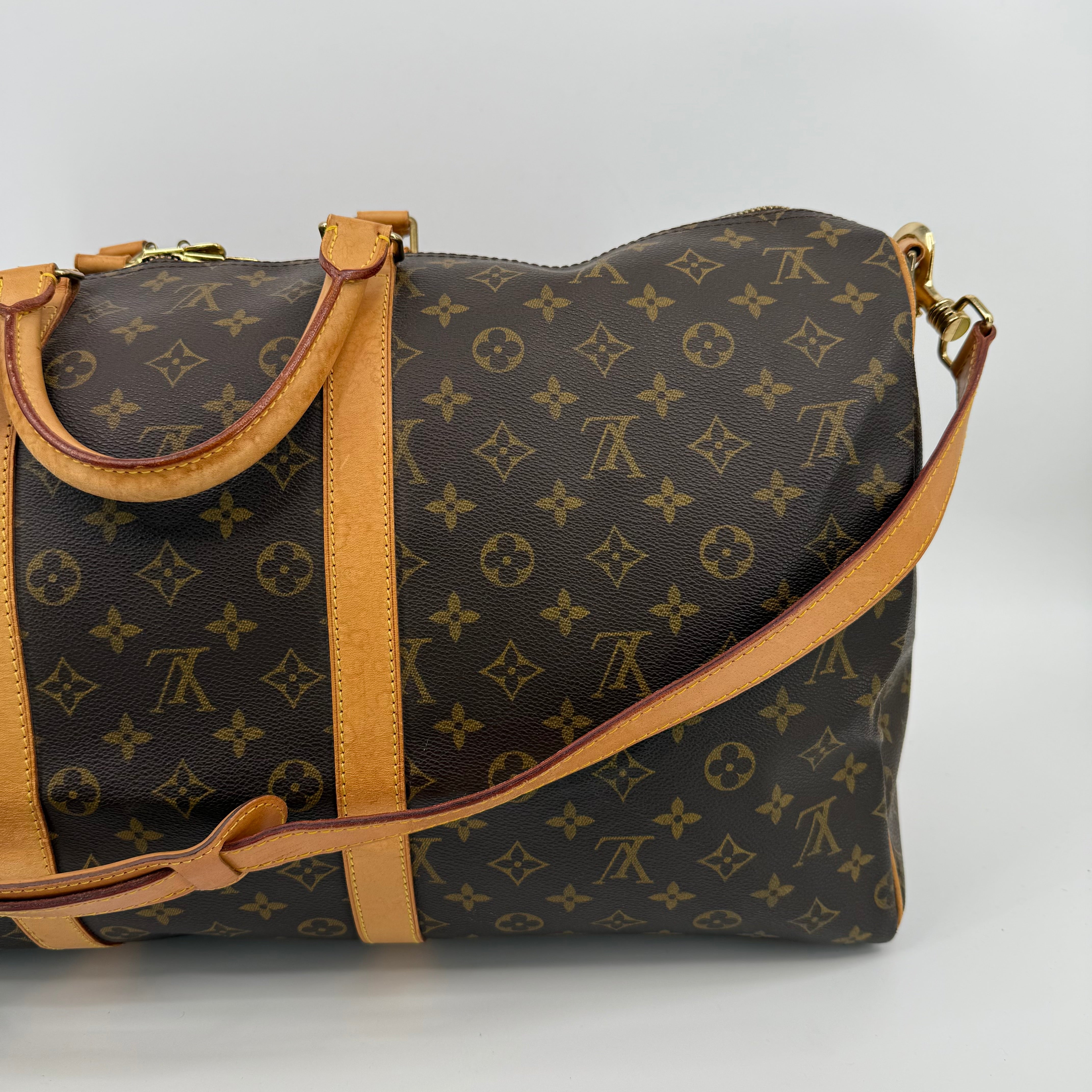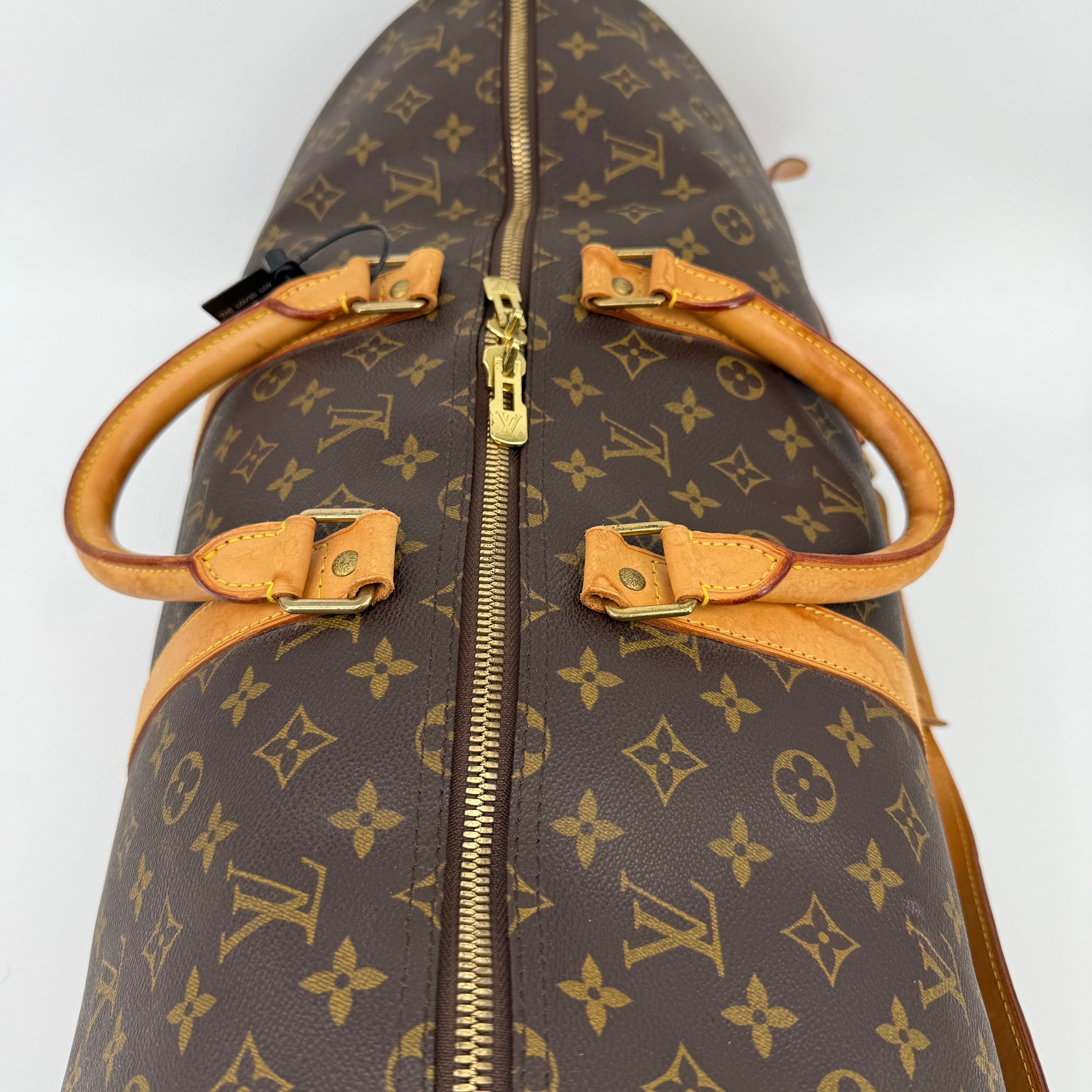 The Louis Vuitton Keepall Bandoulière 55 is the epitome of classic travel style — elegant, spacious, and unmistakably iconic. Crafted from Monogram coated canvas with natural cowhide leather trim and gold-tone hardware, this timeless duffle features double top handles, an adjustable and removable shoulder strap, and the signature padlock and leather name tag. Its generous size fits perfectly in overhead compartments, making it the ideal carry-on for luxury getaways.