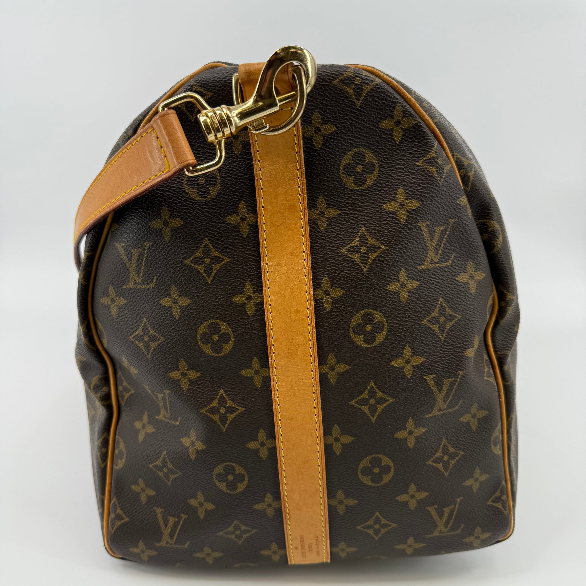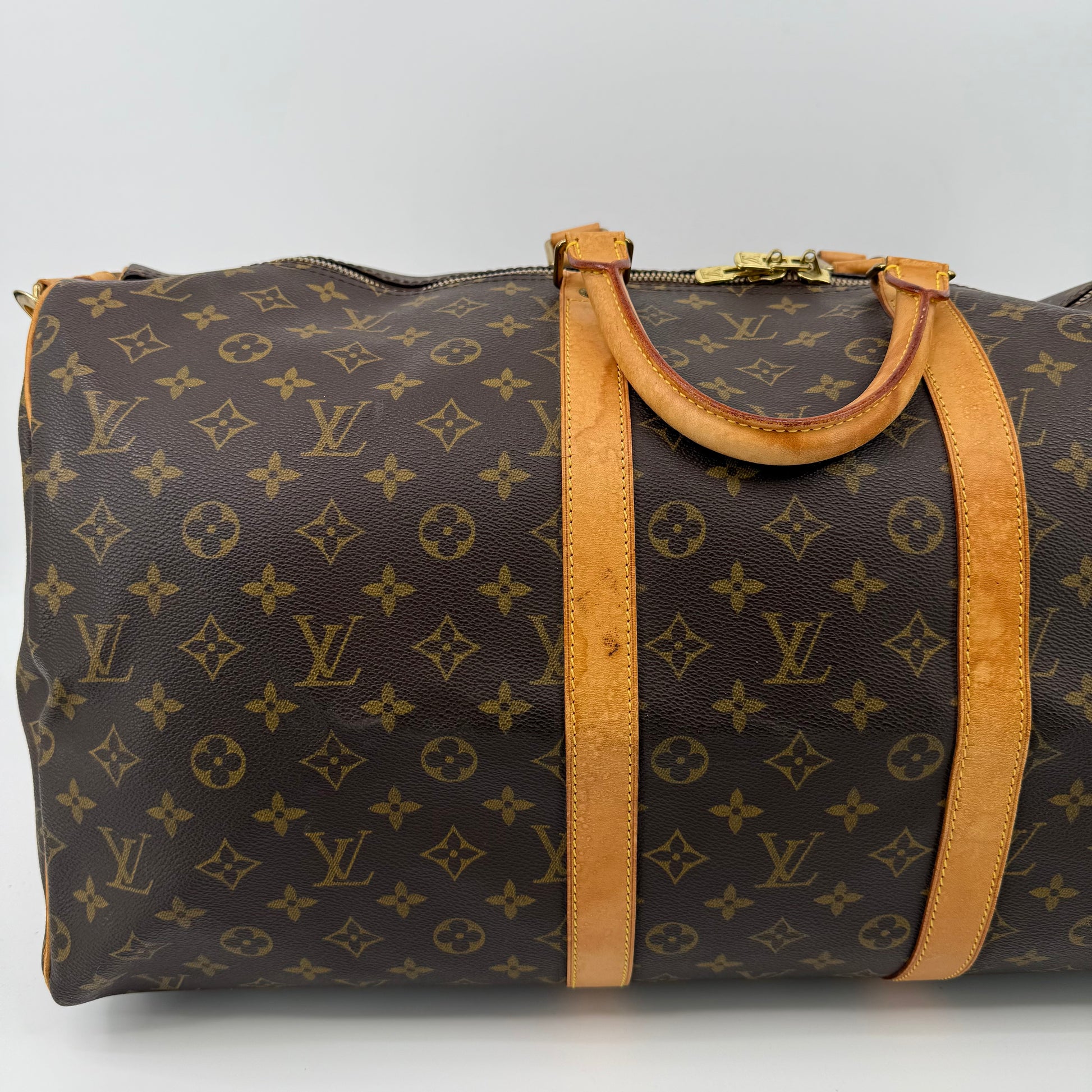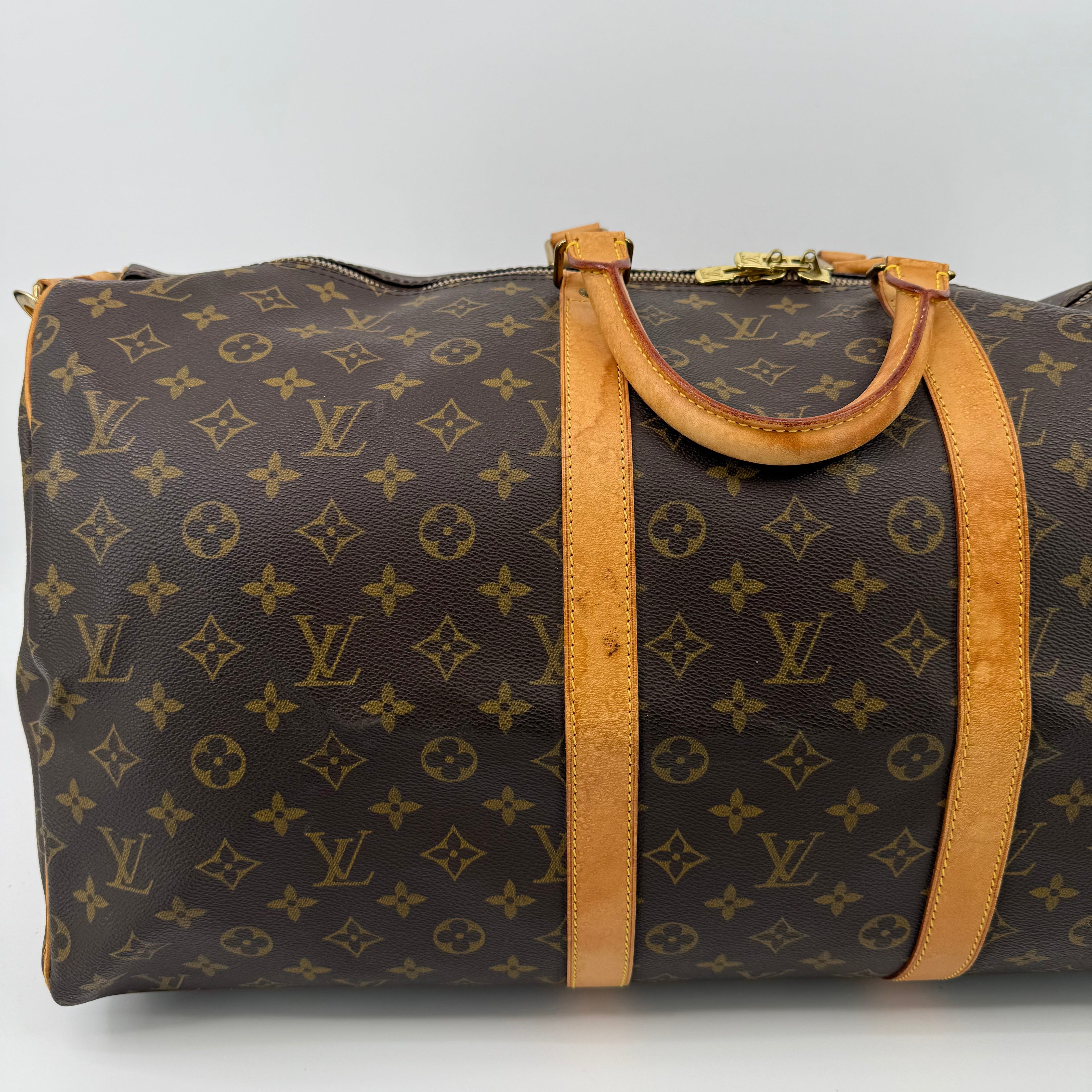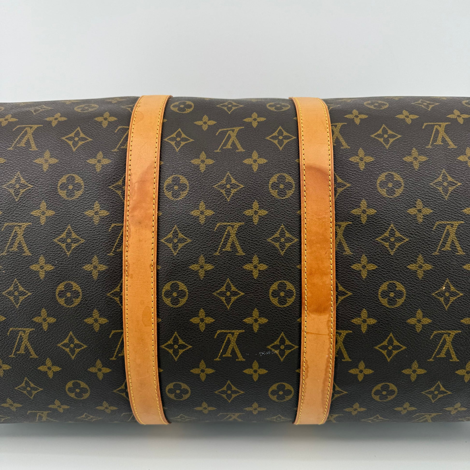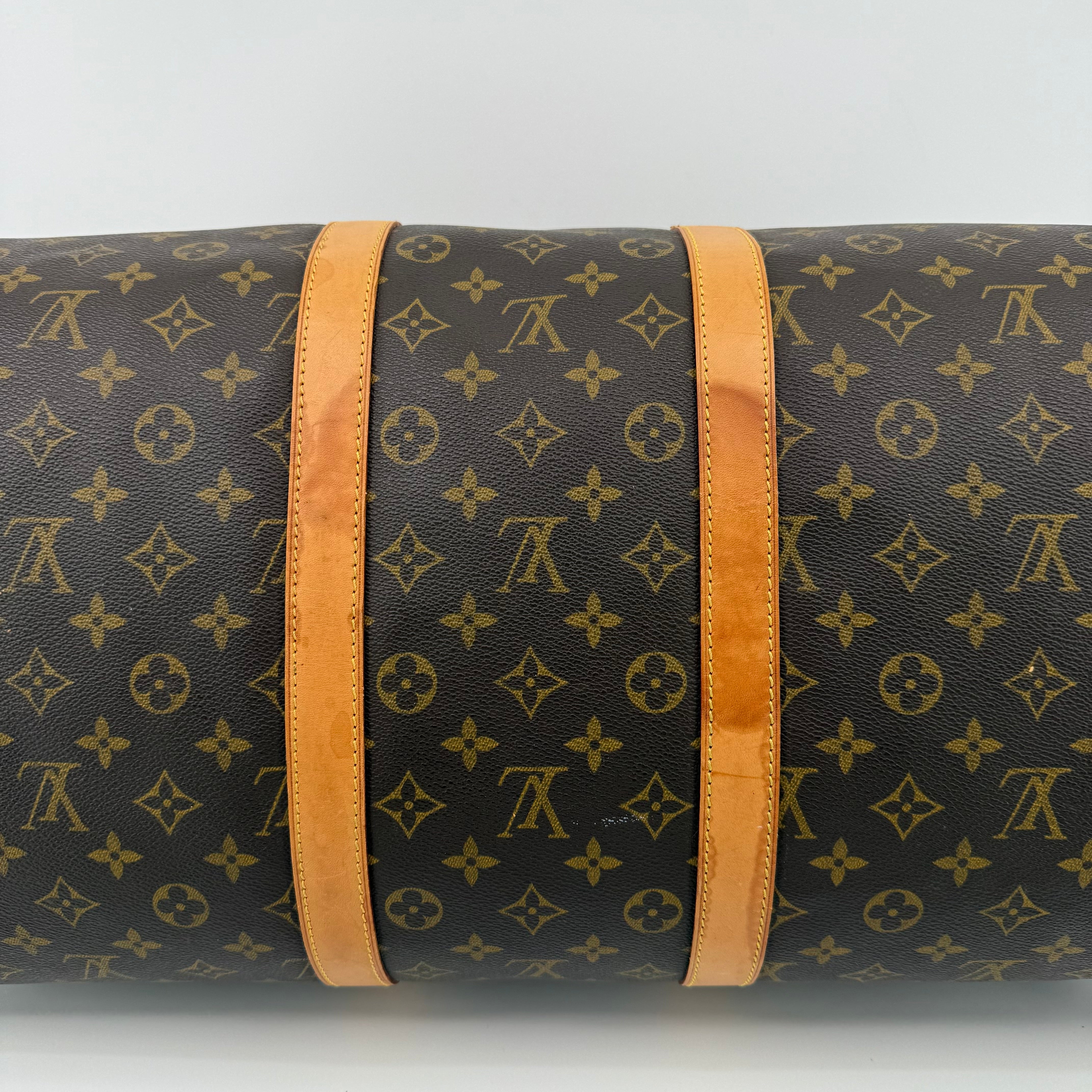 The Louis Vuitton Keepall Bandoulière 55 is the epitome of classic travel style — elegant, spacious, and unmistakably iconic. Crafted from Monogram coated canvas with natural cowhide leather trim and gold-tone hardware, this timeless duffle features double top handles, an adjustable and removable shoulder strap, and the signature padlock and leather name tag. Its generous size fits perfectly in overhead compartments, making it the ideal carry-on for luxury getaways.