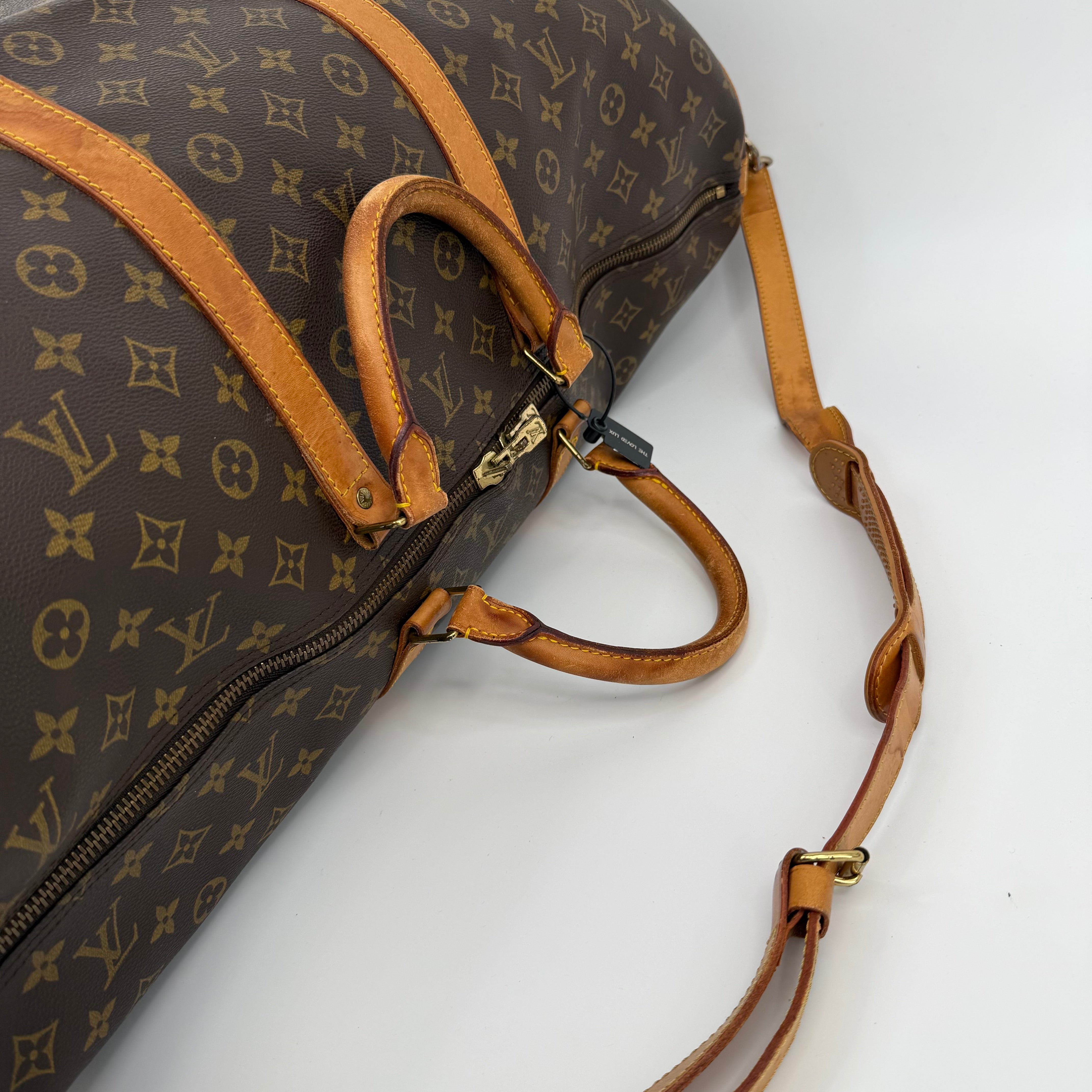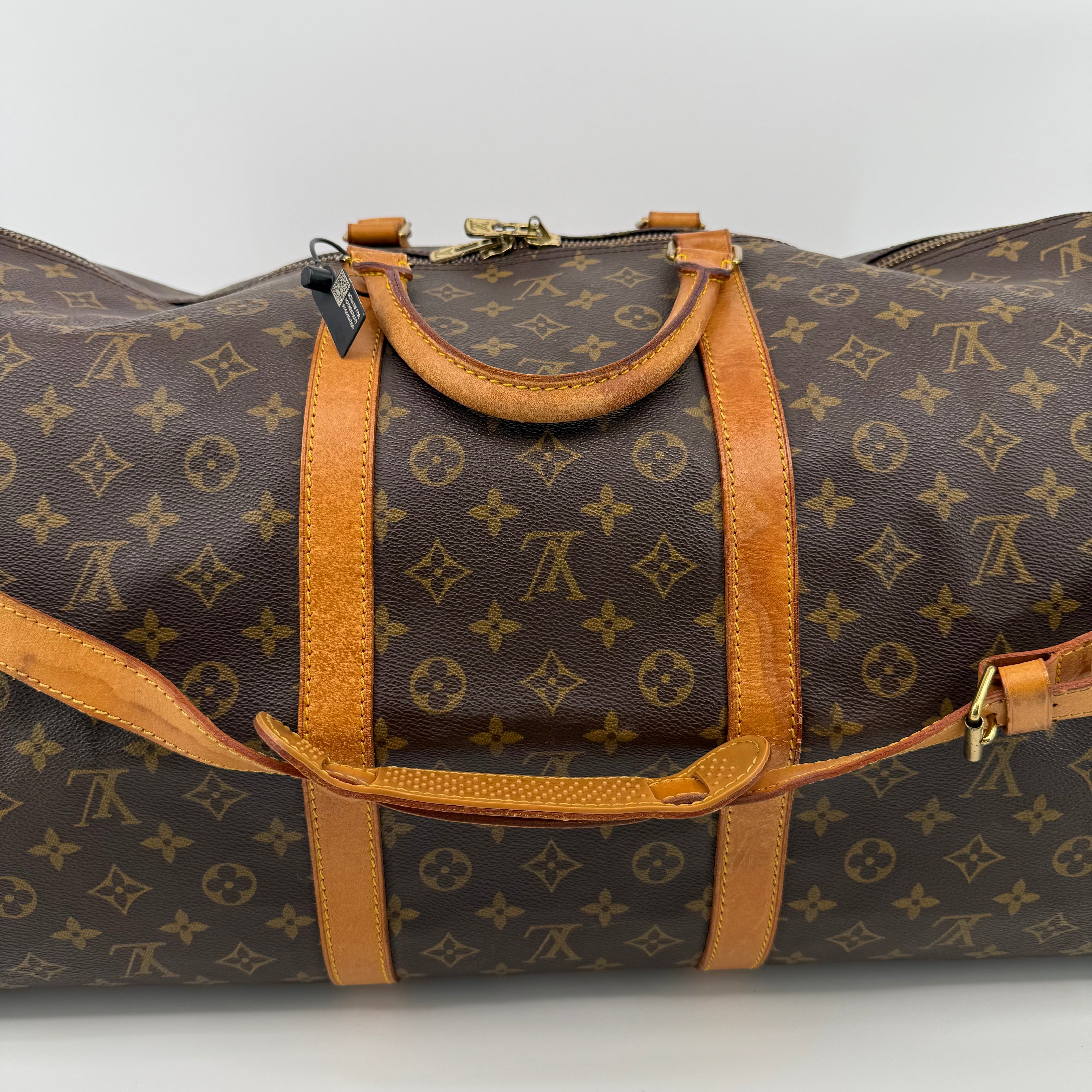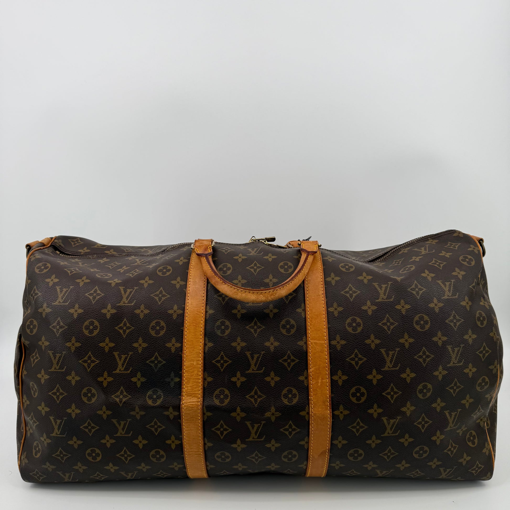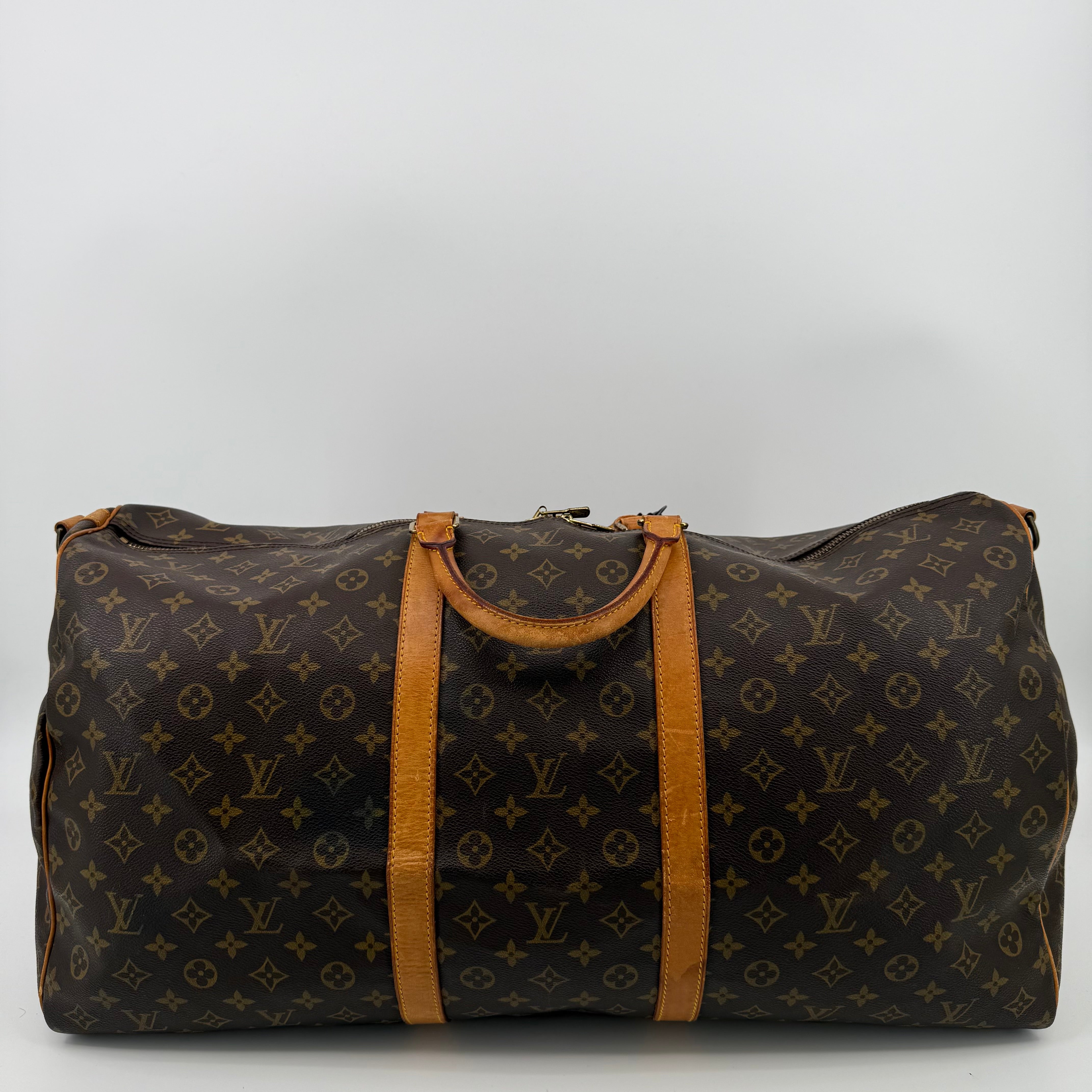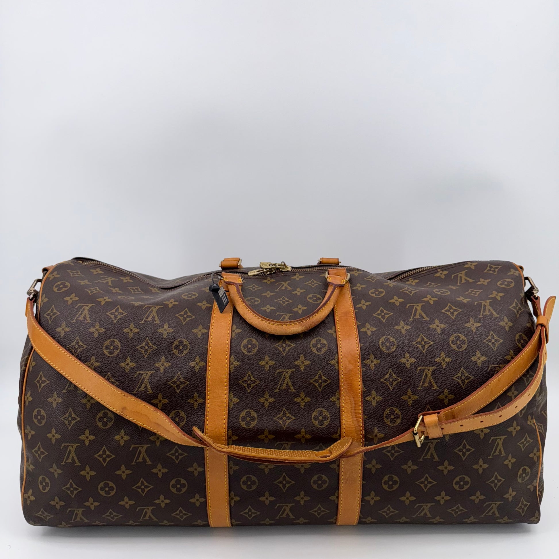 For the traveler who demands both elegance and practicality, the Louis Vuitton Keepall Bandoulière 60 is the ultimate statement piece. Constructed from Monogram coated canvas and vachetta leather trim with gold-tone hardware, it offers a spacious interior perfect for longer trips. The bag includes rolled leather handles, a detachable and adjustable shoulder strap, and signature Louis Vuitton detailing throughout — blending heritage craftsmanship with modern travel ease.