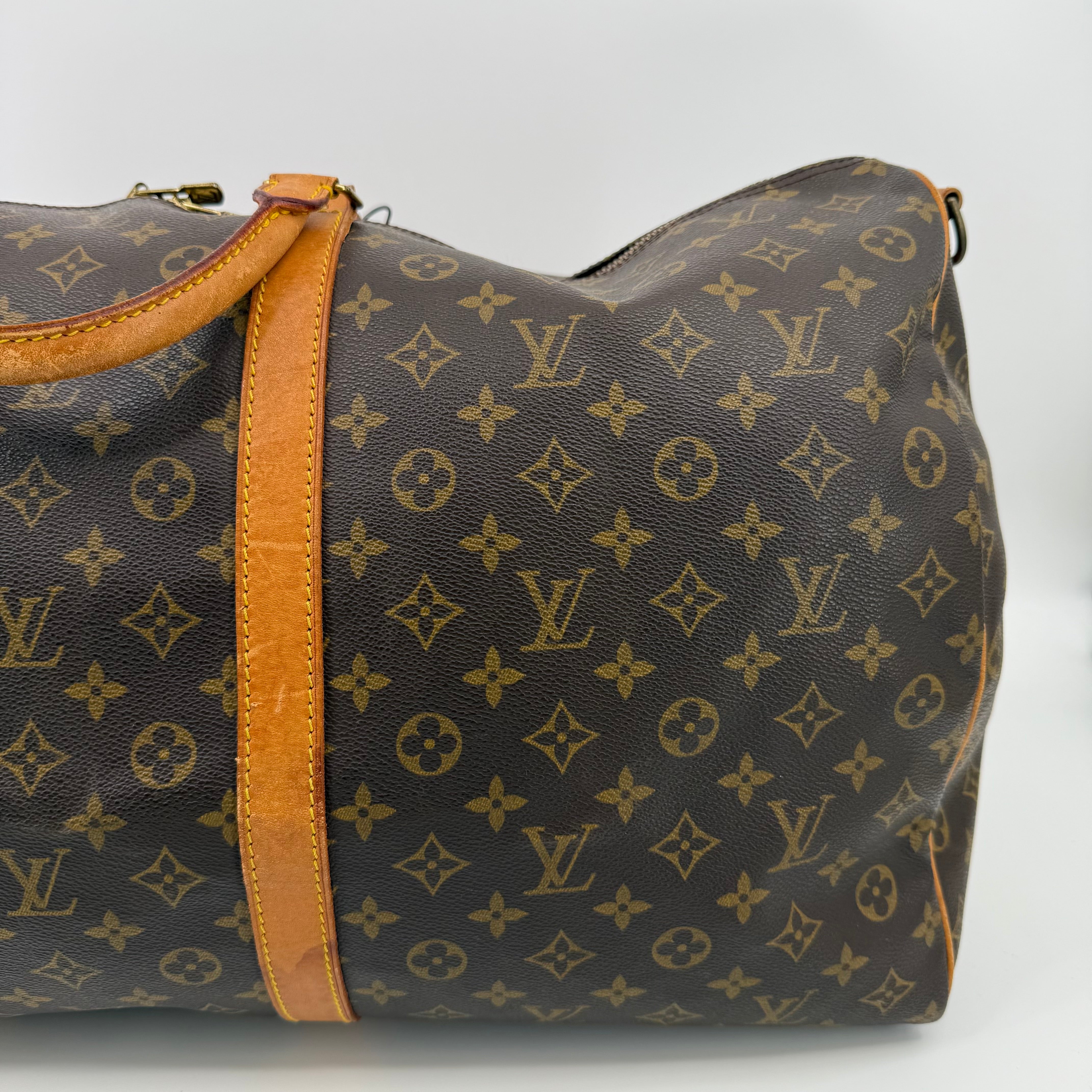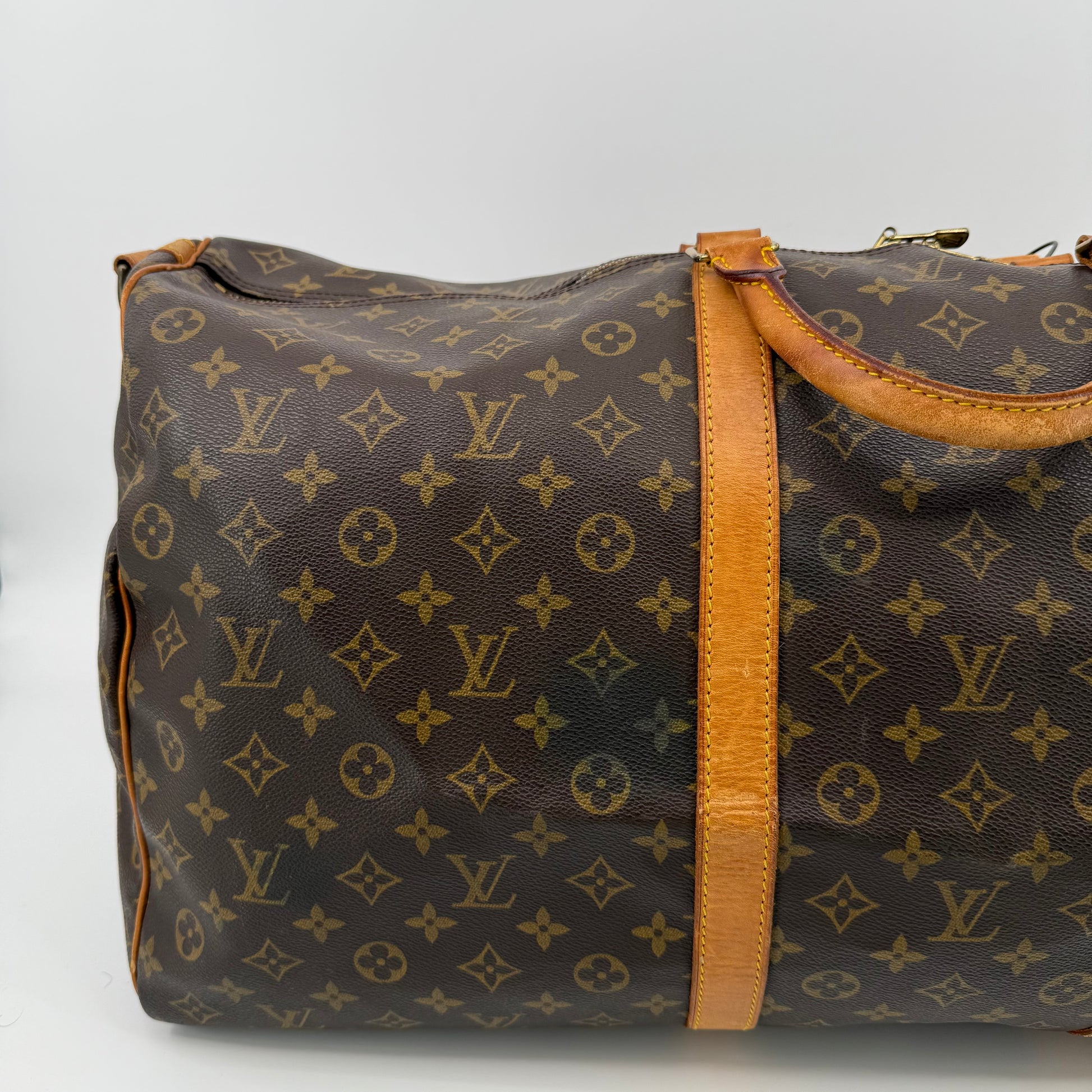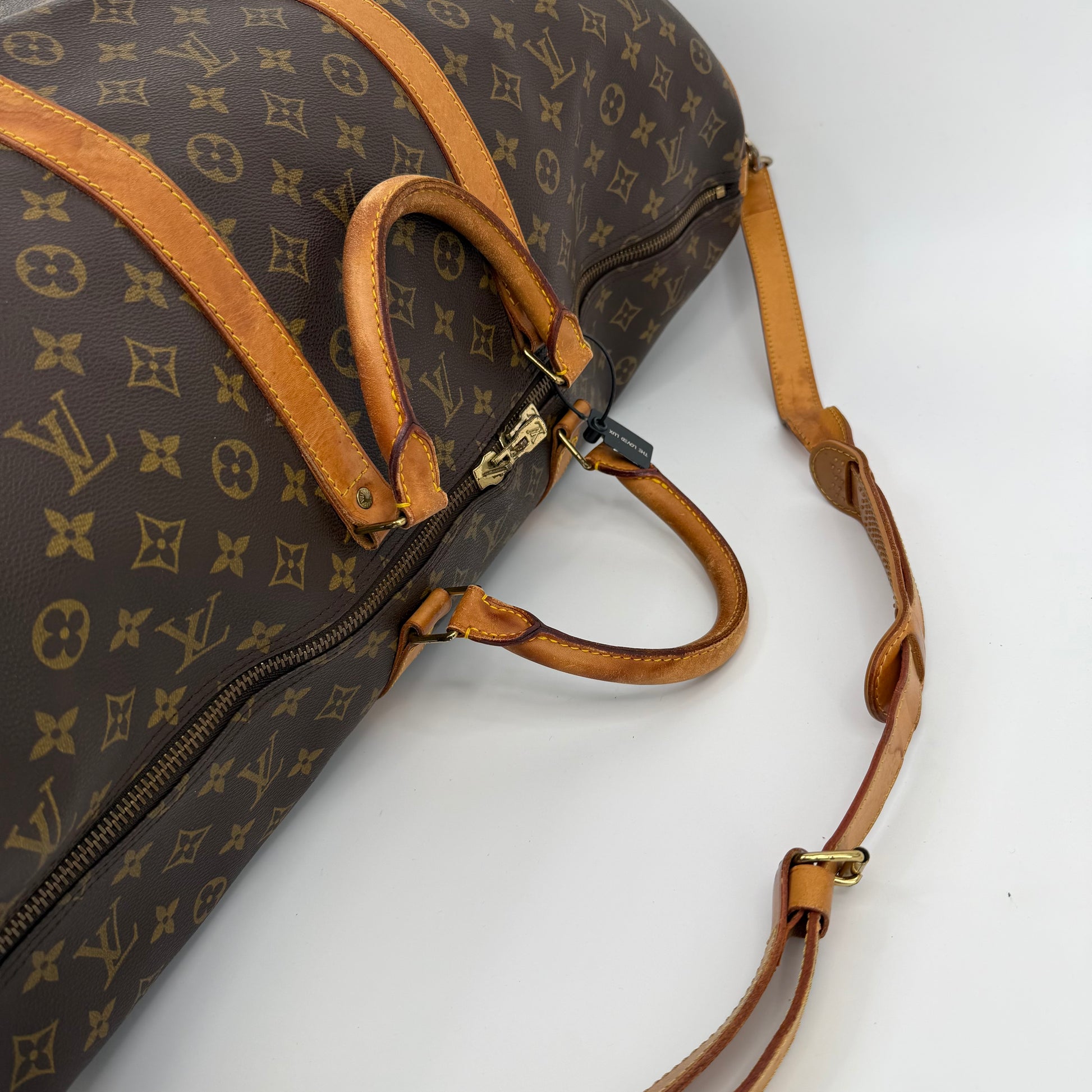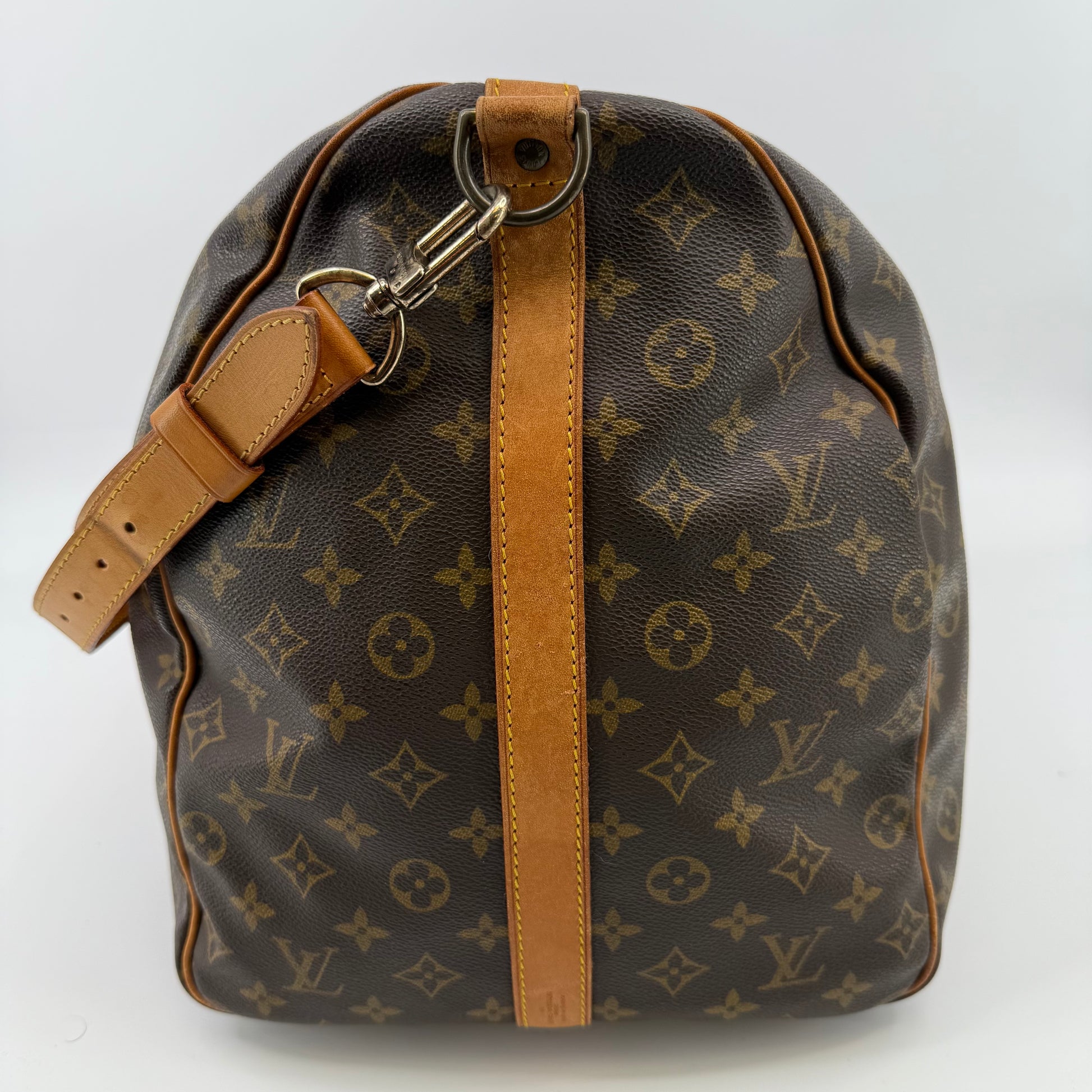 For the traveler who demands both elegance and practicality, the Louis Vuitton Keepall Bandoulière 60 is the ultimate statement piece. Constructed from Monogram coated canvas and vachetta leather trim with gold-tone hardware, it offers a spacious interior perfect for longer trips. The bag includes rolled leather handles, a detachable and adjustable shoulder strap, and signature Louis Vuitton detailing throughout — blending heritage craftsmanship with modern travel ease.