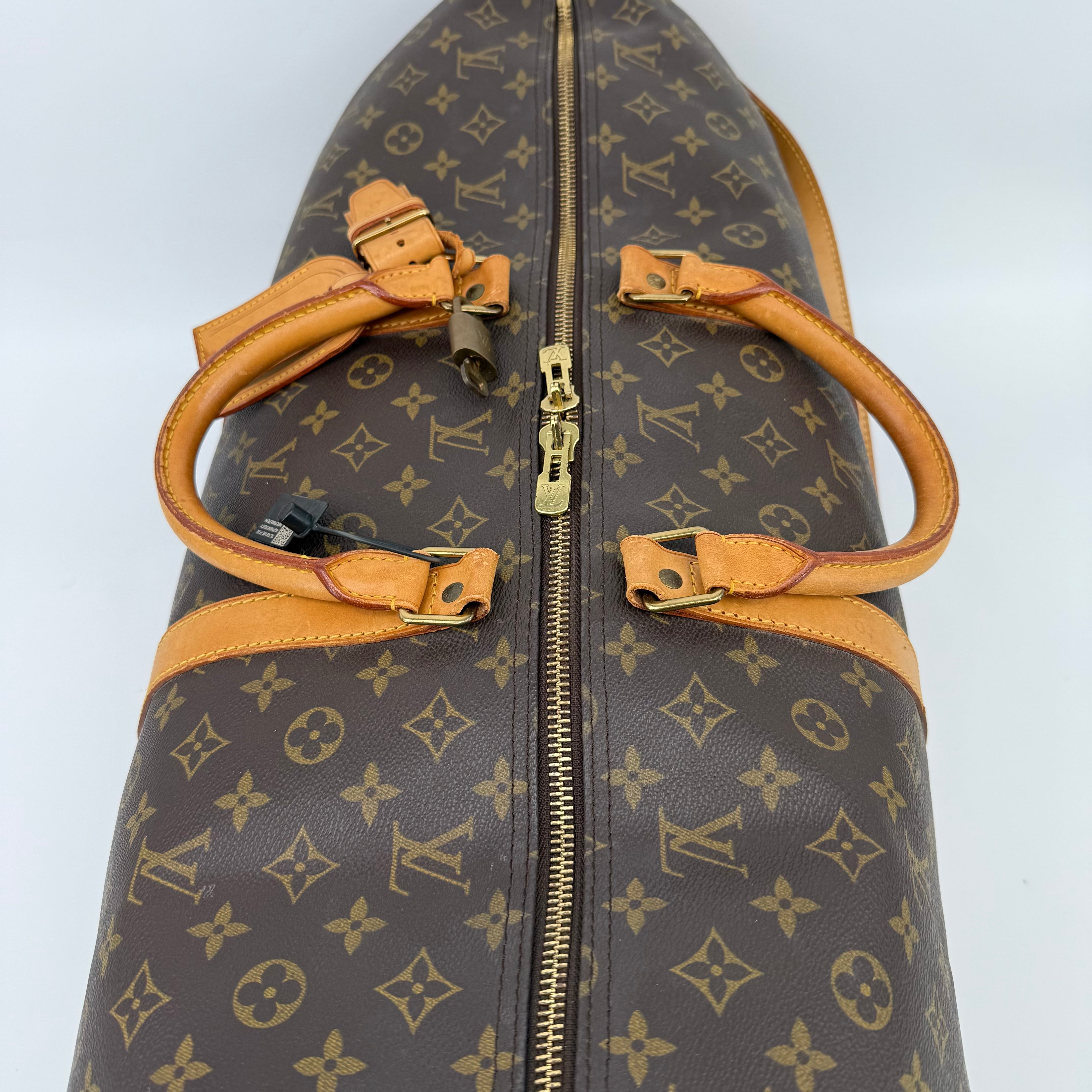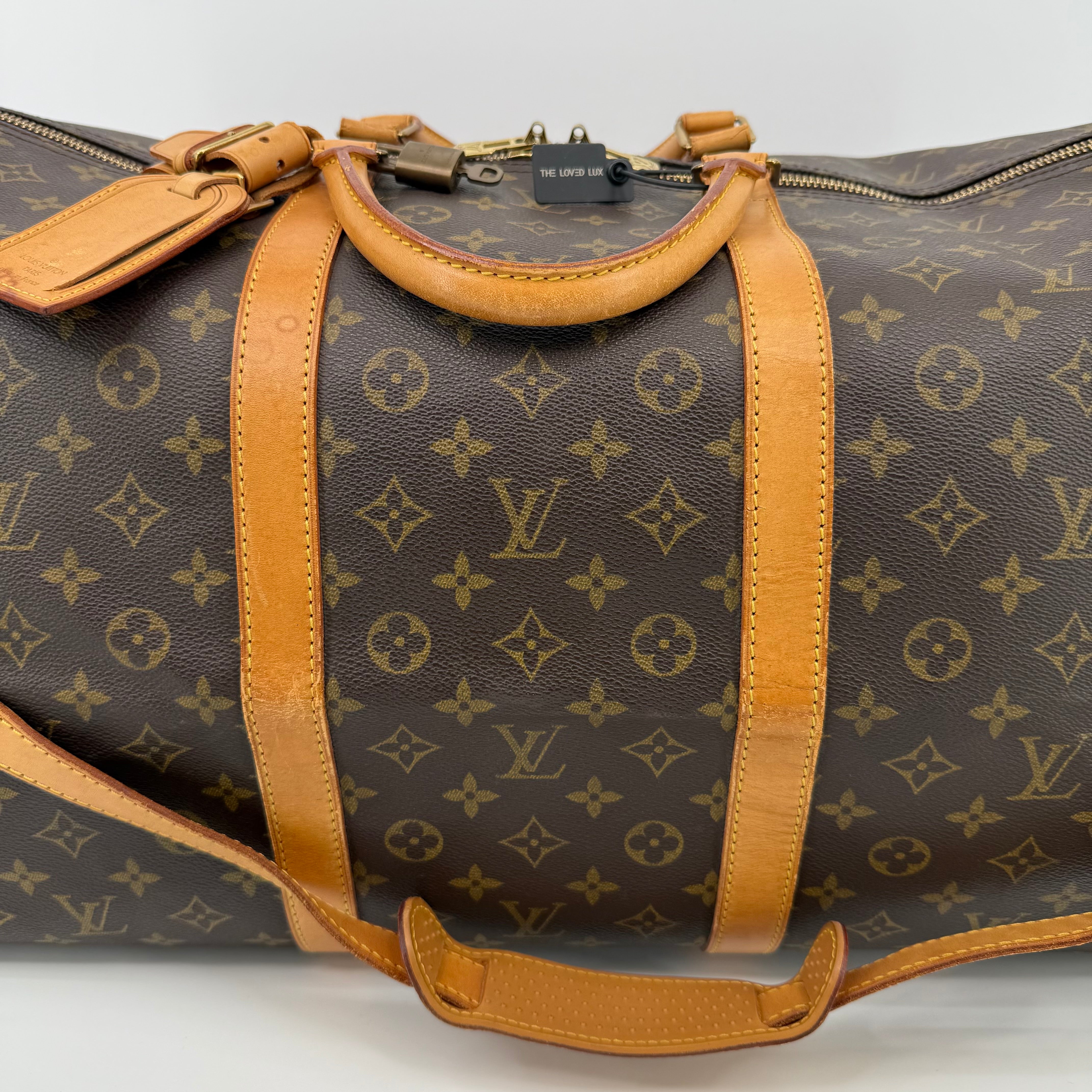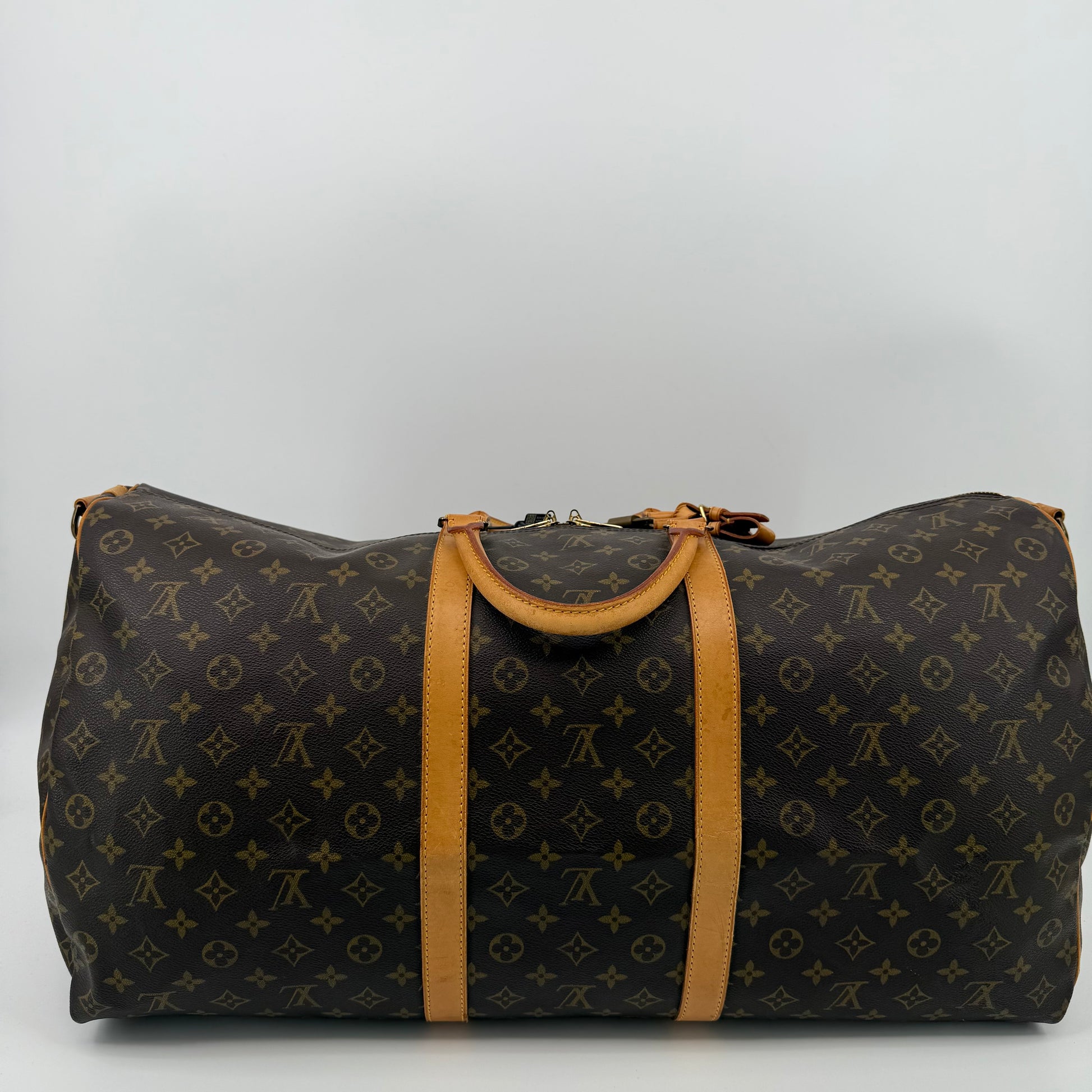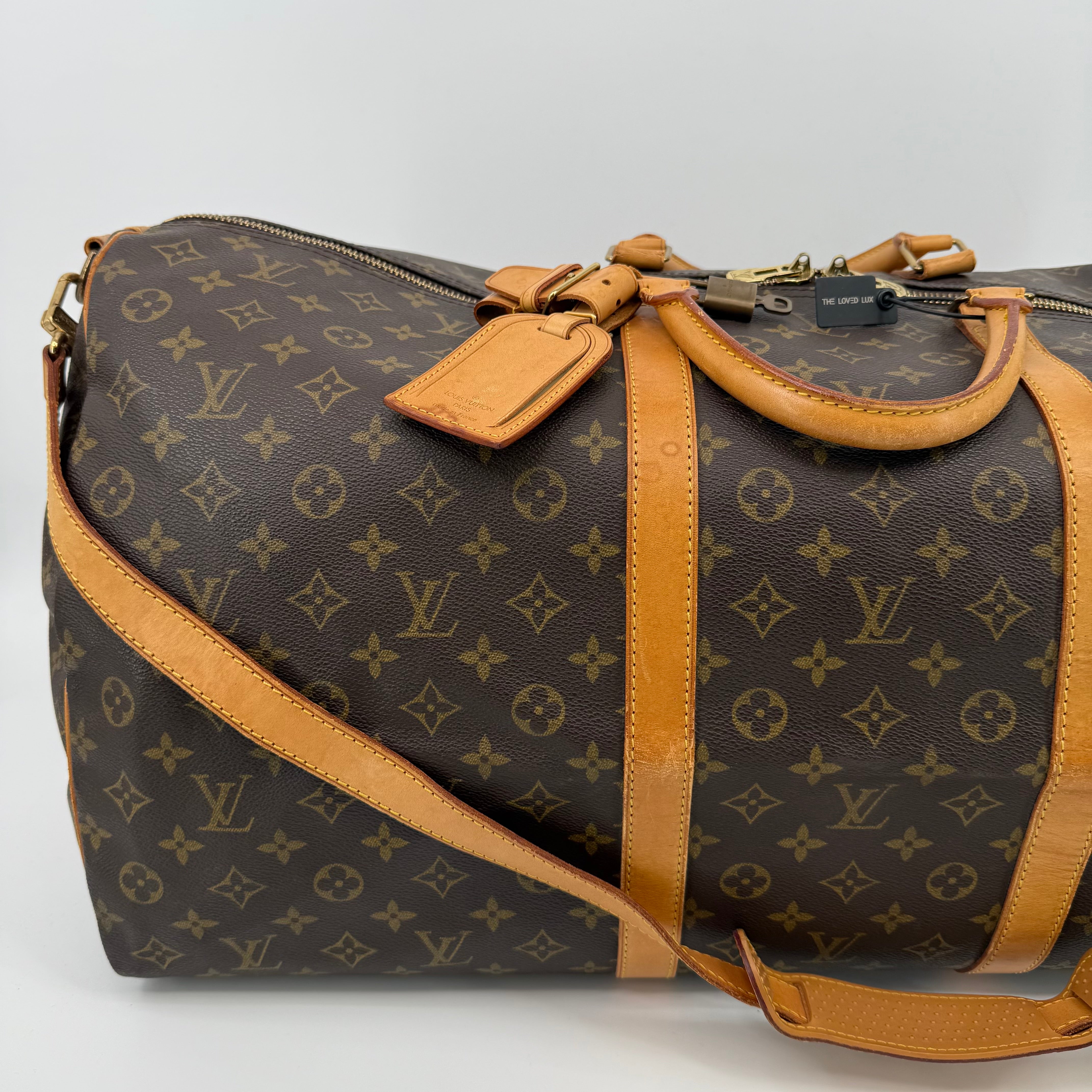 For the traveler who demands both elegance and practicality, the Louis Vuitton Keepall Bandoulière 60 is the ultimate statement piece. Constructed from Monogram coated canvas and vachetta leather trim with gold-tone hardware, it offers a spacious interior perfect for longer trips. The bag includes rolled leather handles, a detachable and adjustable shoulder strap, and signature Louis Vuitton detailing throughout — blending heritage craftsmanship with modern travel ease.