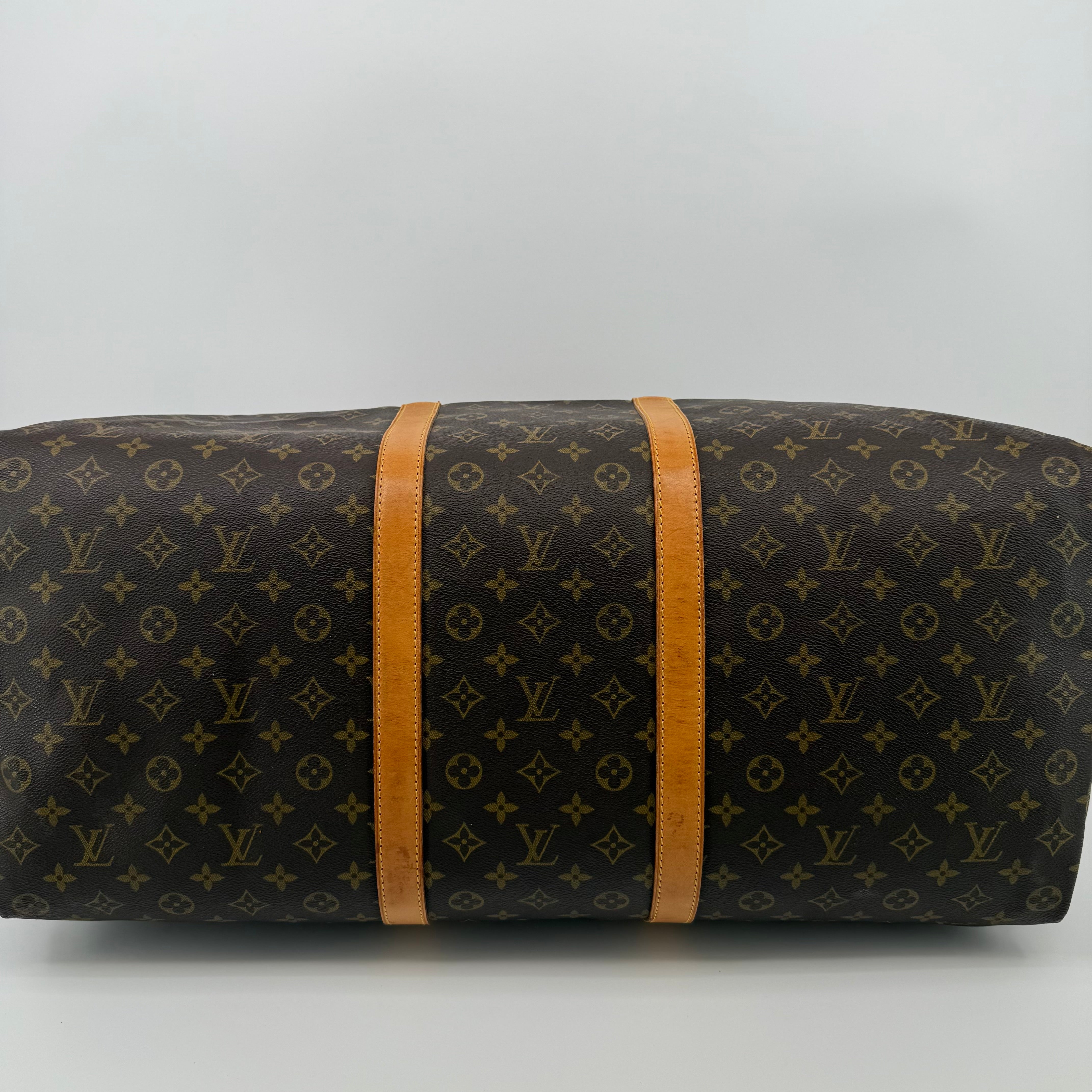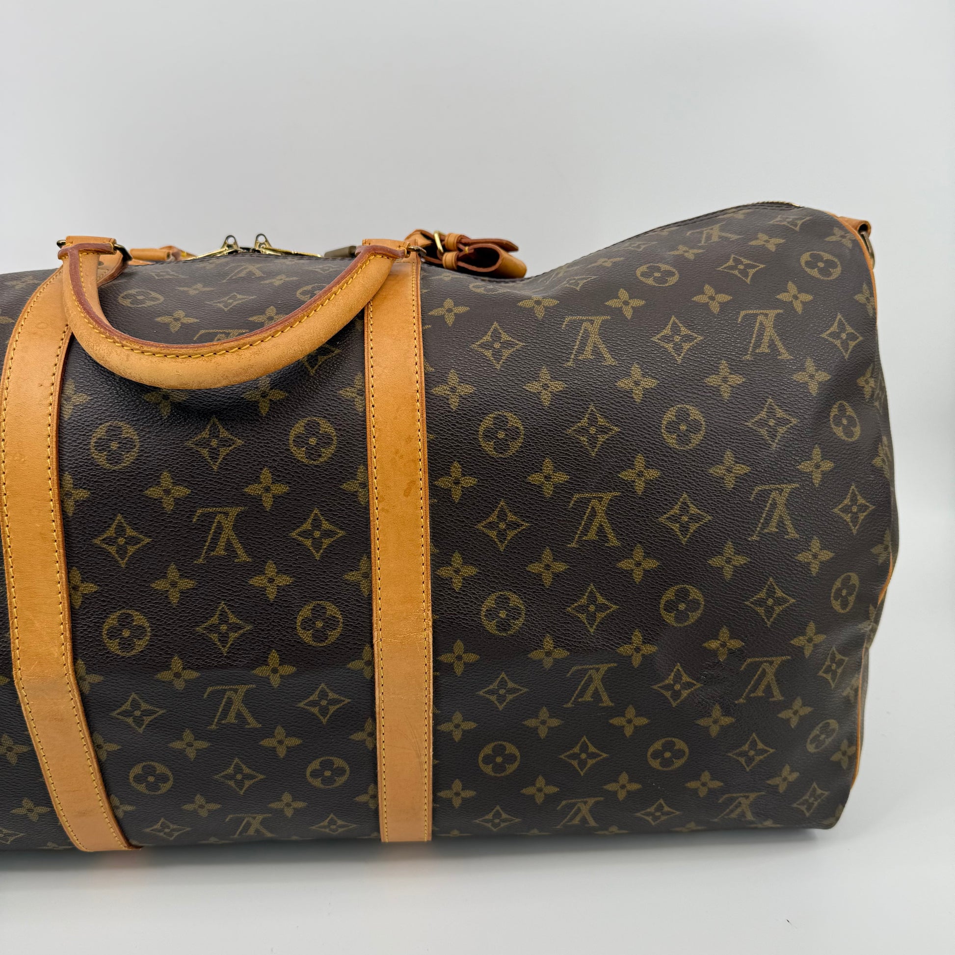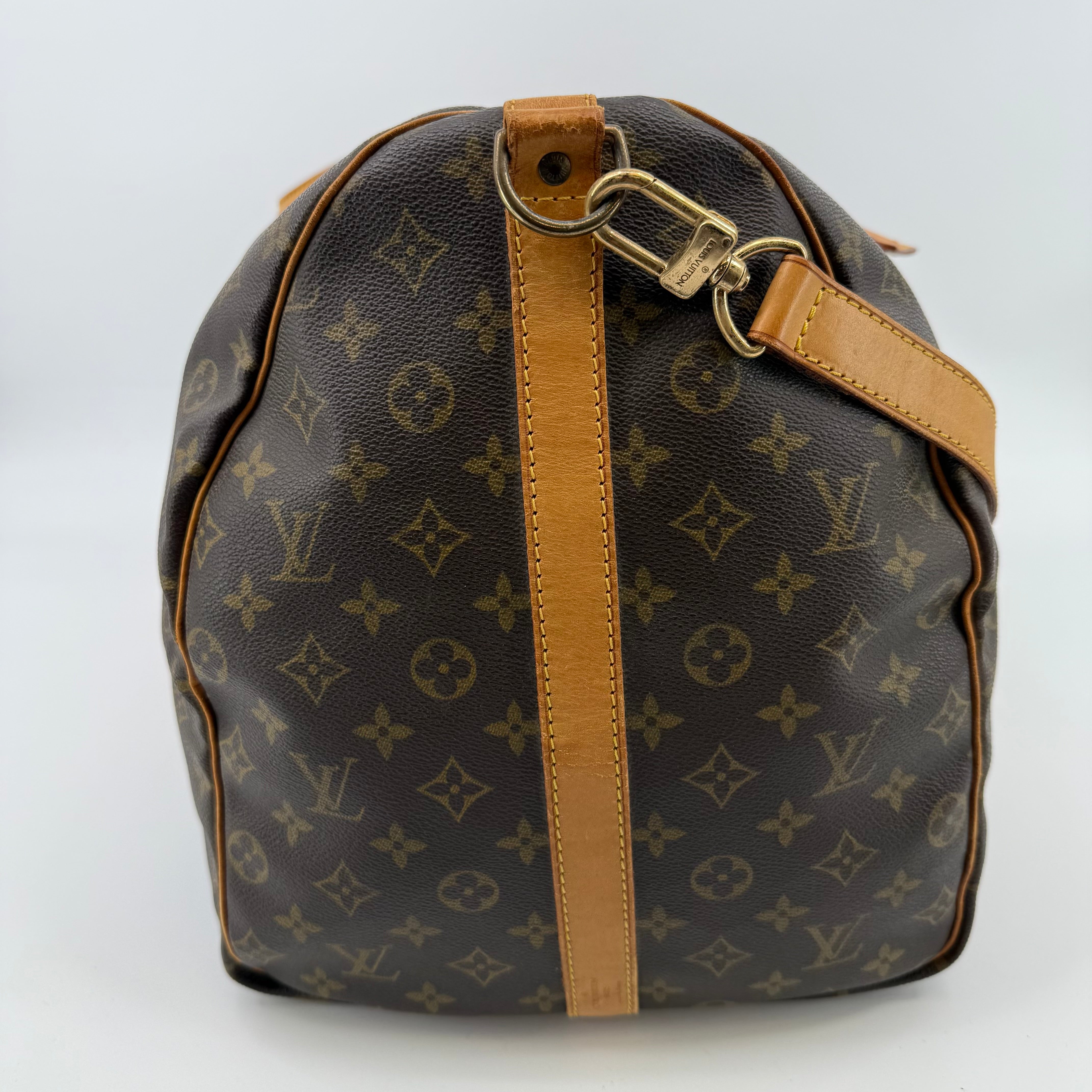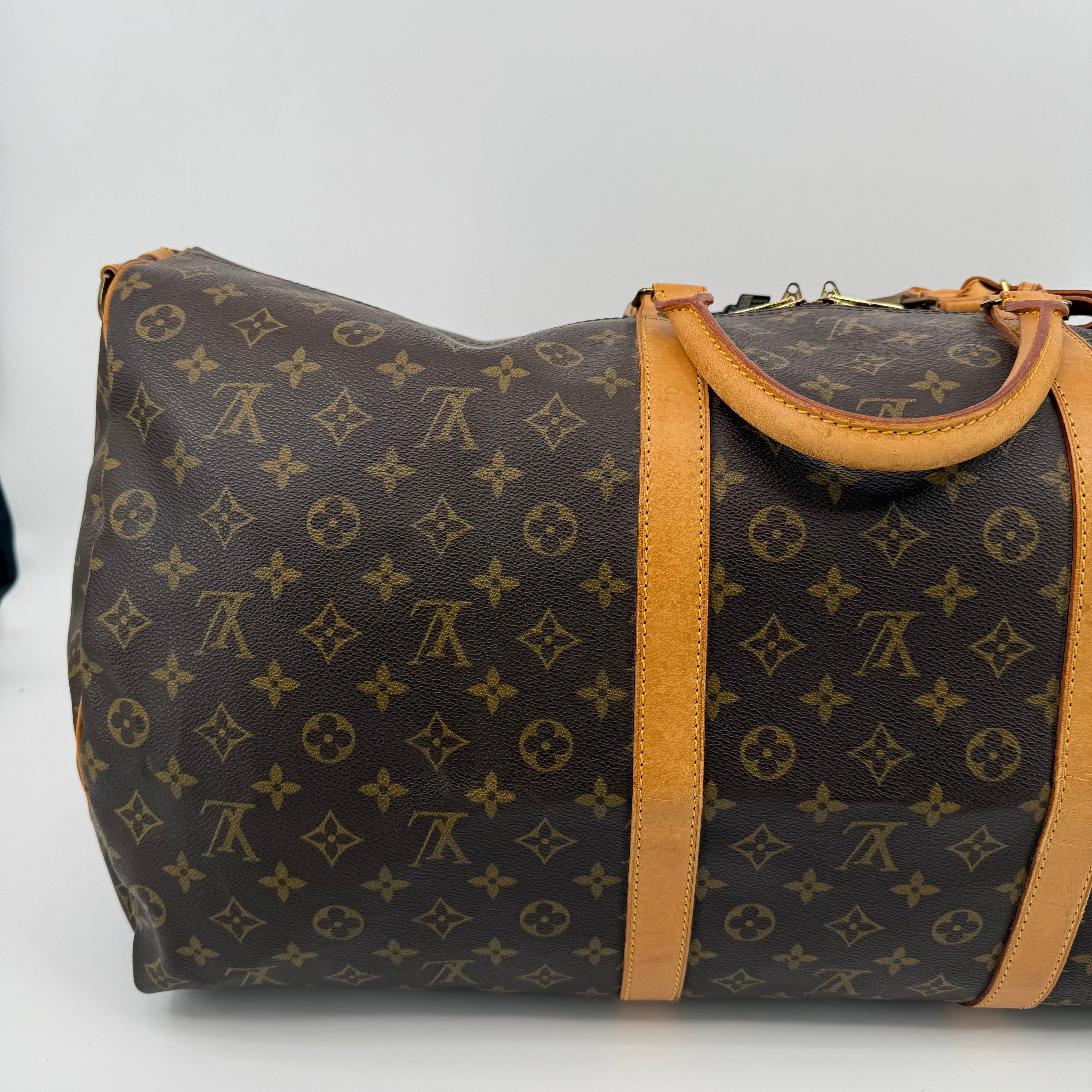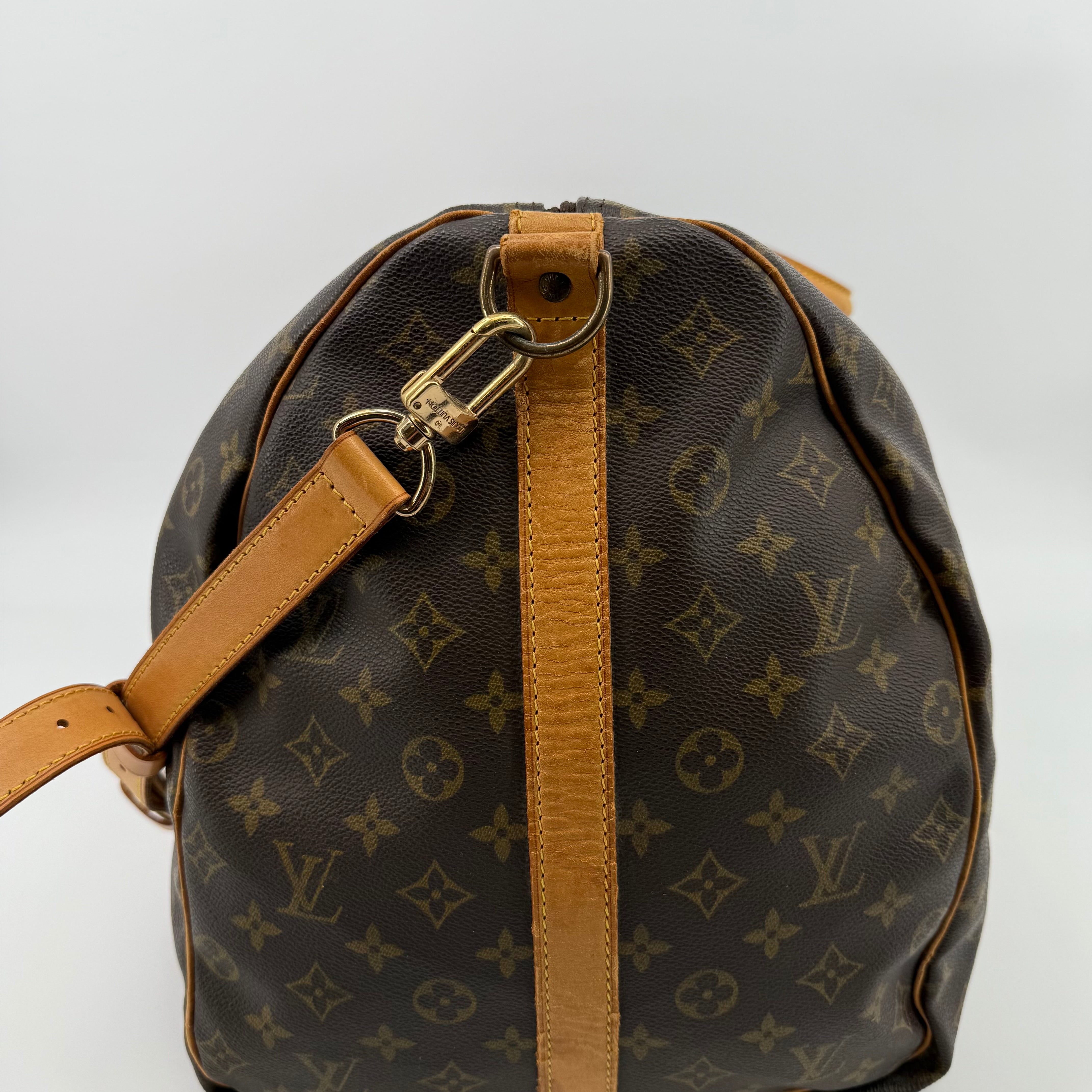 For the traveler who demands both elegance and practicality, the Louis Vuitton Keepall Bandoulière 60 is the ultimate statement piece. Constructed from Monogram coated canvas and vachetta leather trim with gold-tone hardware, it offers a spacious interior perfect for longer trips. The bag includes rolled leather handles, a detachable and adjustable shoulder strap, and signature Louis Vuitton detailing throughout — blending heritage craftsmanship with modern travel ease.