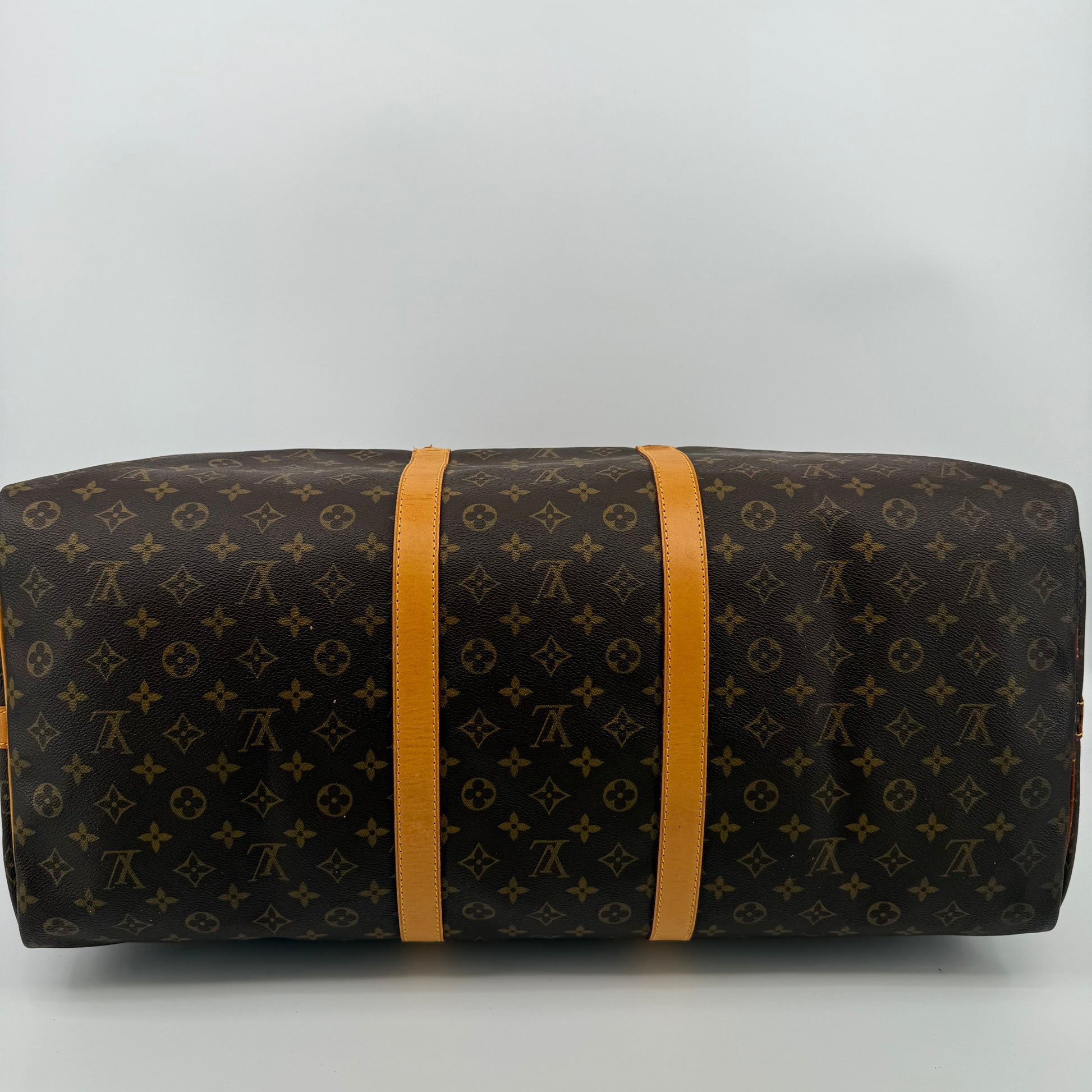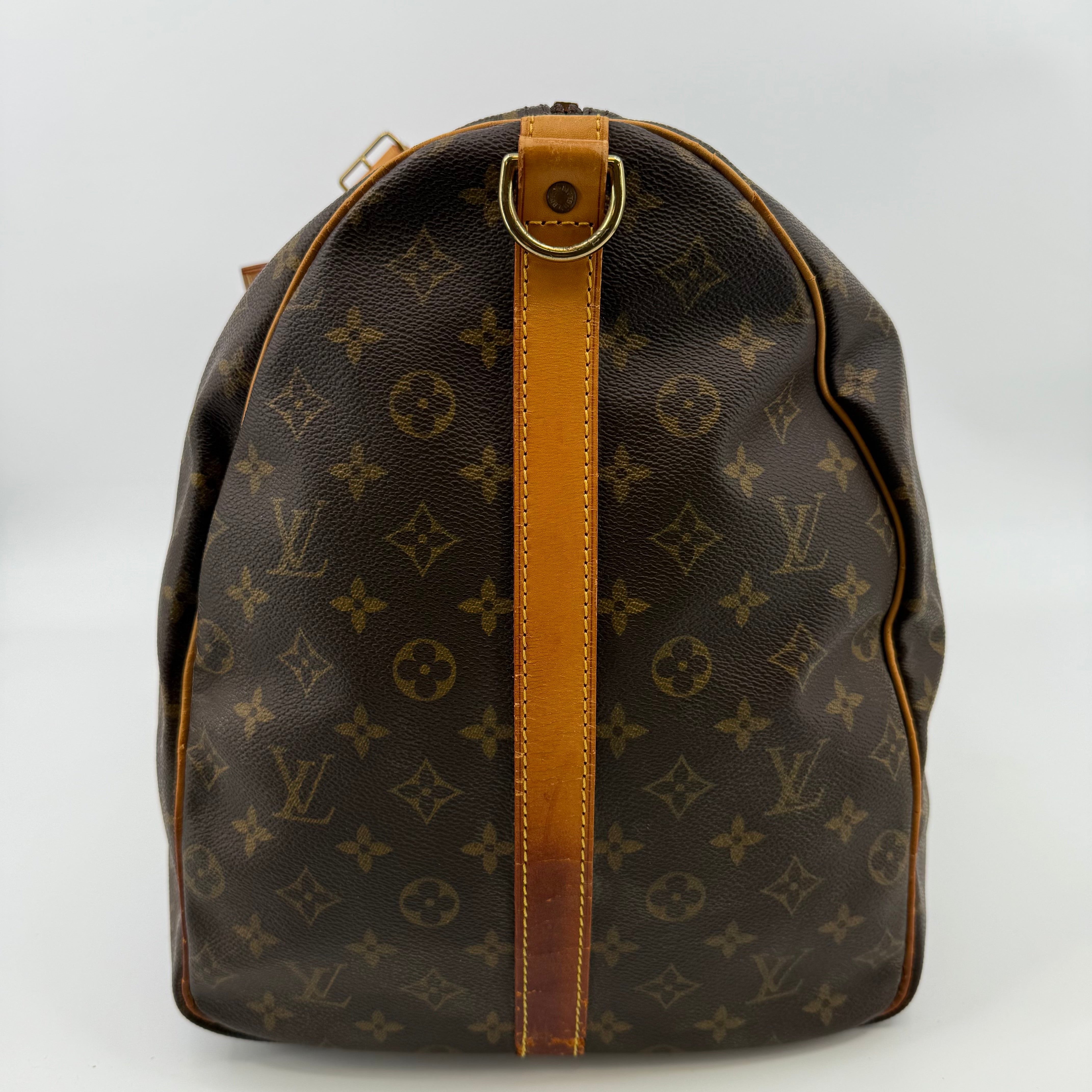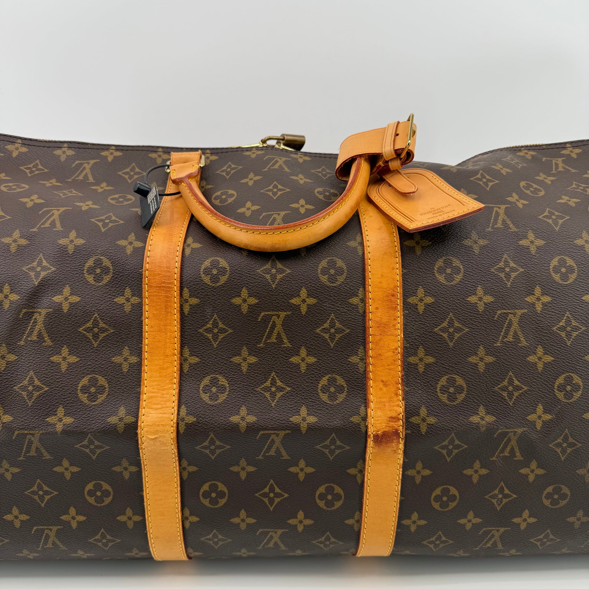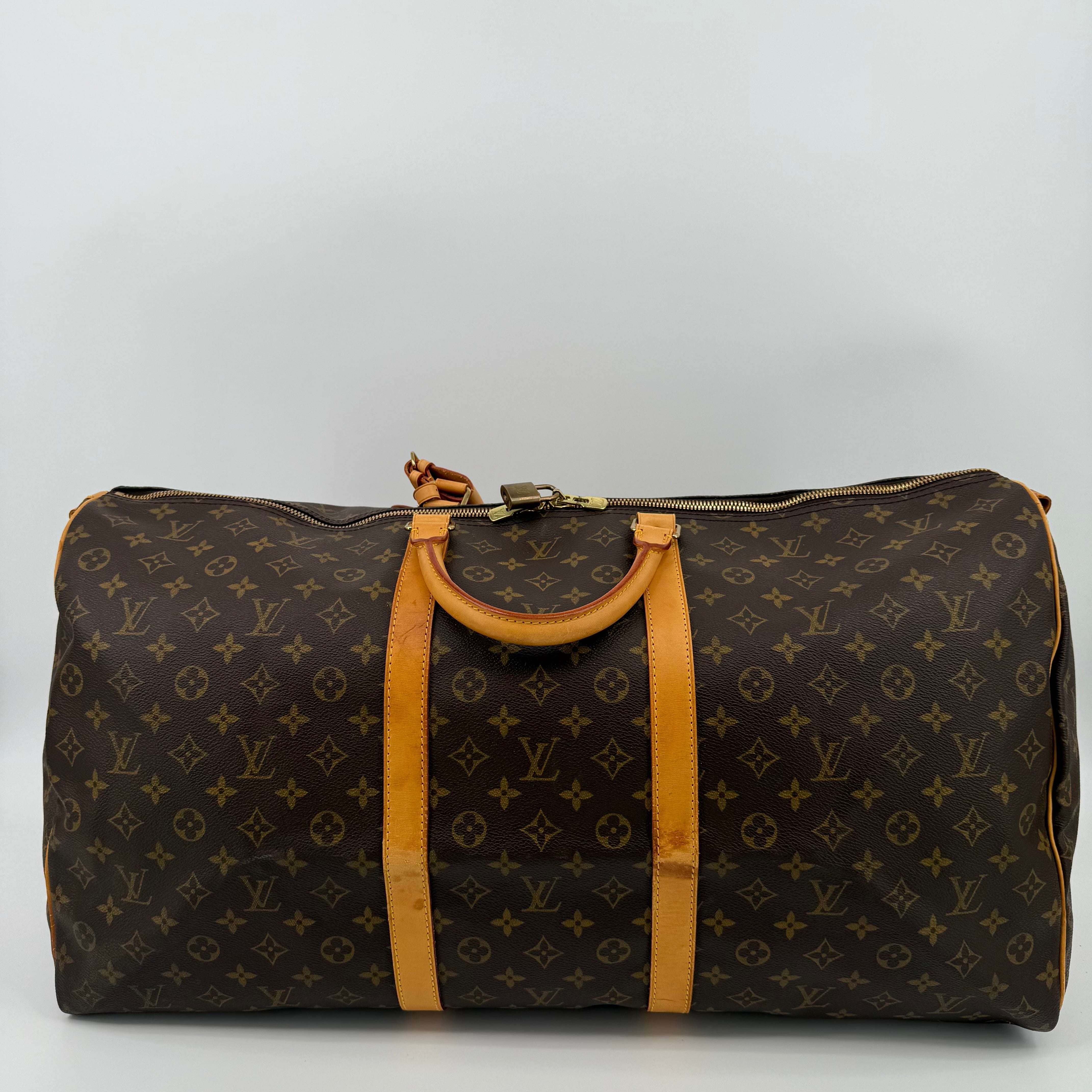 For the traveler who demands both elegance and practicality, the Louis Vuitton Keepall Bandoulière 60 is the ultimate statement piece. Constructed from Monogram coated canvas and vachetta leather trim with gold-tone hardware, it offers a spacious interior perfect for longer trips. The bag includes rolled leather handles, a detachable and adjustable shoulder strap, and signature Louis Vuitton detailing throughout — blending heritage craftsmanship with modern travel ease.