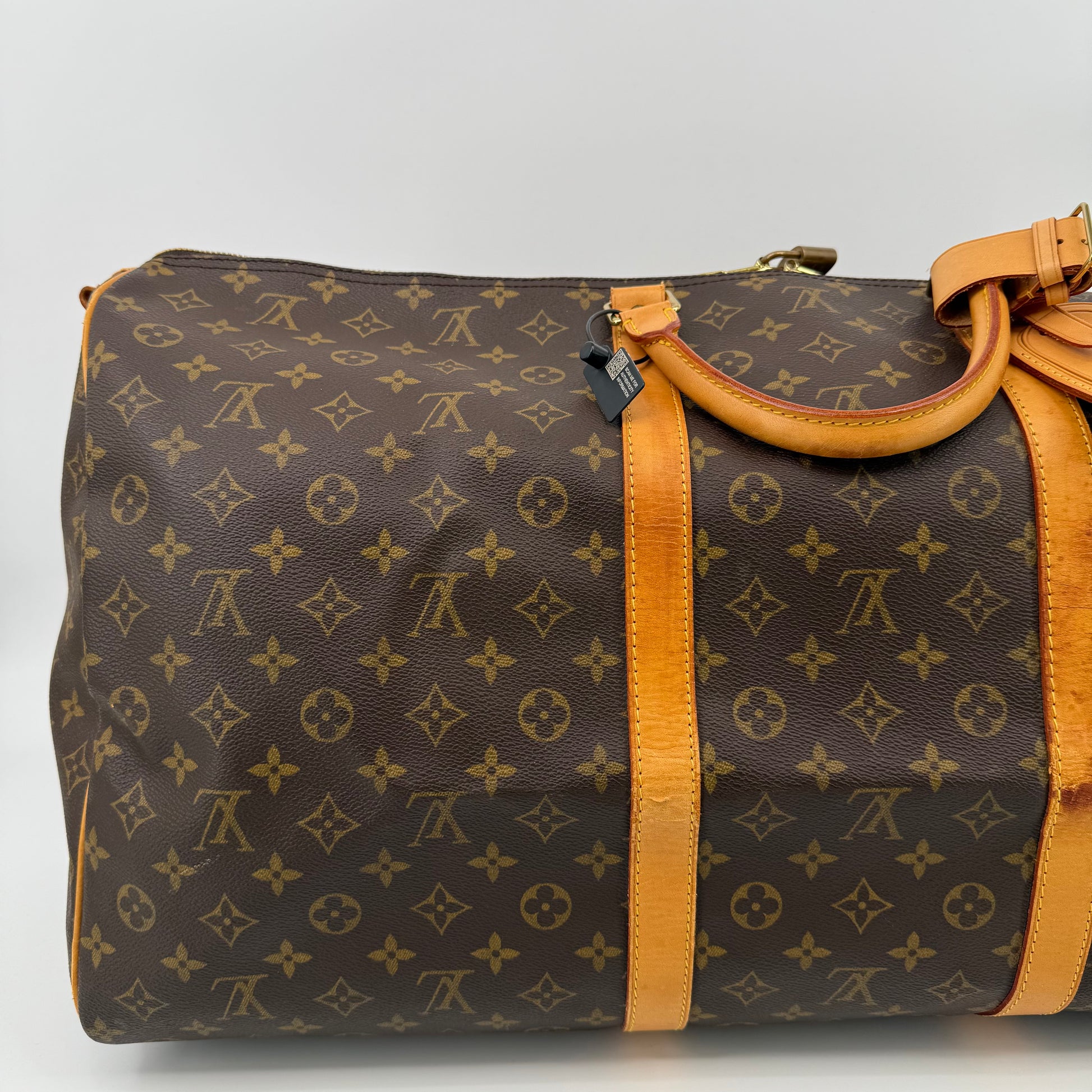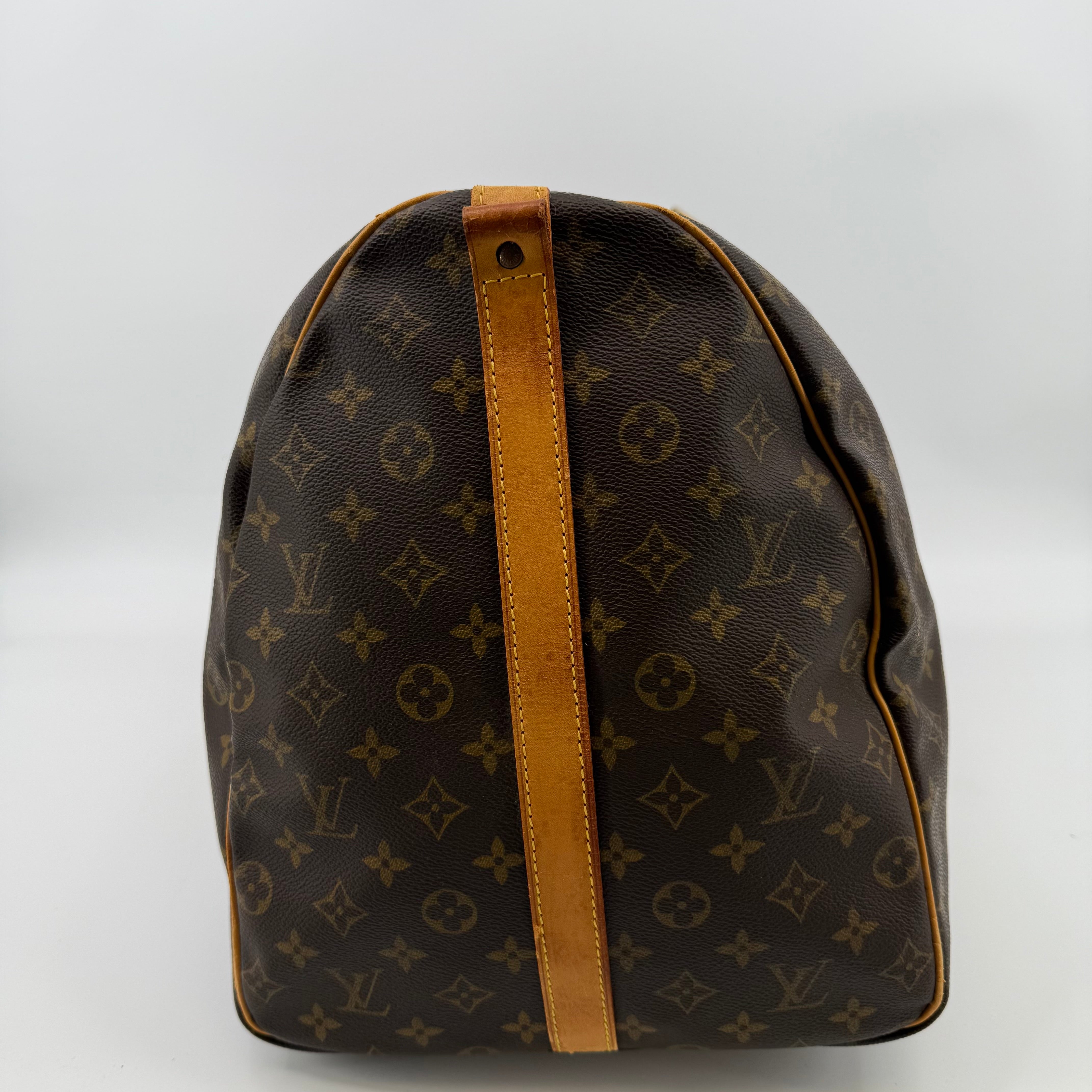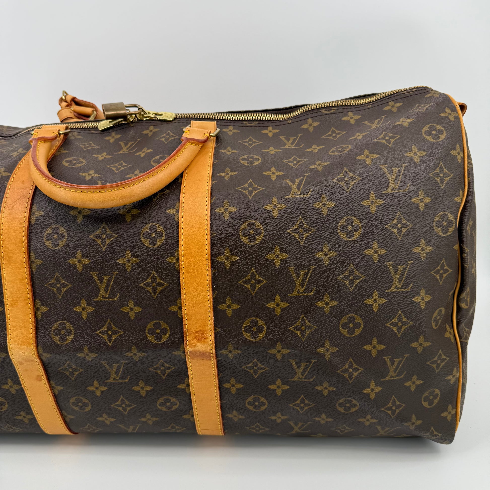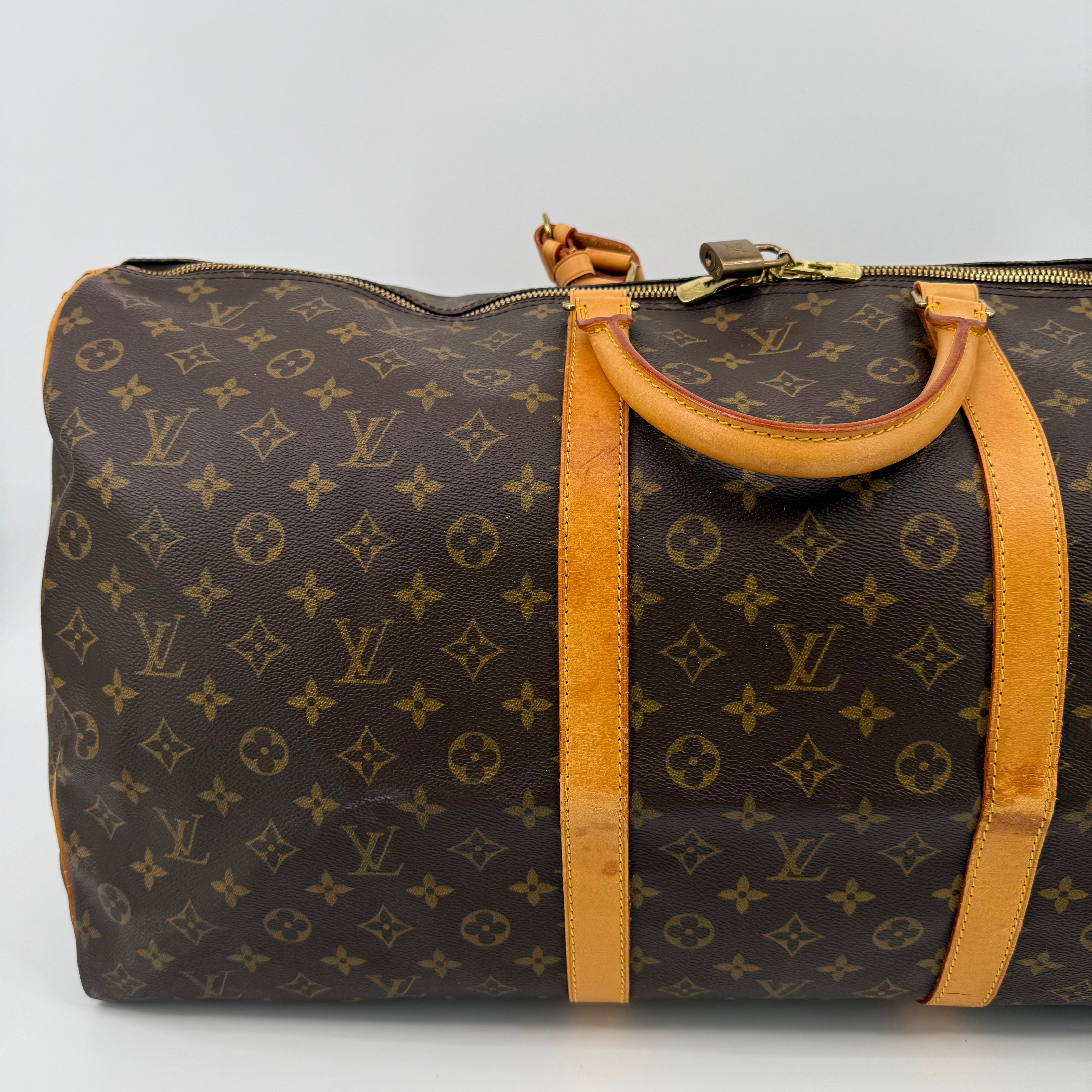 For the traveler who demands both elegance and practicality, the Louis Vuitton Keepall Bandoulière 60 is the ultimate statement piece. Constructed from Monogram coated canvas and vachetta leather trim with gold-tone hardware, it offers a spacious interior perfect for longer trips. The bag includes rolled leather handles, a detachable and adjustable shoulder strap, and signature Louis Vuitton detailing throughout — blending heritage craftsmanship with modern travel ease.