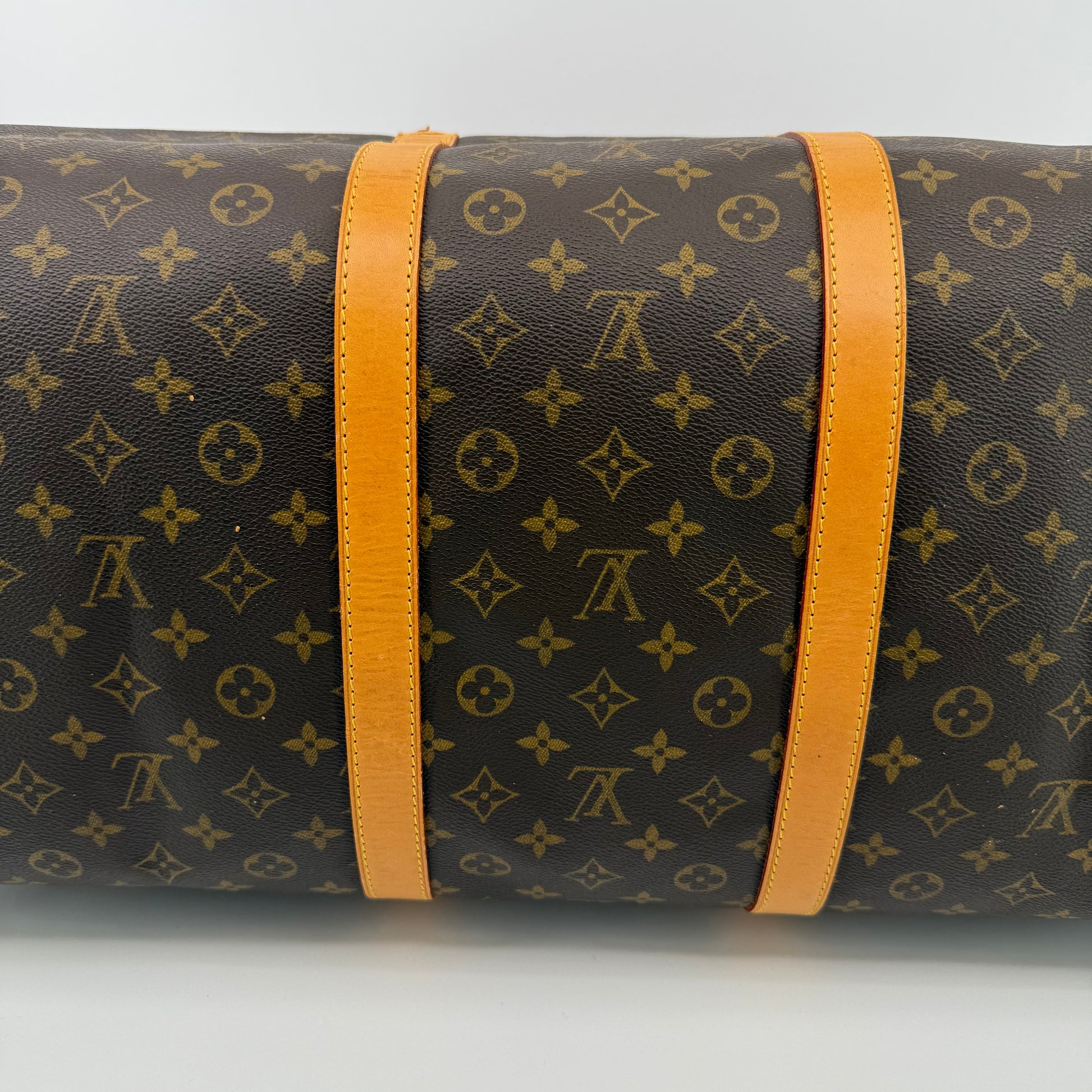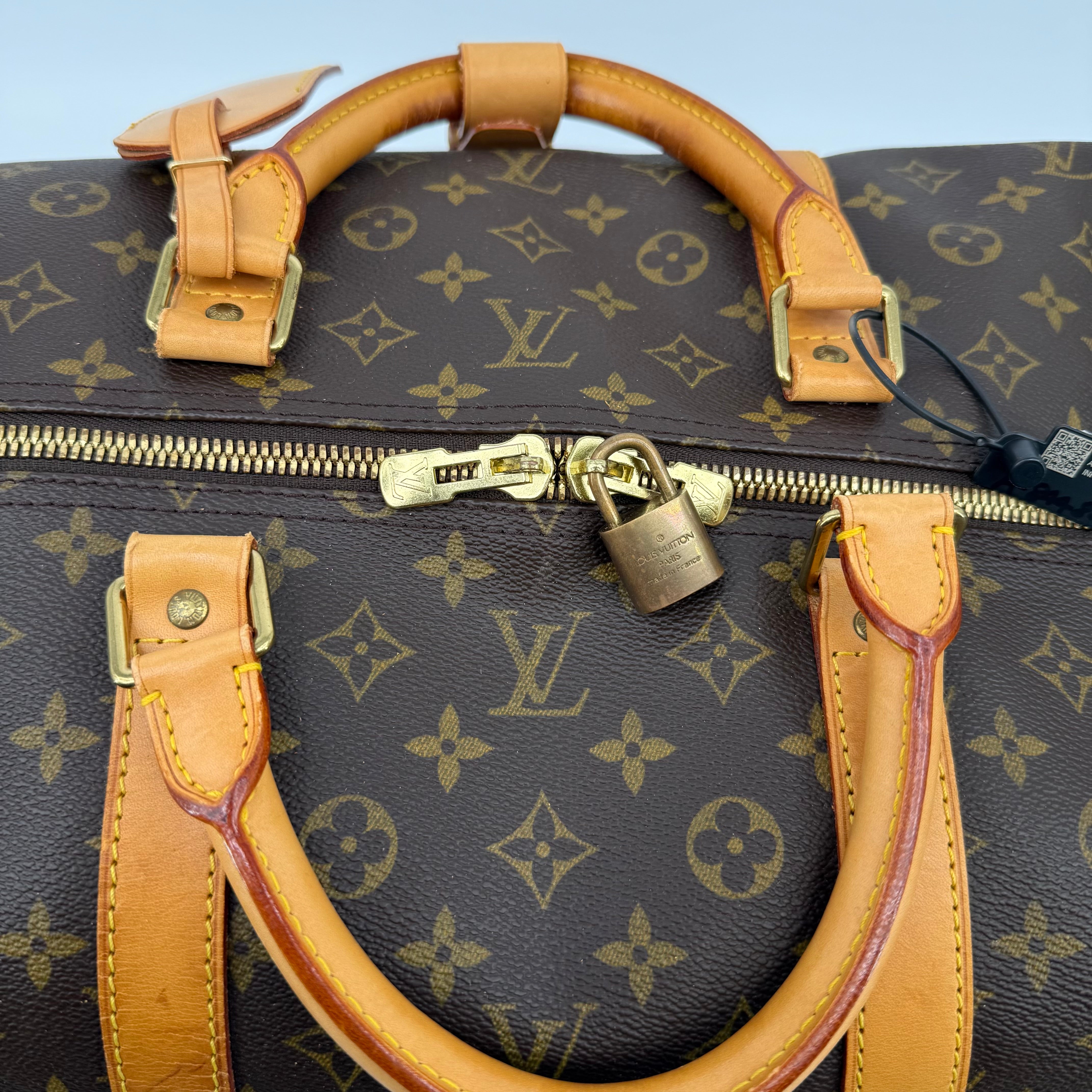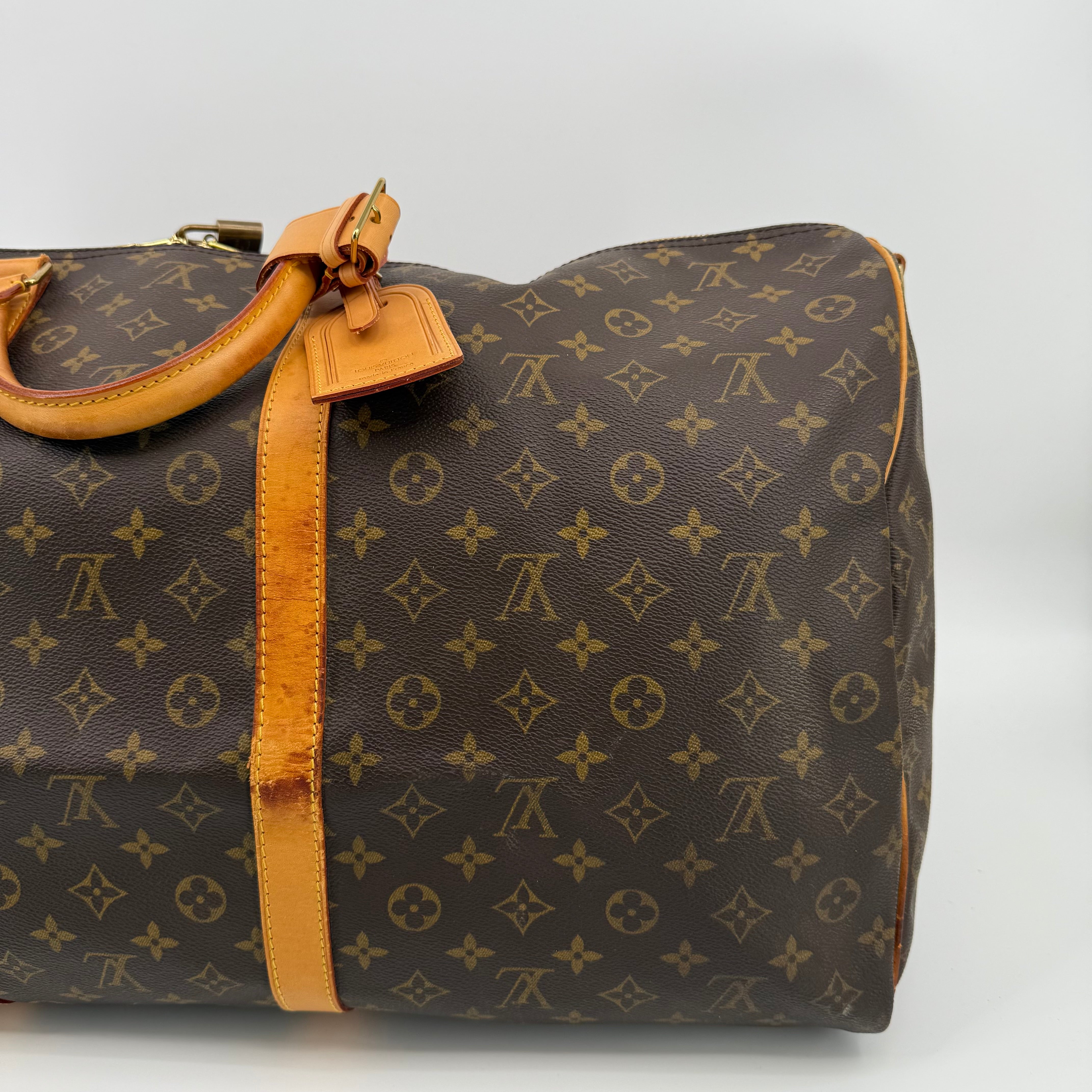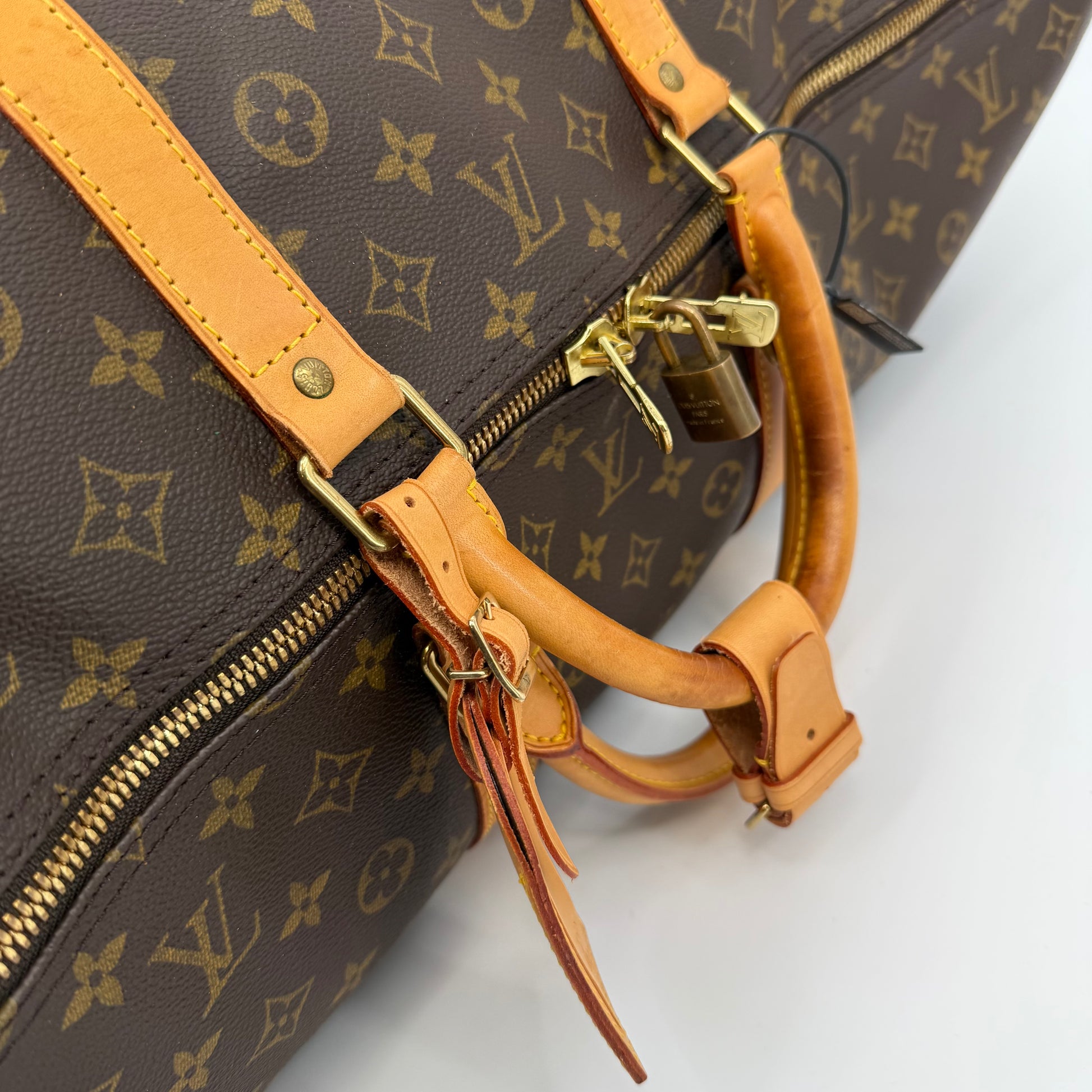 For the traveler who demands both elegance and practicality, the Louis Vuitton Keepall Bandoulière 60 is the ultimate statement piece. Constructed from Monogram coated canvas and vachetta leather trim with gold-tone hardware, it offers a spacious interior perfect for longer trips. The bag includes rolled leather handles, a detachable and adjustable shoulder strap, and signature Louis Vuitton detailing throughout — blending heritage craftsmanship with modern travel ease.