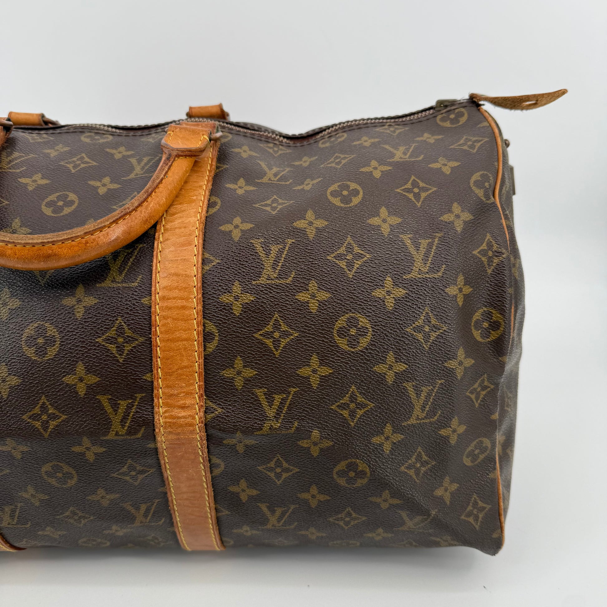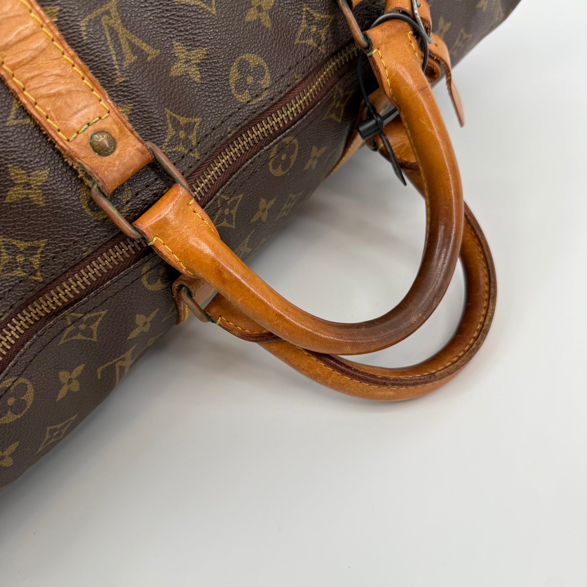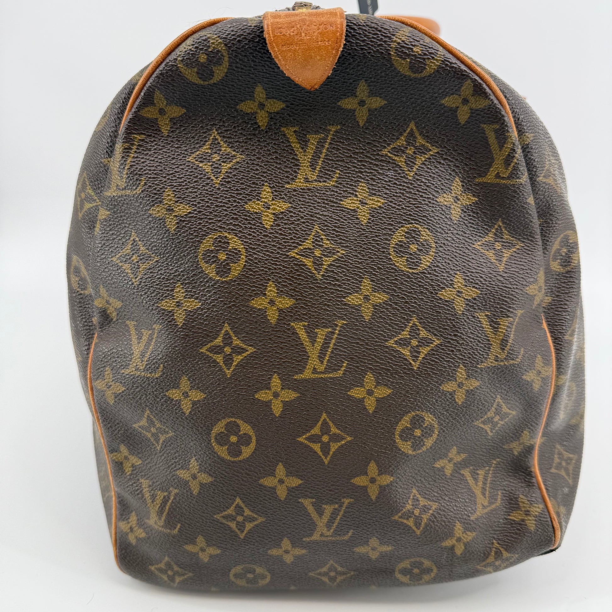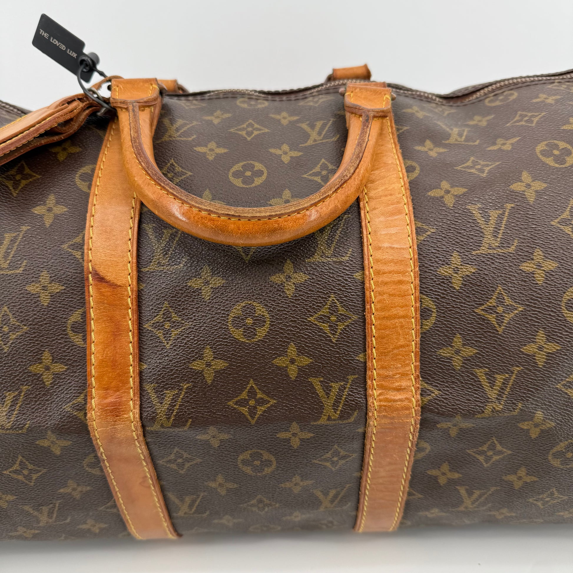 Pre-owned Louis Vuitton Monogram Keepall 50 crafted in signature coated canvas with natural Vachetta leather trim. Features dual rolled handles, top zip closure and spacious interior ideal for weekends or carry-on travel. Shows general patina and surface wear consistent with age, but remains clean, sturdy and fully functional.