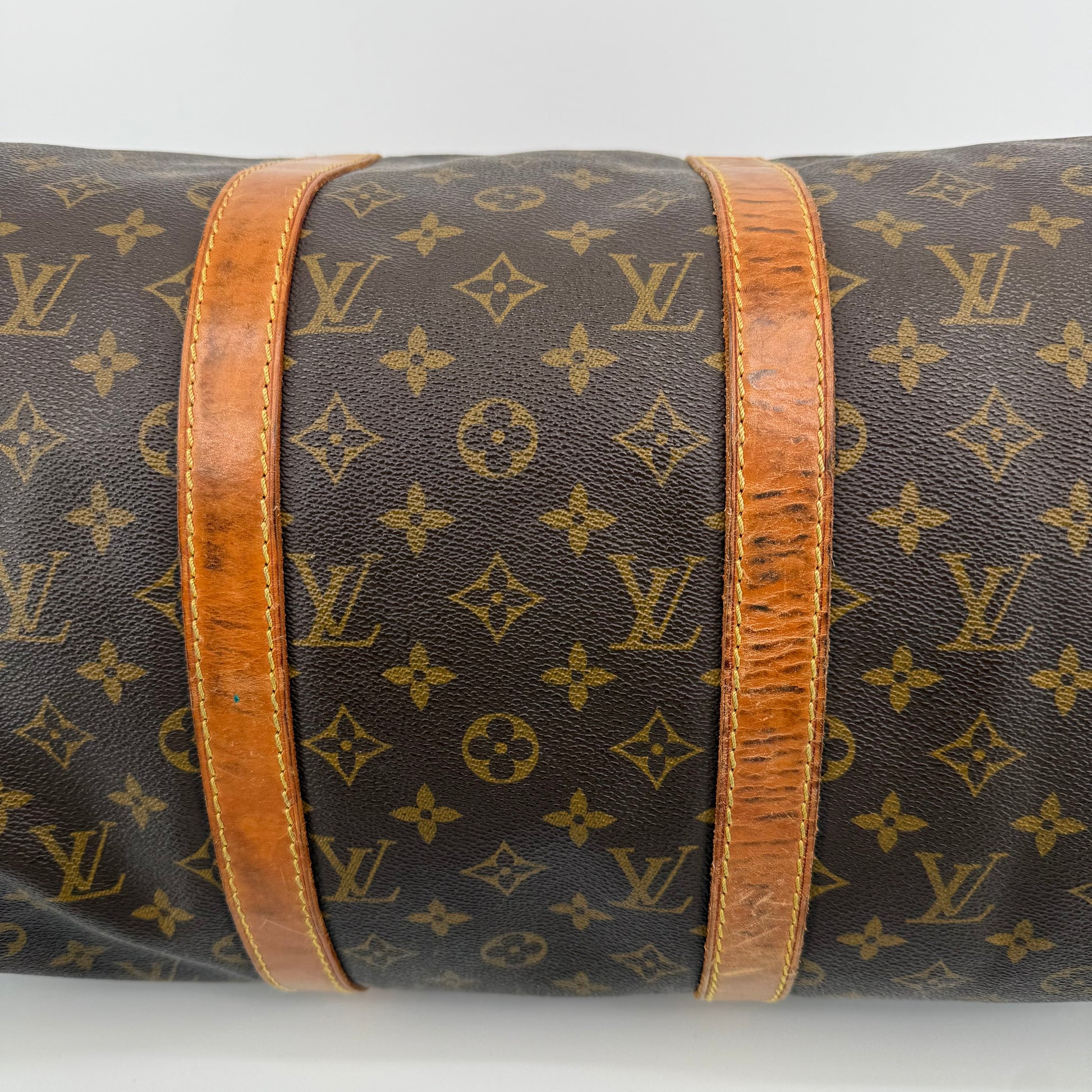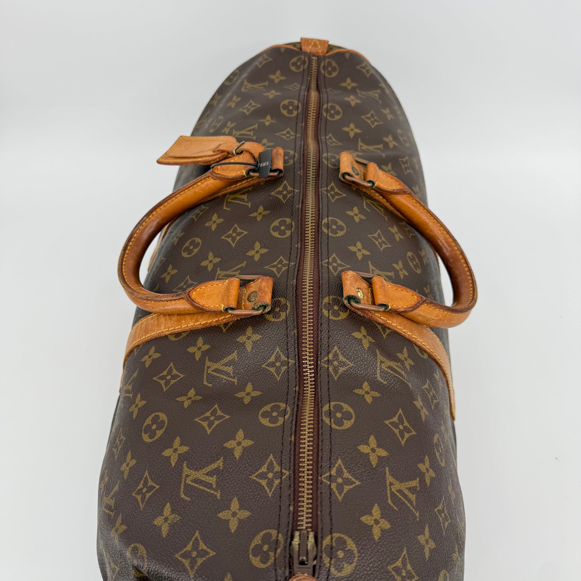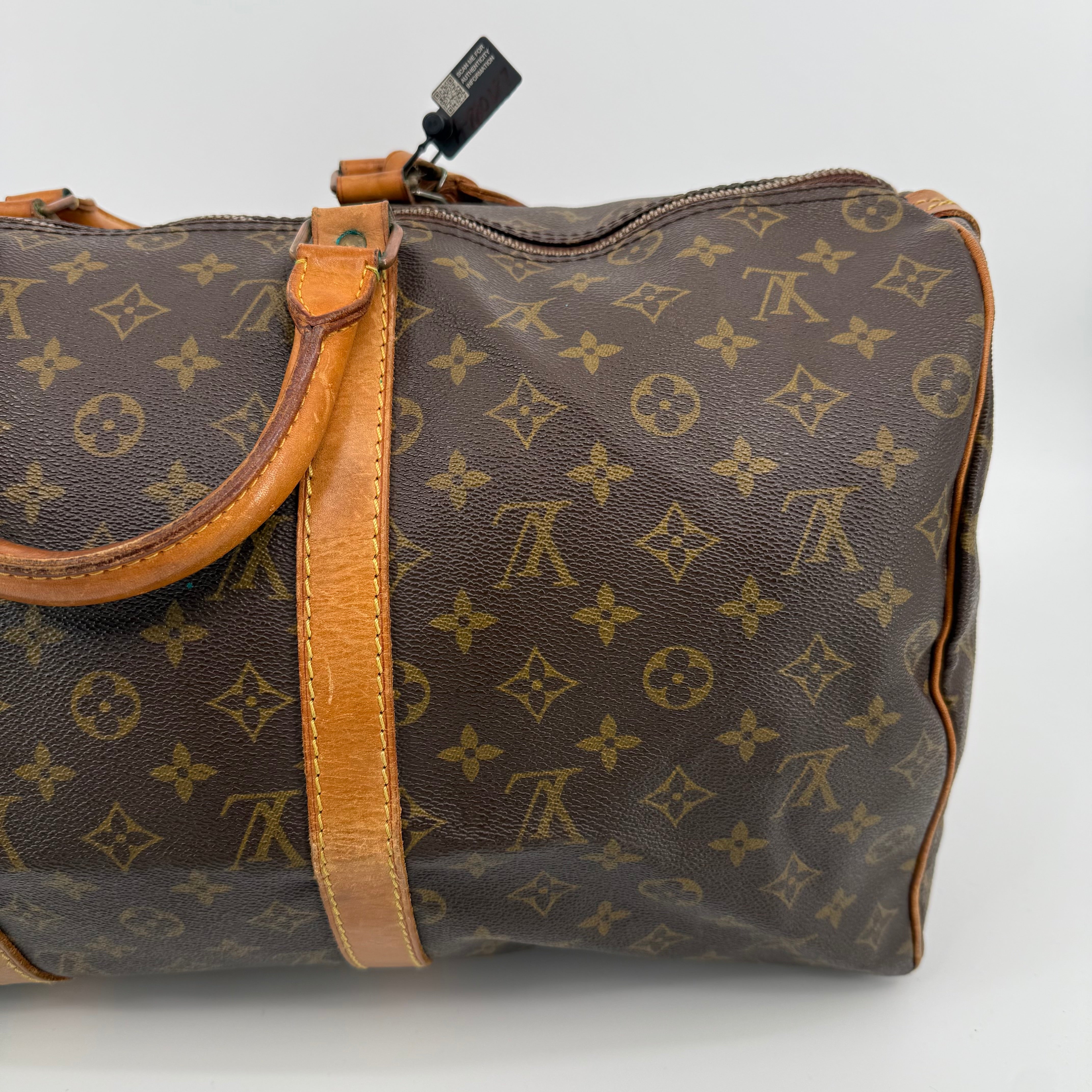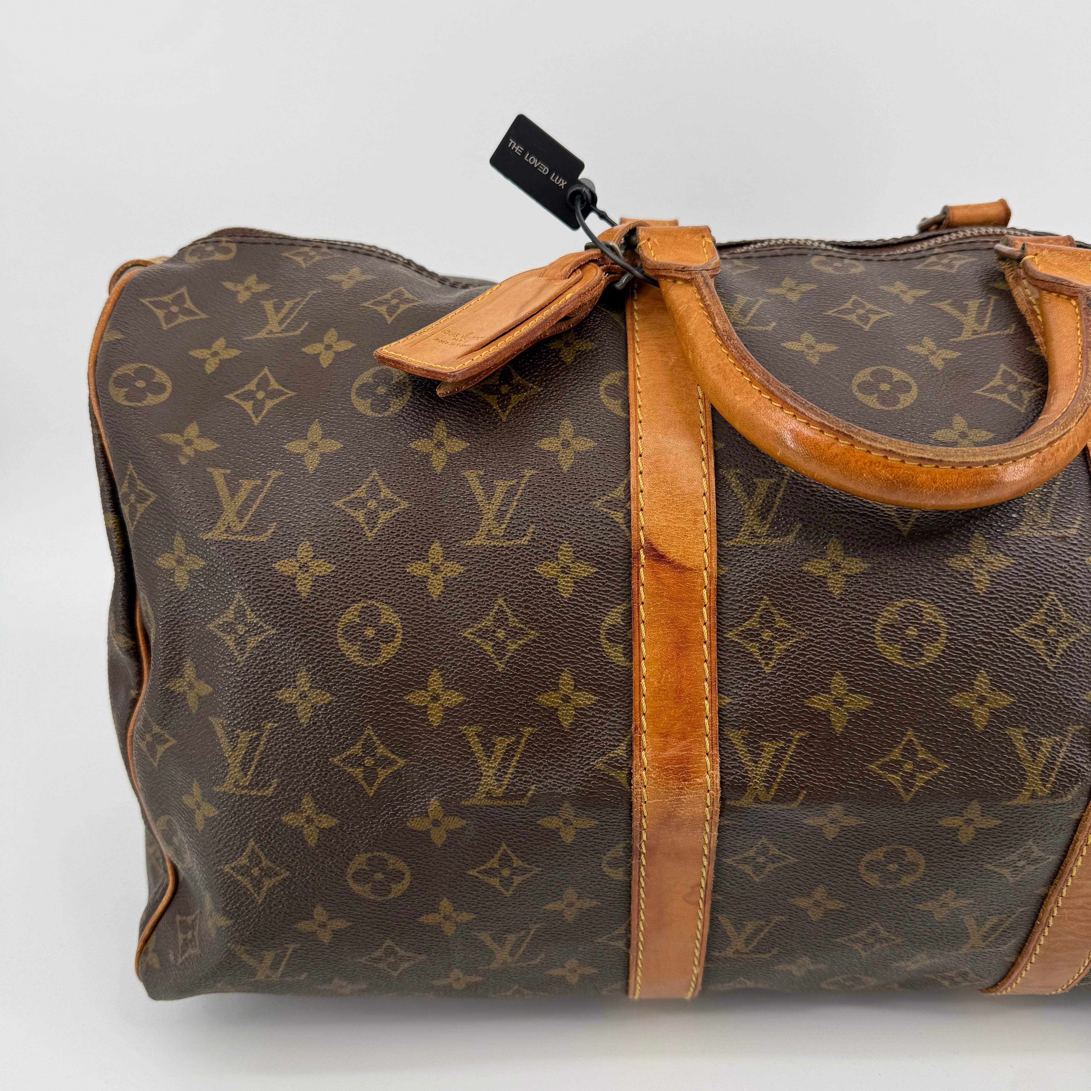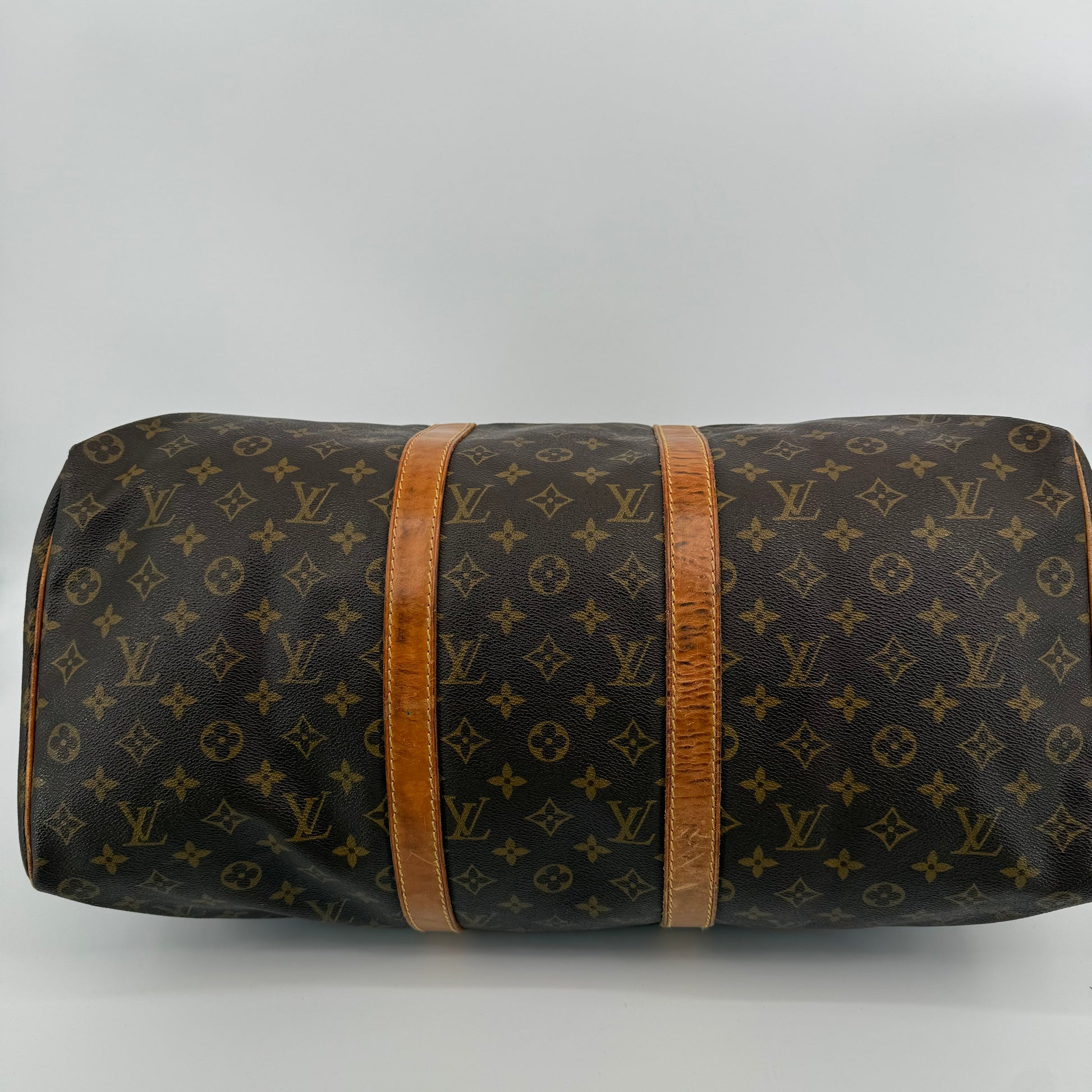 Pre-owned Louis Vuitton Monogram Keepall 50 crafted in signature coated canvas with natural Vachetta leather trim. Features dual rolled handles, top zip closure and spacious interior ideal for weekends or carry-on travel. Shows general patina and surface wear consistent with age, but remains clean, sturdy and fully functional.