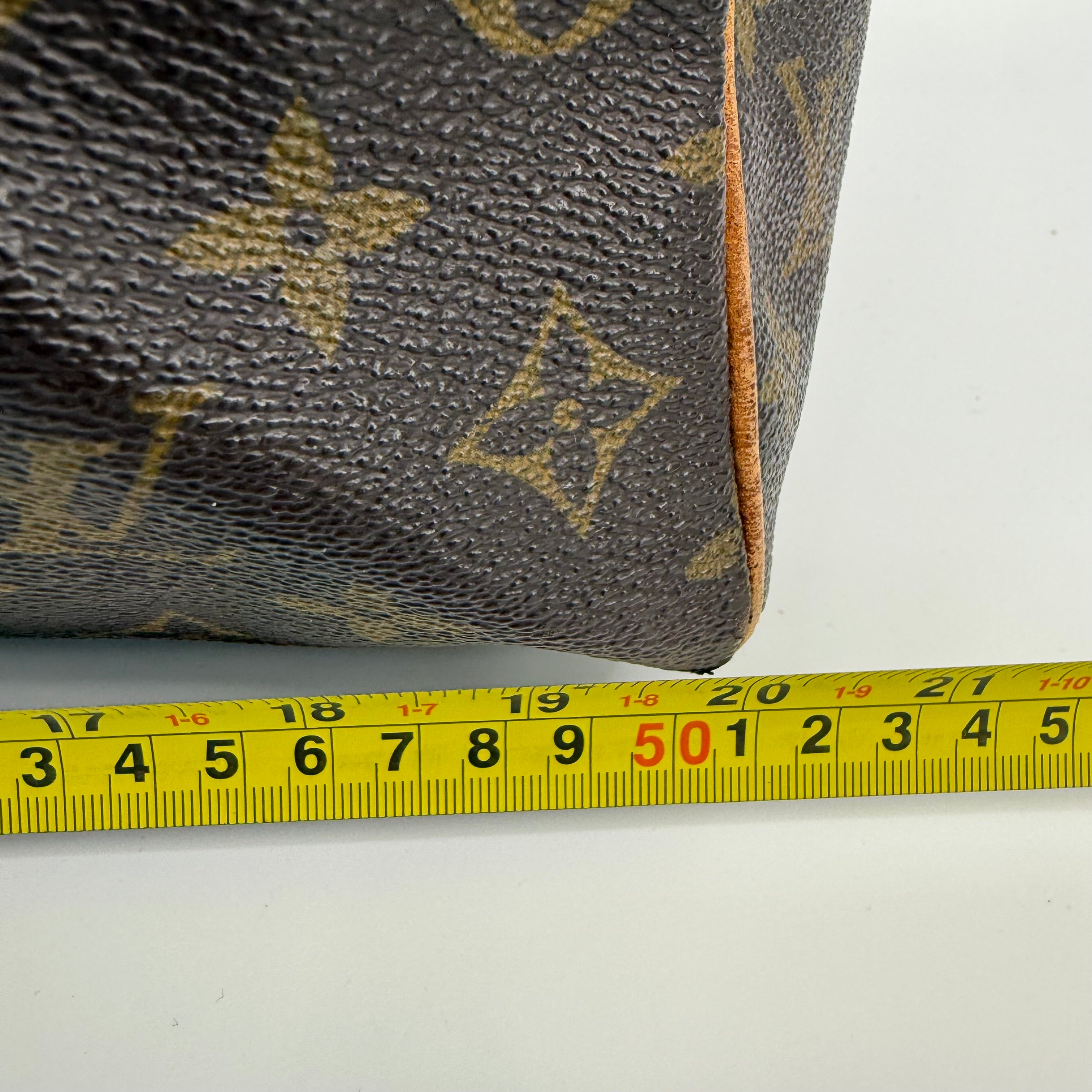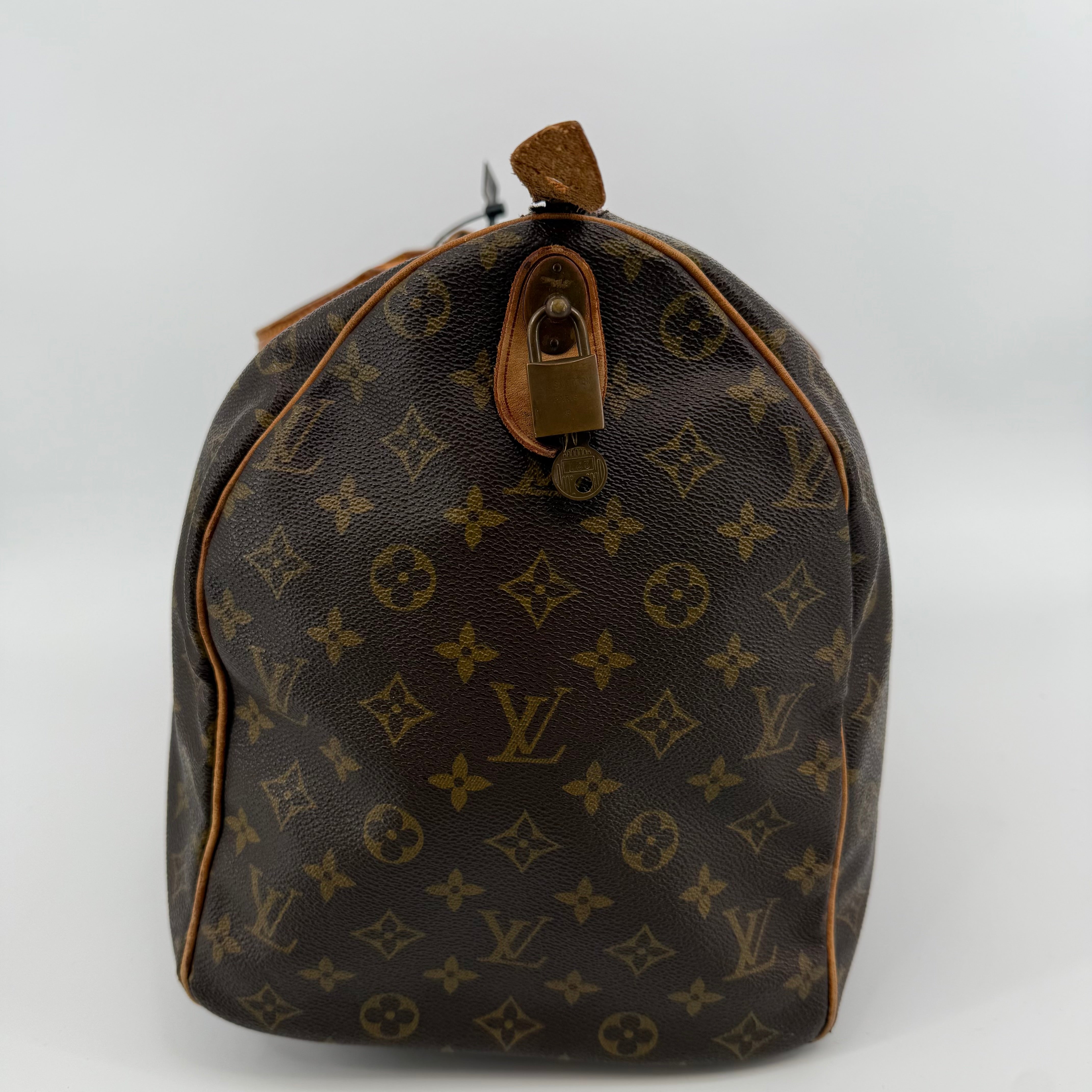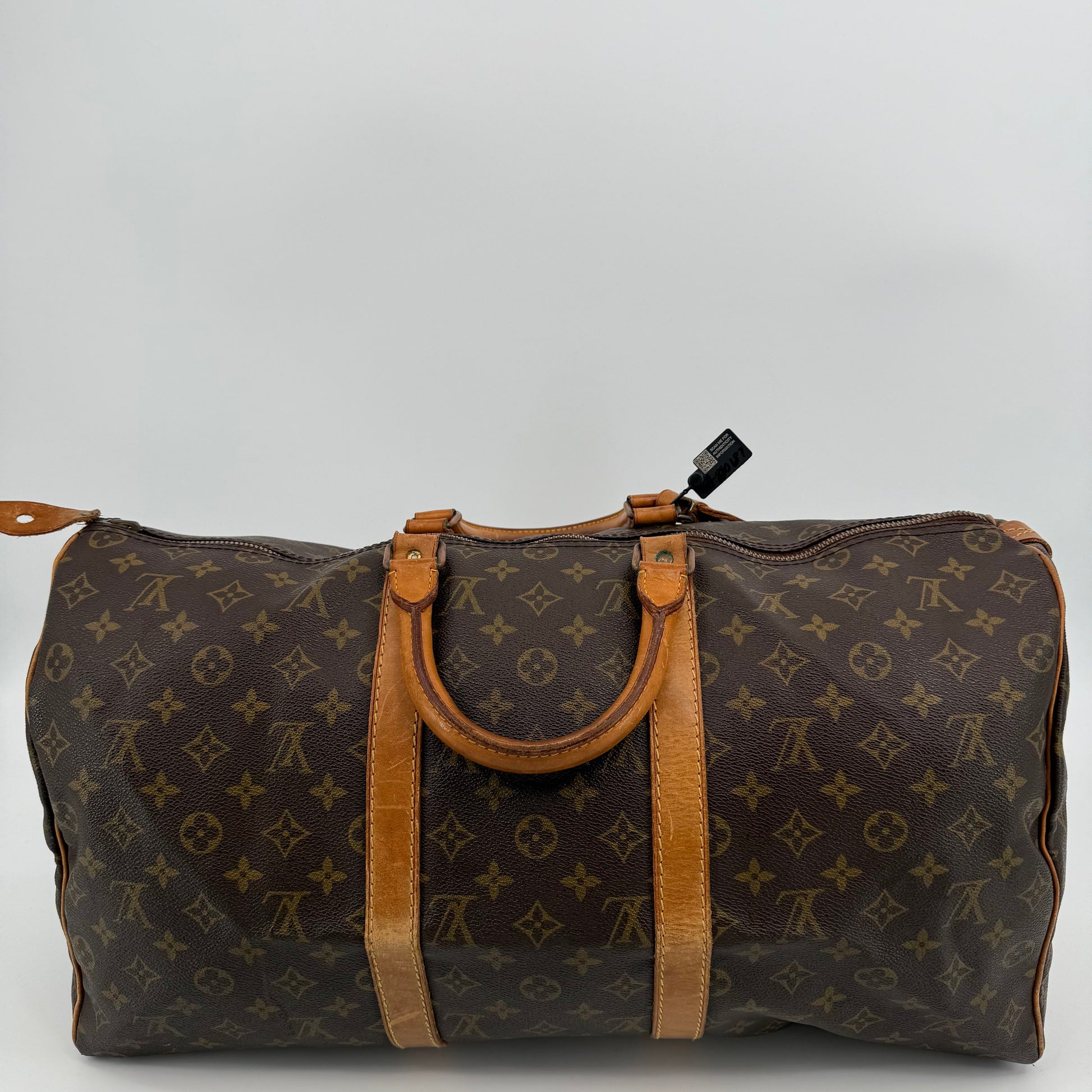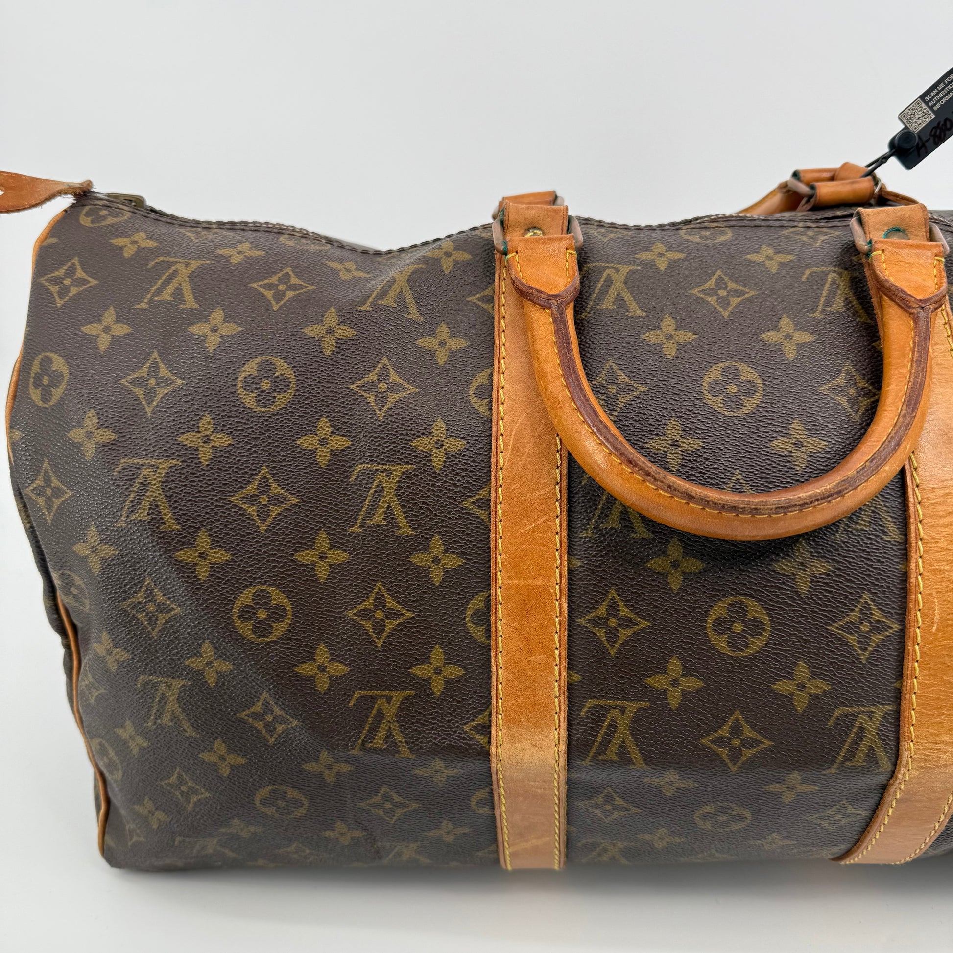 Pre-owned Louis Vuitton Monogram Keepall 50 crafted in signature coated canvas with natural Vachetta leather trim. Features dual rolled handles, top zip closure and spacious interior ideal for weekends or carry-on travel. Shows general patina and surface wear consistent with age, but remains clean, sturdy and fully functional.