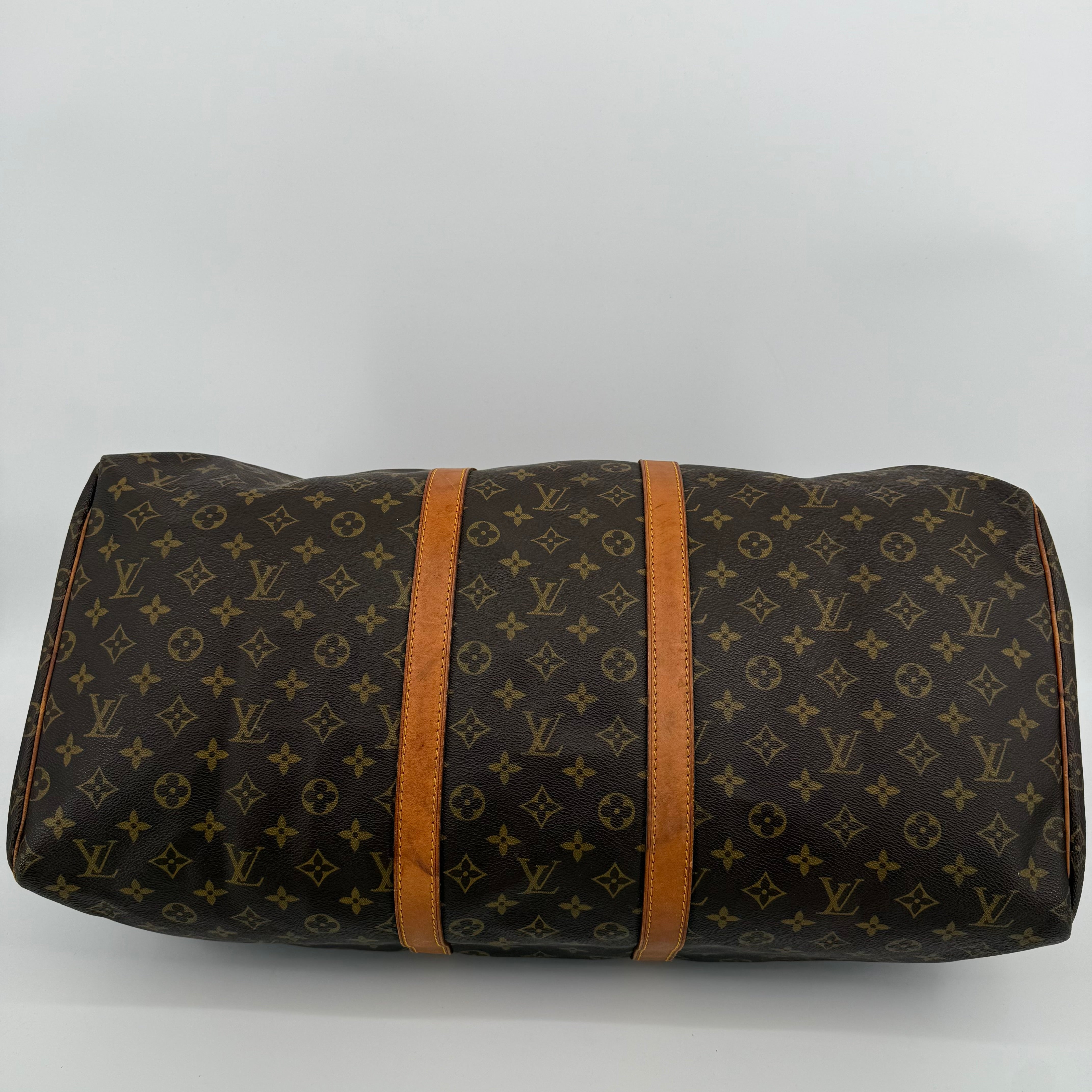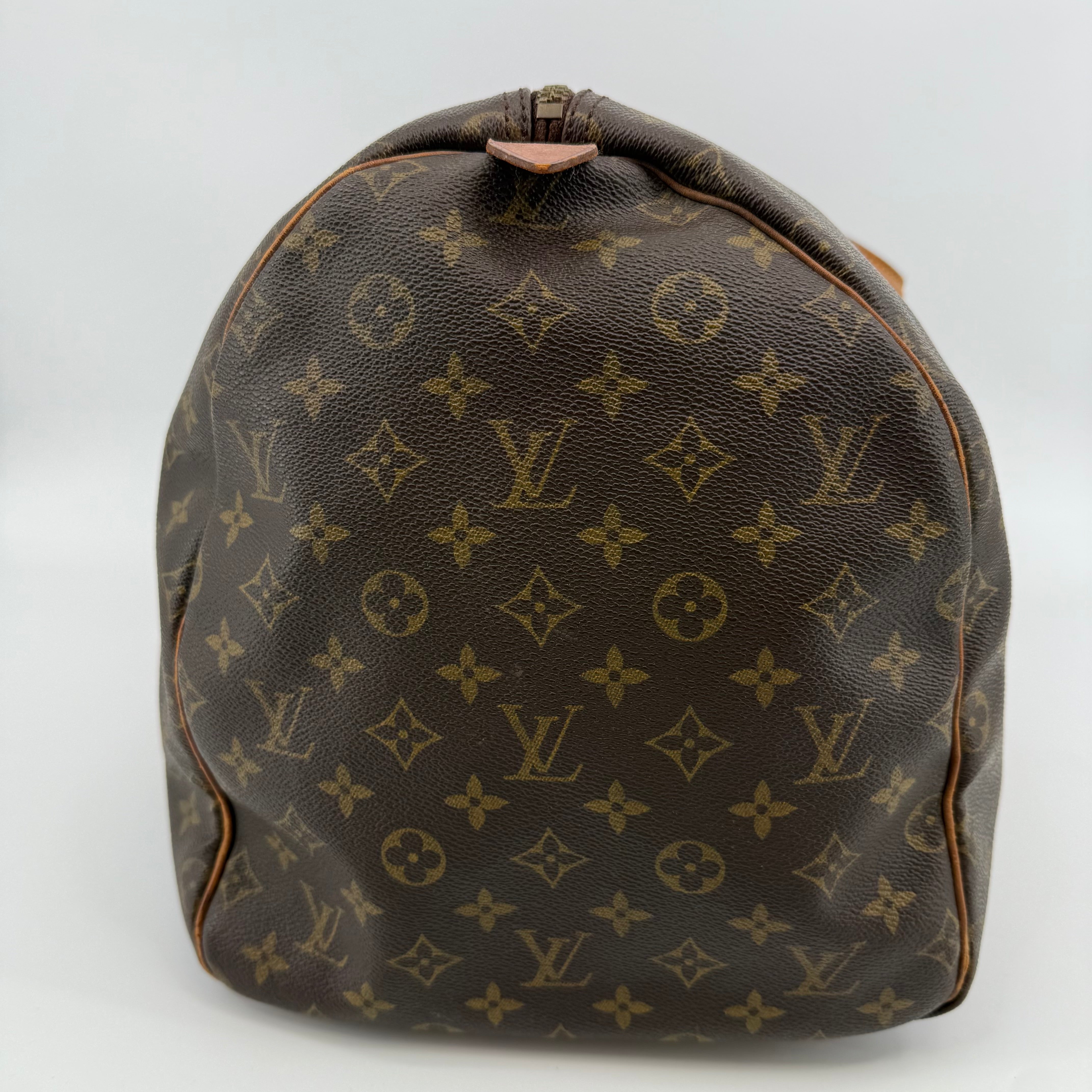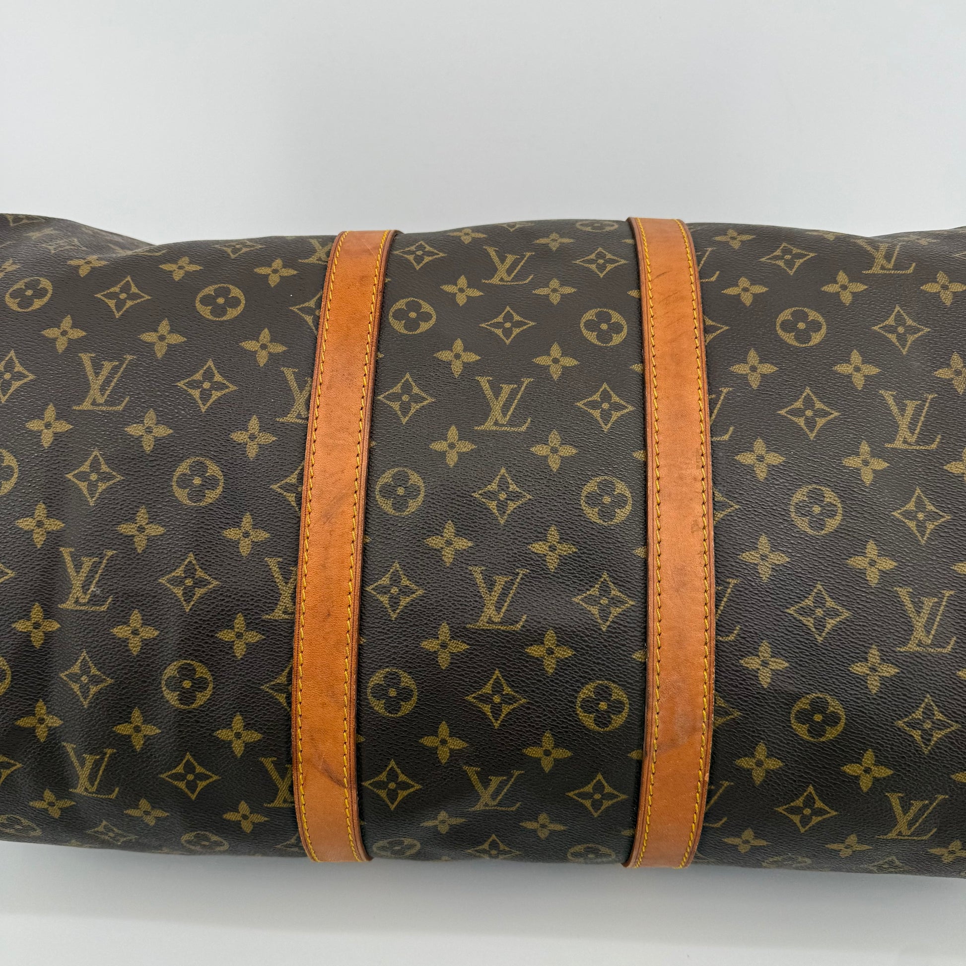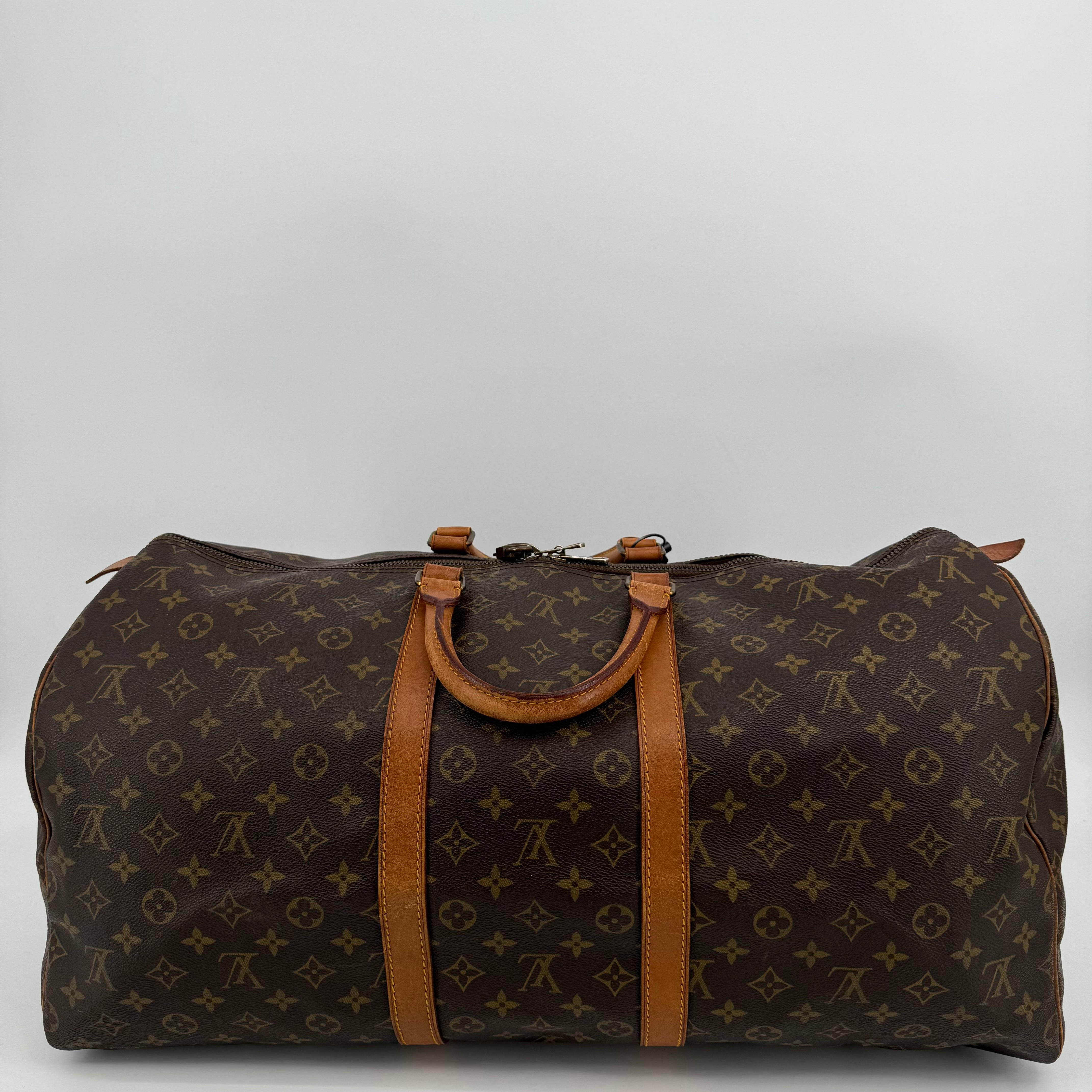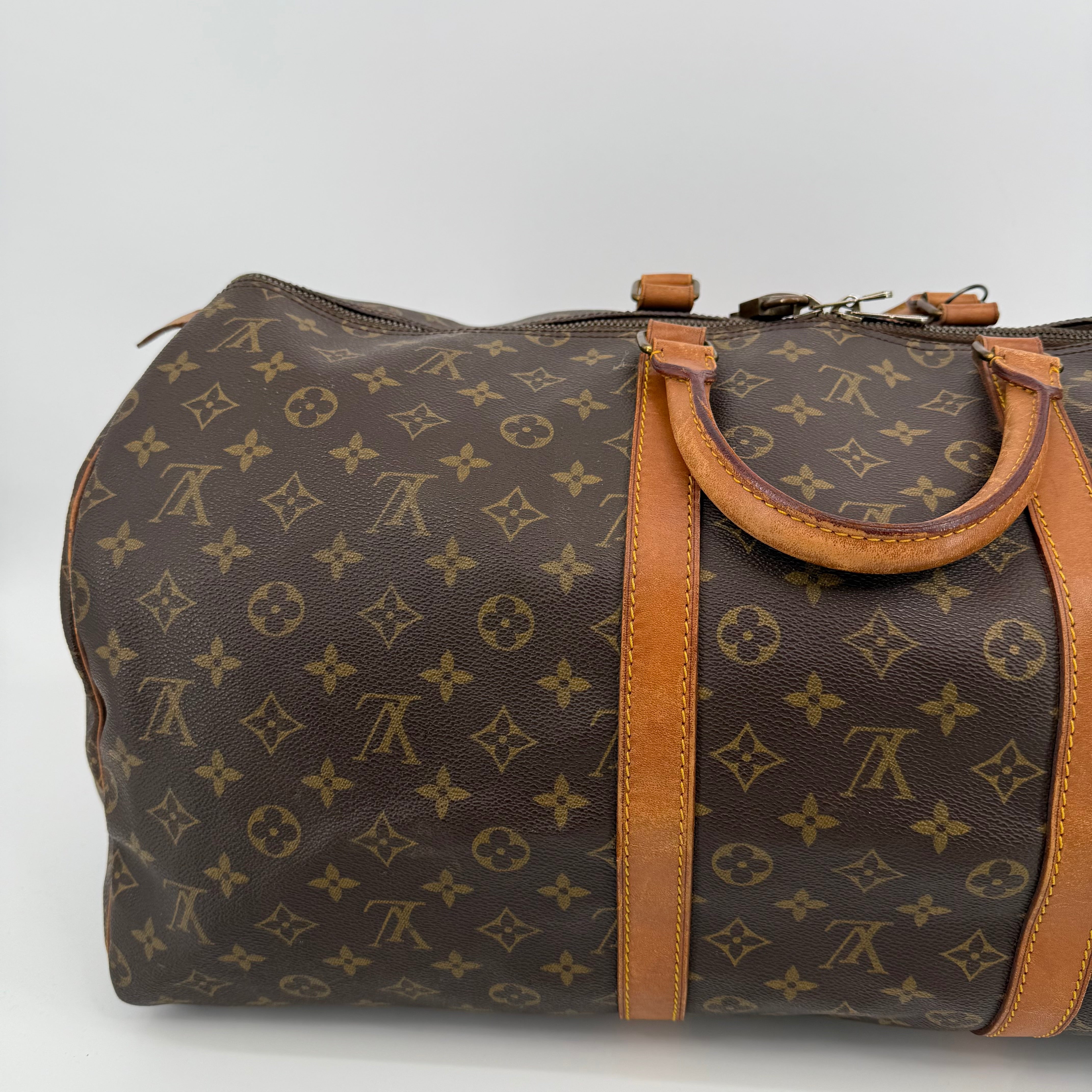 Pre-owned Louis Vuitton Monogram Keepall 55 in classic coated canvas with Vachetta leather accents. Designed with rolled leather handles, zip closure and a roomy interior perfect for travel. Displays typical ageing and wear to the leather and hardware, yet the structure is sound and the bag remains reliable and ready for use.